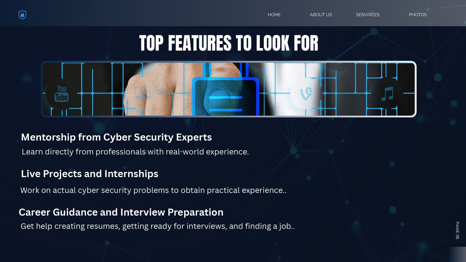 PAGE 06 Mentorship from Cyber Security Experts Live Projects and Internships Career Guidance and Interview Preparation Learn directly from professionals with real-world experience. Work on actual cyber security problems to obtain practical experience.. Get help creating resumes, getting ready for interviews, and finding a job..