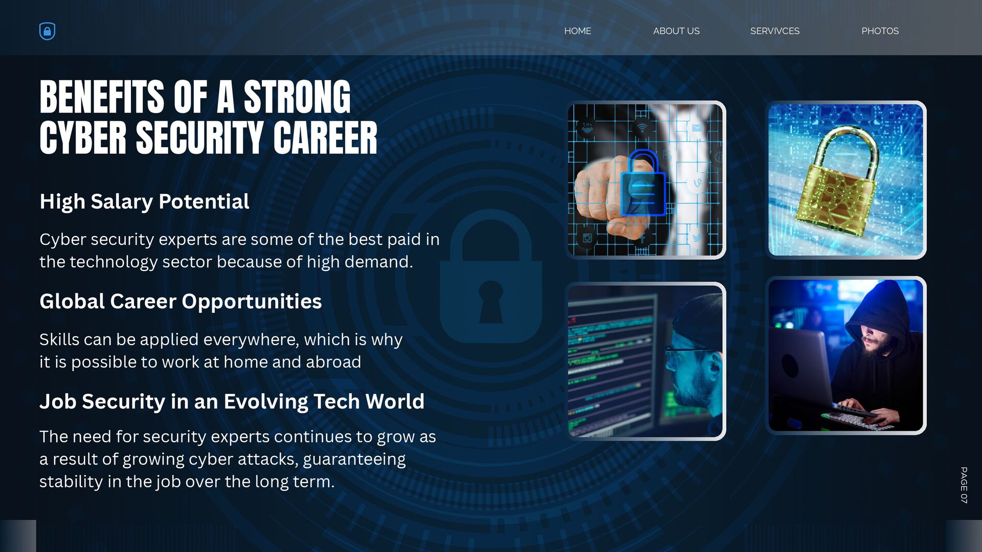 SERVIVCES PHOTOS PAGE 07 High Salary Potential Global Career Opportunities Job Security in an Evolving Tech World Cyber security experts are some of the best paid in the technology sector because of high demand. Skills can be applied everywhere, which is why it is possible to work at home and abroad The need for security experts continues to grow as a result of growing cyber attacks, guaranteeing stability in the job over the long term.