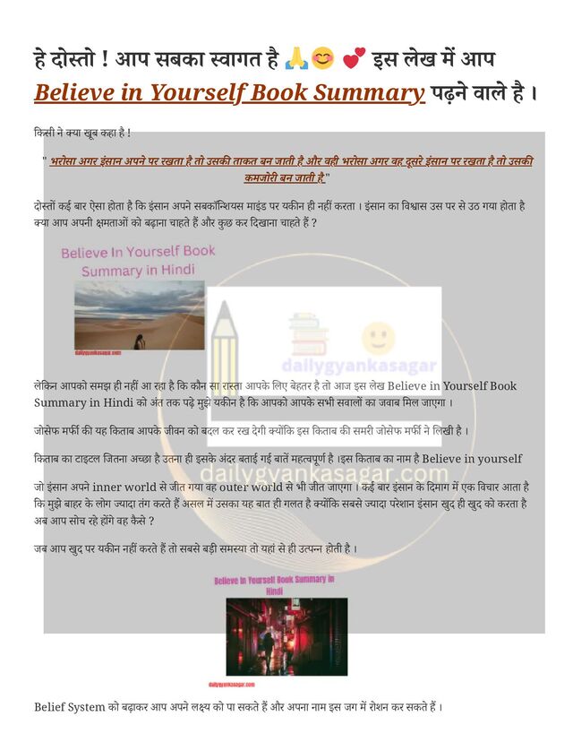 आप Believe in Yourself Book Summary पढ़ने वाले है । किसी ने क्या खूब कहा है ! " भरोसा अगर इंसान अपने पर रखता है तो उसकी ताकत बन जाती है और वही भरोसा अगर वह दूसरे इंसान पर रखता है तो उसकी कमजोरी बन जाती है " दोस्तों कई बार ऐसा होता है कि इंसान अपने सबकॉन्शियस माइंड पर यकीन ही नहीं करता । इंसान का विश्वास उस पर से उठ गया होता है क्या आप अपनी क्षमताओं को बढ़ाना चाहते हैं और कु छ कर दिखाना चाहते हैं ? लेकिन आपको समझ ही नहीं आ रहा है कि कौन सा रास्ता आपके लिए बेहतर है तो आज इस लेख Believe in Yourself Book Summary in Hindi को अंत तक पढ़े मुझे यकीन है कि आपको आपके सभी सवालों का जवाब मिल जाएगा । जोसेफ मर्फी की यह किताब आपके जीवन को बदल कर रख देगी क्योंकि इस किताब की समरी जोसेफ मर्फी ने लिखी है । किताब का टाइटल जितना अच्छा है उतना ही इसके अंदर बताई गई बातें महत्वपूर्ण है ।इस किताब का नाम है Believe in yourself जो इंसान अपने inner world से जीत गया वह outer world से भी जीत जाएगा । कई बार इंसान के दिमाग में एक विचार आता है कि मुझे बाहर के लोग ज्यादा तंग करते हैं असल में उसका यह बात ही गलत है क्योंकि सबसे ज्यादा परेशान इंसान खुद ही खुद को करता है अब आप सोच रहे होंगे वह कै से ? जब आप खुद पर यकीन नहीं करते हैं तो सबसे बड़ी समस्या तो यहां से ही उत्पन्न होती है । Belief System को बढ़ाकर आप अपने लक्ष्य को पा सकते हैं और अपना नाम इस जग में रोशन कर सकते हैं ।