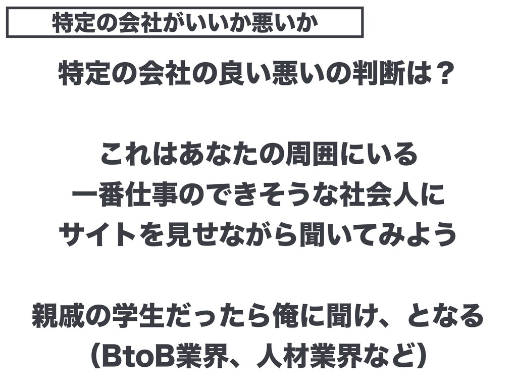 ಛఆͷձࣾͷྑ͍ѱ͍ͷஅʁ ͜Ε͋ͳͨͷपғʹ͍Δ Ұ൪ࣄͷͰ͖ͦ͏ͳࣾձਓʹ αΠτΛݟͤͳ͕Βฉ͍ͯΈΑ͏ ੰͷֶੜͩͬͨΒԶʹฉ͚ɺͱͳΔ ʢ#UP#ۀքɺਓࡐۀքͳͲʣ ಛఆͷձ͕͍͍͔ࣾѱ͍͔