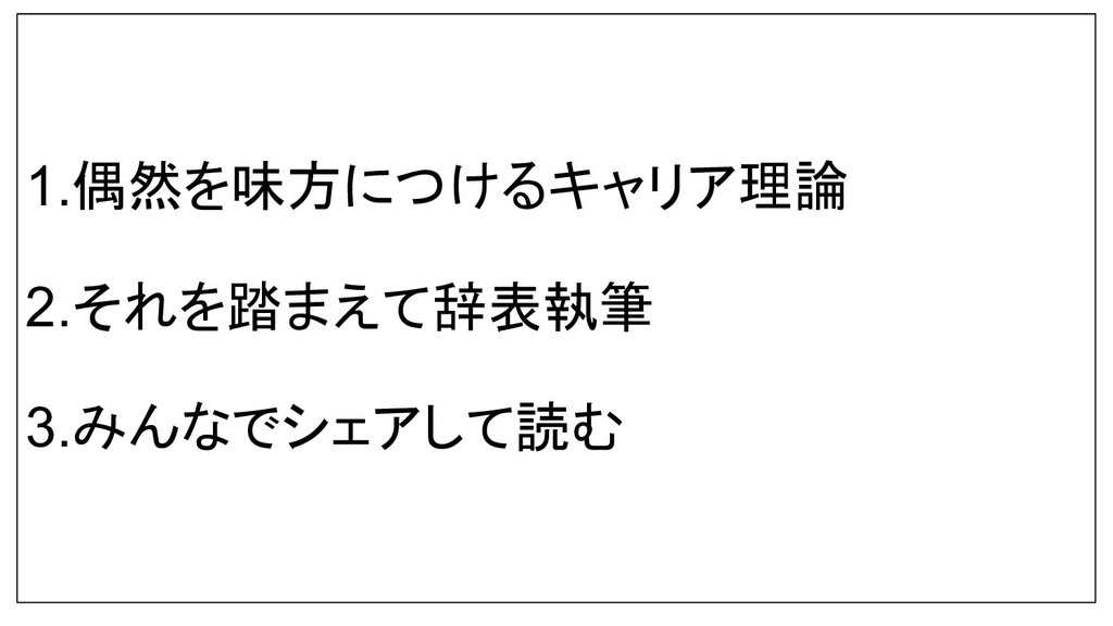 1.偶然を味方につけるキャリア理論 2.それを踏まえて辞表執筆 3.みんなでシェアして読む
