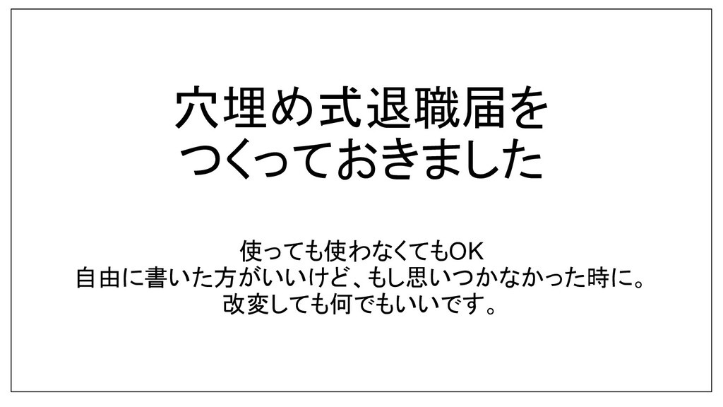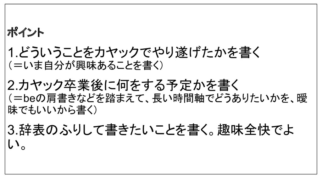 ポイント 1.どういうことをカヤックでやり遂げたかを書く (=いま自分が興味あることを書く) 2.カヤック卒業後に何をする予定かを書く (=beの肩書きなどを踏まえて、長い時間軸でどうありたいかを、曖 昧でもいいから書く) 3.辞表のふりして書きたいことを書く。趣味全快でよ い。