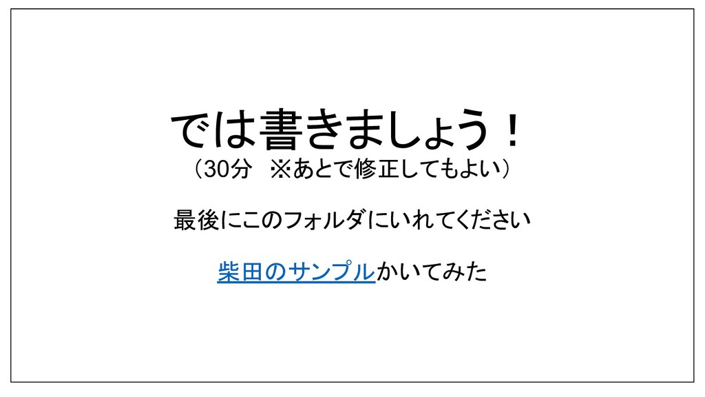 では書きましょう! (30分 ※あとで修正してもよい) 最後にこのフォルダにいれてください 柴田のサンプルかいてみた