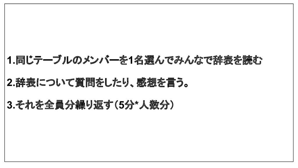 1.同じテーブルのメンバーを1名選んでみんなで辞表を読む 2.辞表について質問をしたり、感想を言う。 3.それを全員分繰り返す(5分*人数分)