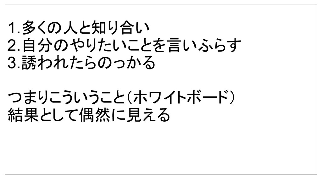 1.多くの人と知り合い 2.自分のやりたいことを言いふらす 3.誘われたらのっかる つまりこういうこと(ホワイトボード) 結果として偶然に見える