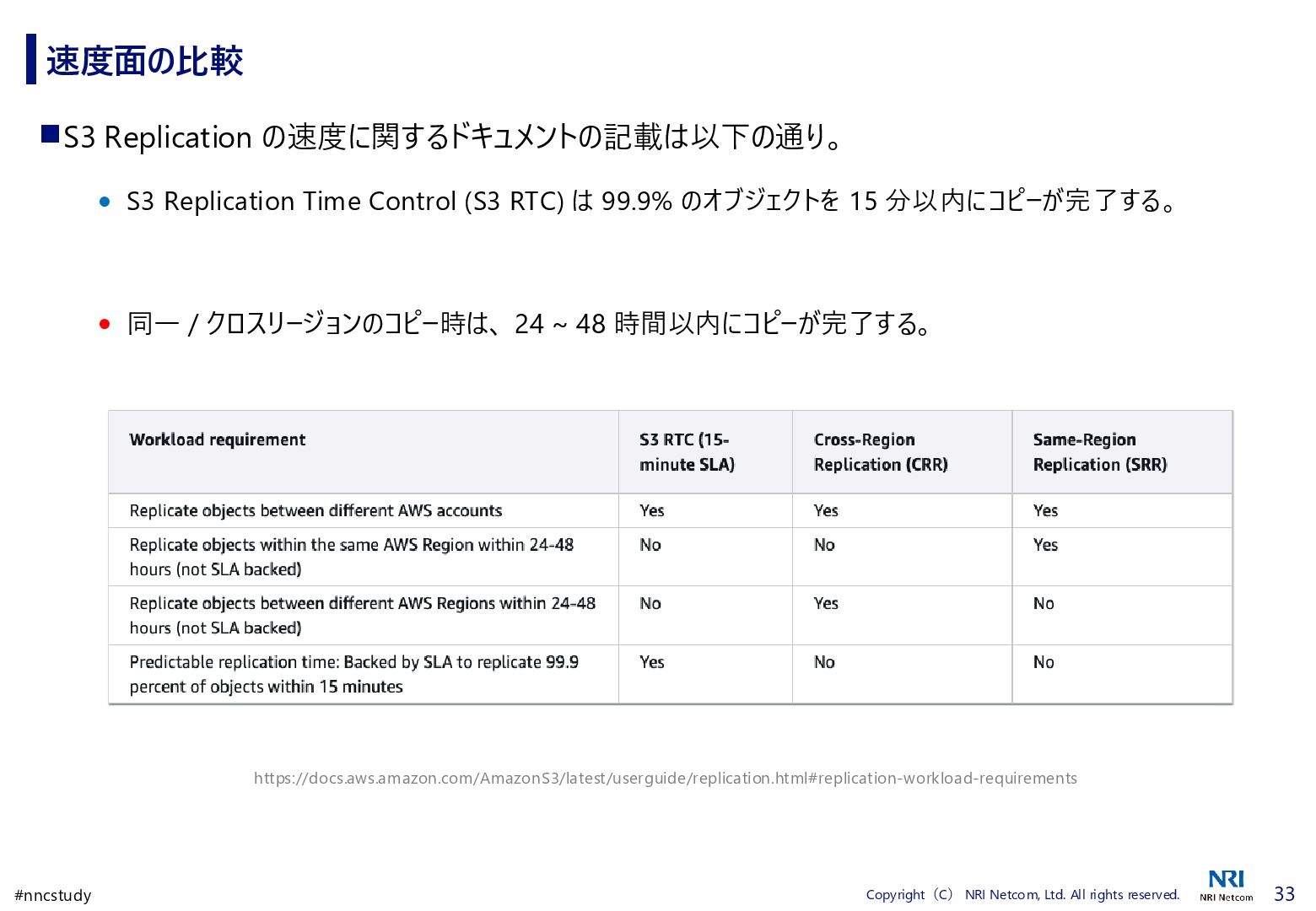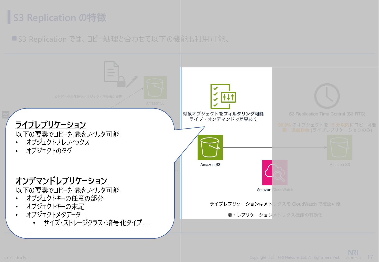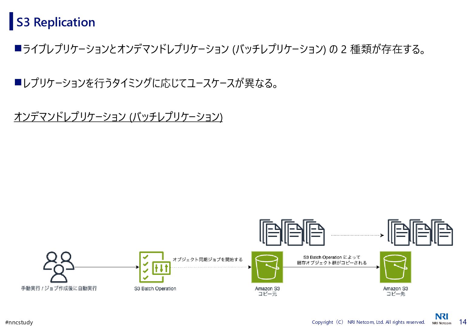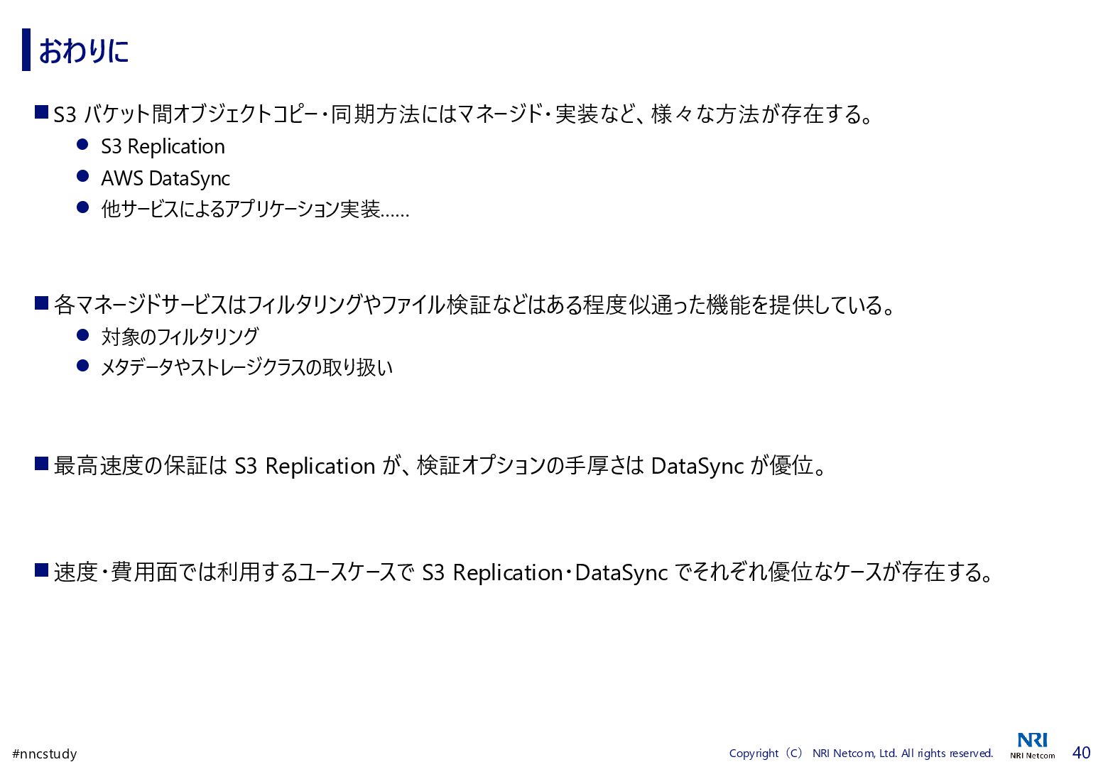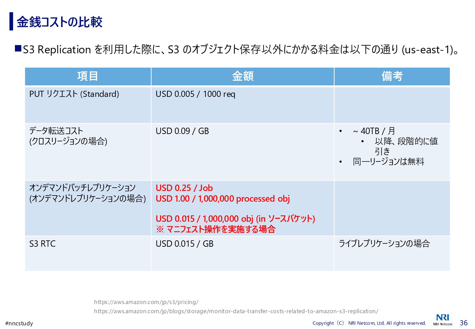 を利用した際に、S3 のオブジェクト保存以外にかかる料金は以下の通り (us-east-1)。 金銭コストの比較 #nncstudy https://aws.amazon.com/jp/s3/pricing/ https://aws.amazon.com/jp/blogs/storage/monitor-data-transfer-costs-related-to-amazon-s3-replication/ 項目 金額 備考 PUT リクエスト (Standard) USD 0.005 / 1000 req データ転送コスト (クロスリージョンの場合) USD 0.09 / GB • ~ 40TB / 月 • 以降、段階的に値 引き • 同一リージョンは無料 オンデマンドバッチレプリケーション (オンデマンドレプリケーションの場合) USD 0.25 / Job USD 1.00 / 1,000,000 processed obj USD 0.015 / 1,000,000 obj (in ソースバケット) ※ マニフェスト操作を実施する場合 S3 RTC USD 0.015 / GB ライブレプリケーションの場合