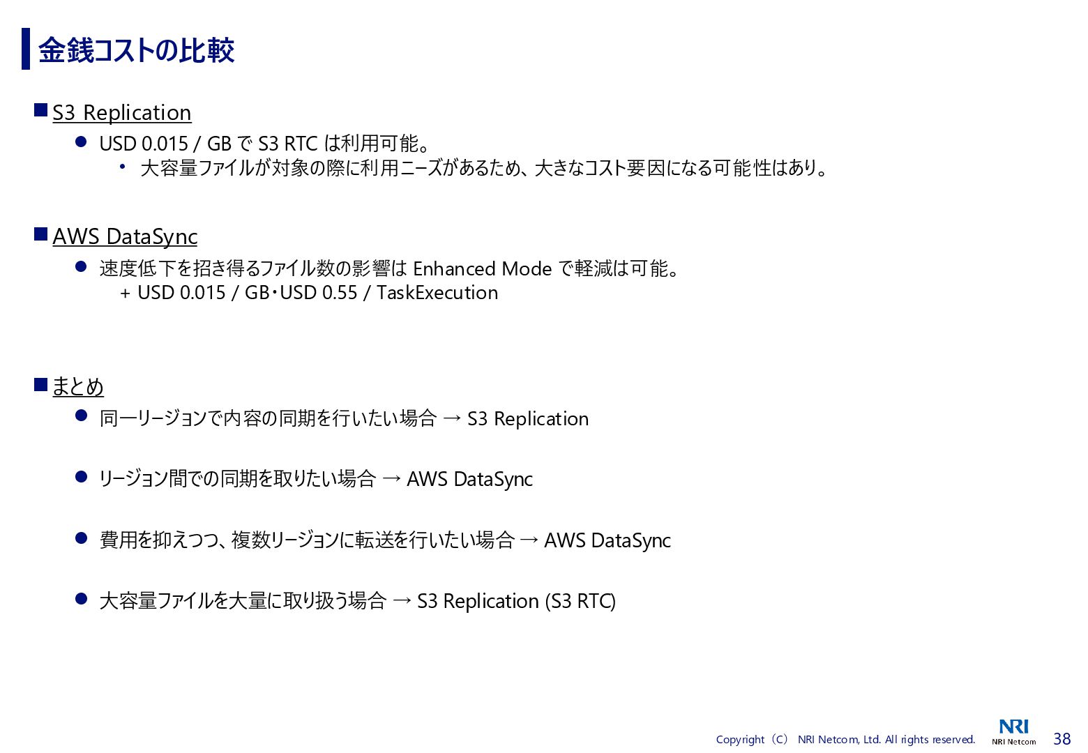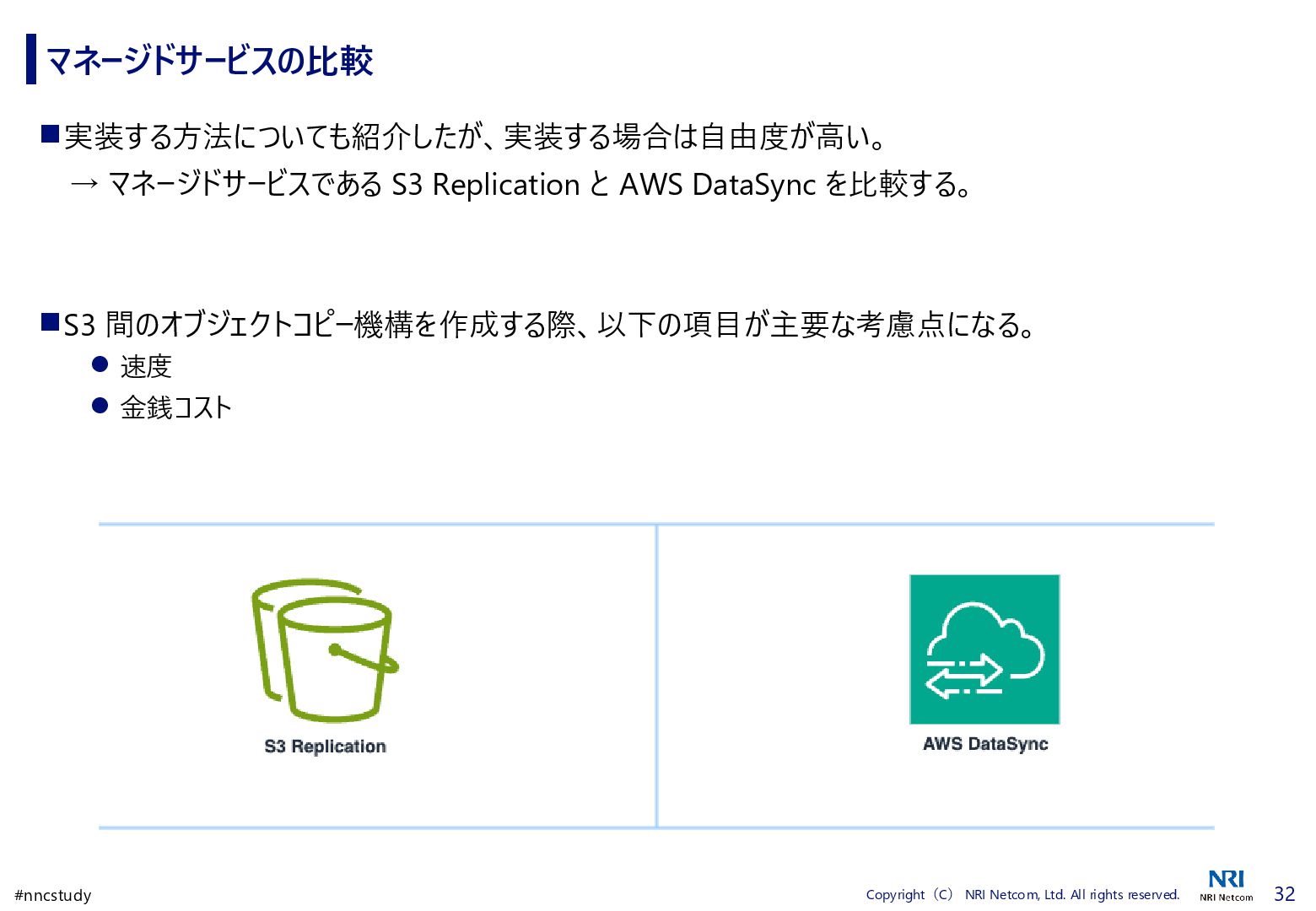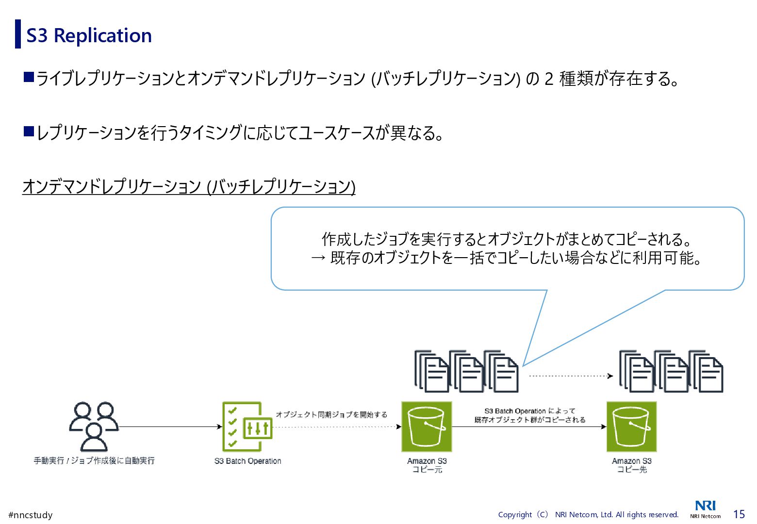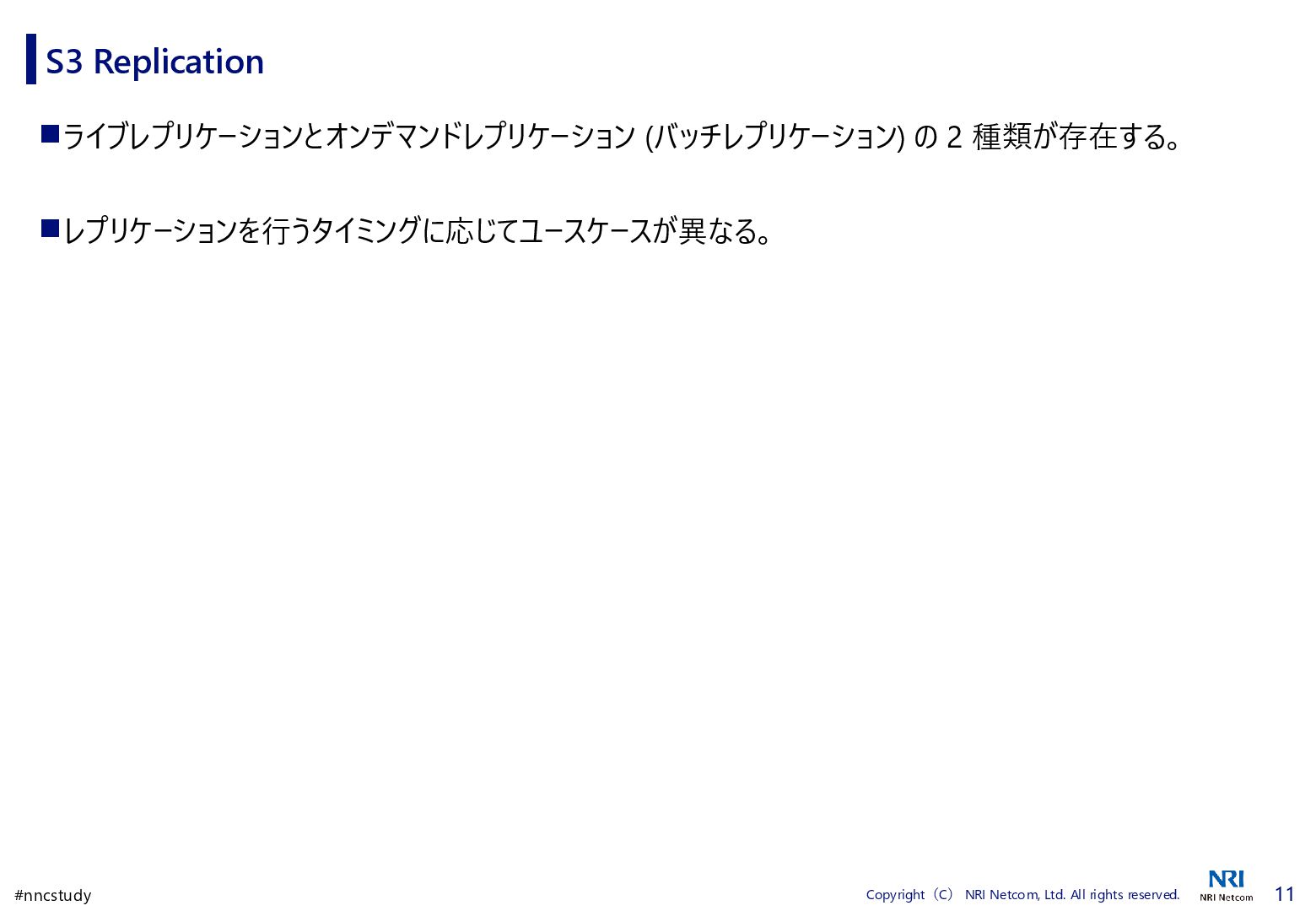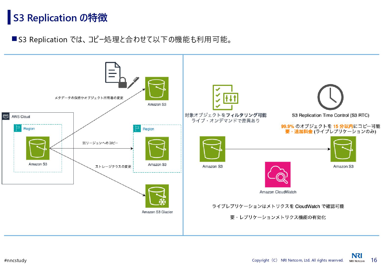 を利用した際に、S3 のオブジェクト保存以外にかかる料金は以下の通り (us-east-1)。 金銭コストの比較 #nncstudy https://aws.amazon.com/jp/s3/pricing/ https://aws.amazon.com/jp/blogs/storage/monitor-data-transfer-costs-related-to-amazon-s3-replication/ 項目 金額 備考 PUT リクエスト (Standard) USD 0.005 / 1000 req データ転送コスト (クロスリージョンの場合) USD 0.09 / GB • ~ 40TB / 月 • 以降、段階的に値 引き • 同一リージョンは無料 オンデマンドバッチレプリケーション (オンデマンドレプリケーションの場合) USD 0.25 / Job USD 1.00 / 1,000,000 processed obj USD 0.015 / 1,000,000 obj (in ソースバケット) ※ マニフェスト操作を実施する場合 S3 RTC USD 0.015 / GB ライブレプリケーションの場合