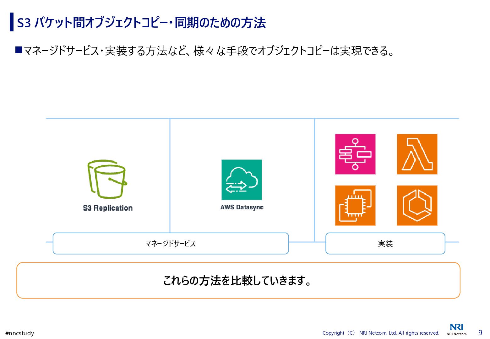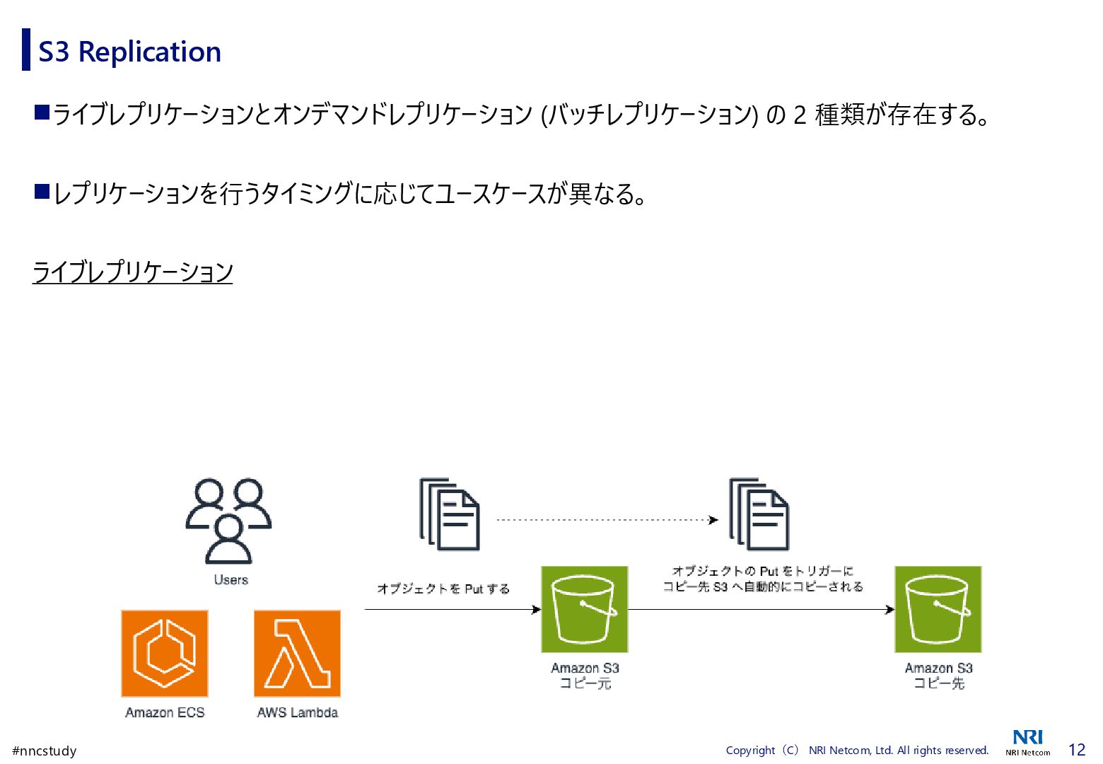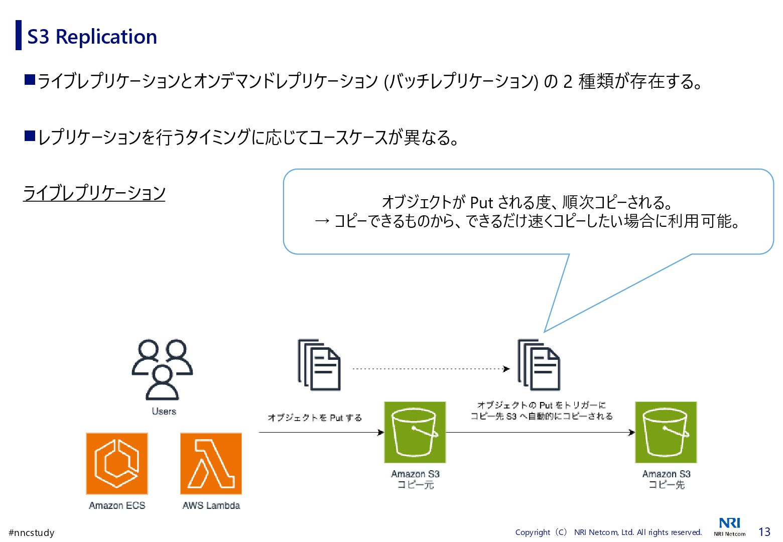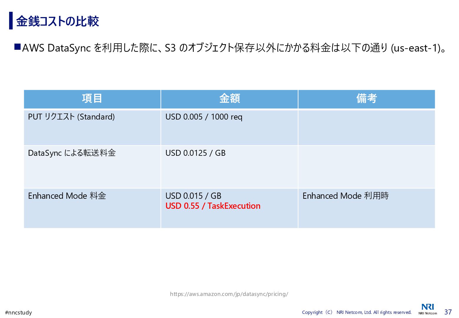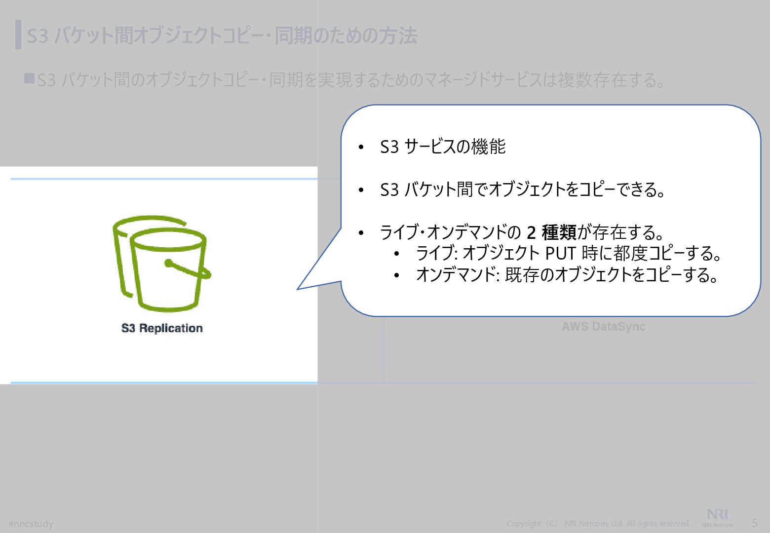 を利用した際に、S3 のオブジェクト保存以外にかかる料金は以下の通り (us-east-1)。 金銭コストの比較 #nncstudy https://aws.amazon.com/jp/s3/pricing/ https://aws.amazon.com/jp/blogs/storage/monitor-data-transfer-costs-related-to-amazon-s3-replication/ 項目 金額 備考 PUT リクエスト (Standard) USD 0.005 / 1000 req データ転送コスト (クロスリージョンの場合) USD 0.09 / GB • ~ 40TB / 月 • 以降、段階的に値 引き • 同一リージョンは無料 オンデマンドバッチレプリケーション (オンデマンドレプリケーションの場合) USD 0.25 / Job USD 1.00 / 1,000,000 processed obj USD 0.015 / 1,000,000 obj (in ソースバケット) ※ マニフェスト操作を実施する場合 S3 RTC USD 0.015 / GB ライブレプリケーションの場合