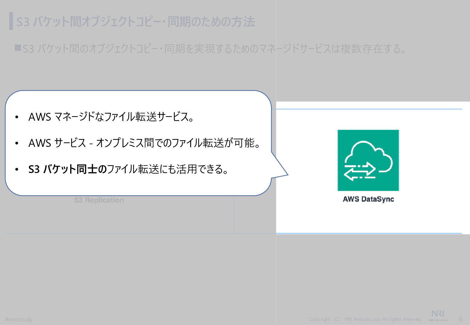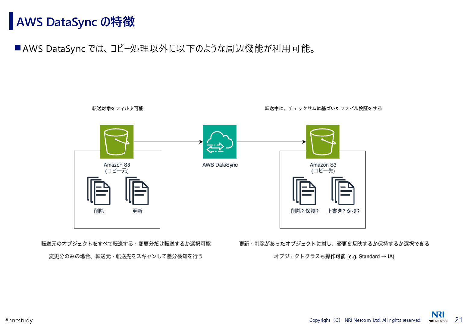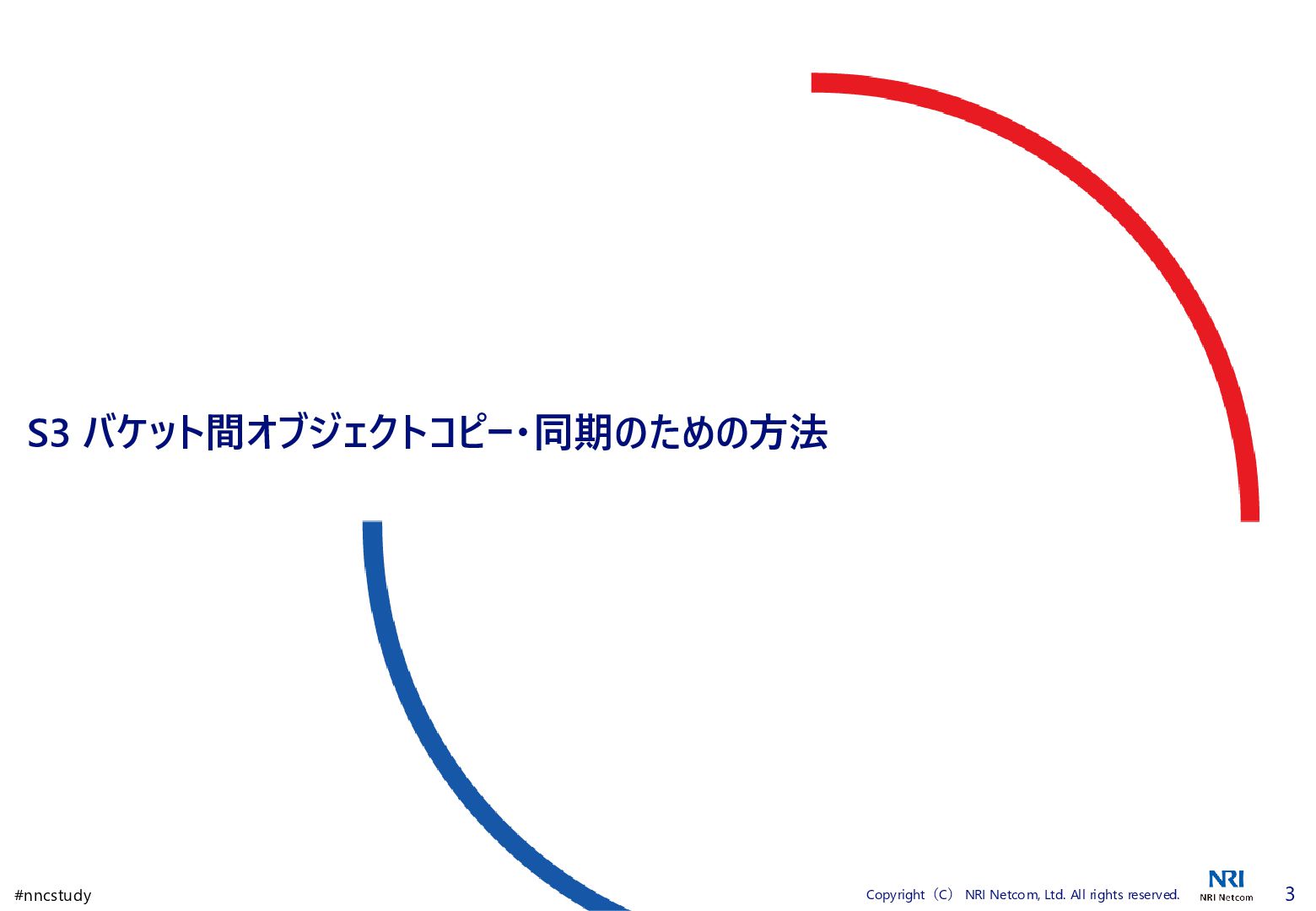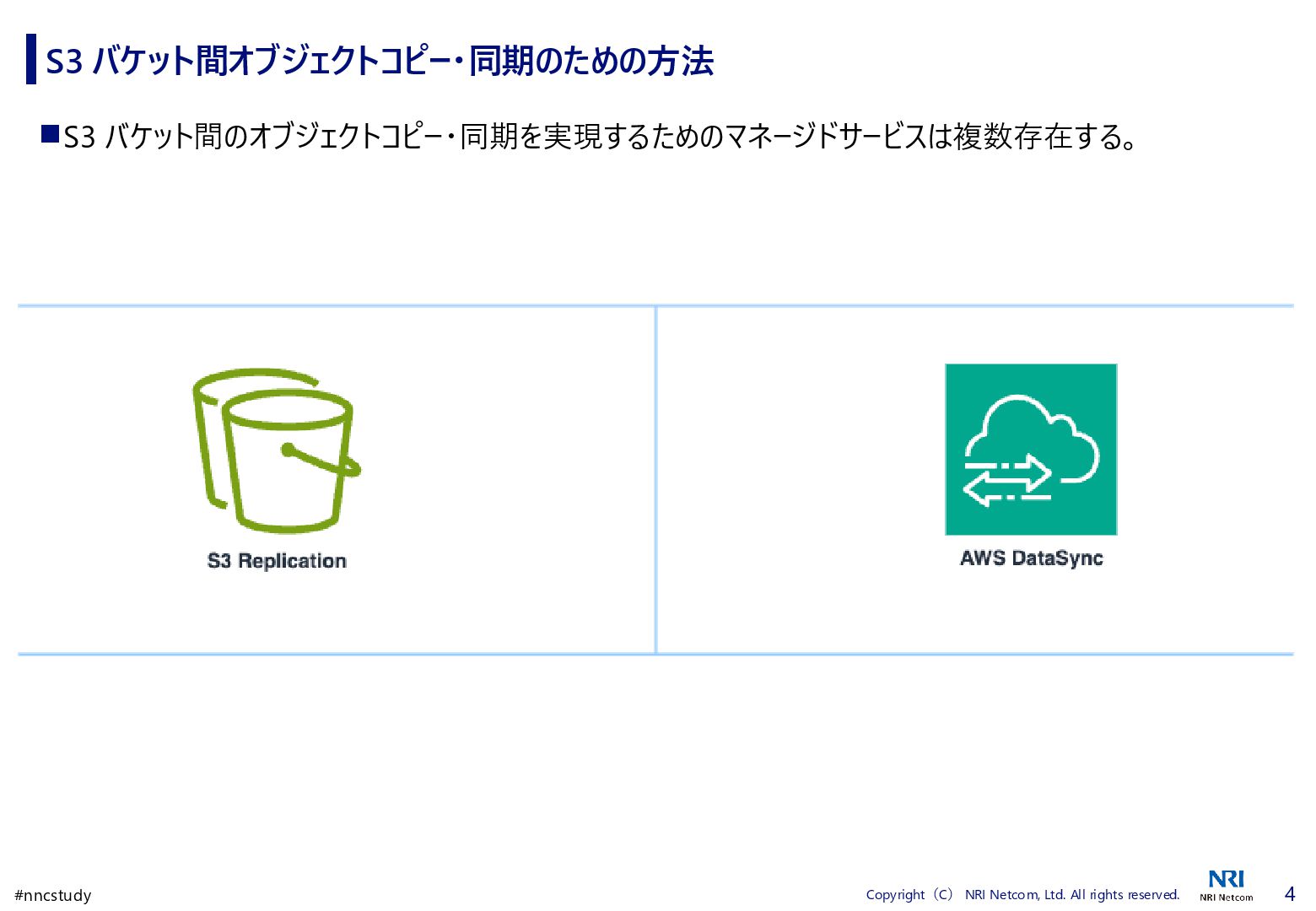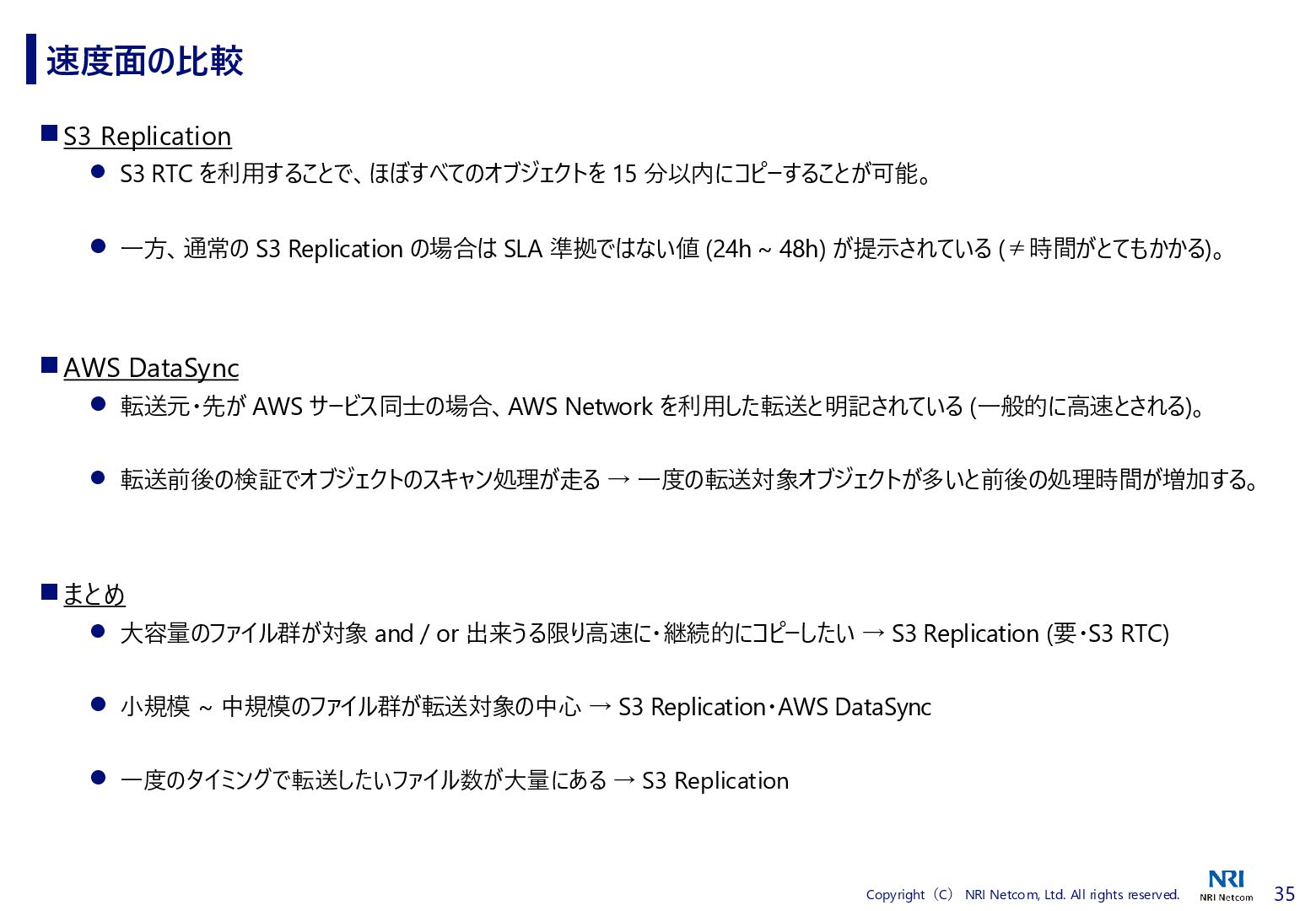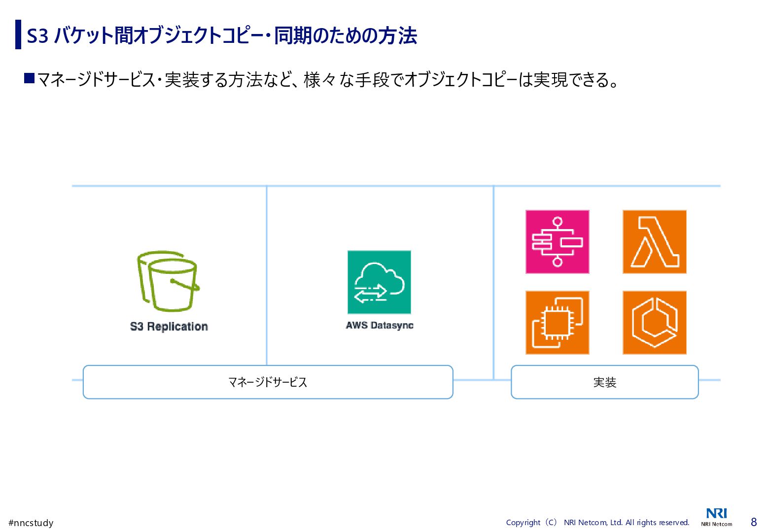 を利用した際に、S3 のオブジェクト保存以外にかかる料金は以下の通り (us-east-1)。 金銭コストの比較 #nncstudy https://aws.amazon.com/jp/s3/pricing/ https://aws.amazon.com/jp/blogs/storage/monitor-data-transfer-costs-related-to-amazon-s3-replication/ 項目 金額 備考 PUT リクエスト (Standard) USD 0.005 / 1000 req データ転送コスト (クロスリージョンの場合) USD 0.09 / GB • ~ 40TB / 月 • 以降、段階的に値 引き • 同一リージョンは無料 オンデマンドバッチレプリケーション (オンデマンドレプリケーションの場合) USD 0.25 / Job USD 1.00 / 1,000,000 processed obj USD 0.015 / 1,000,000 obj (in ソースバケット) ※ マニフェスト操作を実施する場合 S3 RTC USD 0.015 / GB ライブレプリケーションの場合