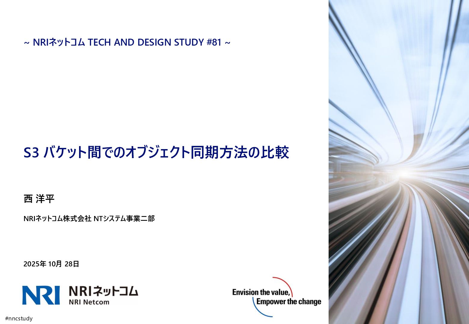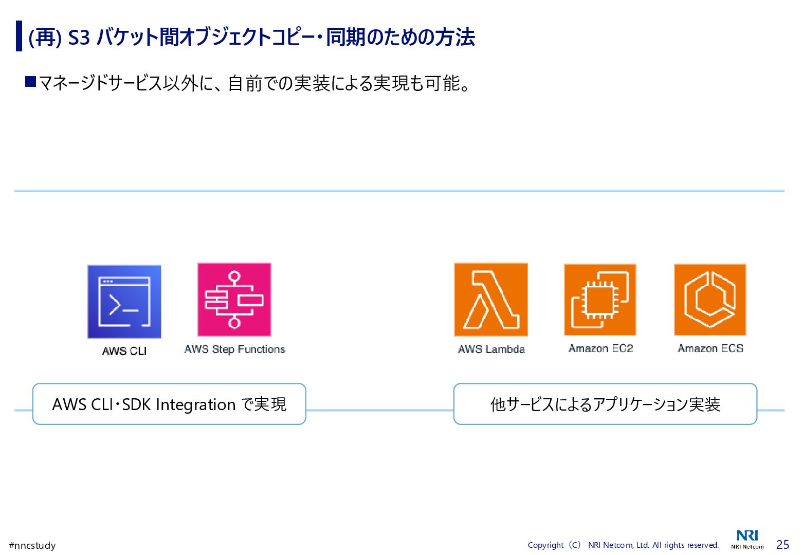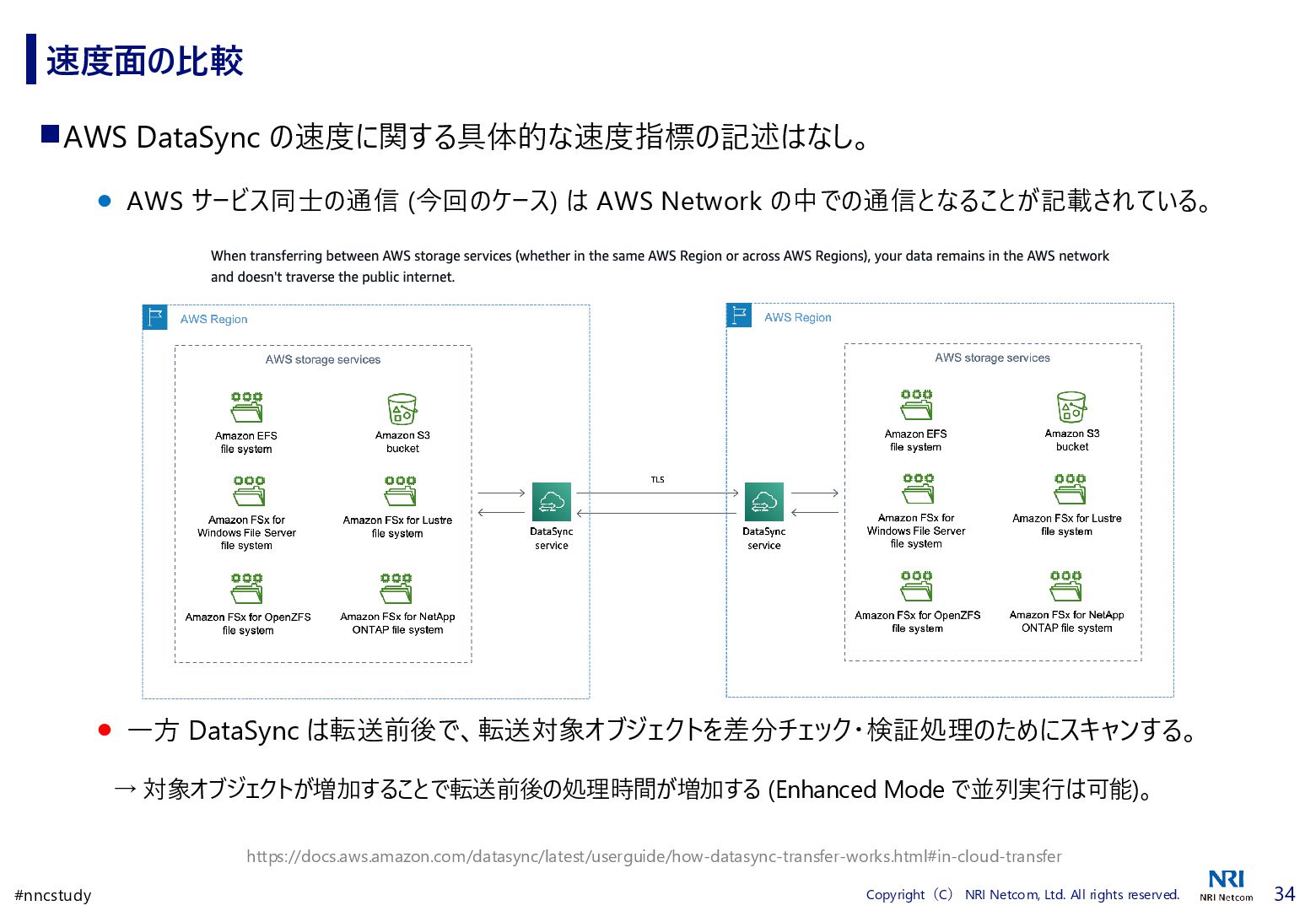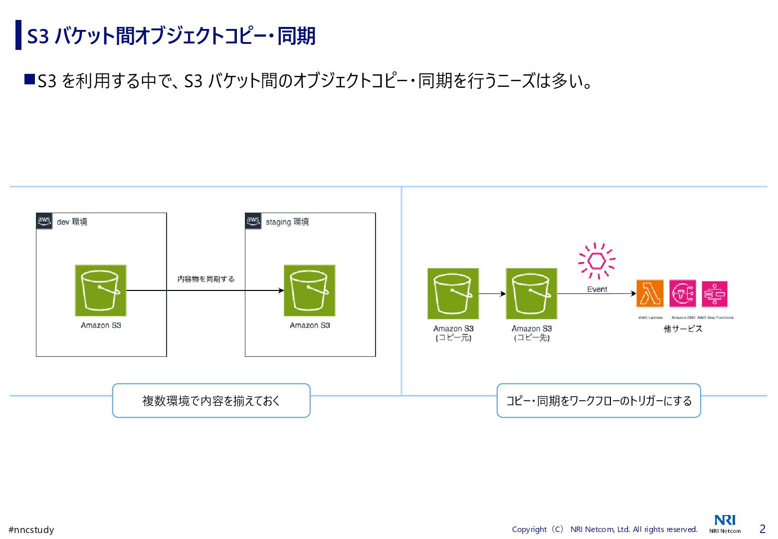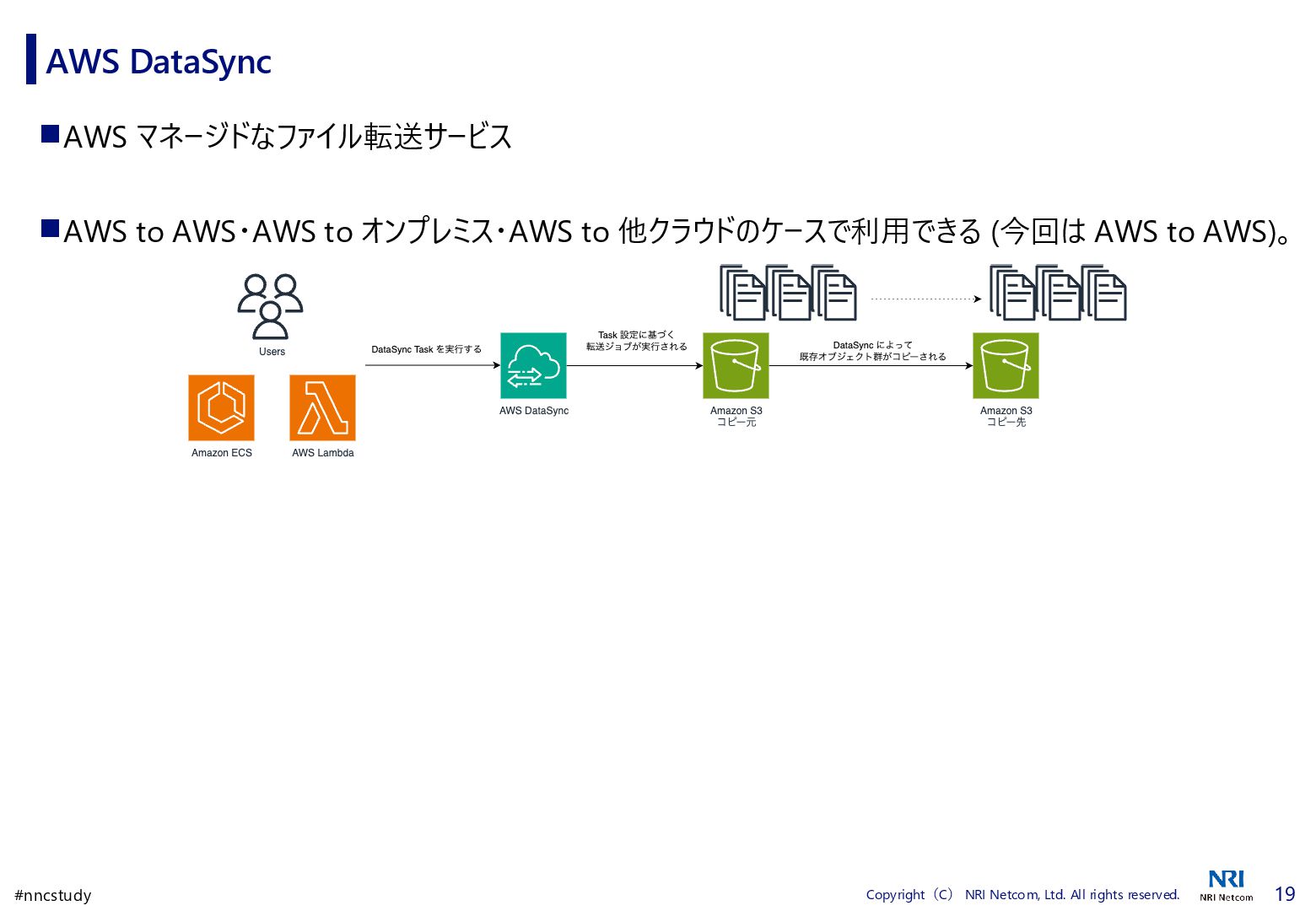 を利用した際に、S3 のオブジェクト保存以外にかかる料金は以下の通り (us-east-1)。 金銭コストの比較 #nncstudy https://aws.amazon.com/jp/s3/pricing/ https://aws.amazon.com/jp/blogs/storage/monitor-data-transfer-costs-related-to-amazon-s3-replication/ 項目 金額 備考 PUT リクエスト (Standard) USD 0.005 / 1000 req データ転送コスト (クロスリージョンの場合) USD 0.09 / GB • ~ 40TB / 月 • 以降、段階的に値 引き • 同一リージョンは無料 オンデマンドバッチレプリケーション (オンデマンドレプリケーションの場合) USD 0.25 / Job USD 1.00 / 1,000,000 processed obj USD 0.015 / 1,000,000 obj (in ソースバケット) ※ マニフェスト操作を実施する場合 S3 RTC USD 0.015 / GB ライブレプリケーションの場合