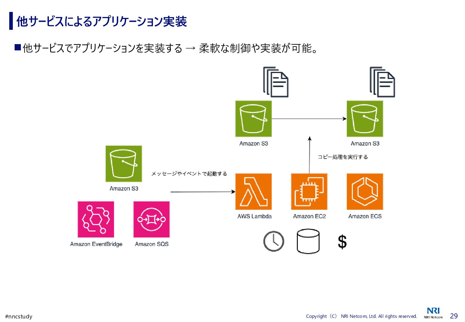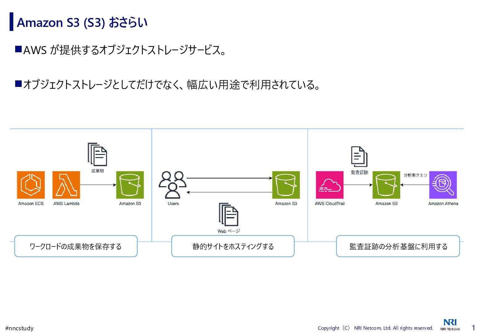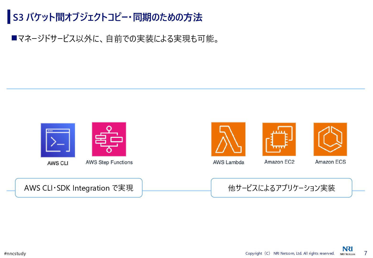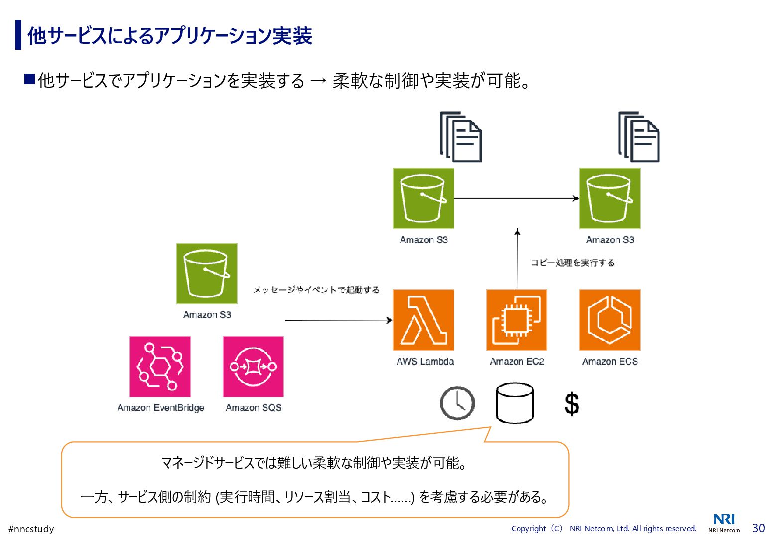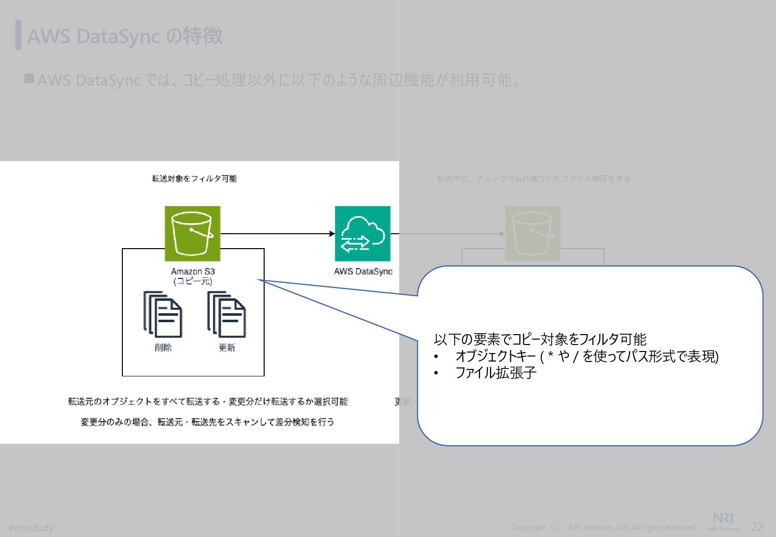 を利用した際に、S3 のオブジェクト保存以外にかかる料金は以下の通り (us-east-1)。 金銭コストの比較 #nncstudy https://aws.amazon.com/jp/s3/pricing/ https://aws.amazon.com/jp/blogs/storage/monitor-data-transfer-costs-related-to-amazon-s3-replication/ 項目 金額 備考 PUT リクエスト (Standard) USD 0.005 / 1000 req データ転送コスト (クロスリージョンの場合) USD 0.09 / GB • ~ 40TB / 月 • 以降、段階的に値 引き • 同一リージョンは無料 オンデマンドバッチレプリケーション (オンデマンドレプリケーションの場合) USD 0.25 / Job USD 1.00 / 1,000,000 processed obj USD 0.015 / 1,000,000 obj (in ソースバケット) ※ マニフェスト操作を実施する場合 S3 RTC USD 0.015 / GB ライブレプリケーションの場合