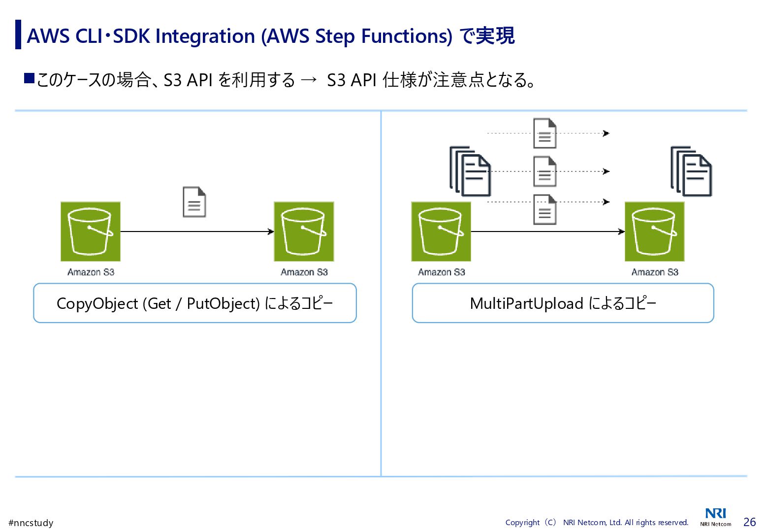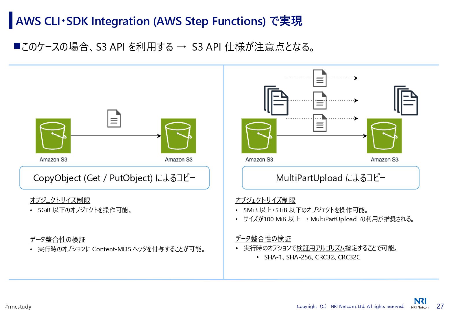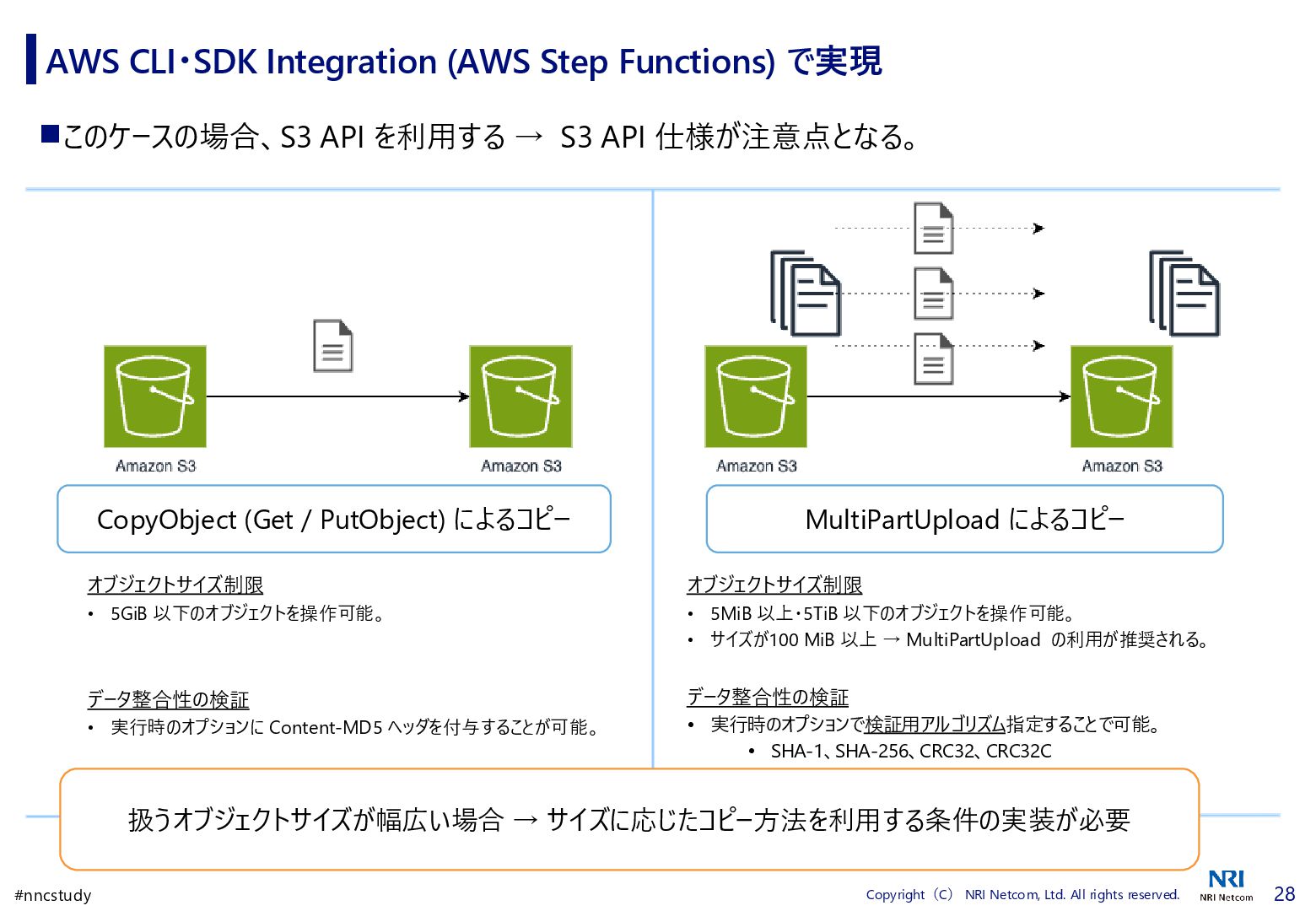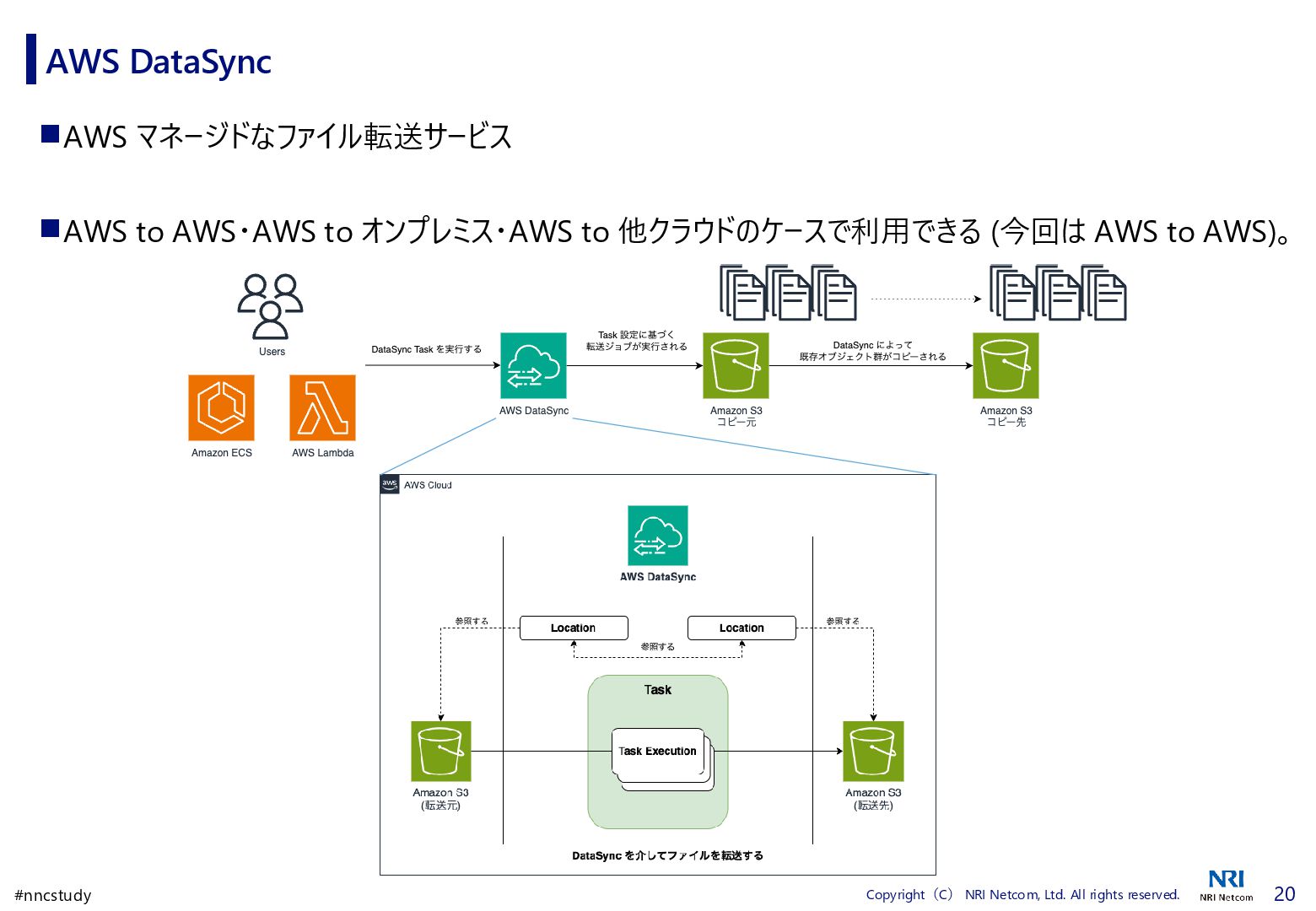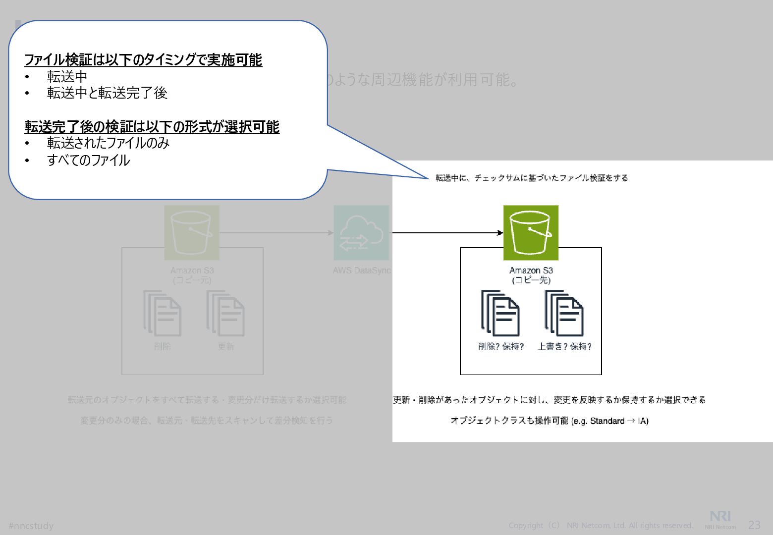 を利用した際に、S3 のオブジェクト保存以外にかかる料金は以下の通り (us-east-1)。 金銭コストの比較 #nncstudy https://aws.amazon.com/jp/s3/pricing/ https://aws.amazon.com/jp/blogs/storage/monitor-data-transfer-costs-related-to-amazon-s3-replication/ 項目 金額 備考 PUT リクエスト (Standard) USD 0.005 / 1000 req データ転送コスト (クロスリージョンの場合) USD 0.09 / GB • ~ 40TB / 月 • 以降、段階的に値 引き • 同一リージョンは無料 オンデマンドバッチレプリケーション (オンデマンドレプリケーションの場合) USD 0.25 / Job USD 1.00 / 1,000,000 processed obj USD 0.015 / 1,000,000 obj (in ソースバケット) ※ マニフェスト操作を実施する場合 S3 RTC USD 0.015 / GB ライブレプリケーションの場合