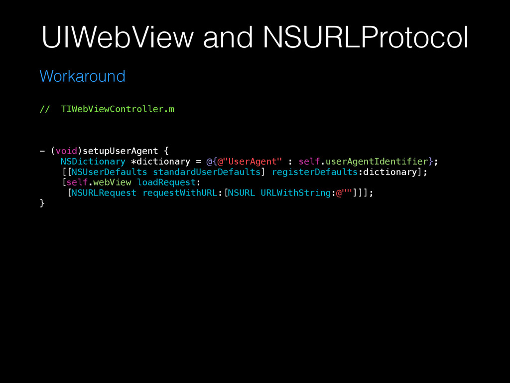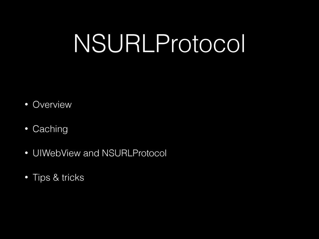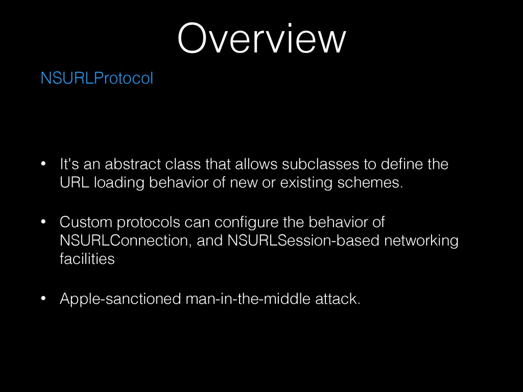 define the URL loading behavior of new or existing schemes. • Custom protocols can configure the behavior of NSURLConnection, and NSURLSession-based networking facilities • Apple-sanctioned man-in-the-middle attack. Overview