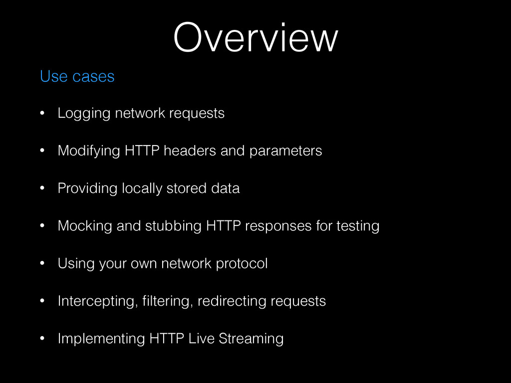 and parameters • Providing locally stored data • Mocking and stubbing HTTP responses for testing • Using your own network protocol • Intercepting, filtering, redirecting requests • Implementing HTTP Live Streaming Overview