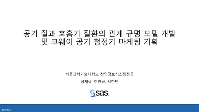 상관계수를 통한 예측적 변수선택 ① 변수간의 상관관계 p-value 고려 - 모든 변수간의 관계 p-value 0.001이하 (즉, 모든 변수들간 상관관계 있음을 나타냄 – 지표 부적합) ② 변수간의 상관계수 고려 1) 상관계수 절대값 0.5/0.6/0.65/0.7 점진적 증가해 “상관계수 높은 변수 관계” 추출 (공기 질 변수 유의미한 0.65/0.7 기준에서만 시행) 2) 변수 관계 중 목표변수와의 상관계수 가장 큰 변수 선택 (대표 변수 선정, 이외의 관계 갖는 변수 삭제) ③ 분산팽창지수(VIF)를 고려해 ‘다중공성선‘ 예상되는 변수 추가 삭제 ④ 상관계수 기준 별 위 과정을 거친 모델 비교해 Valid. SSE 최소인 모델에서 선택된 변수 선택 Ⅱ. 단계별 선택을 통한 탐색적 변수 선택 ① 데이터분할 노드 변경 반복, 회귀분석 시행 난수초기값 변경/반복 시행(15회씩), 기타 parameter 고정 ② “전진 선택”, “후진 제거”, “단계적 선택“법에 의한 회귀분석모델 중 최적 모델에 적용되는 입력변수를 분석. (이때, 최적모델의 기준은 Valid. SSE 최소) ③ 분산팽창지수(VIF)를 고려해 ‘다중공성선‘ 예상되는 변수 추가 삭제 - (선택적 변수선택 과정과 동일) ④ 상관계수 기준 별 위 과정을 거친 모델 비교해 Valid. SSE 최소인 모델에서 선택된 변수 선택 1. 변수선택법 개요(다음 슬라이드부터 설명) 2. 변수선택법 결과 및 최종선택 참조 모델 변수선택 방법 최적모델 기준 SSE : Train SSE : Valid. SSE : Test Adj.-R² Ⅰ. 예측적 방법 상관계수 0.65 14,421,622 7,386,324 2,268,690 0.7838 상관계수 0.70 14,285,864 7,315,528 2,37,0596 0.7857 Ⅱ. 탐색적 방법 전진 선택 13,646,254 6,568,176 2,219,554 0.7979 후진 제거 13,473,073 6,568,162 2,263,994 0.7979 단계별 선택 15,393,497 7,542,092 2,584,485 0.7684 각 기준에서 최적모델의 Valid. SSE값을 비교했을 때, Ⅱ. 탐색적 방법(후진제거 법)의 최적모델의 SSE값이 최소이므로, 이 모델에서 선택된 변수를 참고하고자 함. 14
