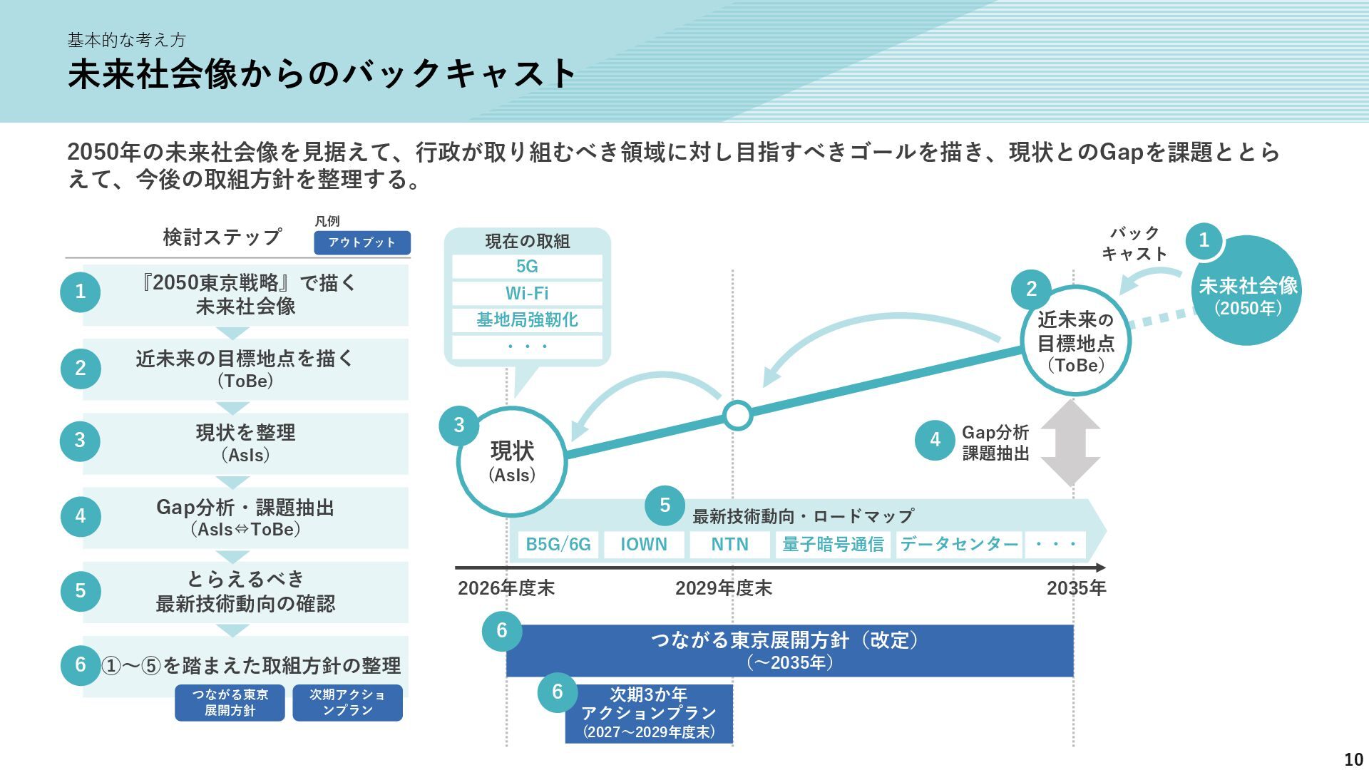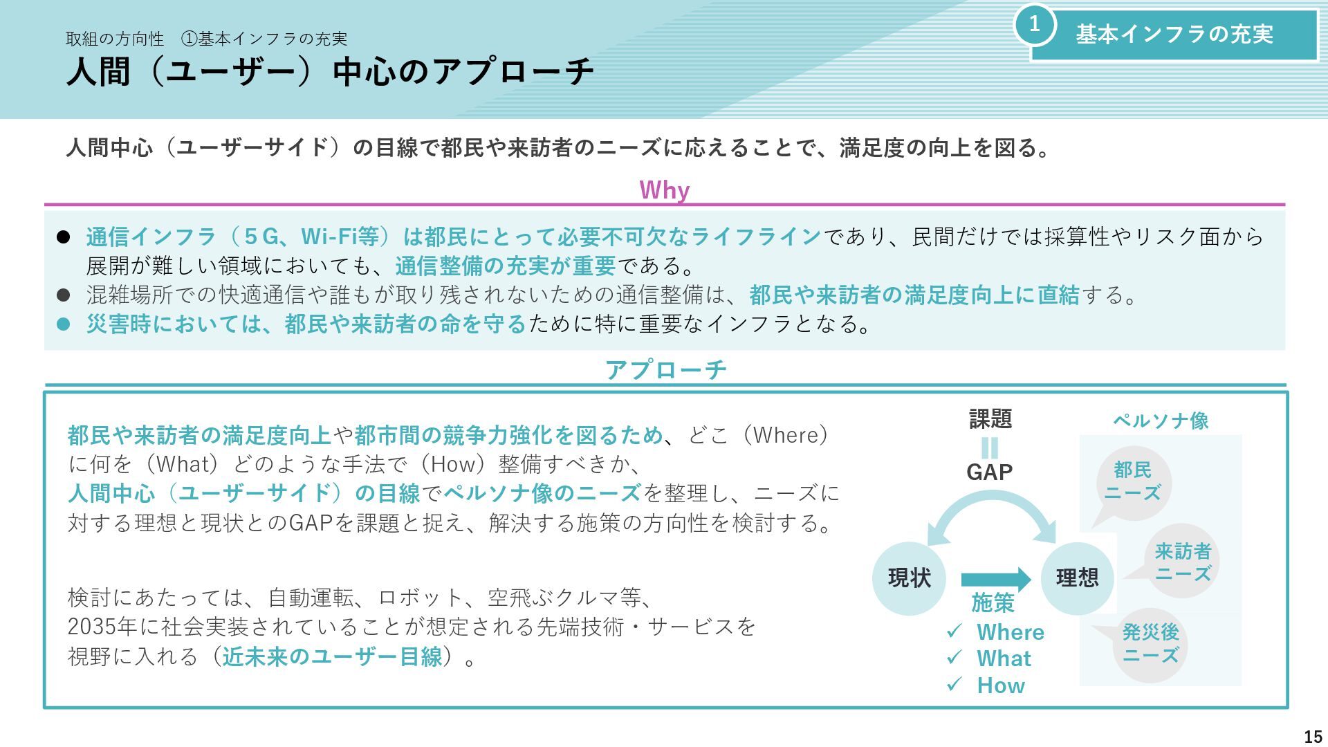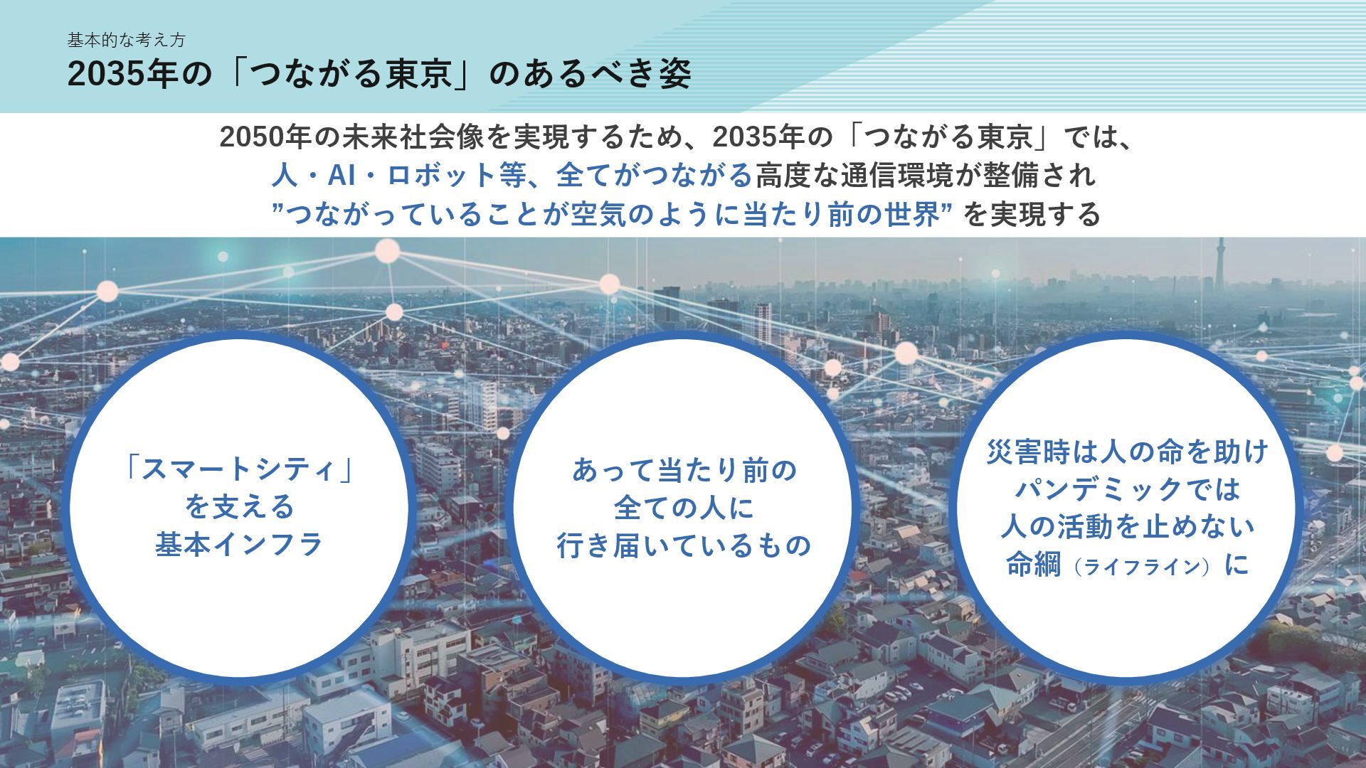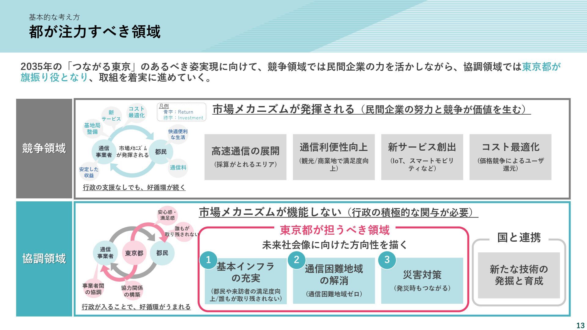 新たな技術の 発掘と育成 都が注力すべき領域 2035年の「つながる東京」のあるべき姿実現に向けて、競争領域では民間企業の力を活かしながら、協調領域では東京都が 旗振り役となり、取組を着実に進めていく。 競争領域 市場メカニズムが発揮される(民間企業の努力と競争が価値を生む) 協調領域 市場メカニズムが機能しない(行政の積極的な関与が必要) 高速通信の展開 (採算がとれるエリア) 通信利便性向上 (観光/商業地で満足度向 上) 新サービス創出 (IoT、スマートモビリ ティなど) コスト最適化 (価格競争によるユーザ 還元) 東京都が担うべき領域 国と連携 1 2 3 市場メカニズム が発揮される 都民 通信 事業者 基地局 整備 コスト 最適化 新 サービス 通信料 行政の支援なしでも、好循環が続く 快適便利 な生活 安定した 収益 青字:Return 緑字:Investment 凡例 都民 通信 事業者 行政が入ることで、好循環がうまれる 東京都 協力関係 の構築 安心感・ 満足感 事業者間 の協調 基本的な考え方 誰もが 取り残されない 未来社会像に向けた方向性を描く