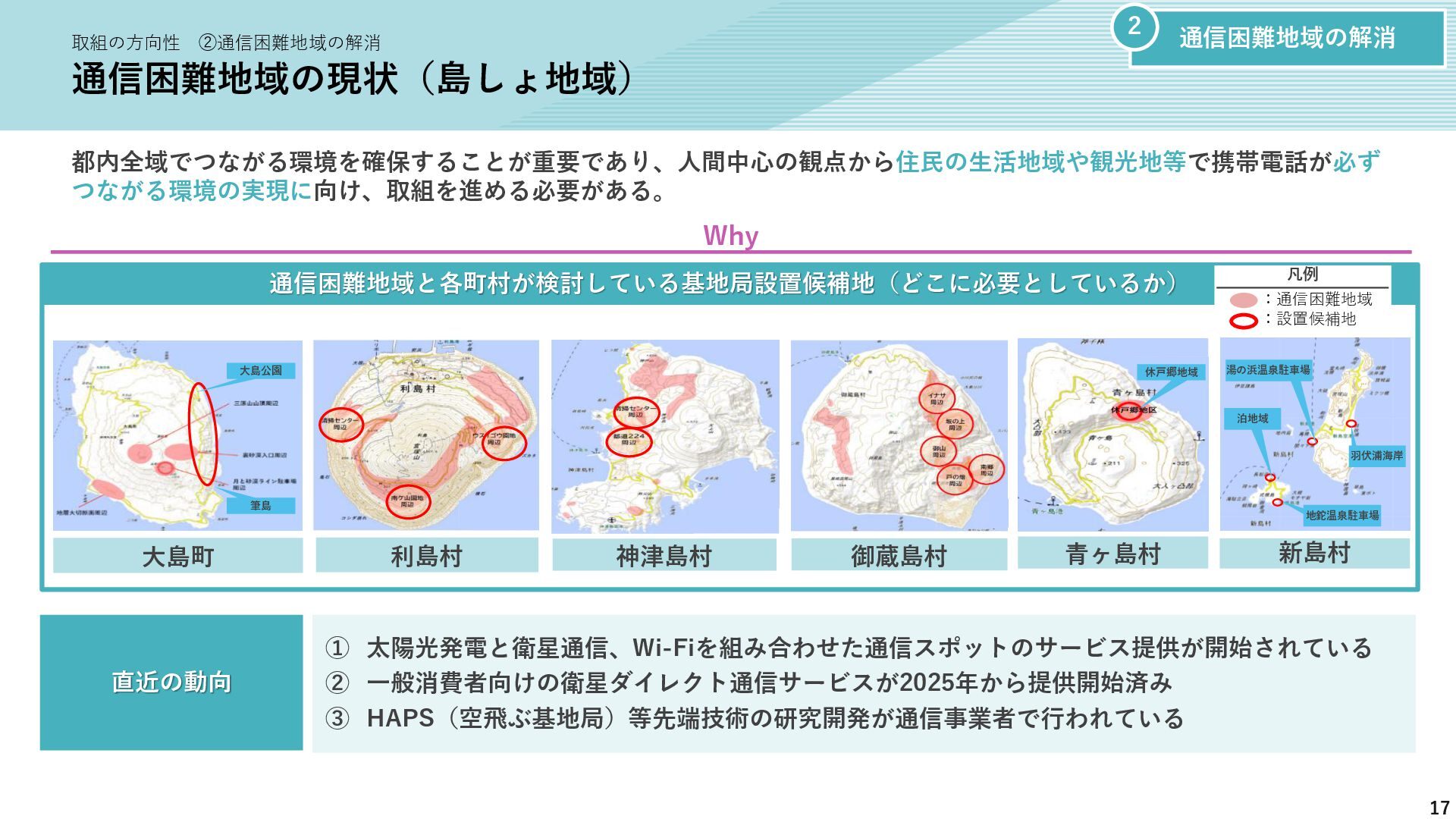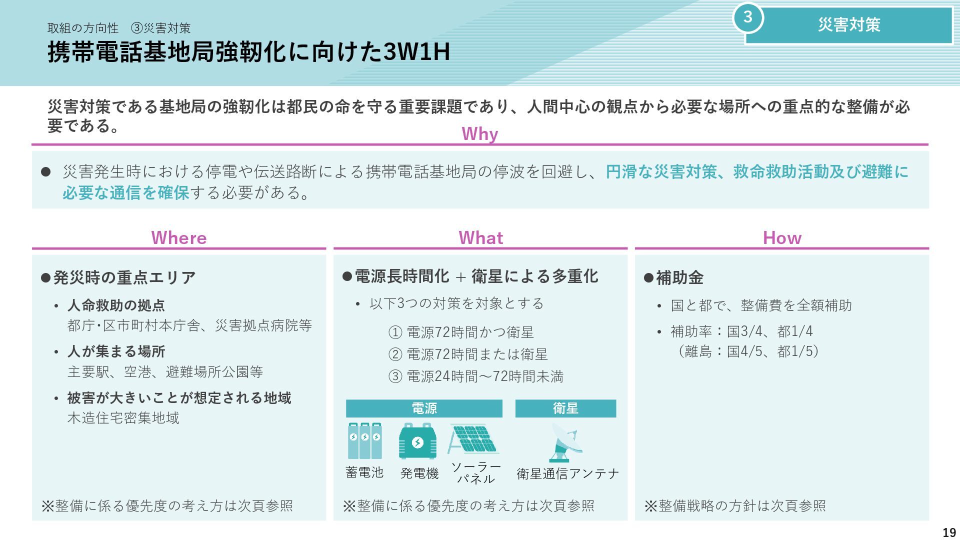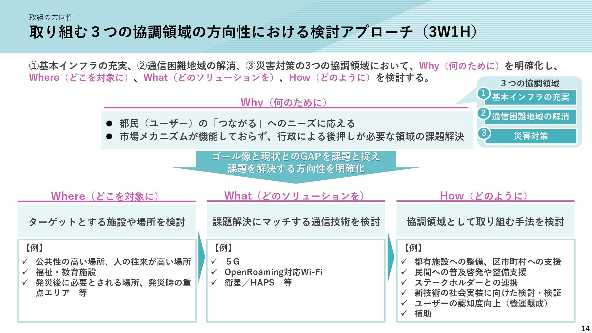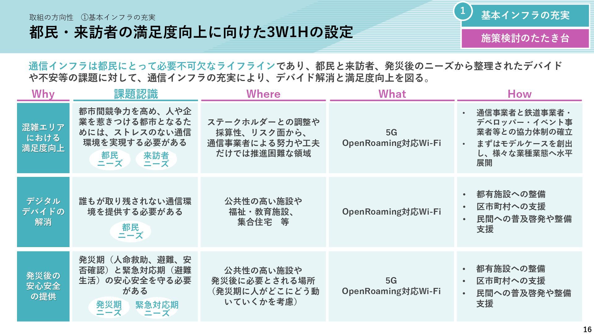 新たな技術の 発掘と育成 都が注力すべき領域 2035年の「つながる東京」のあるべき姿実現に向けて、競争領域では民間企業の力を活かしながら、協調領域では東京都が 旗振り役となり、取組を着実に進めていく。 競争領域 市場メカニズムが発揮される(民間企業の努力と競争が価値を生む) 協調領域 市場メカニズムが機能しない(行政の積極的な関与が必要) 高速通信の展開 (採算がとれるエリア) 通信利便性向上 (観光/商業地で満足度向 上) 新サービス創出 (IoT、スマートモビリ ティなど) コスト最適化 (価格競争によるユーザ 還元) 東京都が担うべき領域 国と連携 1 2 3 市場メカニズム が発揮される 都民 通信 事業者 基地局 整備 コスト 最適化 新 サービス 通信料 行政の支援なしでも、好循環が続く 快適便利 な生活 安定した 収益 青字:Return 緑字:Investment 凡例 都民 通信 事業者 行政が入ることで、好循環がうまれる 東京都 協力関係 の構築 安心感・ 満足感 事業者間 の協調 基本的な考え方 誰もが 取り残されない 未来社会像に向けた方向性を描く