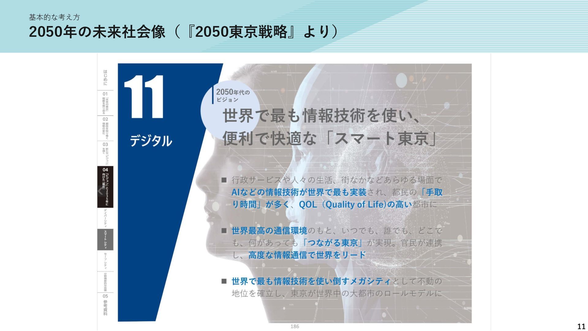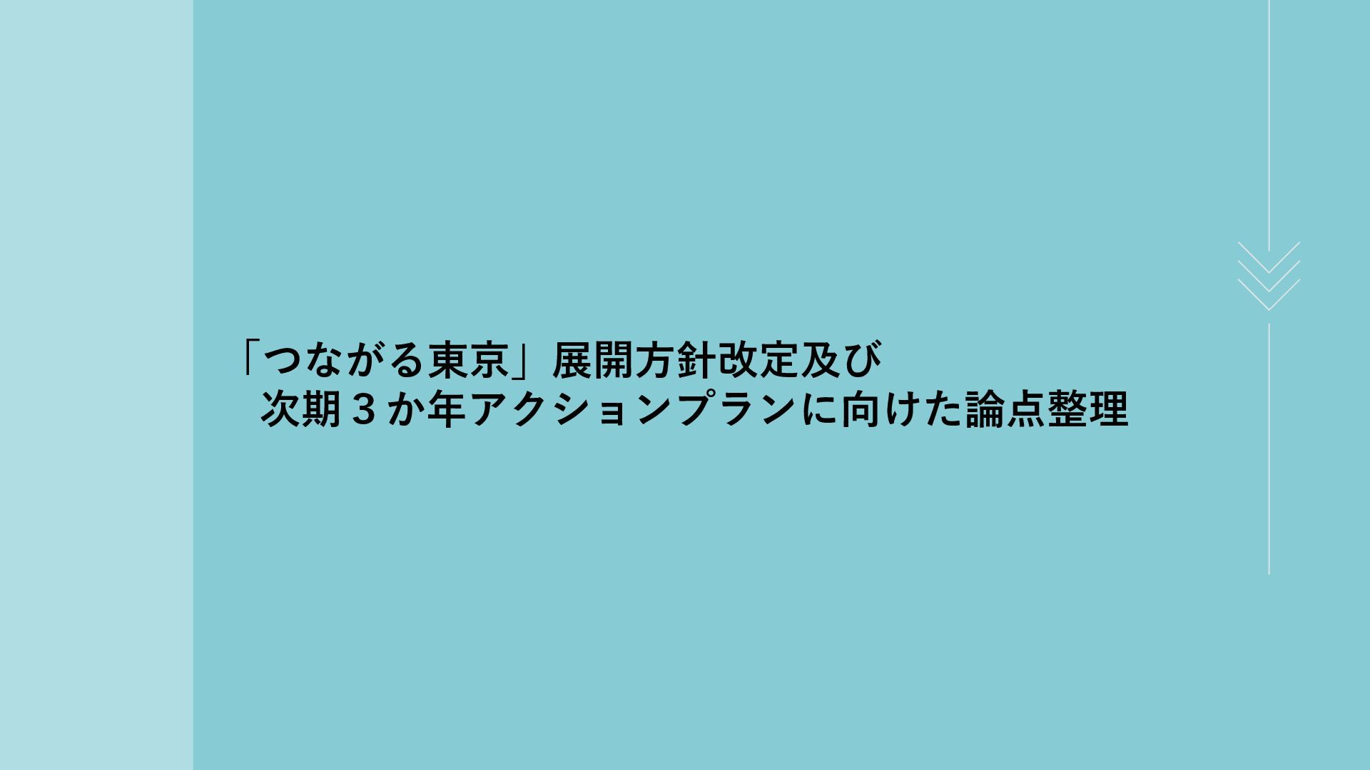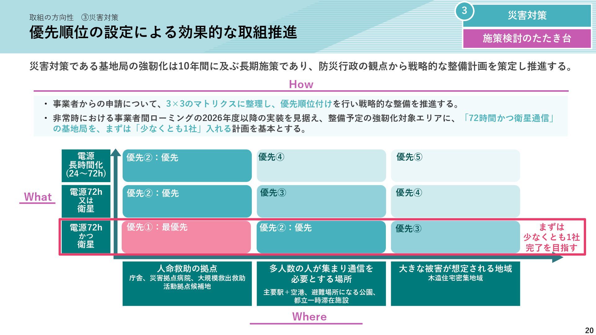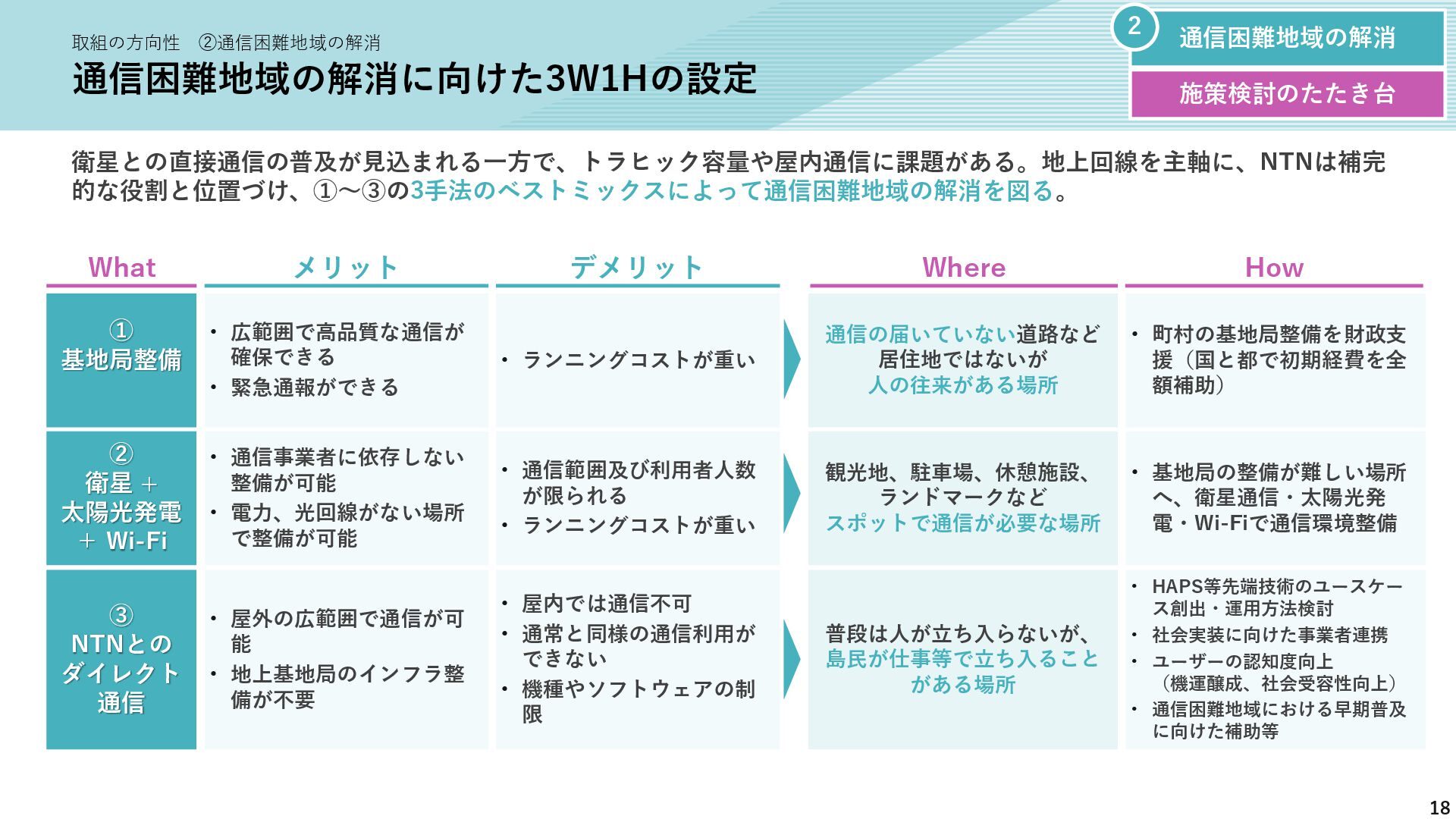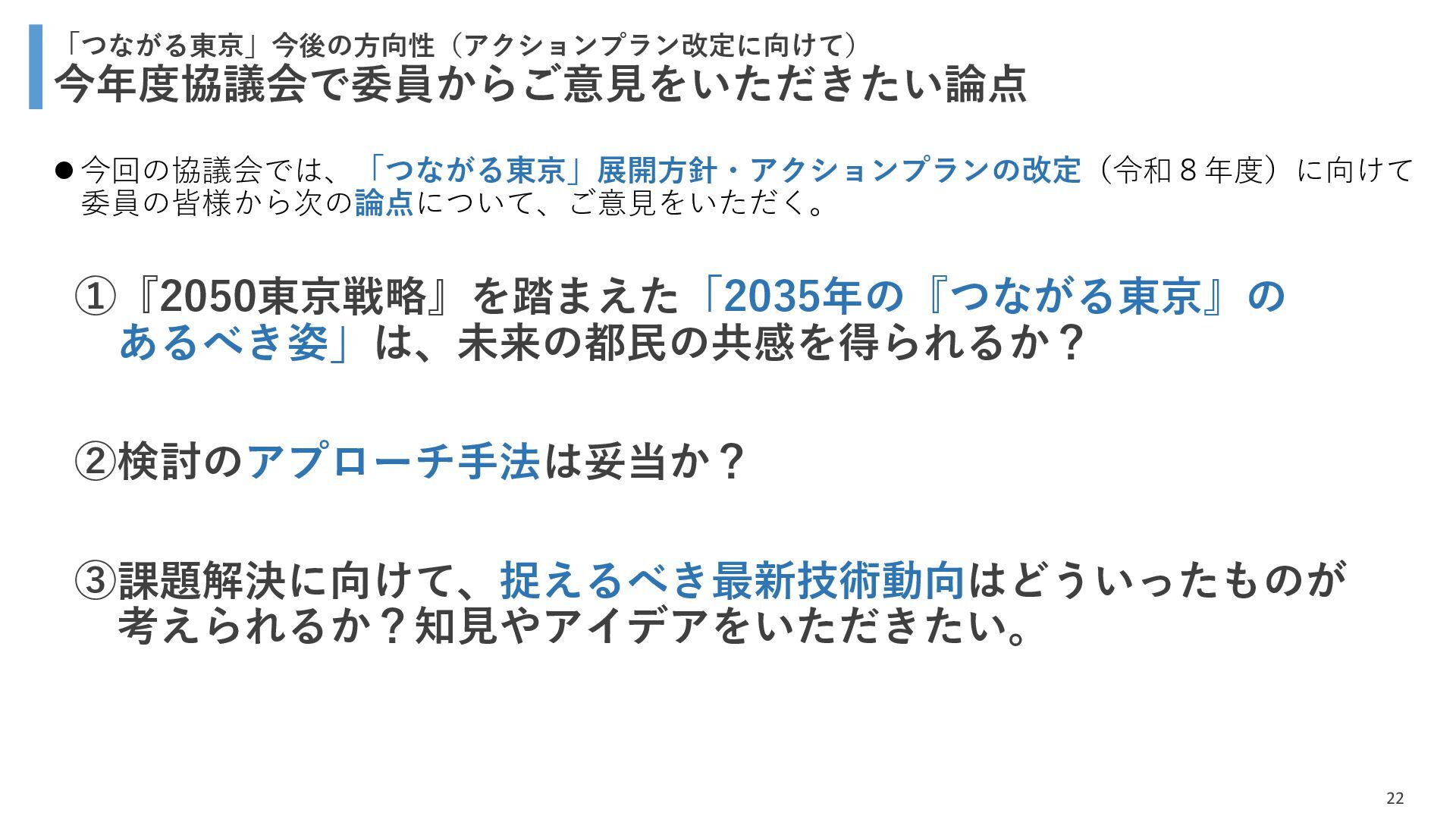 新たな技術の 発掘と育成 都が注力すべき領域 2035年の「つながる東京」のあるべき姿実現に向けて、競争領域では民間企業の力を活かしながら、協調領域では東京都が 旗振り役となり、取組を着実に進めていく。 競争領域 市場メカニズムが発揮される(民間企業の努力と競争が価値を生む) 協調領域 市場メカニズムが機能しない(行政の積極的な関与が必要) 高速通信の展開 (採算がとれるエリア) 通信利便性向上 (観光/商業地で満足度向 上) 新サービス創出 (IoT、スマートモビリ ティなど) コスト最適化 (価格競争によるユーザ 還元) 東京都が担うべき領域 国と連携 1 2 3 市場メカニズム が発揮される 都民 通信 事業者 基地局 整備 コスト 最適化 新 サービス 通信料 行政の支援なしでも、好循環が続く 快適便利 な生活 安定した 収益 青字:Return 緑字:Investment 凡例 都民 通信 事業者 行政が入ることで、好循環がうまれる 東京都 協力関係 の構築 安心感・ 満足感 事業者間 の協調 基本的な考え方 誰もが 取り残されない 未来社会像に向けた方向性を描く