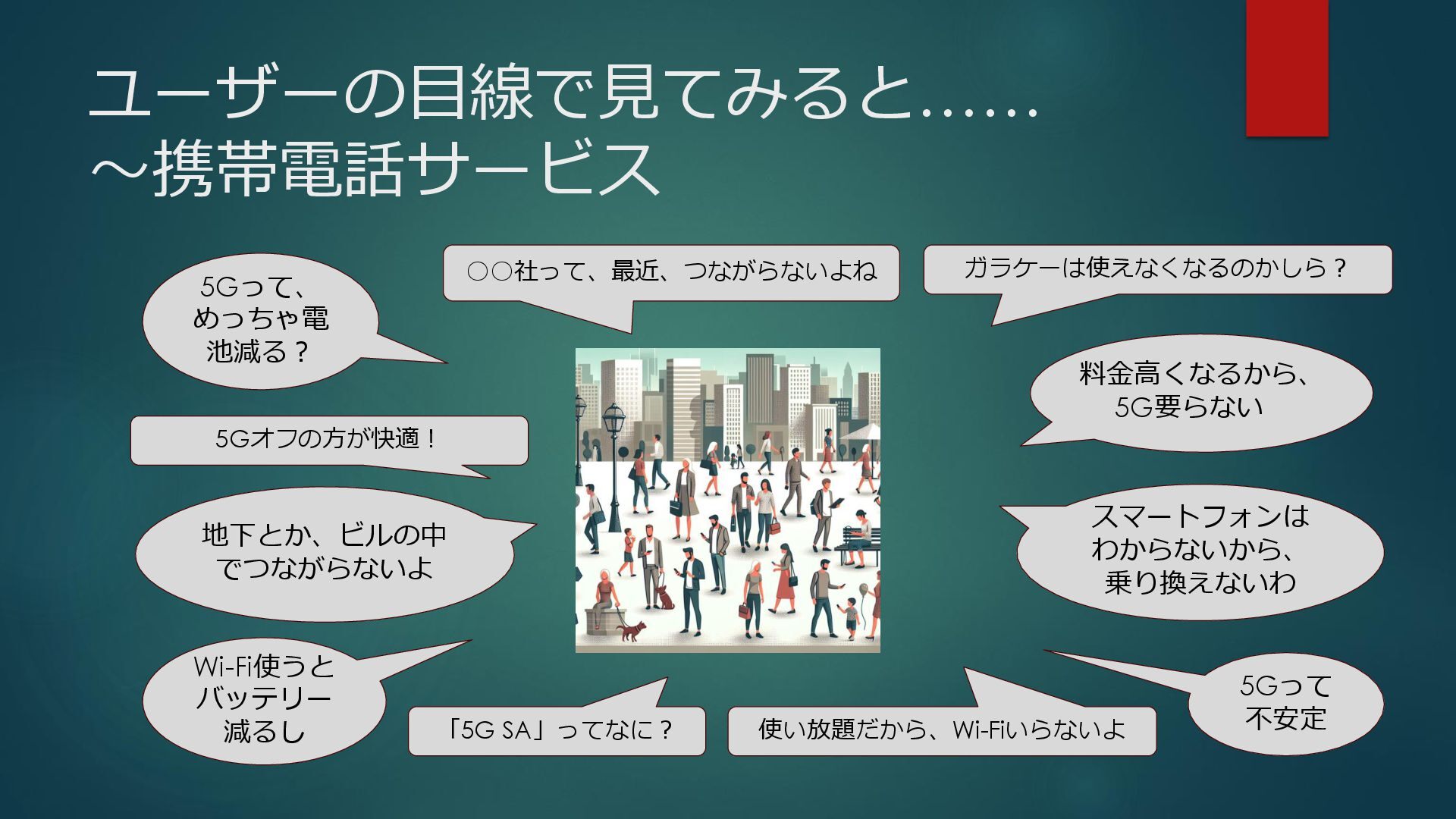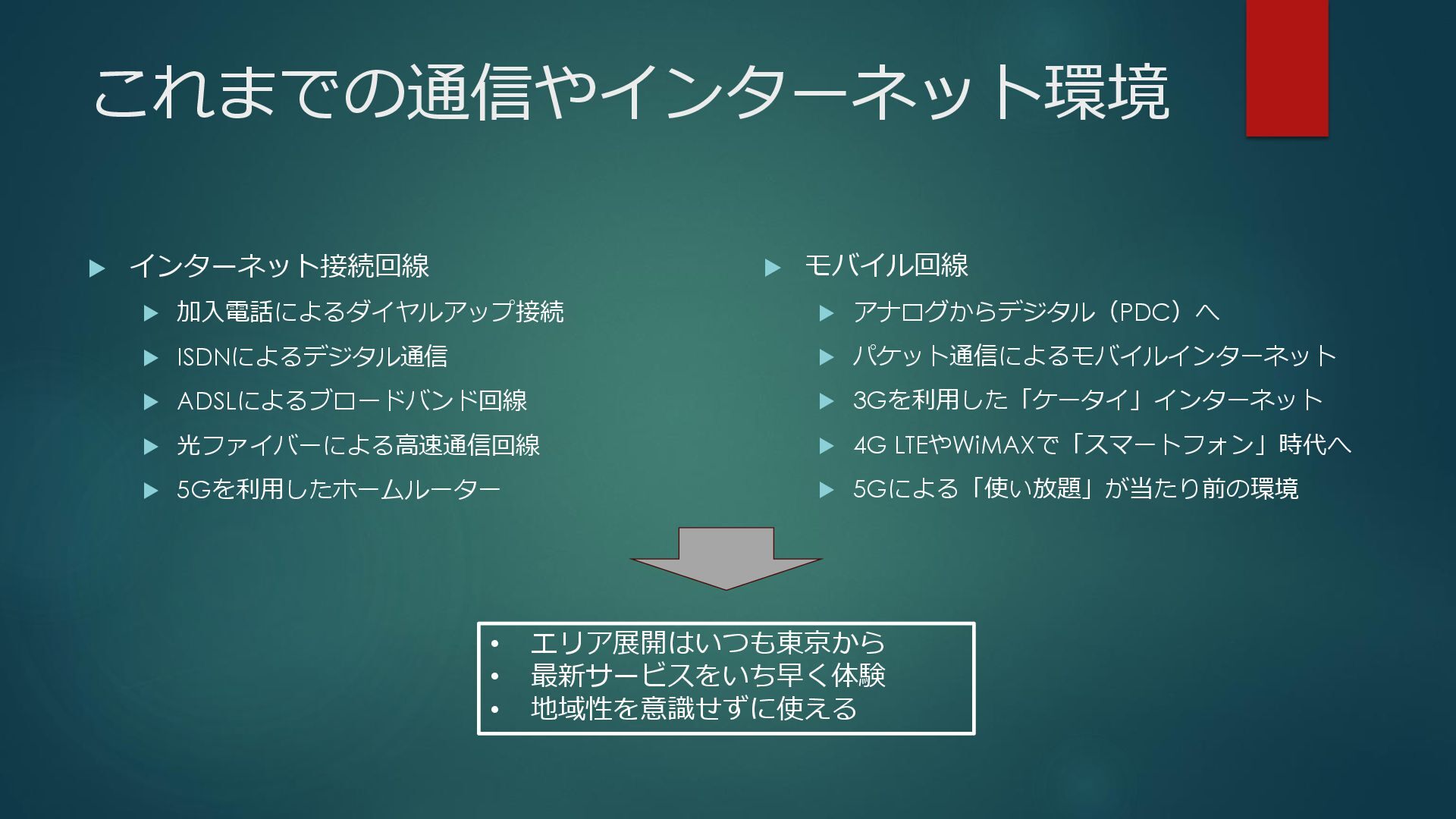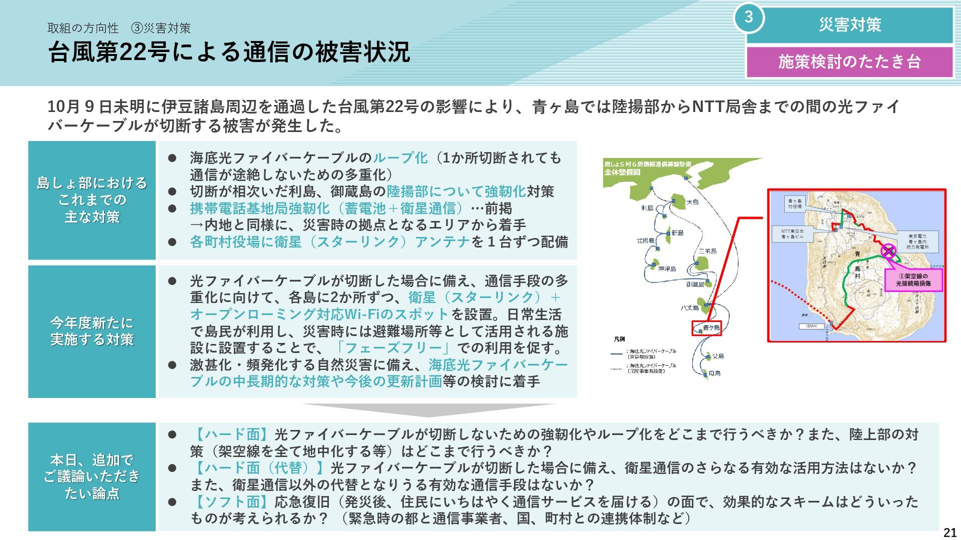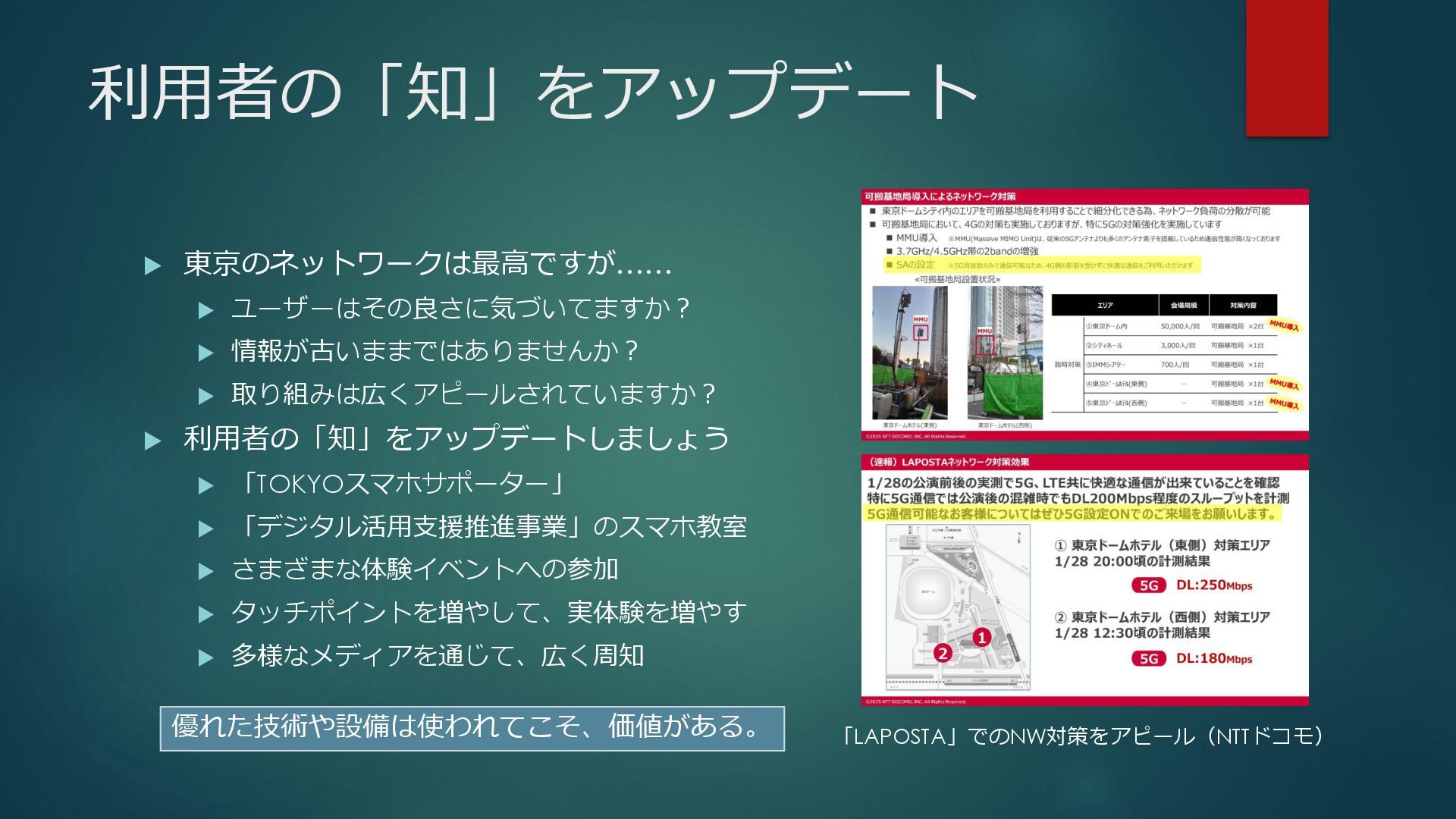 新たな技術の 発掘と育成 都が注力すべき領域 2035年の「つながる東京」のあるべき姿実現に向けて、競争領域では民間企業の力を活かしながら、協調領域では東京都が 旗振り役となり、取組を着実に進めていく。 競争領域 市場メカニズムが発揮される(民間企業の努力と競争が価値を生む) 協調領域 市場メカニズムが機能しない(行政の積極的な関与が必要) 高速通信の展開 (採算がとれるエリア) 通信利便性向上 (観光/商業地で満足度向 上) 新サービス創出 (IoT、スマートモビリ ティなど) コスト最適化 (価格競争によるユーザ 還元) 東京都が担うべき領域 国と連携 1 2 3 市場メカニズム が発揮される 都民 通信 事業者 基地局 整備 コスト 最適化 新 サービス 通信料 行政の支援なしでも、好循環が続く 快適便利 な生活 安定した 収益 青字:Return 緑字:Investment 凡例 都民 通信 事業者 行政が入ることで、好循環がうまれる 東京都 協力関係 の構築 安心感・ 満足感 事業者間 の協調 基本的な考え方 誰もが 取り残されない 未来社会像に向けた方向性を描く
