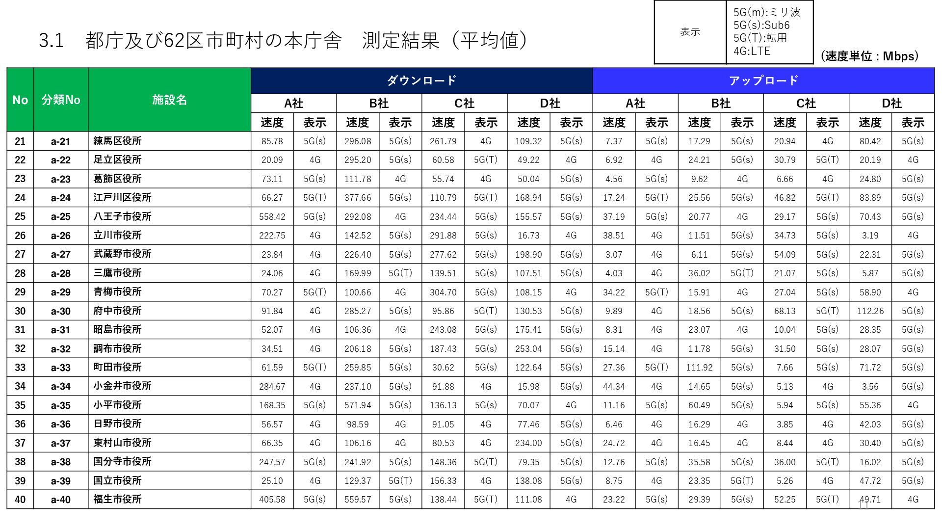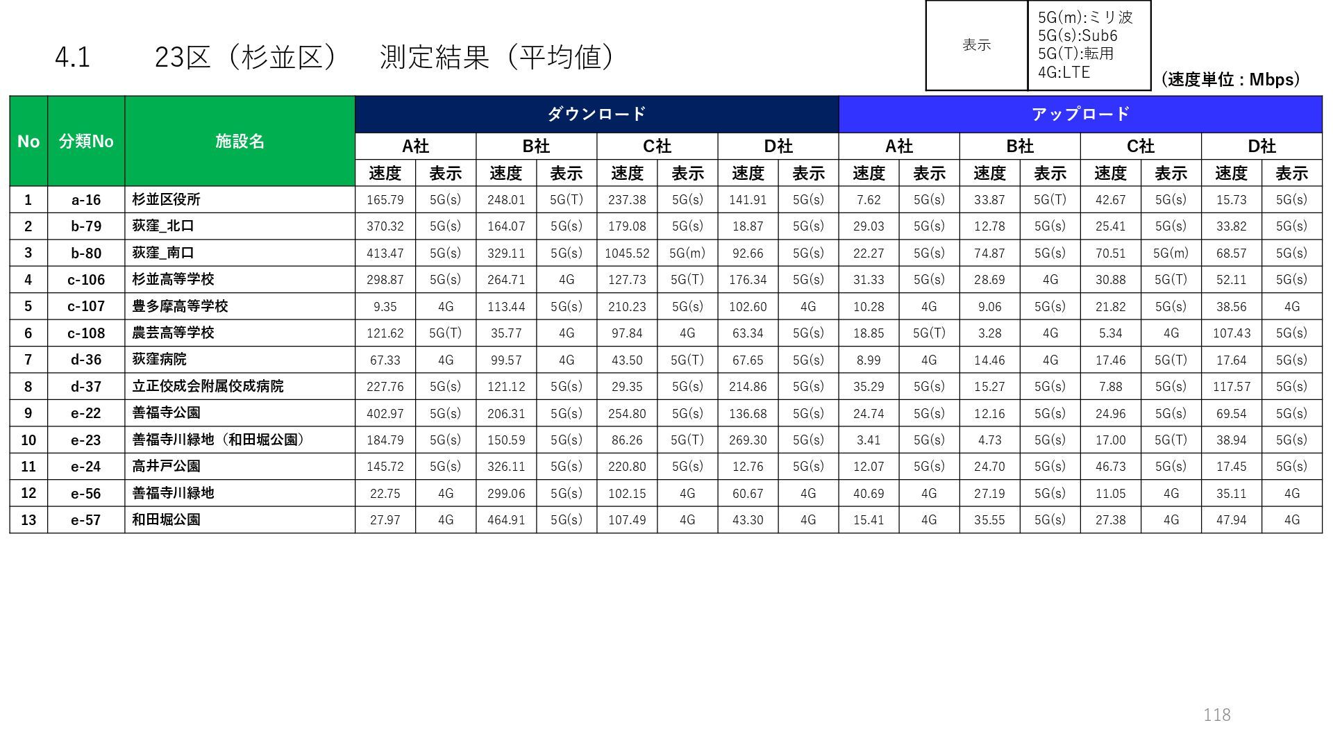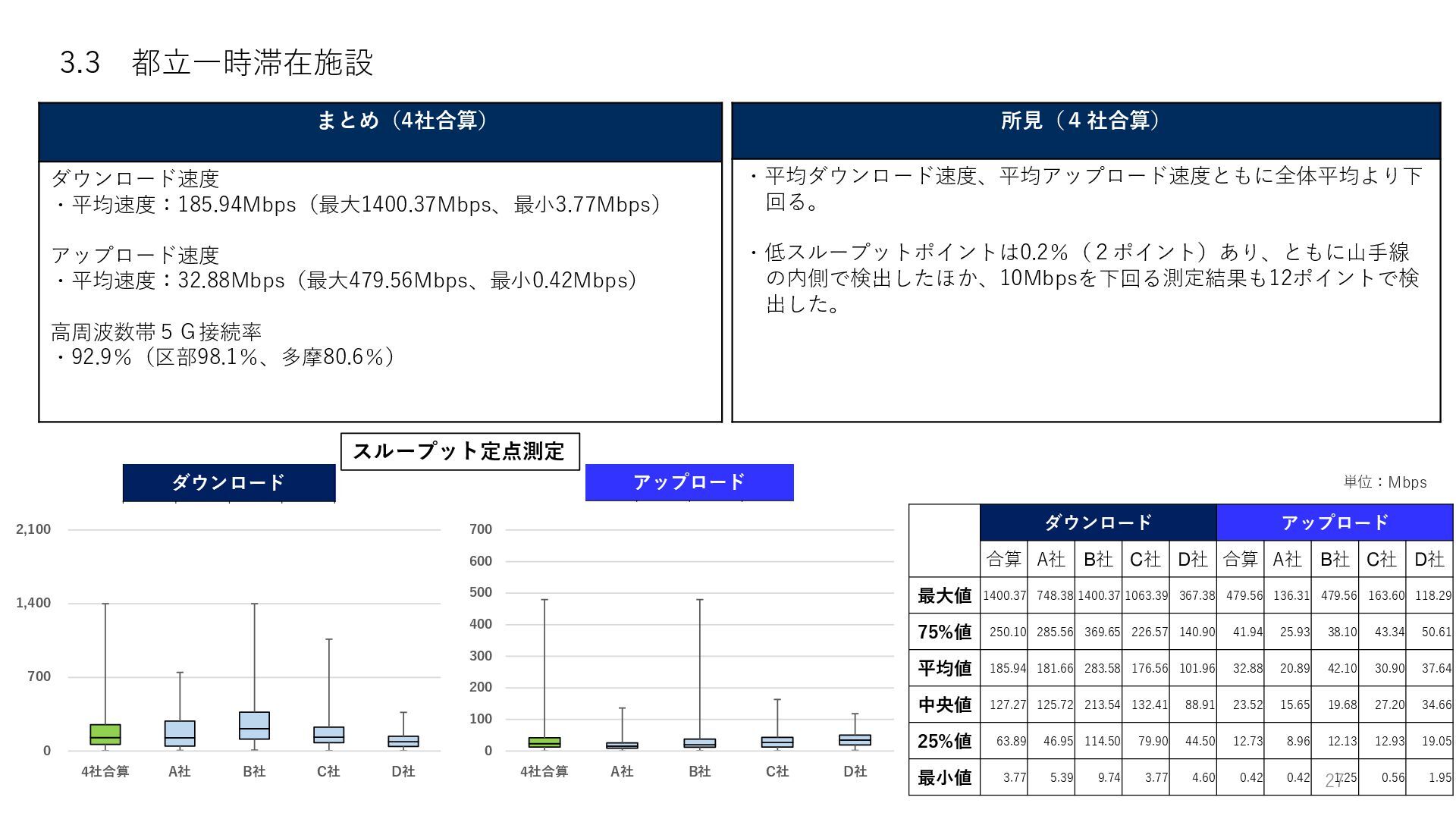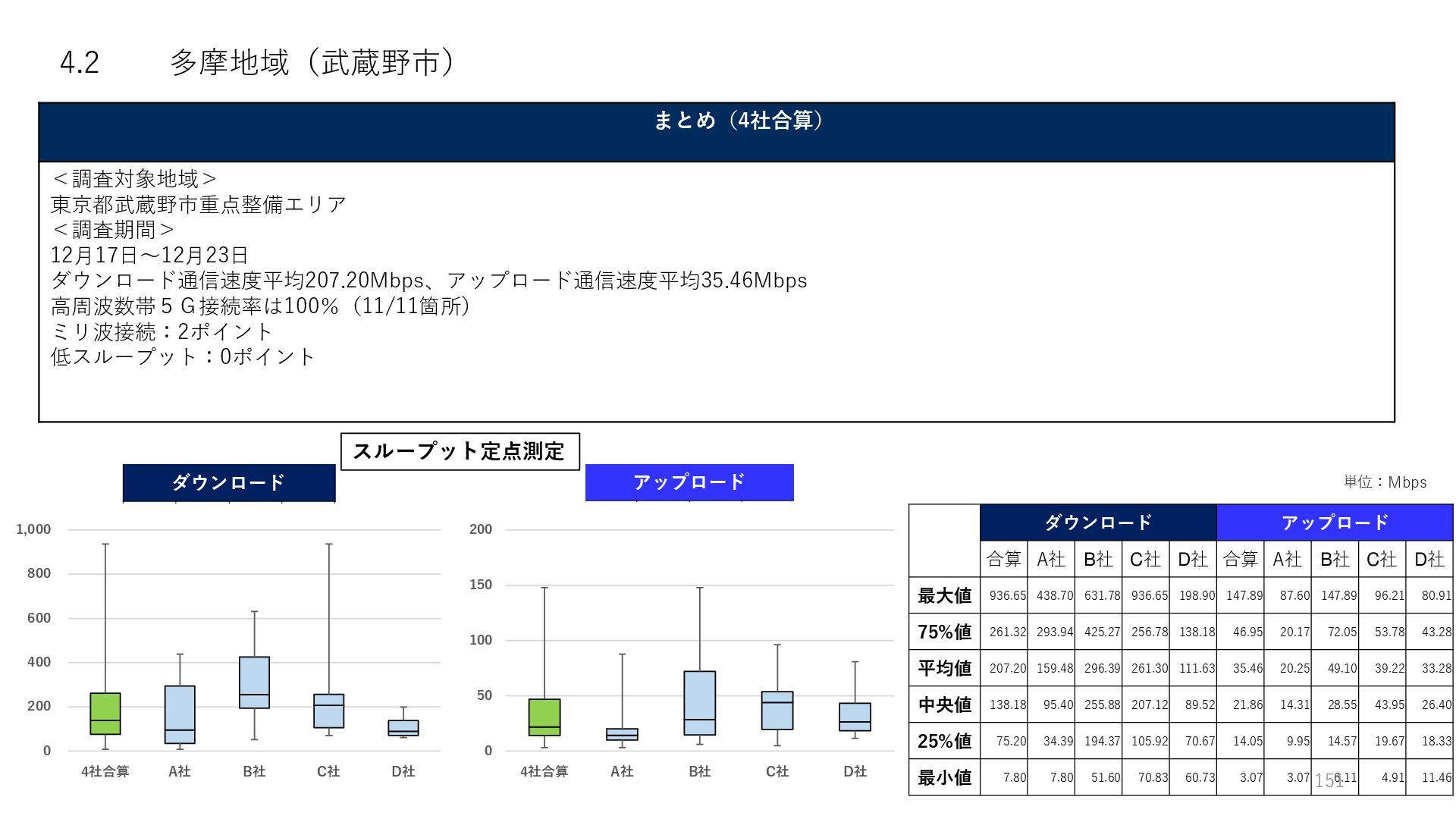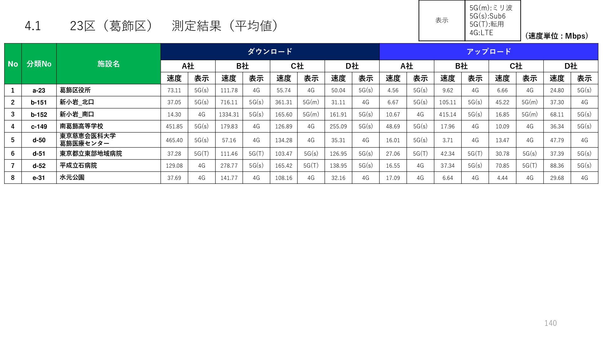 23区(葛飾区) 単位:Mbps ダウンロード アップロード 合算 A社 B社 C社 D社 合算 A社 B社 C社 D社 最大値 1334.31 465.40 1334.31 361.31 255.09 415.14 48.69 415.14 70.85 88.36 75%値 169.16 209.77 388.11 165.47 144.69 43.06 19.58 58.03 34.39 52.87 平均値 194.67 155.72 366.40 152.61 103.94 42.29 18.41 79.73 24.80 46.22 中央値 126.92 55.40 160.80 130.59 88.50 25.93 16.28 27.65 15.16 37.35 25%値 54.32 37.22 111.70 106.99 34.52 10.53 9.67 8.88 9.23 34.68 最小値 14.30 14.30 57.16 55.74 31.11 3.71 4.56 3.71 4.44 24.80 スループット定点測定 0 200 400 600 800 1,000 1,200 1,400 1,600 4社合算 A社 B社 C社 D社 0 100 200 300 400 500 4社合算 A社 B社 C社 D社 138