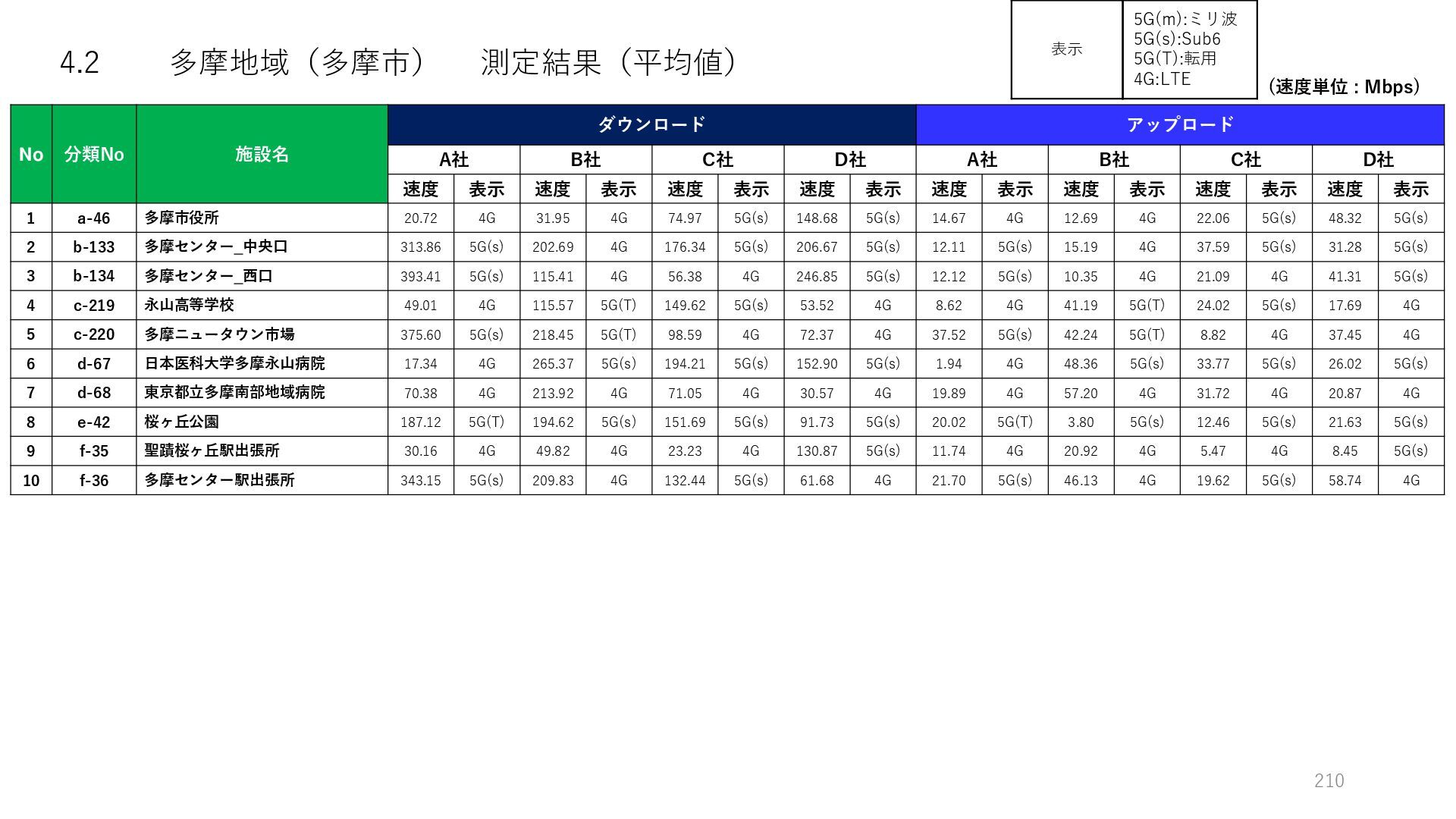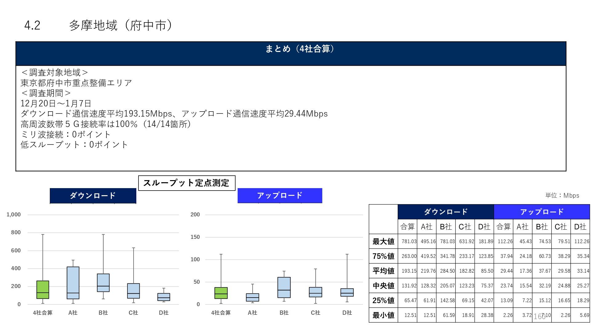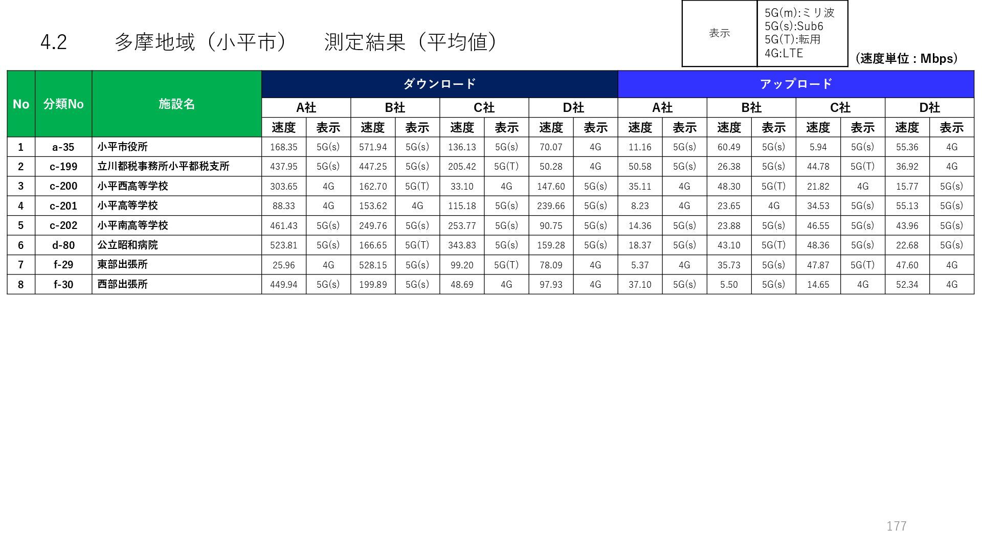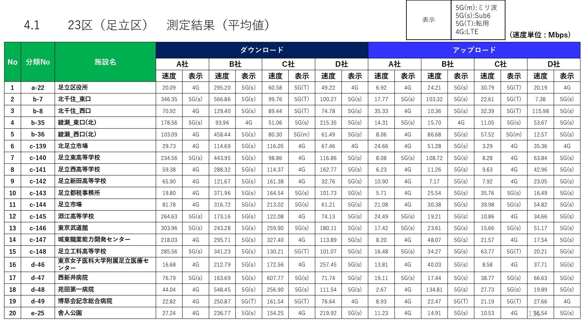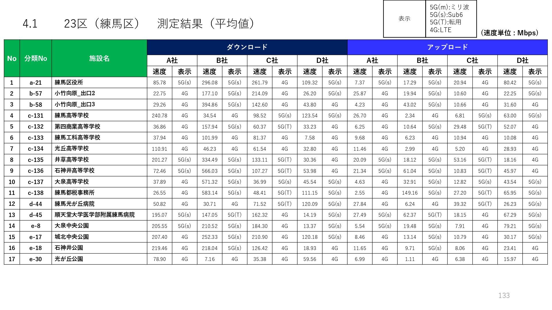 23区(葛飾区) 単位:Mbps ダウンロード アップロード 合算 A社 B社 C社 D社 合算 A社 B社 C社 D社 最大値 1334.31 465.40 1334.31 361.31 255.09 415.14 48.69 415.14 70.85 88.36 75%値 169.16 209.77 388.11 165.47 144.69 43.06 19.58 58.03 34.39 52.87 平均値 194.67 155.72 366.40 152.61 103.94 42.29 18.41 79.73 24.80 46.22 中央値 126.92 55.40 160.80 130.59 88.50 25.93 16.28 27.65 15.16 37.35 25%値 54.32 37.22 111.70 106.99 34.52 10.53 9.67 8.88 9.23 34.68 最小値 14.30 14.30 57.16 55.74 31.11 3.71 4.56 3.71 4.44 24.80 スループット定点測定 0 200 400 600 800 1,000 1,200 1,400 1,600 4社合算 A社 B社 C社 D社 0 100 200 300 400 500 4社合算 A社 B社 C社 D社 138