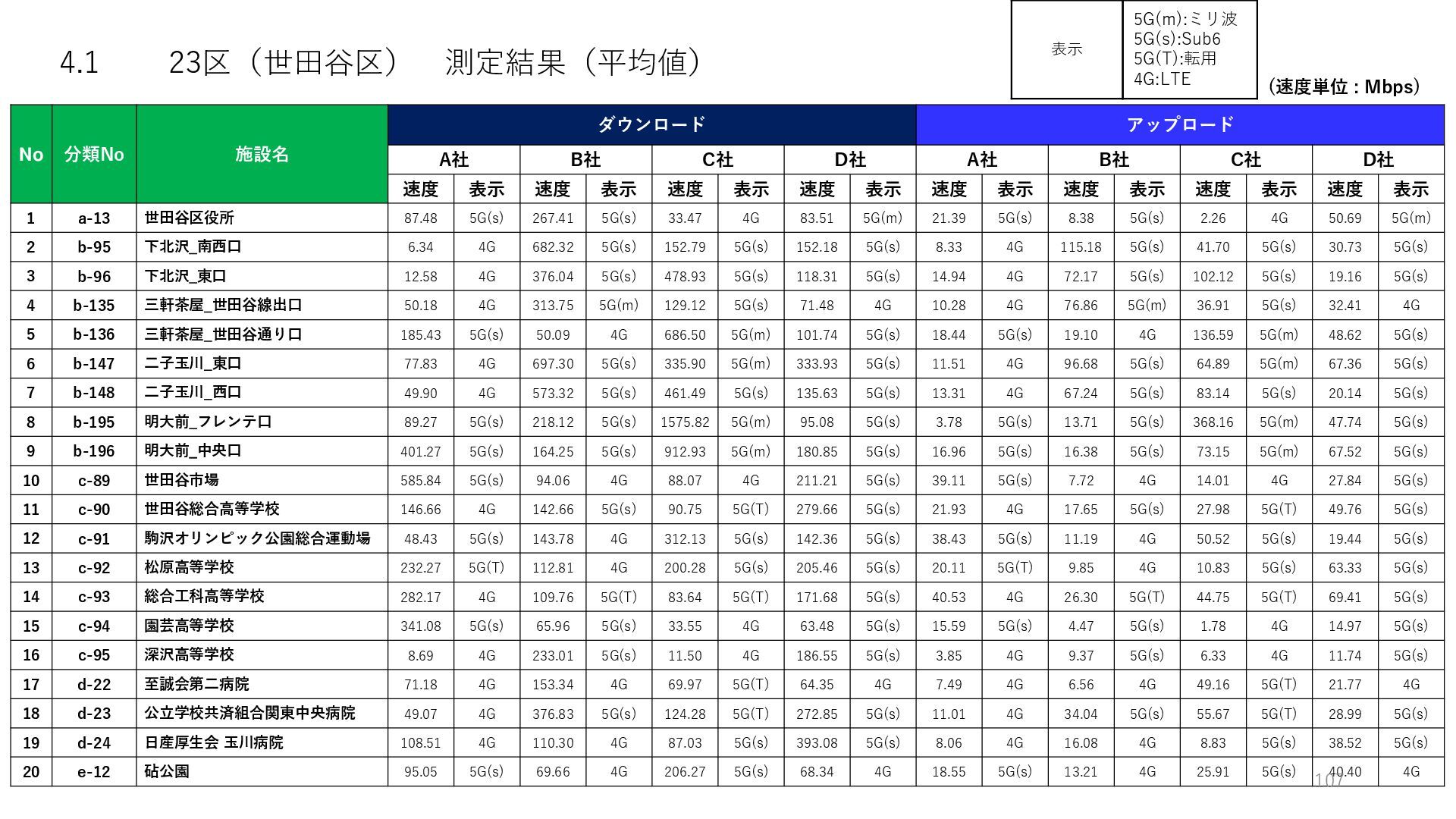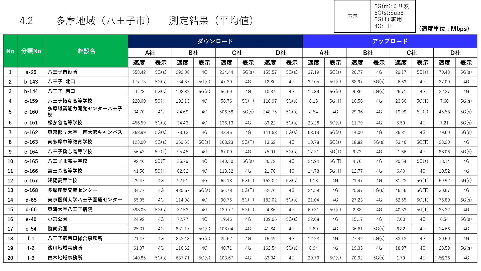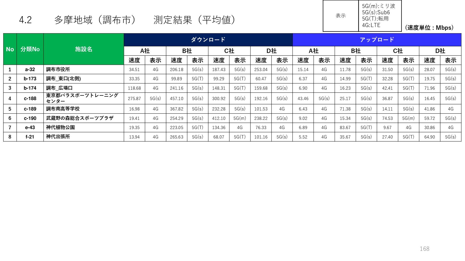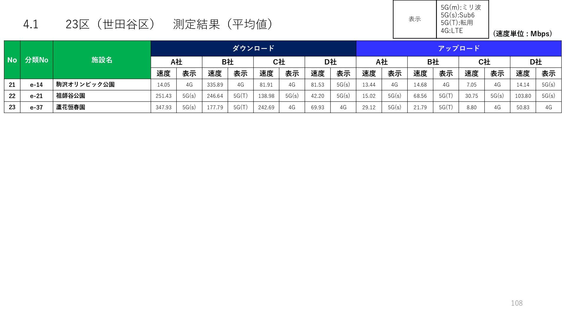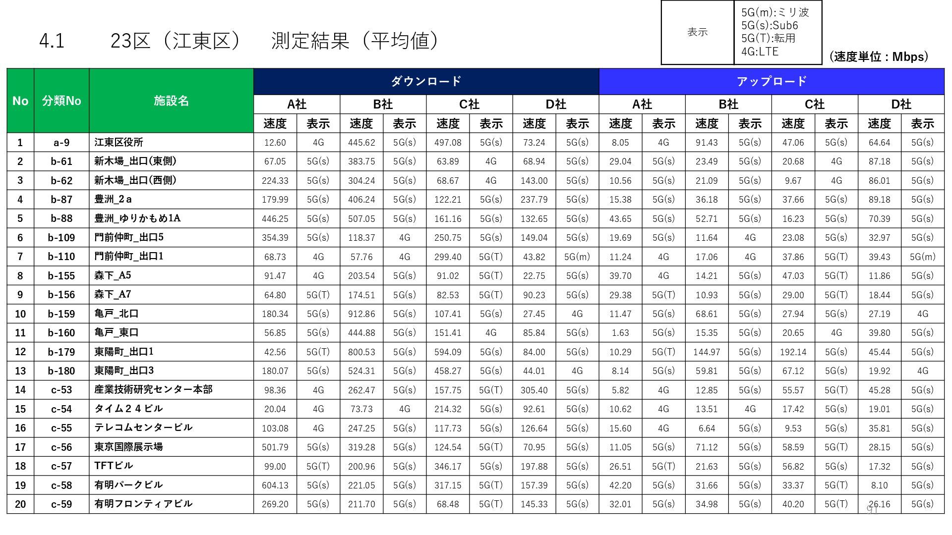 23区(葛飾区) 単位:Mbps ダウンロード アップロード 合算 A社 B社 C社 D社 合算 A社 B社 C社 D社 最大値 1334.31 465.40 1334.31 361.31 255.09 415.14 48.69 415.14 70.85 88.36 75%値 169.16 209.77 388.11 165.47 144.69 43.06 19.58 58.03 34.39 52.87 平均値 194.67 155.72 366.40 152.61 103.94 42.29 18.41 79.73 24.80 46.22 中央値 126.92 55.40 160.80 130.59 88.50 25.93 16.28 27.65 15.16 37.35 25%値 54.32 37.22 111.70 106.99 34.52 10.53 9.67 8.88 9.23 34.68 最小値 14.30 14.30 57.16 55.74 31.11 3.71 4.56 3.71 4.44 24.80 スループット定点測定 0 200 400 600 800 1,000 1,200 1,400 1,600 4社合算 A社 B社 C社 D社 0 100 200 300 400 500 4社合算 A社 B社 C社 D社 138