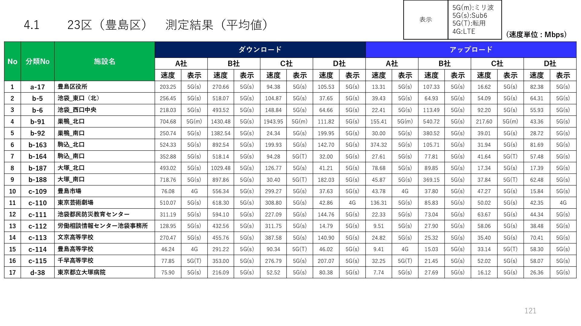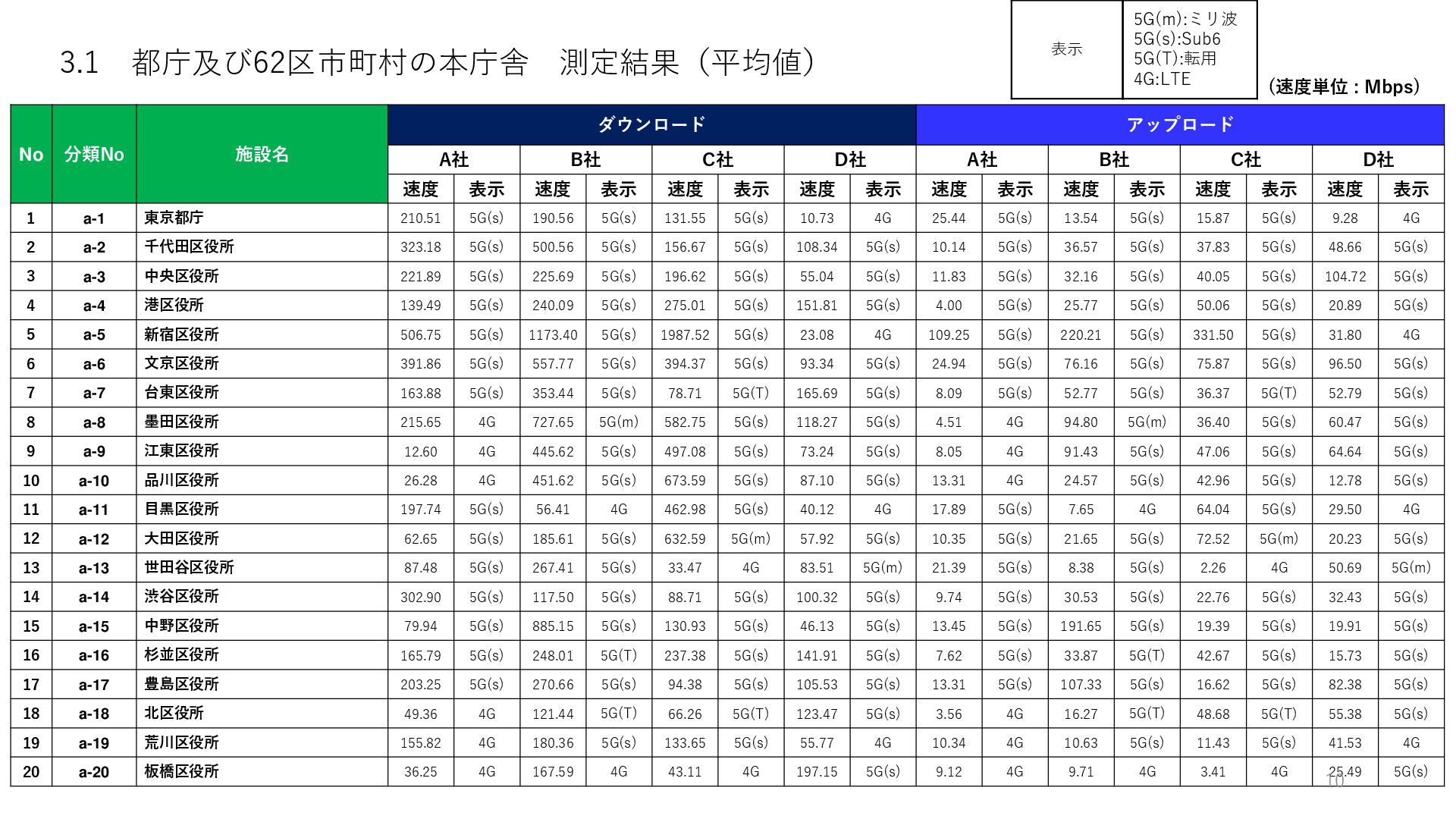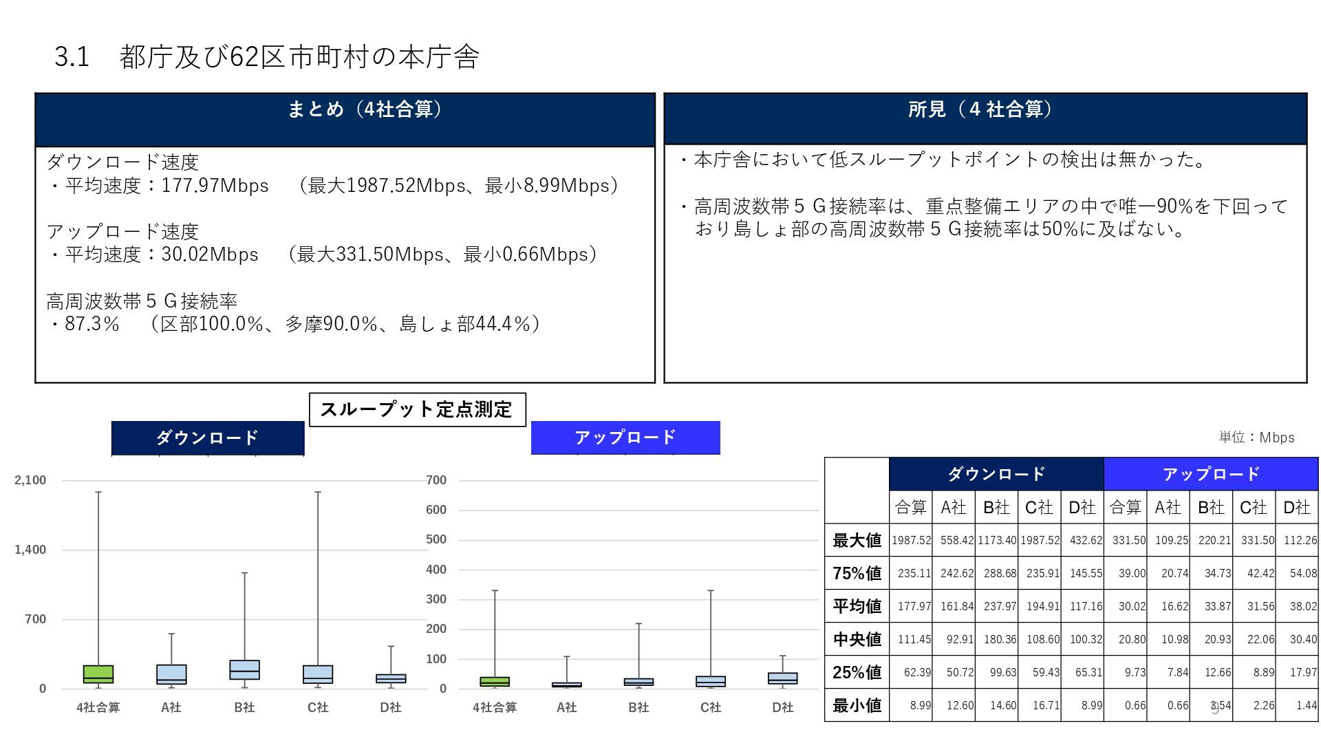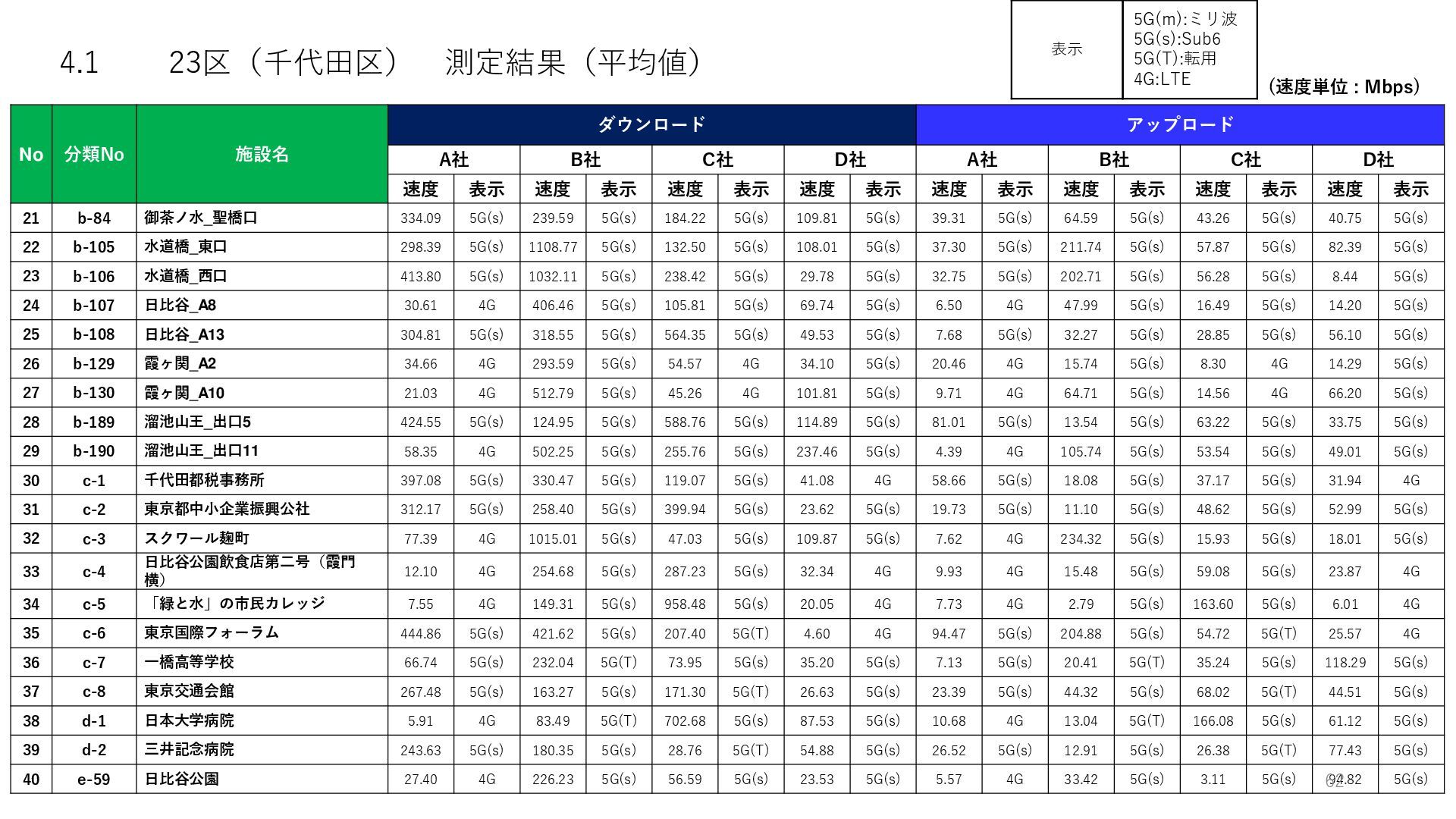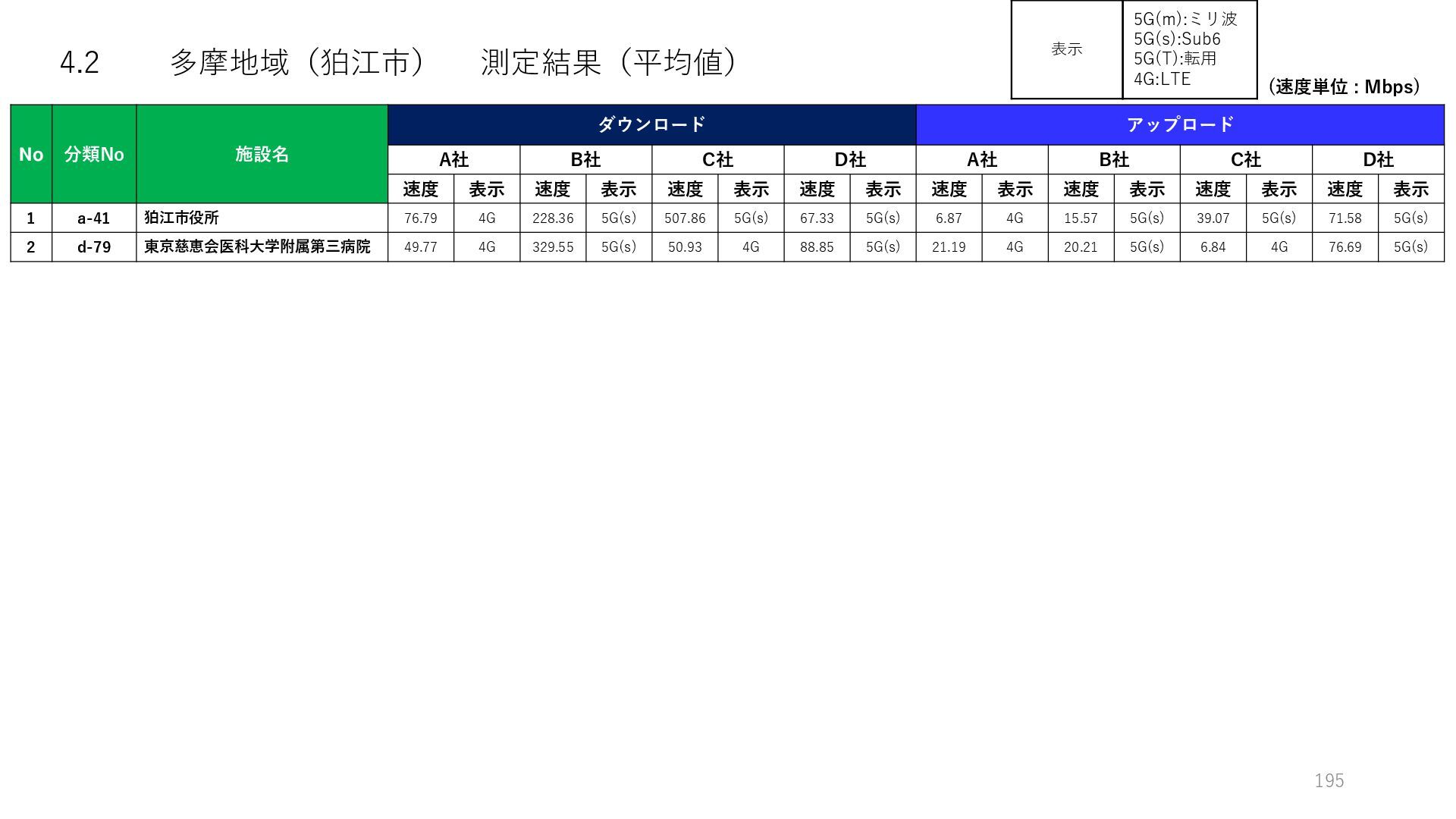 23区(葛飾区) 単位:Mbps ダウンロード アップロード 合算 A社 B社 C社 D社 合算 A社 B社 C社 D社 最大値 1334.31 465.40 1334.31 361.31 255.09 415.14 48.69 415.14 70.85 88.36 75%値 169.16 209.77 388.11 165.47 144.69 43.06 19.58 58.03 34.39 52.87 平均値 194.67 155.72 366.40 152.61 103.94 42.29 18.41 79.73 24.80 46.22 中央値 126.92 55.40 160.80 130.59 88.50 25.93 16.28 27.65 15.16 37.35 25%値 54.32 37.22 111.70 106.99 34.52 10.53 9.67 8.88 9.23 34.68 最小値 14.30 14.30 57.16 55.74 31.11 3.71 4.56 3.71 4.44 24.80 スループット定点測定 0 200 400 600 800 1,000 1,200 1,400 1,600 4社合算 A社 B社 C社 D社 0 100 200 300 400 500 4社合算 A社 B社 C社 D社 138