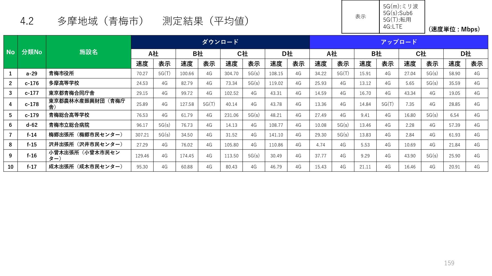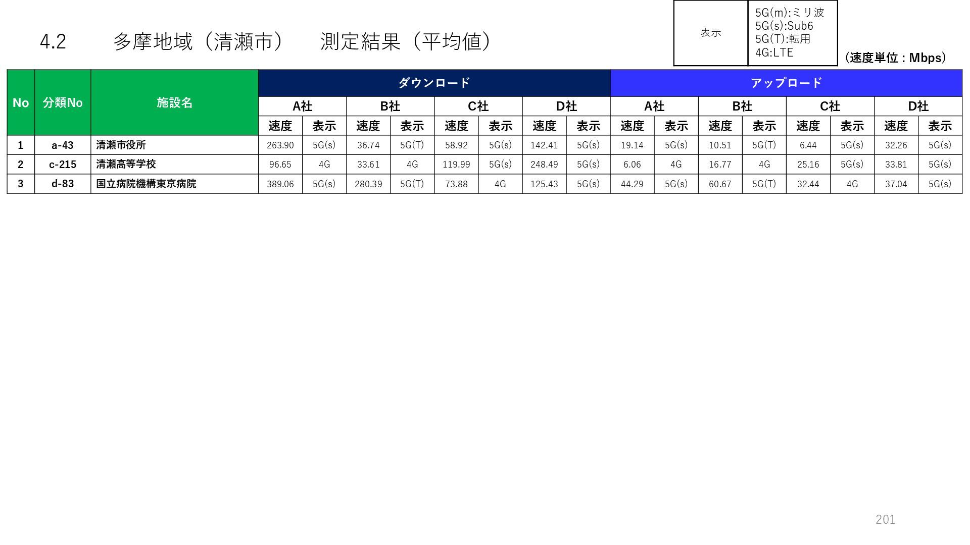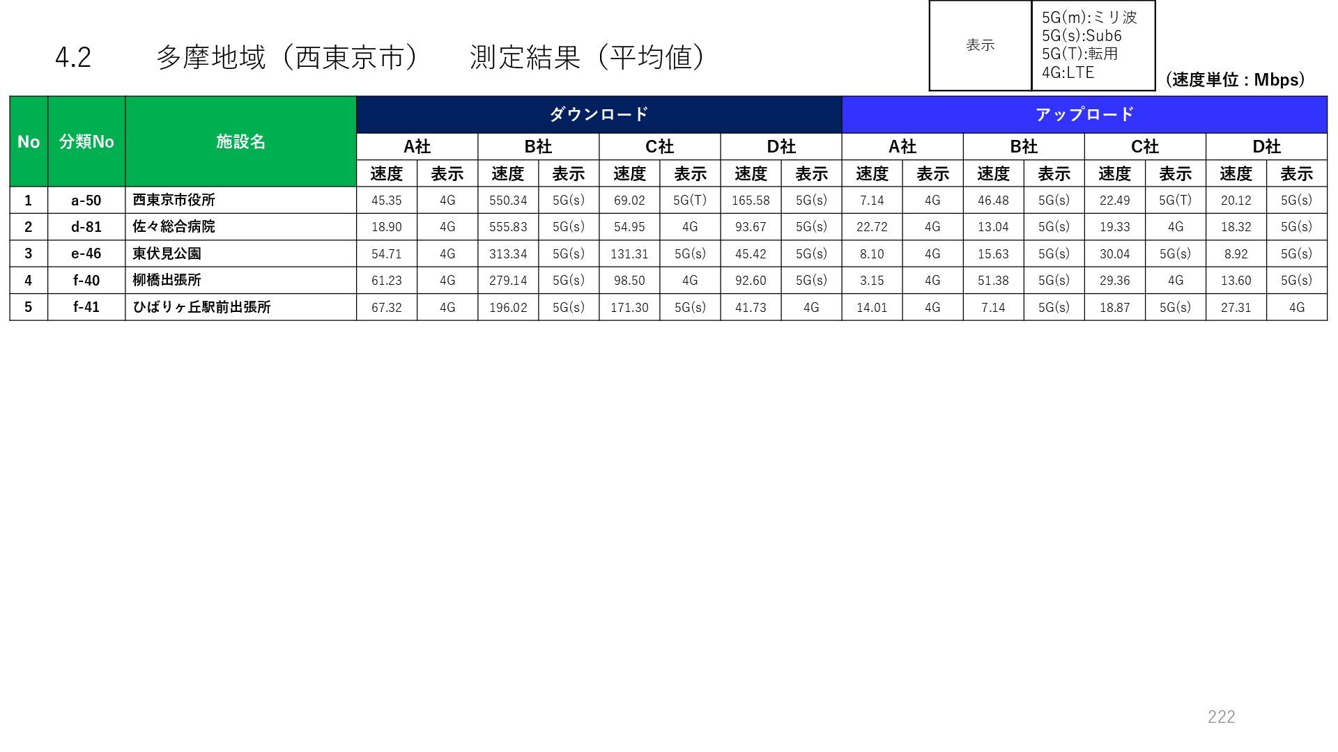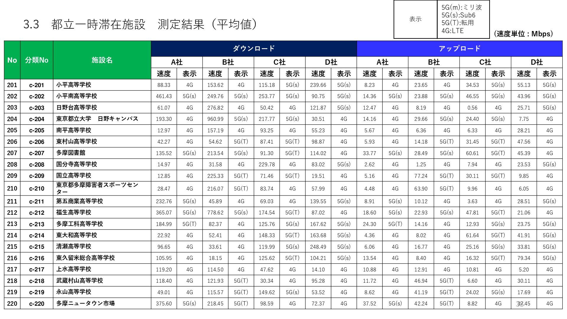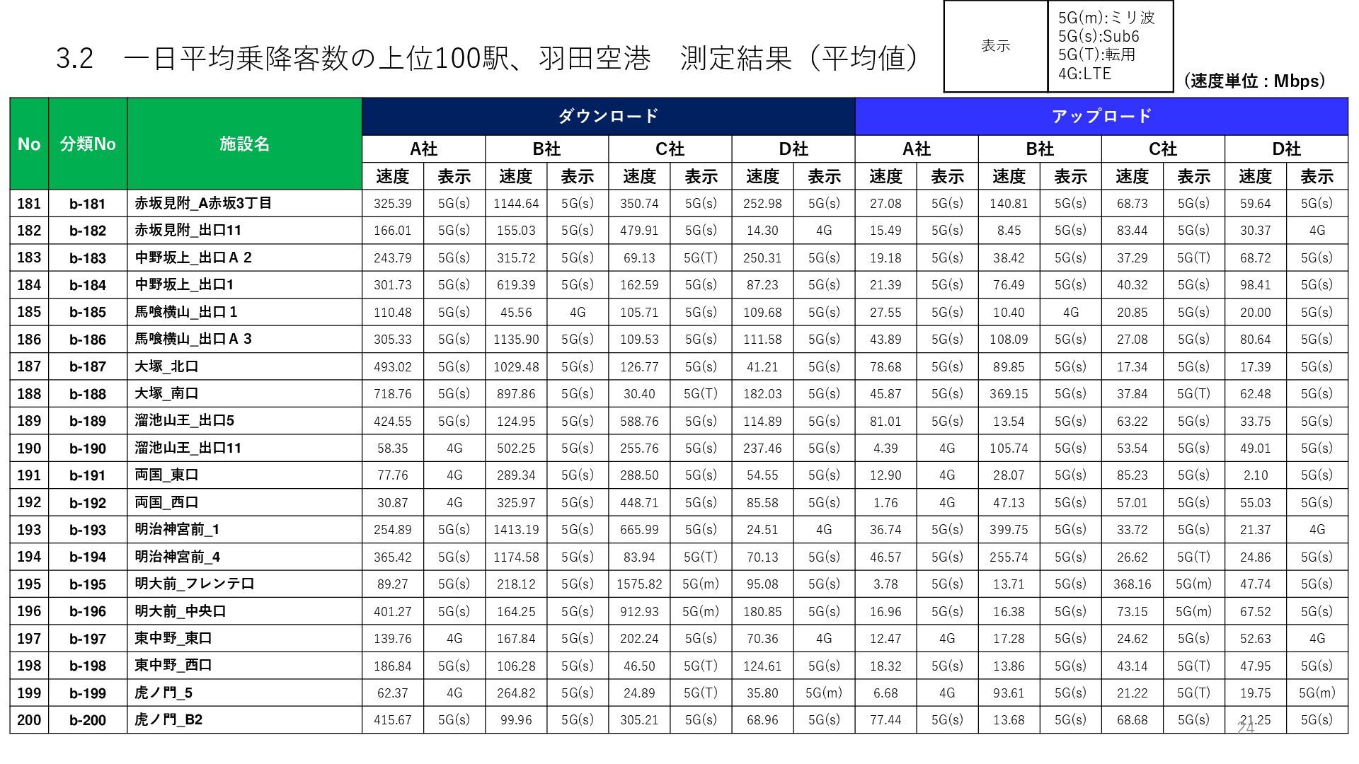 23区(葛飾区) 単位:Mbps ダウンロード アップロード 合算 A社 B社 C社 D社 合算 A社 B社 C社 D社 最大値 1334.31 465.40 1334.31 361.31 255.09 415.14 48.69 415.14 70.85 88.36 75%値 169.16 209.77 388.11 165.47 144.69 43.06 19.58 58.03 34.39 52.87 平均値 194.67 155.72 366.40 152.61 103.94 42.29 18.41 79.73 24.80 46.22 中央値 126.92 55.40 160.80 130.59 88.50 25.93 16.28 27.65 15.16 37.35 25%値 54.32 37.22 111.70 106.99 34.52 10.53 9.67 8.88 9.23 34.68 最小値 14.30 14.30 57.16 55.74 31.11 3.71 4.56 3.71 4.44 24.80 スループット定点測定 0 200 400 600 800 1,000 1,200 1,400 1,600 4社合算 A社 B社 C社 D社 0 100 200 300 400 500 4社合算 A社 B社 C社 D社 138