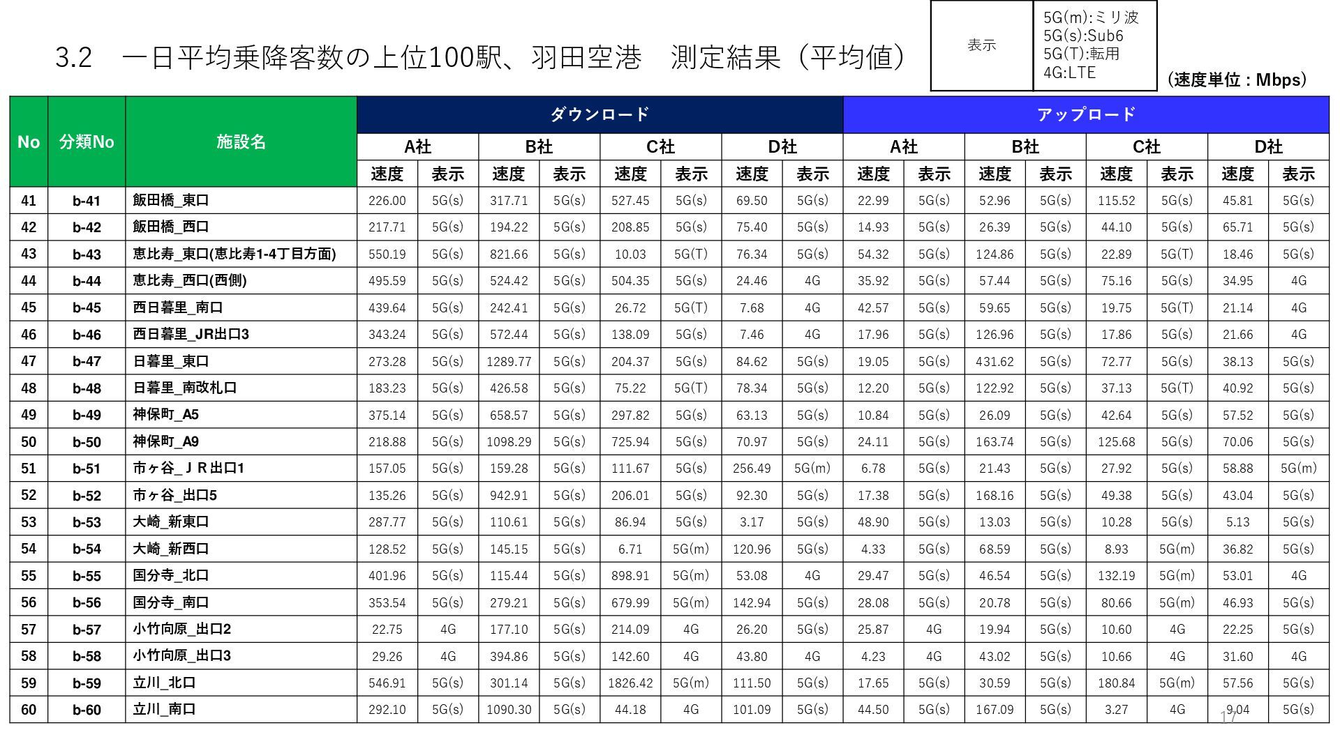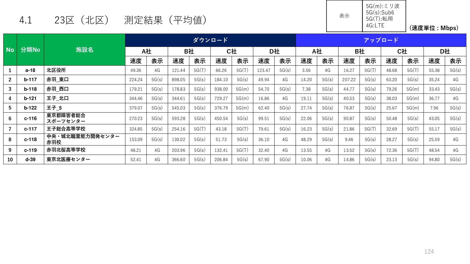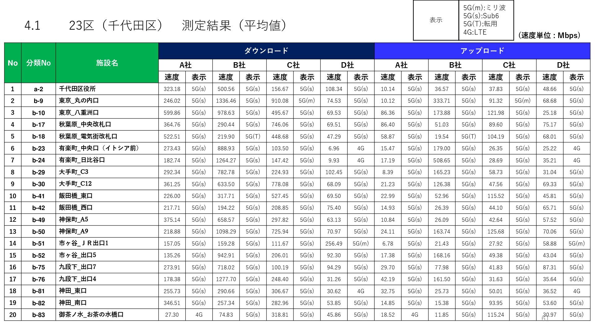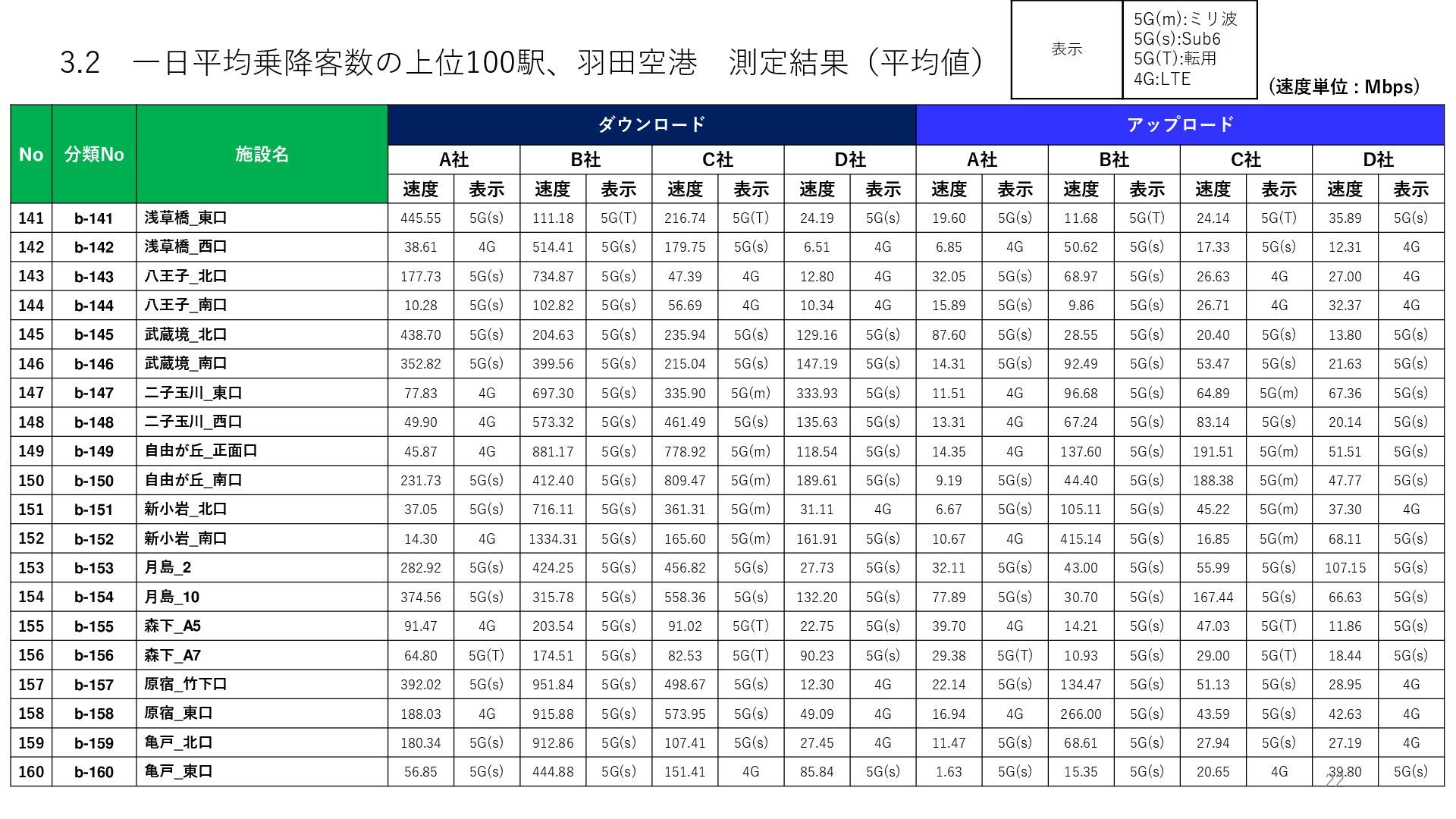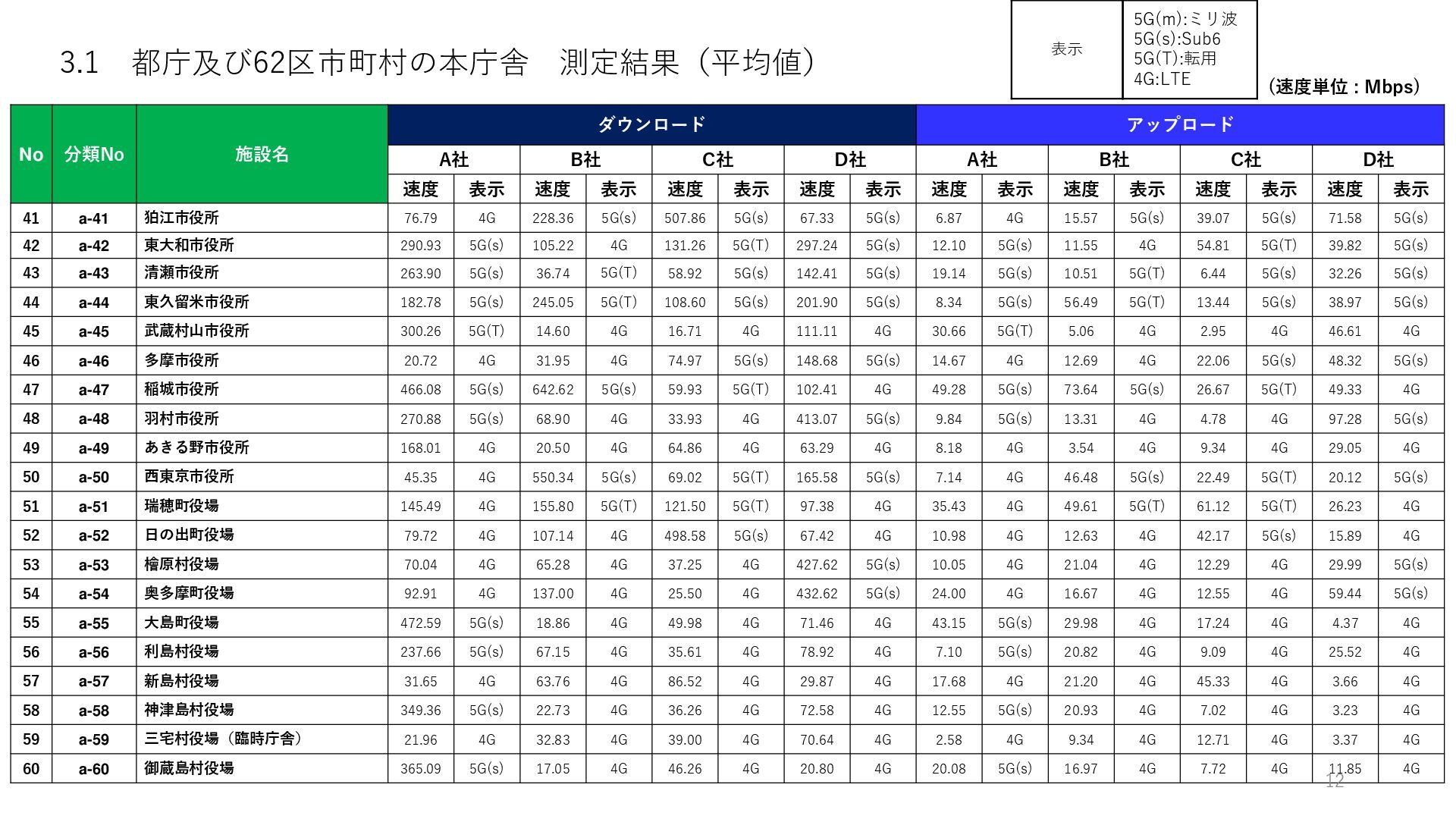 23区(葛飾区) 単位:Mbps ダウンロード アップロード 合算 A社 B社 C社 D社 合算 A社 B社 C社 D社 最大値 1334.31 465.40 1334.31 361.31 255.09 415.14 48.69 415.14 70.85 88.36 75%値 169.16 209.77 388.11 165.47 144.69 43.06 19.58 58.03 34.39 52.87 平均値 194.67 155.72 366.40 152.61 103.94 42.29 18.41 79.73 24.80 46.22 中央値 126.92 55.40 160.80 130.59 88.50 25.93 16.28 27.65 15.16 37.35 25%値 54.32 37.22 111.70 106.99 34.52 10.53 9.67 8.88 9.23 34.68 最小値 14.30 14.30 57.16 55.74 31.11 3.71 4.56 3.71 4.44 24.80 スループット定点測定 0 200 400 600 800 1,000 1,200 1,400 1,600 4社合算 A社 B社 C社 D社 0 100 200 300 400 500 4社合算 A社 B社 C社 D社 138