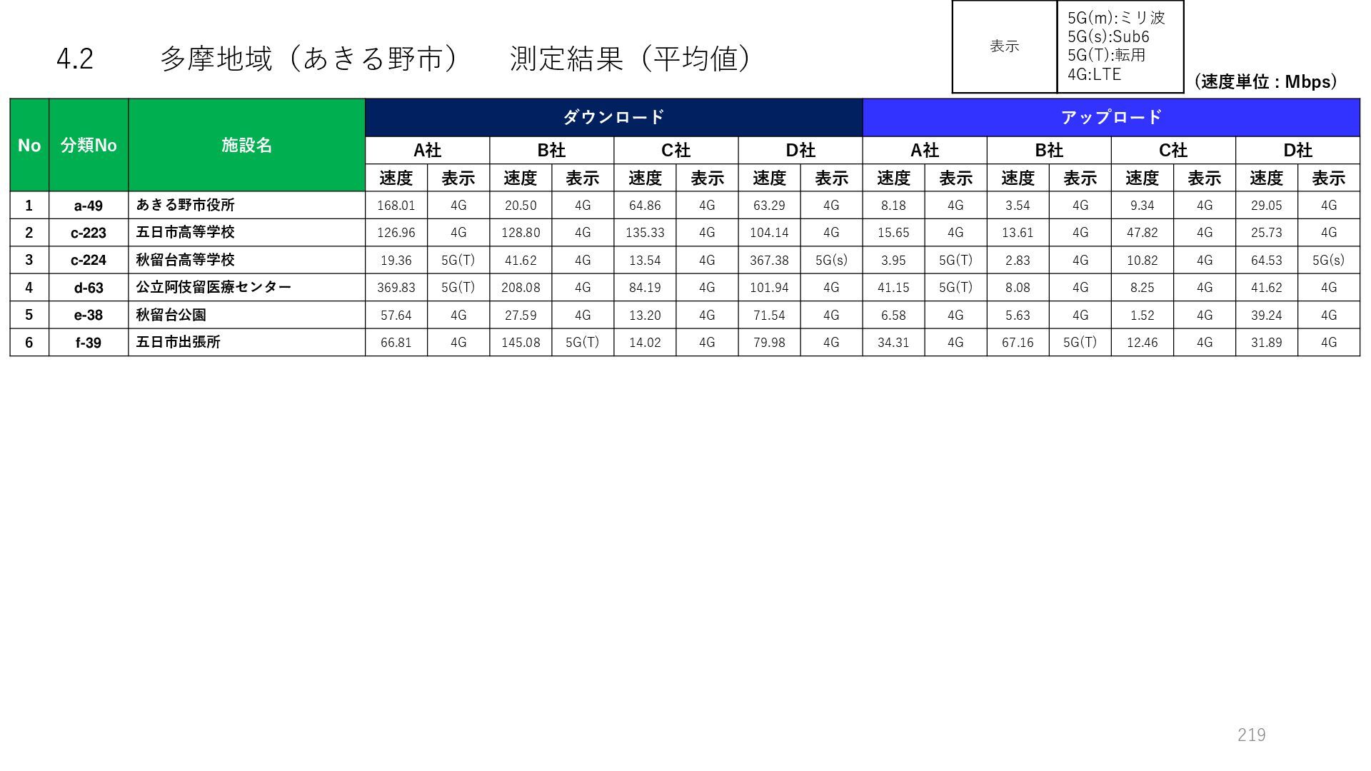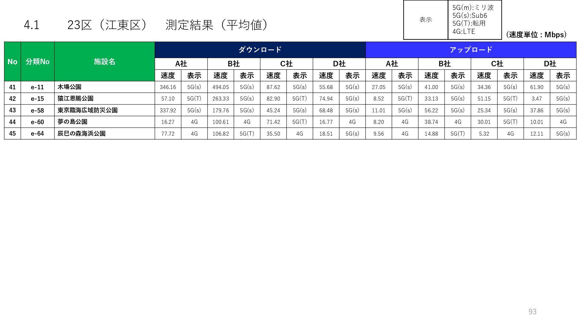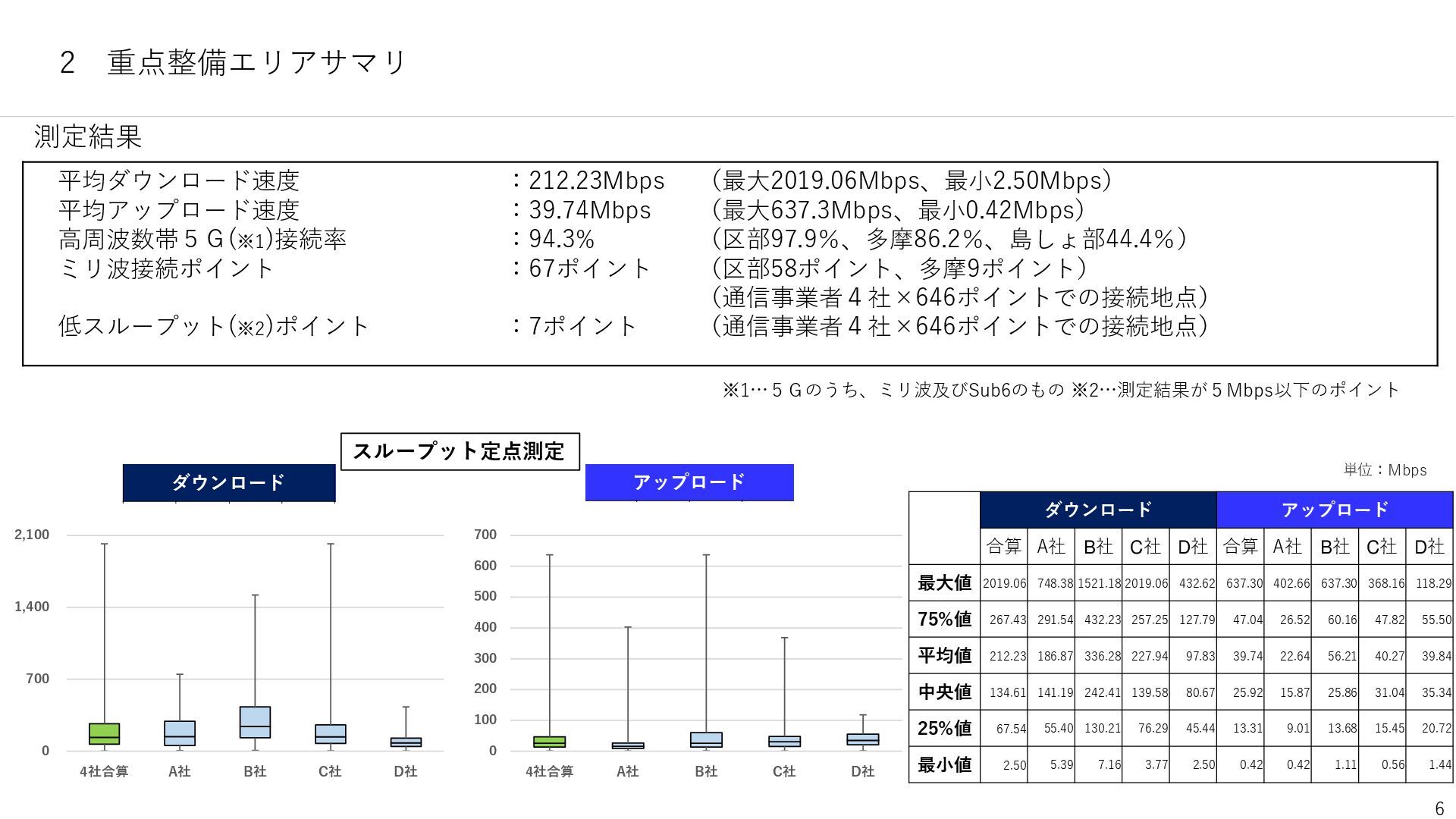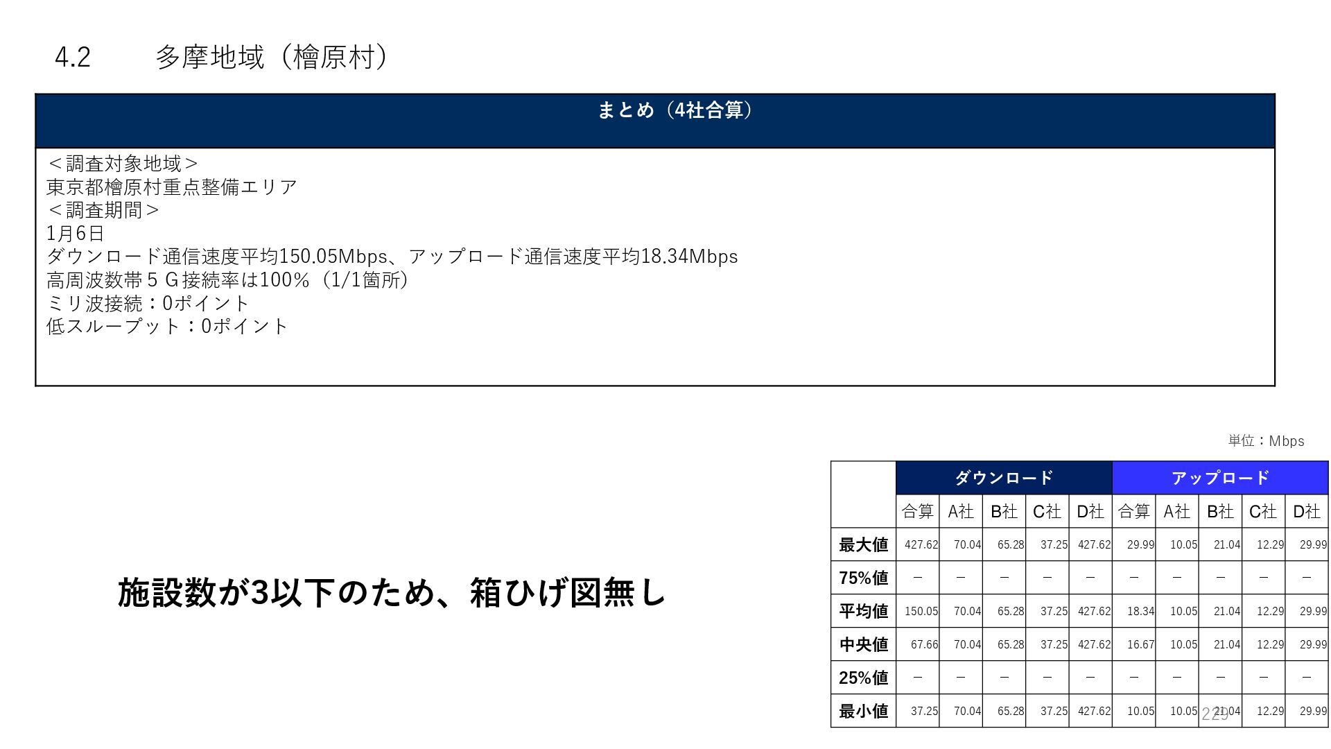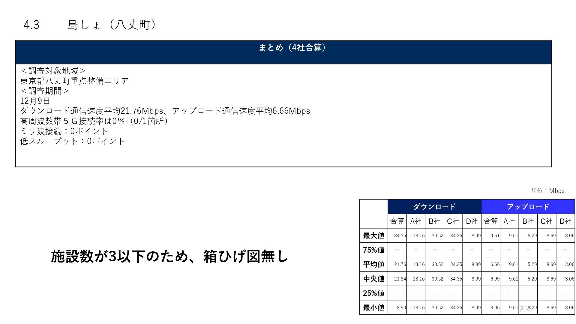 23区(葛飾区) 単位:Mbps ダウンロード アップロード 合算 A社 B社 C社 D社 合算 A社 B社 C社 D社 最大値 1334.31 465.40 1334.31 361.31 255.09 415.14 48.69 415.14 70.85 88.36 75%値 169.16 209.77 388.11 165.47 144.69 43.06 19.58 58.03 34.39 52.87 平均値 194.67 155.72 366.40 152.61 103.94 42.29 18.41 79.73 24.80 46.22 中央値 126.92 55.40 160.80 130.59 88.50 25.93 16.28 27.65 15.16 37.35 25%値 54.32 37.22 111.70 106.99 34.52 10.53 9.67 8.88 9.23 34.68 最小値 14.30 14.30 57.16 55.74 31.11 3.71 4.56 3.71 4.44 24.80 スループット定点測定 0 200 400 600 800 1,000 1,200 1,400 1,600 4社合算 A社 B社 C社 D社 0 100 200 300 400 500 4社合算 A社 B社 C社 D社 138