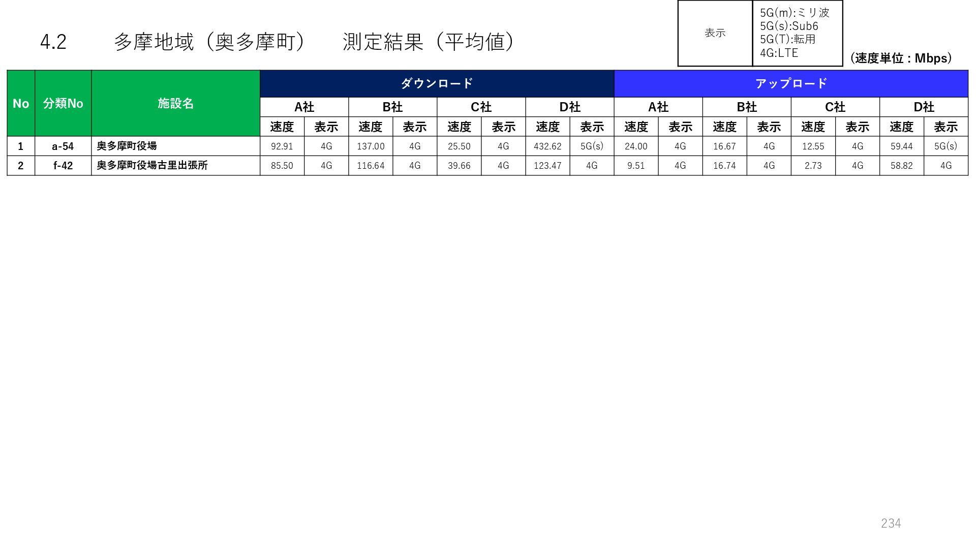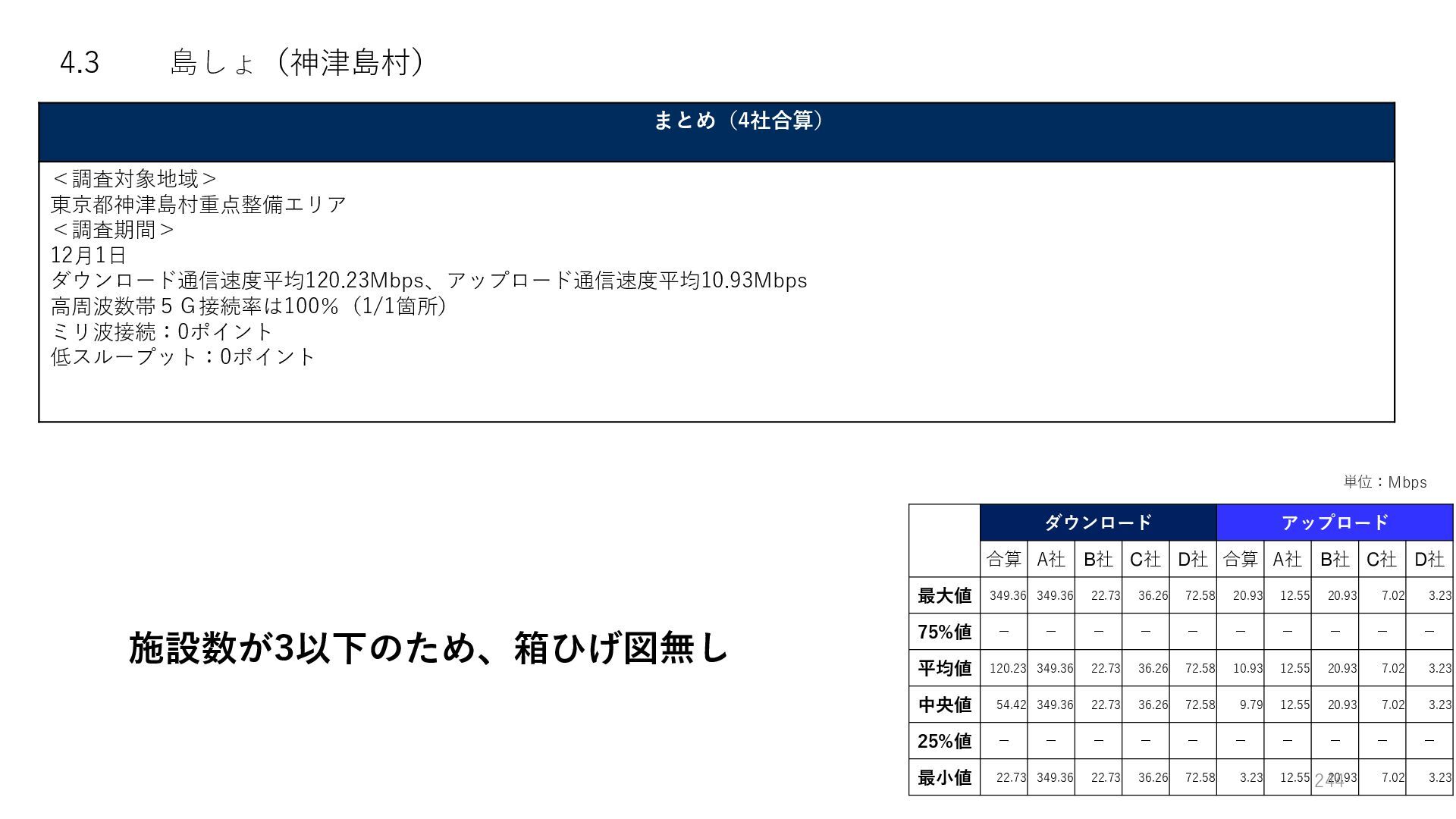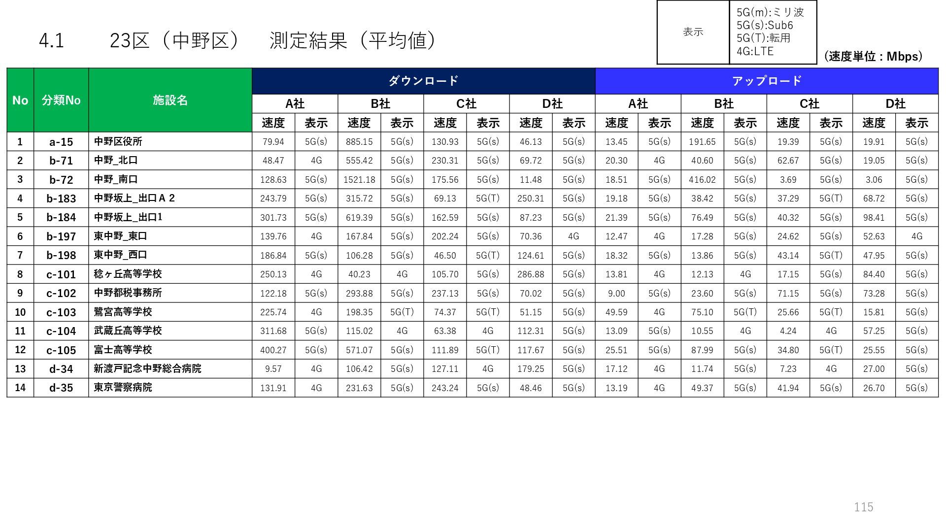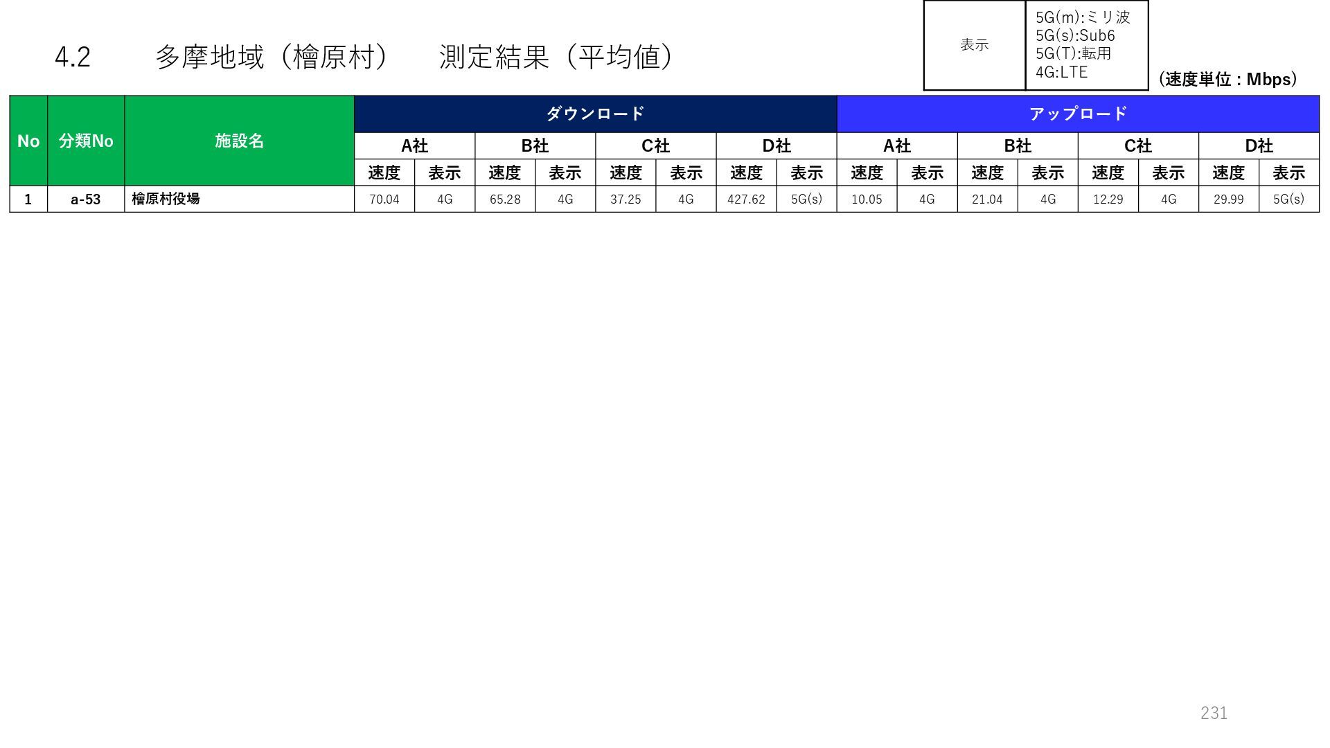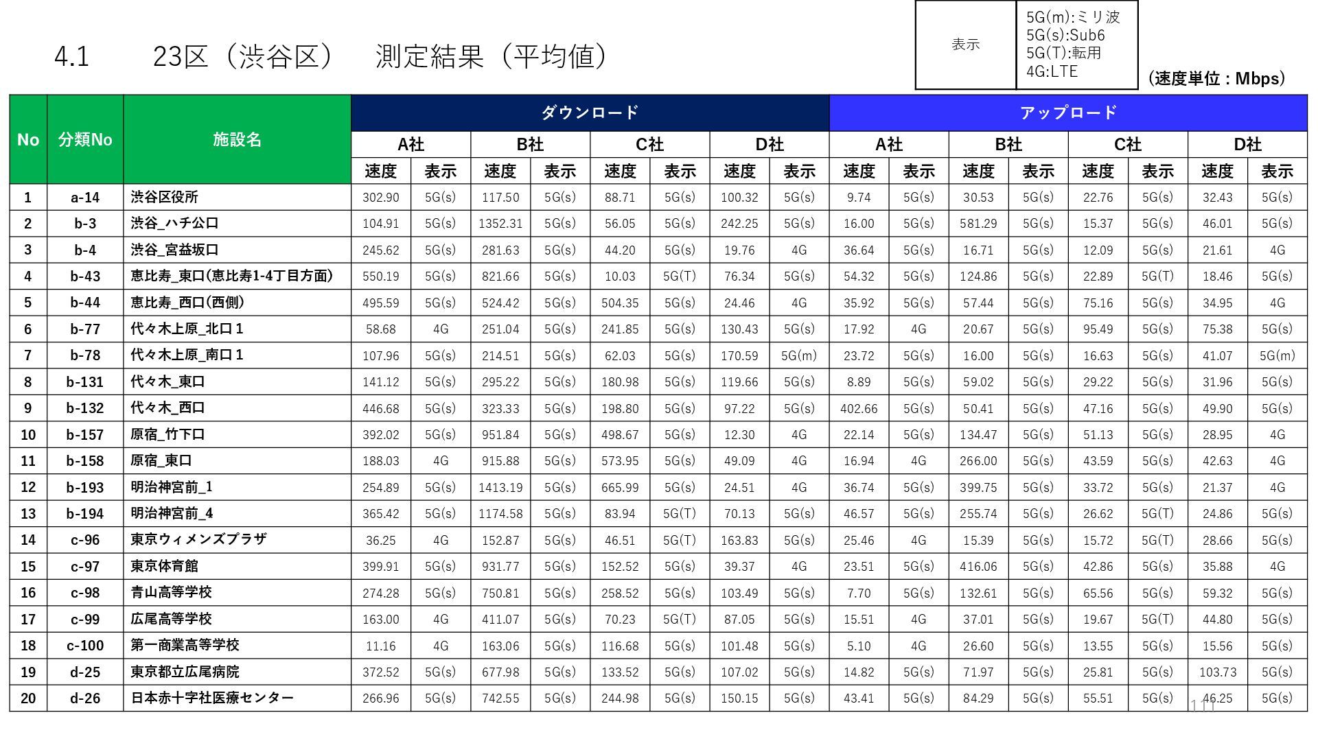 23区(葛飾区) 単位:Mbps ダウンロード アップロード 合算 A社 B社 C社 D社 合算 A社 B社 C社 D社 最大値 1334.31 465.40 1334.31 361.31 255.09 415.14 48.69 415.14 70.85 88.36 75%値 169.16 209.77 388.11 165.47 144.69 43.06 19.58 58.03 34.39 52.87 平均値 194.67 155.72 366.40 152.61 103.94 42.29 18.41 79.73 24.80 46.22 中央値 126.92 55.40 160.80 130.59 88.50 25.93 16.28 27.65 15.16 37.35 25%値 54.32 37.22 111.70 106.99 34.52 10.53 9.67 8.88 9.23 34.68 最小値 14.30 14.30 57.16 55.74 31.11 3.71 4.56 3.71 4.44 24.80 スループット定点測定 0 200 400 600 800 1,000 1,200 1,400 1,600 4社合算 A社 B社 C社 D社 0 100 200 300 400 500 4社合算 A社 B社 C社 D社 138