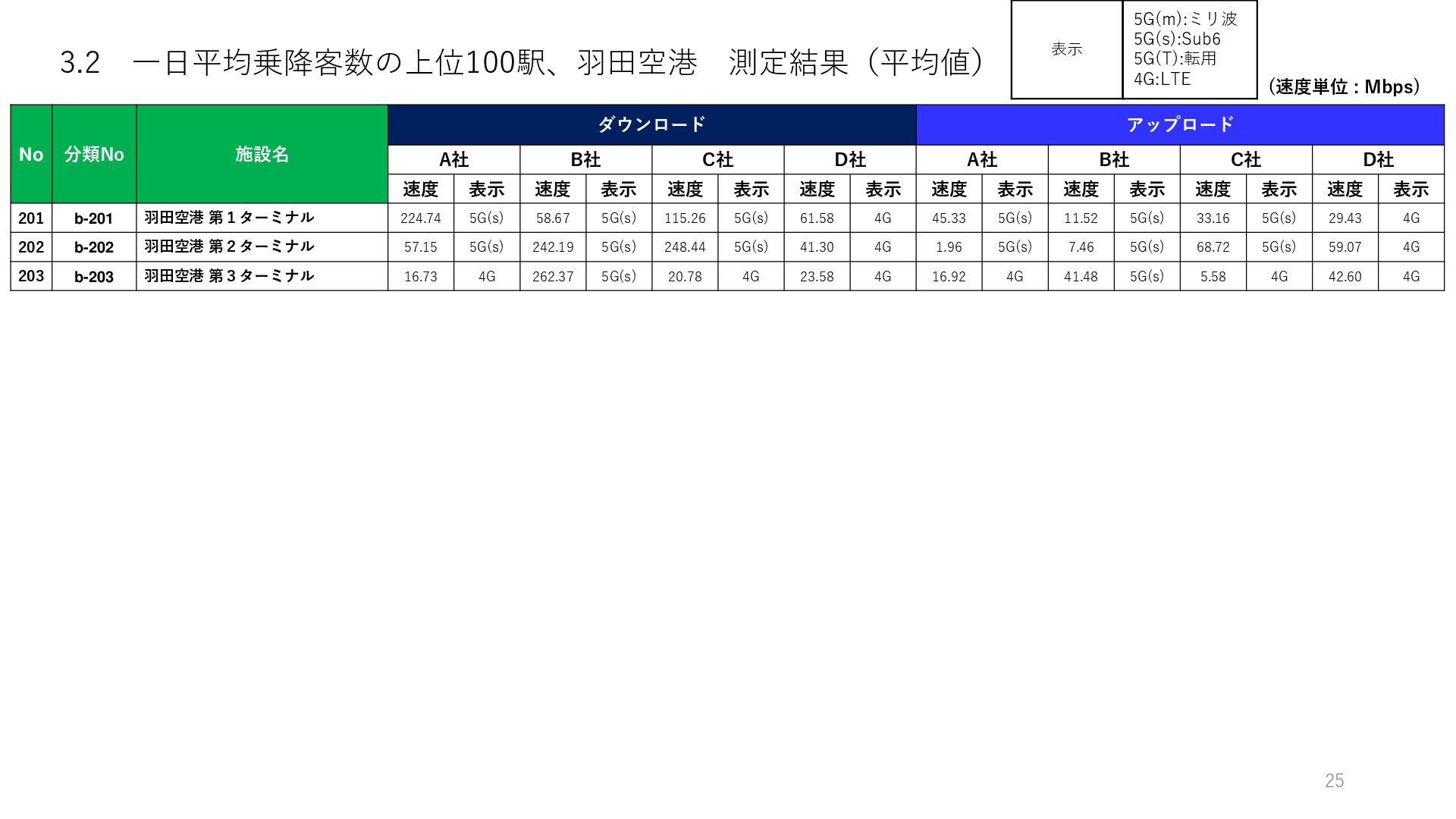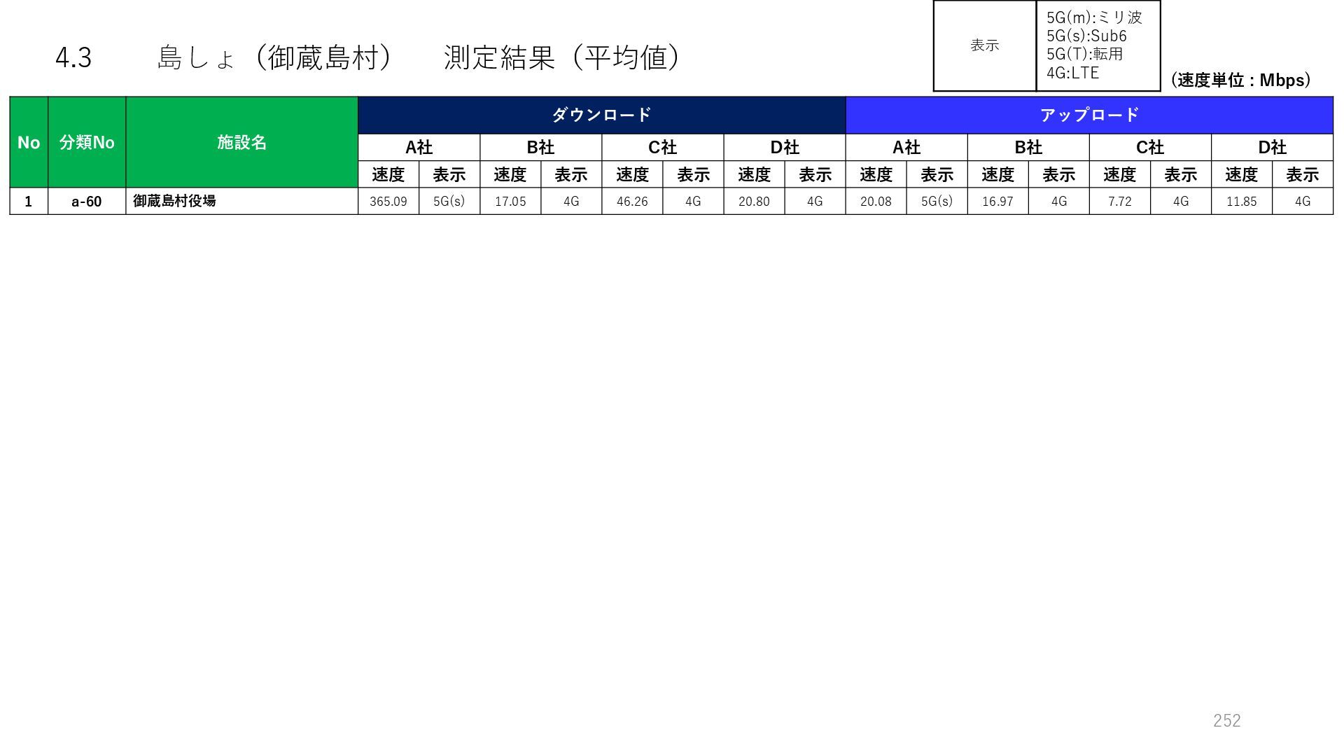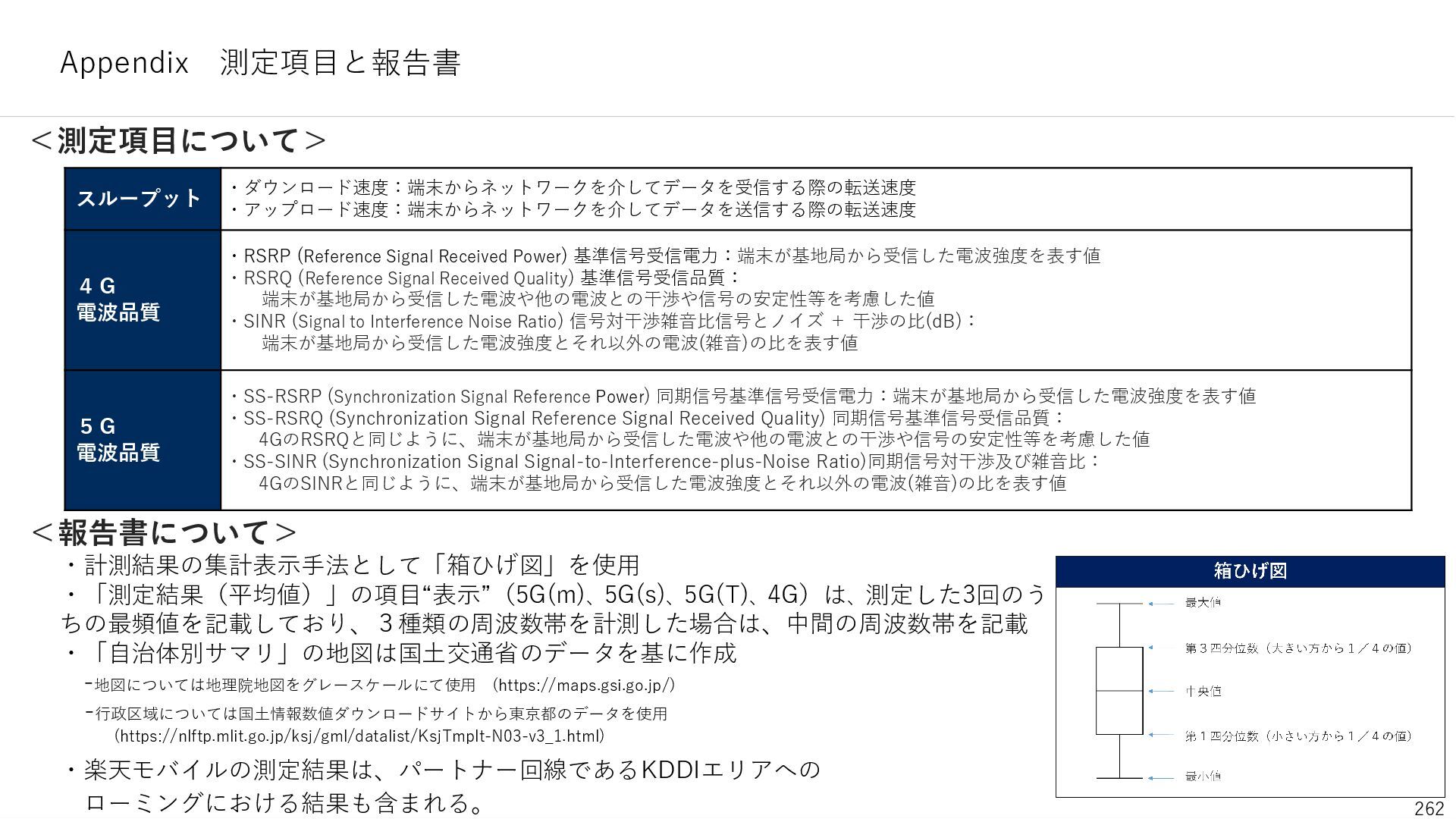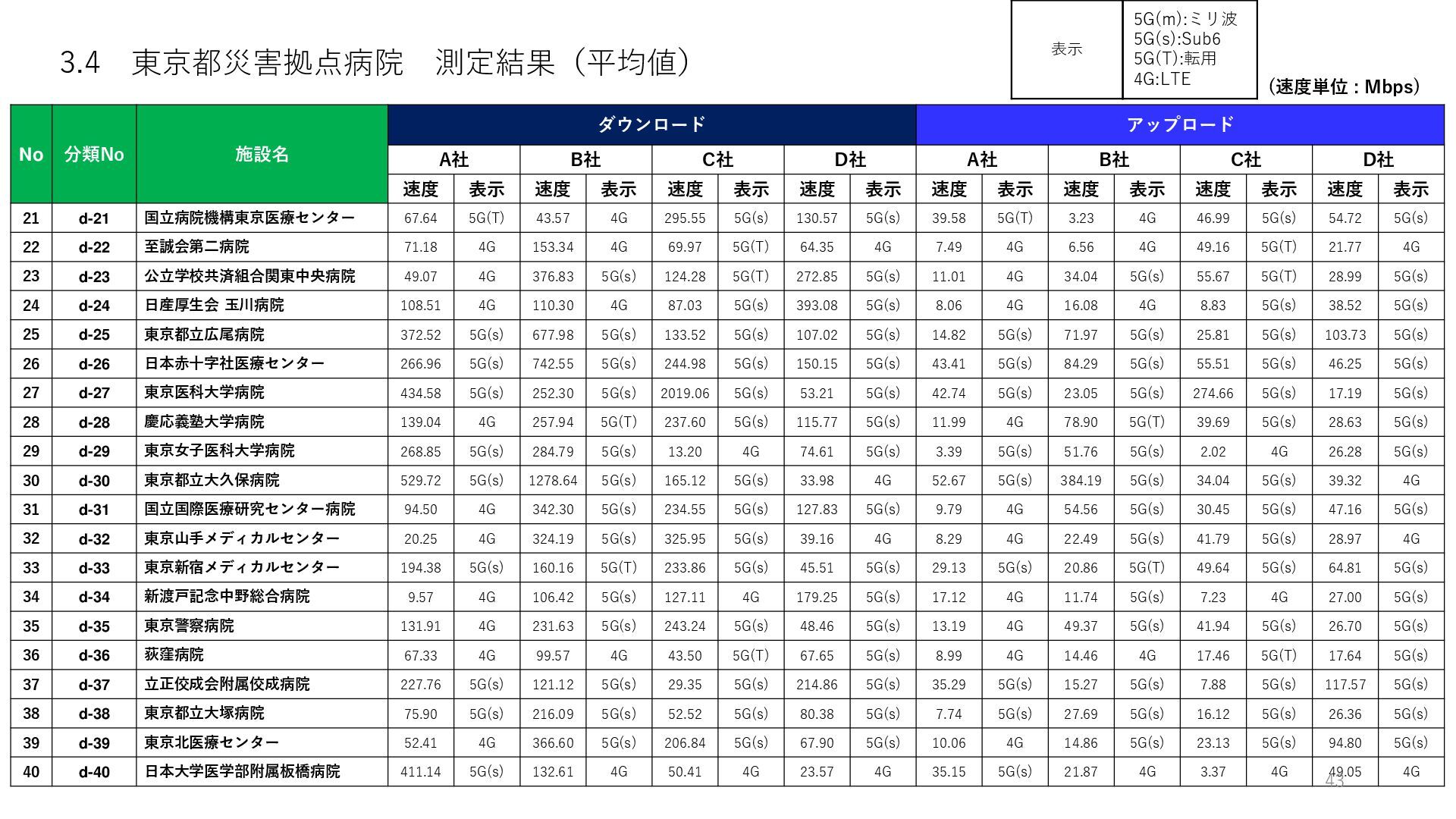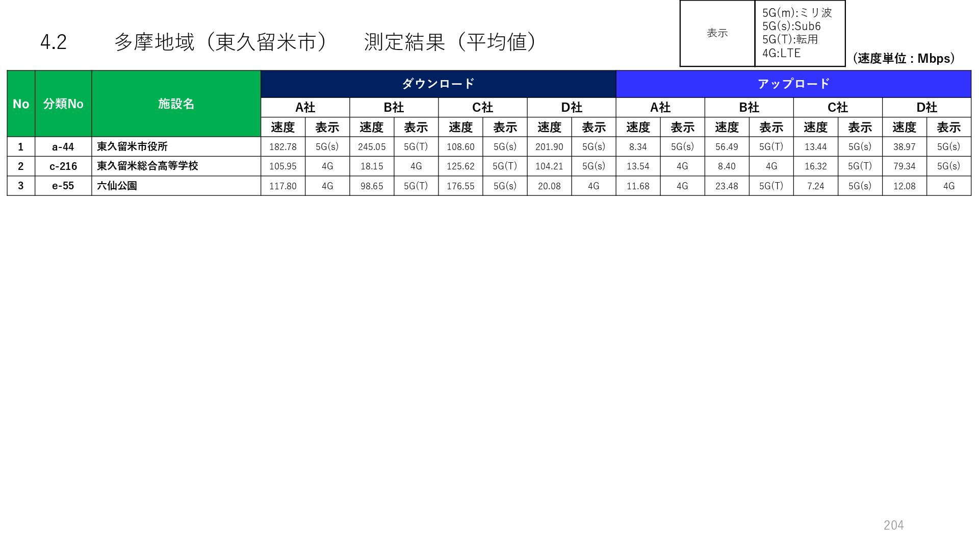 23区(葛飾区) 単位:Mbps ダウンロード アップロード 合算 A社 B社 C社 D社 合算 A社 B社 C社 D社 最大値 1334.31 465.40 1334.31 361.31 255.09 415.14 48.69 415.14 70.85 88.36 75%値 169.16 209.77 388.11 165.47 144.69 43.06 19.58 58.03 34.39 52.87 平均値 194.67 155.72 366.40 152.61 103.94 42.29 18.41 79.73 24.80 46.22 中央値 126.92 55.40 160.80 130.59 88.50 25.93 16.28 27.65 15.16 37.35 25%値 54.32 37.22 111.70 106.99 34.52 10.53 9.67 8.88 9.23 34.68 最小値 14.30 14.30 57.16 55.74 31.11 3.71 4.56 3.71 4.44 24.80 スループット定点測定 0 200 400 600 800 1,000 1,200 1,400 1,600 4社合算 A社 B社 C社 D社 0 100 200 300 400 500 4社合算 A社 B社 C社 D社 138