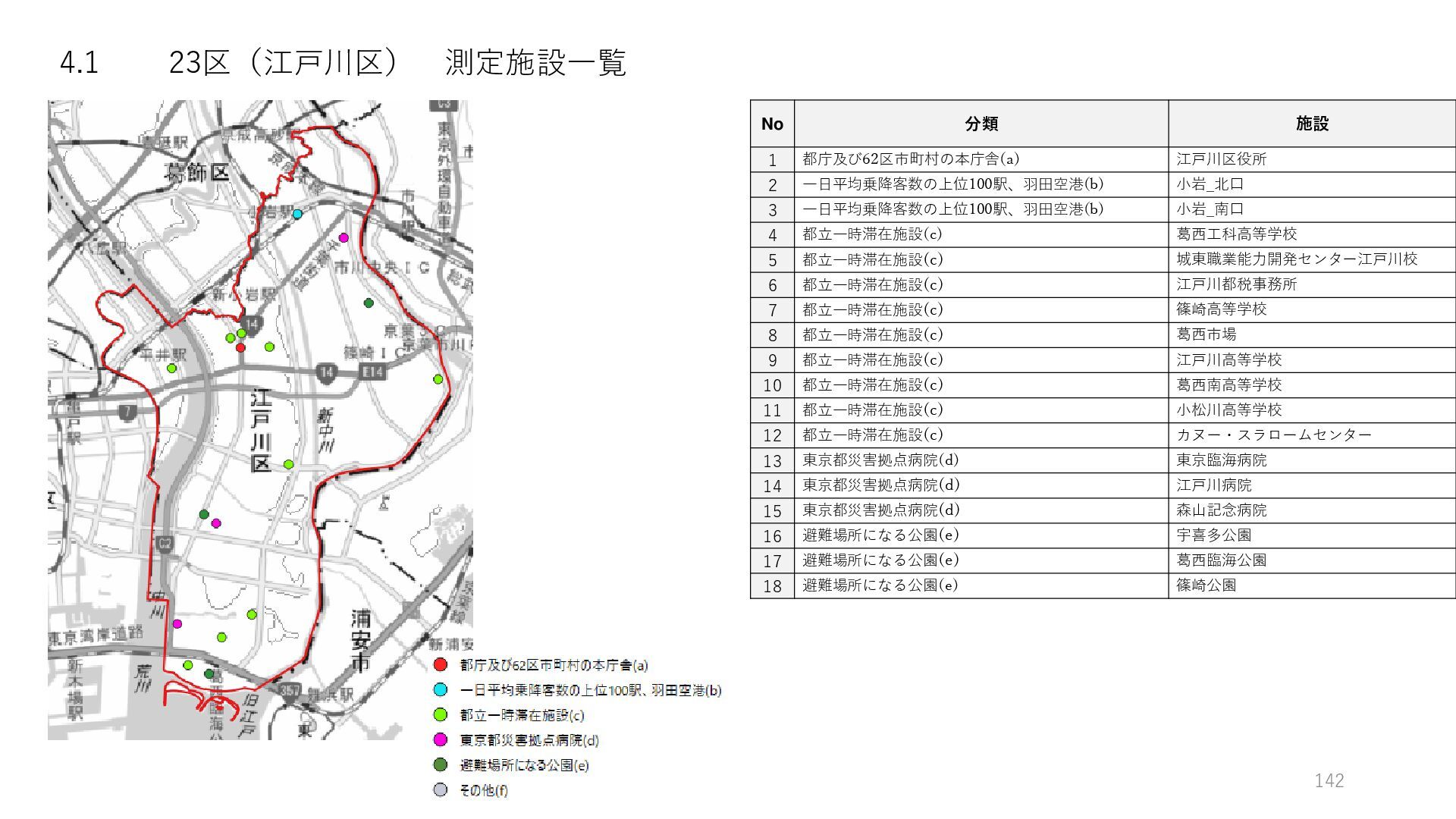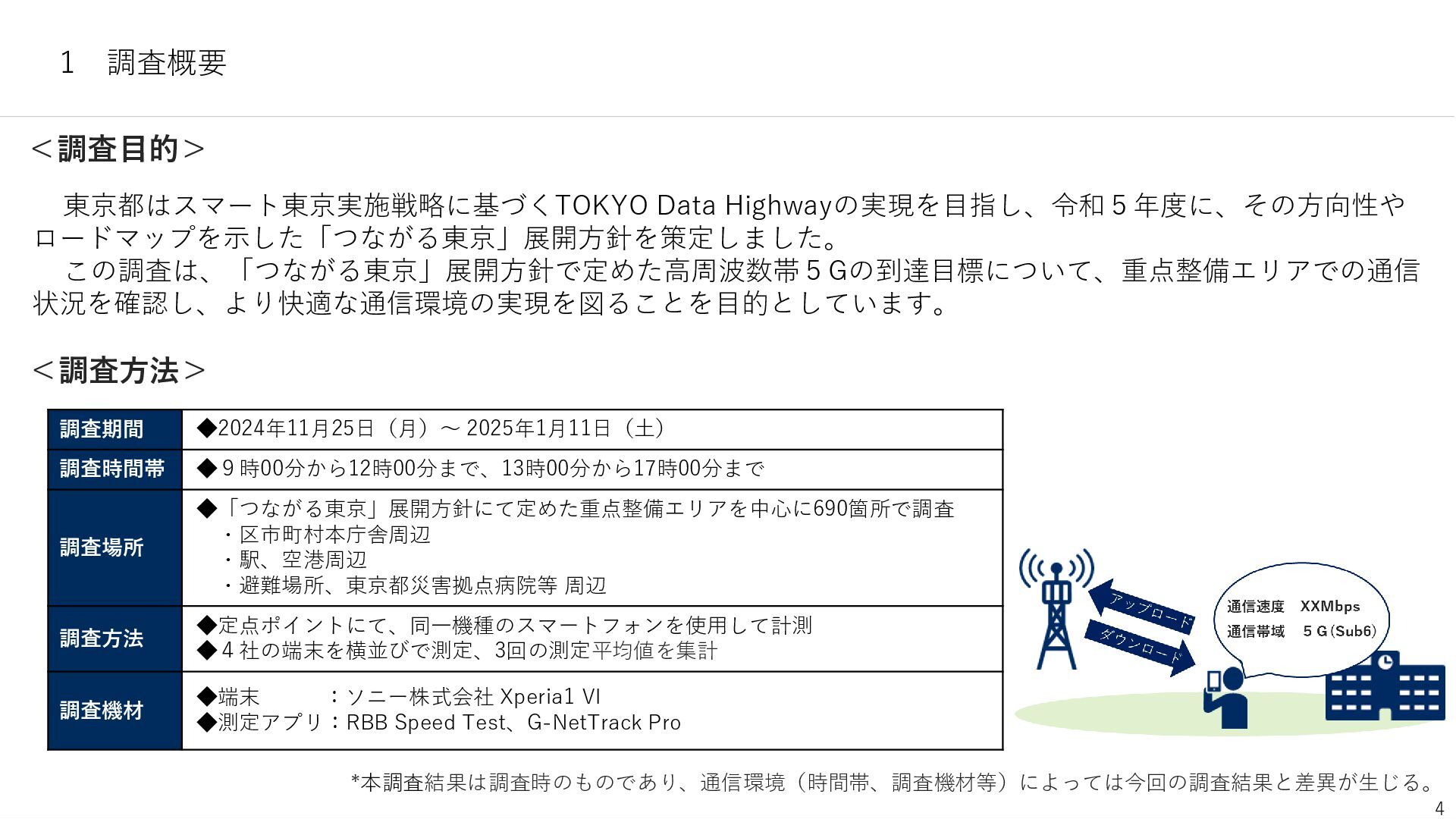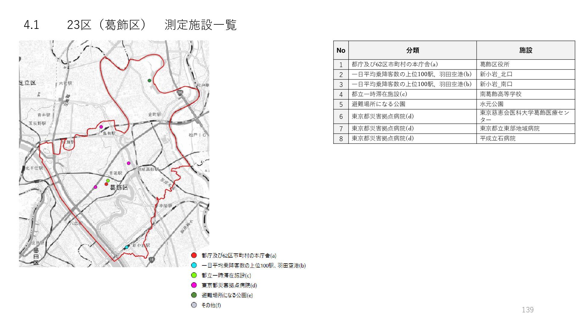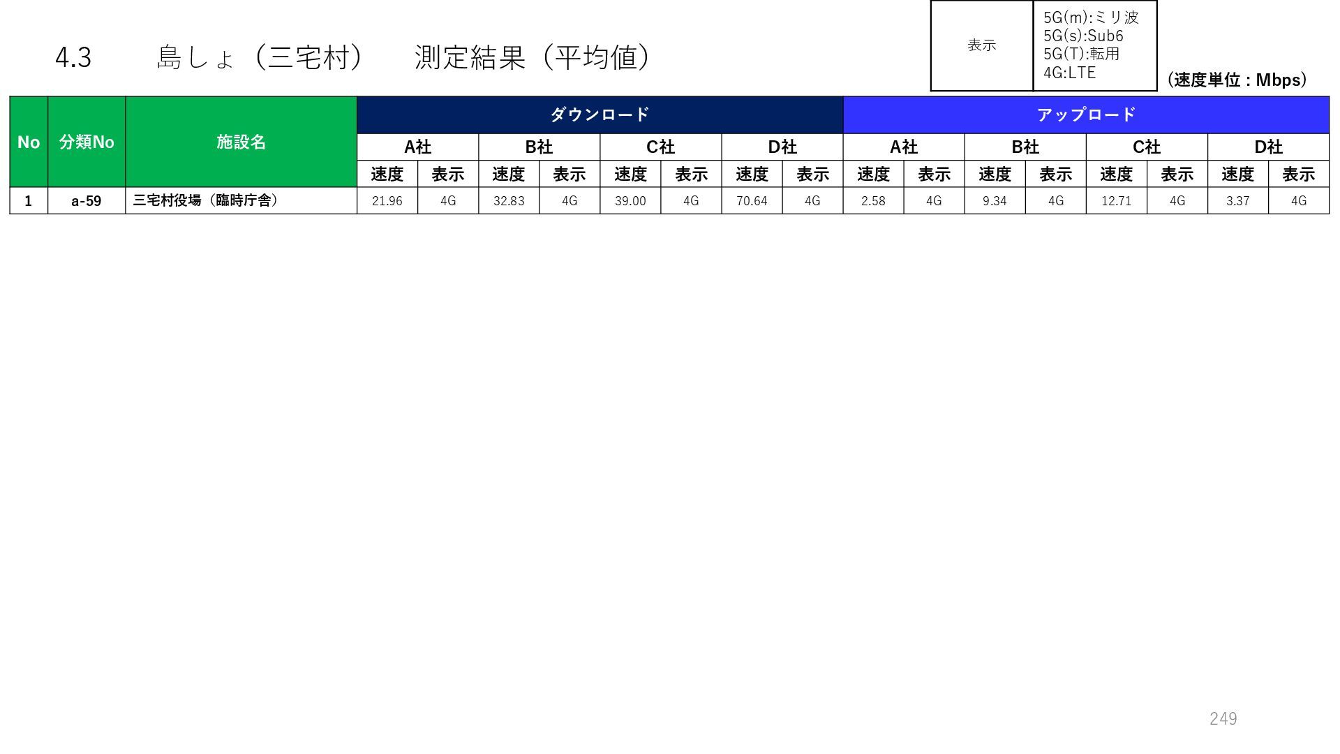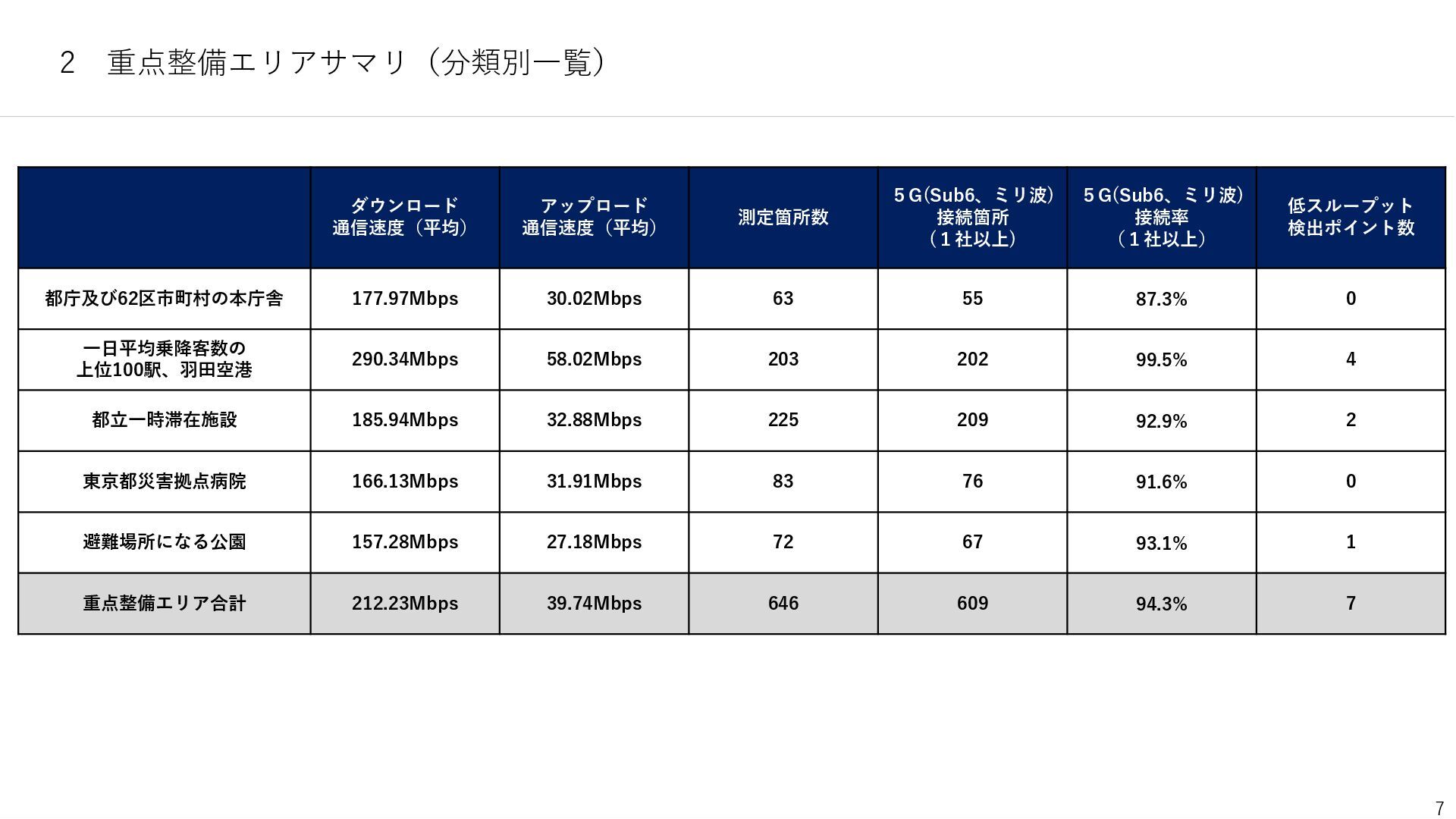 23区(葛飾区) 単位:Mbps ダウンロード アップロード 合算 A社 B社 C社 D社 合算 A社 B社 C社 D社 最大値 1334.31 465.40 1334.31 361.31 255.09 415.14 48.69 415.14 70.85 88.36 75%値 169.16 209.77 388.11 165.47 144.69 43.06 19.58 58.03 34.39 52.87 平均値 194.67 155.72 366.40 152.61 103.94 42.29 18.41 79.73 24.80 46.22 中央値 126.92 55.40 160.80 130.59 88.50 25.93 16.28 27.65 15.16 37.35 25%値 54.32 37.22 111.70 106.99 34.52 10.53 9.67 8.88 9.23 34.68 最小値 14.30 14.30 57.16 55.74 31.11 3.71 4.56 3.71 4.44 24.80 スループット定点測定 0 200 400 600 800 1,000 1,200 1,400 1,600 4社合算 A社 B社 C社 D社 0 100 200 300 400 500 4社合算 A社 B社 C社 D社 138