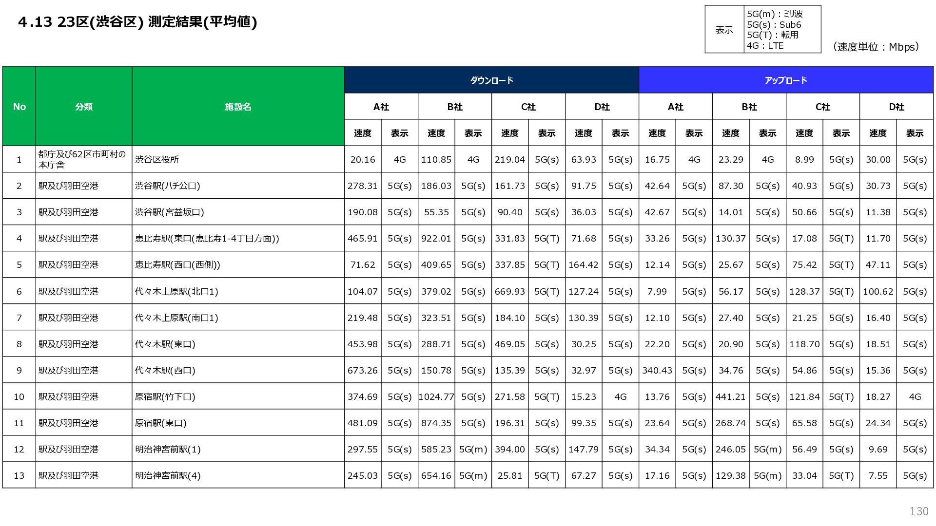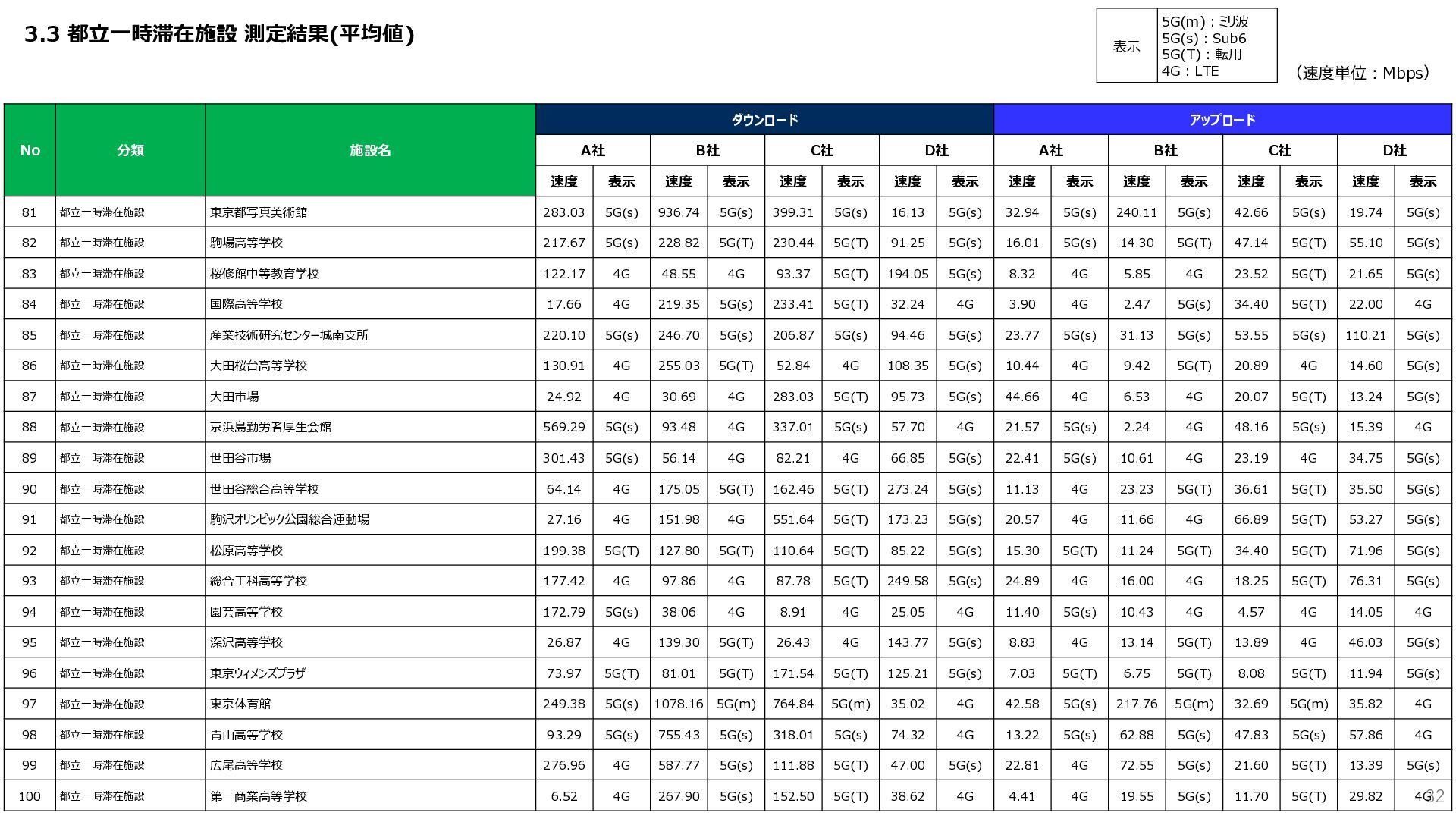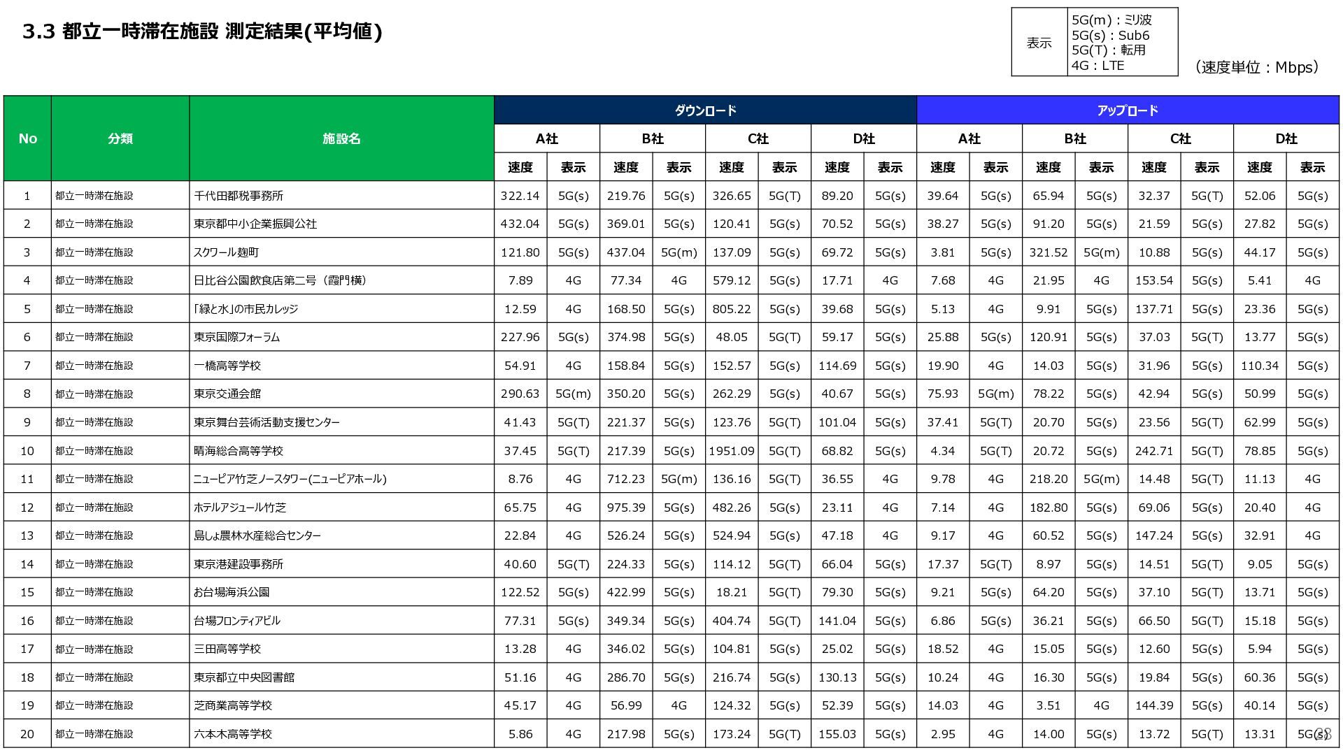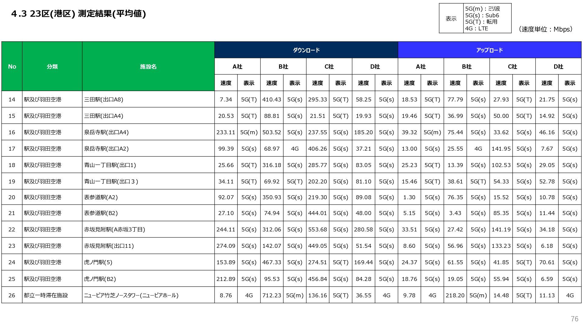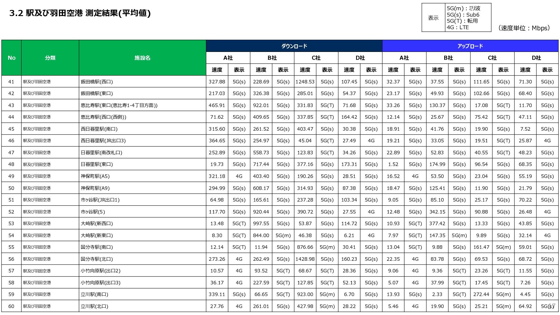 No 分類 施設名 ダウンロード アップロード A社 B社 C社 D社 A社 B社 C社 D社 速度 表示 速度 表示 速度 表示 速度 表示 速度 表示 速度 表示 速度 表示 速度 表示 181 駅及び羽田空港 赤坂見附駅(A赤坂3丁目) 244.11 5G(s) 312.06 5G(s) 553.68 5G(s) 280.58 5G(s) 33.51 5G(s) 27.42 5G(s) 141.19 5G(s) 34.18 5G(s) 182 駅及び羽田空港 赤坂見附駅(出口11) 274.09 5G(s) 142.07 5G(s) 449.05 5G(s) 51.54 5G(s) 8.60 5G(s) 56.96 5G(s) 133.23 5G(s) 6.18 5G(s) 183 駅及び羽田空港 中野坂上駅(出口1) 93.93 5G(T) 413.57 5G(T) 122.56 5G(T) 334.71 5G(m) 4.40 5G(T) 30.20 5G(T) 18.98 5G(T) 61.05 5G(m) 184 駅及び羽田空港 中野坂上駅(出口A2) 10.50 5G(s) 345.78 5G(s) 117.08 5G(T) 107.31 5G(s) 10.16 5G(s) 61.12 5G(s) 9.13 5G(T) 86.43 5G(s) 185 駅及び羽田空港 馬喰横山駅(出口1) 854.65 5G(s) 108.89 5G(s) 232.08 5G(m) 63.27 5G(s) 21.22 5G(s) 24.17 5G(s) 51.05 5G(m) 17.94 5G(s) 186 駅及び羽田空港 馬喰横山駅(出口A3) 206.87 5G(s) 968.72 5G(s) 10.64 5G(s) 35.08 5G(s) 15.76 5G(s) 143.06 5G(s) 68.96 5G(s) 34.89 5G(s) 187 駅及び羽田空港 大塚駅(北口) 43.53 5G(T) 847.90 5G(s) 186.89 5G(T) 60.82 5G(s) 26.25 5G(T) 150.29 5G(s) 35.04 5G(T) 70.17 5G(s) 188 駅及び羽田空港 大塚駅(南口) 15.47 5G(T) 1173.87 5G(s) 109.80 5G(T) 87.14 5G(s) 25.79 5G(T) 476.11 5G(s) 15.45 5G(T) 39.40 5G(s) 189 駅及び羽田空港 溜池山王駅(出口11) 92.40 5G(s) 403.44 5G(s) 472.42 5G(s) 55.40 5G(s) 13.09 5G(s) 53.36 5G(s) 90.48 5G(s) 4.36 5G(s) 190 駅及び羽田空港 溜池山王駅(出口5) 505.11 5G(s) 172.57 5G(s) 219.49 5G(s) 158.24 5G(s) 52.33 5G(s) 17.32 5G(s) 94.70 5G(s) 30.15 5G(s) 191 駅及び羽田空港 両国駅(東口) 302.46 5G(s) 125.33 5G(s) 69.06 5G(T) 57.41 5G(s) 8.65 5G(s) 29.32 5G(s) 34.20 5G(T) 17.95 5G(s) 192 駅及び羽田空港 両国駅(西口) 23.52 5G(s) 298.77 5G(s) 93.29 5G(T) 122.09 5G(s) 3.72 5G(s) 62.49 5G(s) 40.80 5G(T) 35.44 5G(s) 193 駅及び羽田空港 明治神宮前駅(4) 245.03 5G(s) 654.16 5G(m) 25.81 5G(T) 67.27 5G(s) 17.16 5G(s) 129.38 5G(m) 33.04 5G(T) 7.55 5G(s) 194 駅及び羽田空港 明治神宮前駅(1) 297.55 5G(s) 585.23 5G(m) 394.00 5G(s) 147.79 5G(s) 34.34 5G(s) 246.05 5G(m) 56.49 5G(s) 9.69 5G(s) 195 駅及び羽田空港 明大前駅(中央口) 244.72 5G(s) 41.49 4G 179.86 5G(T) 90.30 5G(s) 37.01 5G(s) 3.05 4G 37.59 5G(T) 41.14 5G(s) 196 駅及び羽田空港 明大前駅(フレンテ口) 77.75 5G(s) 359.64 5G(s) 140.30 5G(T) 83.94 5G(s) 42.60 5G(s) 60.21 5G(s) 30.28 5G(T) 45.83 5G(s) 197 駅及び羽田空港 東中野駅(西口) 39.24 5G(T) 233.33 5G(T) 193.21 5G(T) 70.45 5G(s) 29.19 5G(T) 60.83 5G(T) 13.88 5G(T) 55.17 5G(s) 198 駅及び羽田空港 東中野駅(東口) 46.14 5G(T) 119.89 4G 248.33 5G(s) 36.70 4G 34.95 5G(T) 14.32 4G 30.22 5G(s) 51.07 4G 199 駅及び羽田空港 虎ノ門駅(B2) 212.89 5G(s) 95.53 5G(s) 456.84 5G(s) 84.28 5G(s) 18.76 5G(s) 19.05 5G(s) 55.94 5G(s) 6.59 5G(s) 200 駅及び羽田空港 虎ノ門駅(5) 153.89 5G(s) 467.33 5G(s) 274.51 5G(T) 169.44 5G(s) 24.37 5G(s) 61.55 5G(s) 41.85 5G(T) 70.61 5G(s)