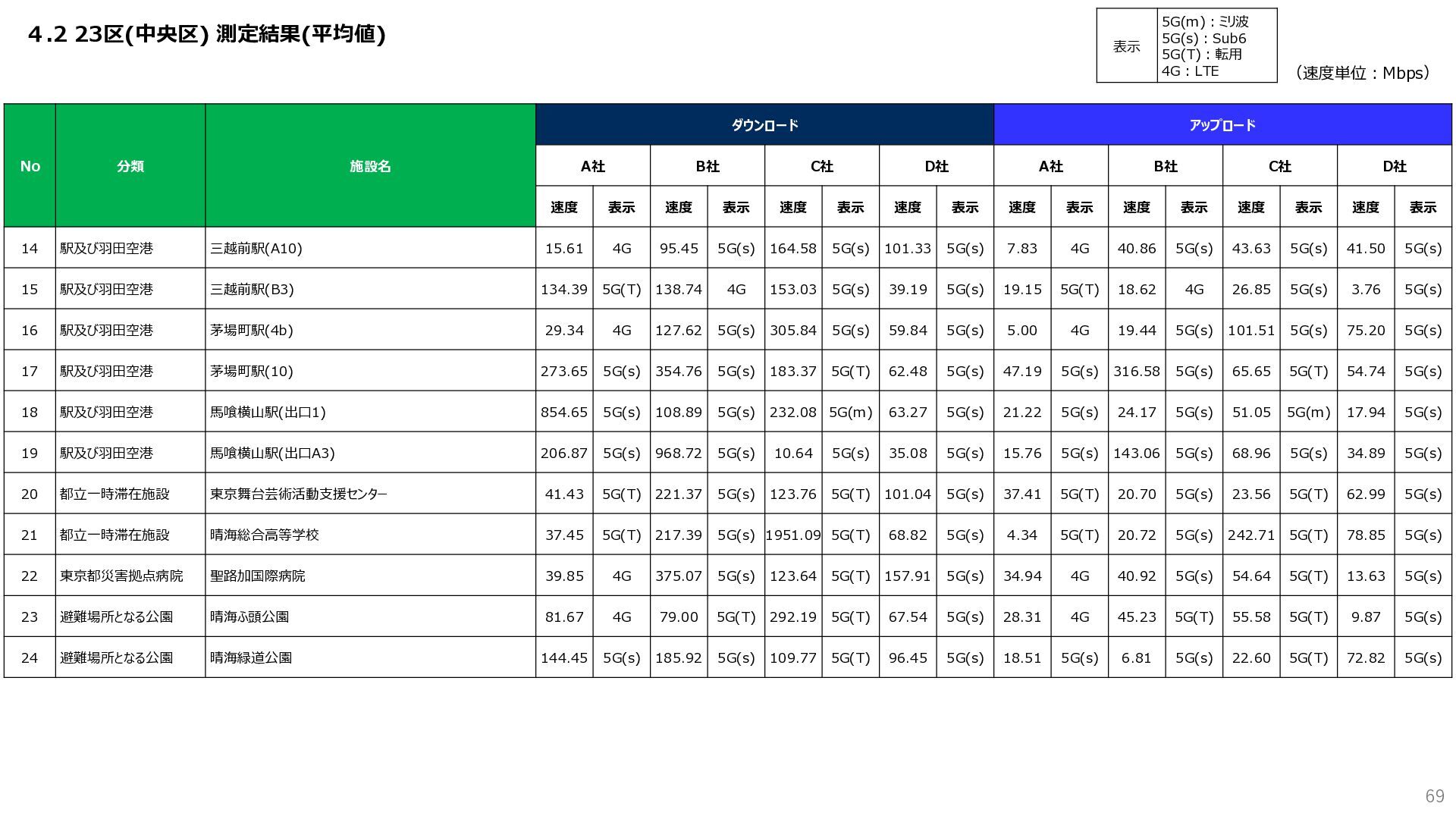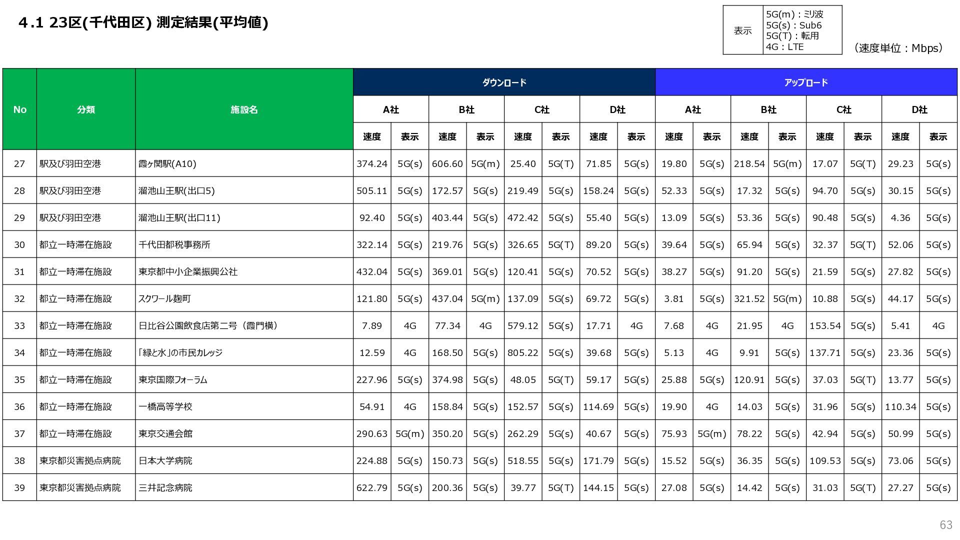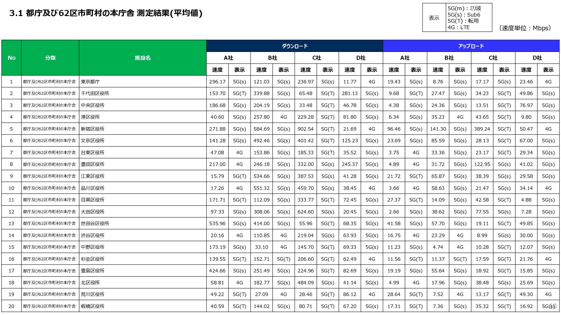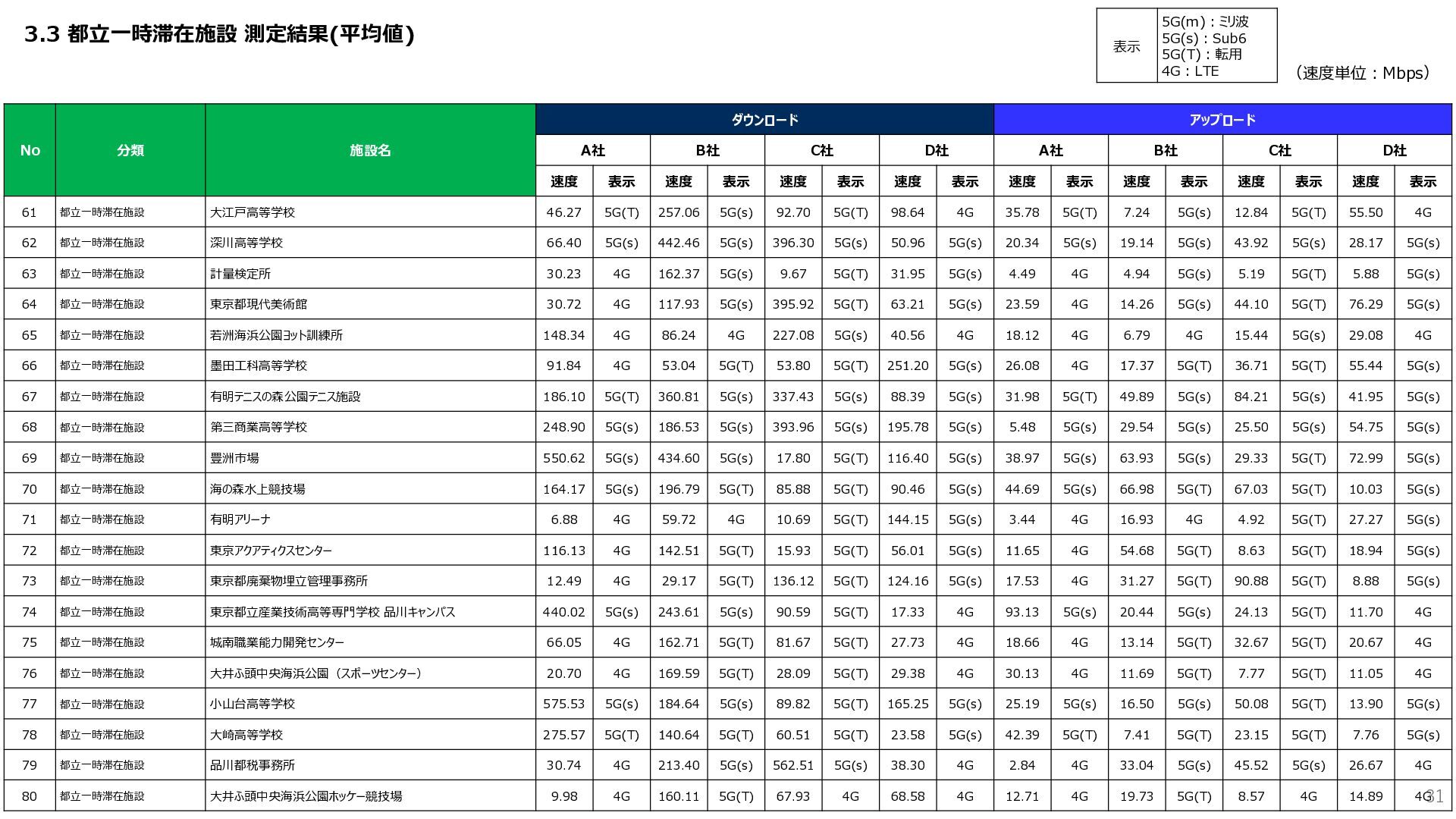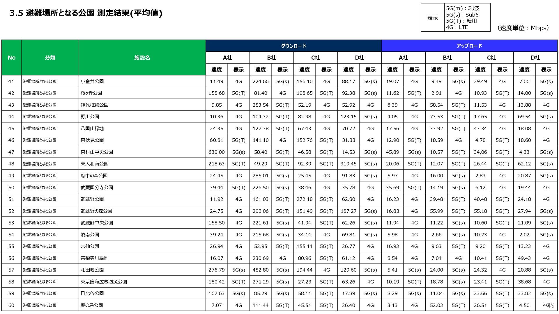 No 分類 施設名 ダウンロード アップロード A社 B社 C社 D社 A社 B社 C社 D社 速度 表示 速度 表示 速度 表示 速度 表示 速度 表示 速度 表示 速度 表示 速度 表示 181 駅及び羽田空港 赤坂見附駅(A赤坂3丁目) 244.11 5G(s) 312.06 5G(s) 553.68 5G(s) 280.58 5G(s) 33.51 5G(s) 27.42 5G(s) 141.19 5G(s) 34.18 5G(s) 182 駅及び羽田空港 赤坂見附駅(出口11) 274.09 5G(s) 142.07 5G(s) 449.05 5G(s) 51.54 5G(s) 8.60 5G(s) 56.96 5G(s) 133.23 5G(s) 6.18 5G(s) 183 駅及び羽田空港 中野坂上駅(出口1) 93.93 5G(T) 413.57 5G(T) 122.56 5G(T) 334.71 5G(m) 4.40 5G(T) 30.20 5G(T) 18.98 5G(T) 61.05 5G(m) 184 駅及び羽田空港 中野坂上駅(出口A2) 10.50 5G(s) 345.78 5G(s) 117.08 5G(T) 107.31 5G(s) 10.16 5G(s) 61.12 5G(s) 9.13 5G(T) 86.43 5G(s) 185 駅及び羽田空港 馬喰横山駅(出口1) 854.65 5G(s) 108.89 5G(s) 232.08 5G(m) 63.27 5G(s) 21.22 5G(s) 24.17 5G(s) 51.05 5G(m) 17.94 5G(s) 186 駅及び羽田空港 馬喰横山駅(出口A3) 206.87 5G(s) 968.72 5G(s) 10.64 5G(s) 35.08 5G(s) 15.76 5G(s) 143.06 5G(s) 68.96 5G(s) 34.89 5G(s) 187 駅及び羽田空港 大塚駅(北口) 43.53 5G(T) 847.90 5G(s) 186.89 5G(T) 60.82 5G(s) 26.25 5G(T) 150.29 5G(s) 35.04 5G(T) 70.17 5G(s) 188 駅及び羽田空港 大塚駅(南口) 15.47 5G(T) 1173.87 5G(s) 109.80 5G(T) 87.14 5G(s) 25.79 5G(T) 476.11 5G(s) 15.45 5G(T) 39.40 5G(s) 189 駅及び羽田空港 溜池山王駅(出口11) 92.40 5G(s) 403.44 5G(s) 472.42 5G(s) 55.40 5G(s) 13.09 5G(s) 53.36 5G(s) 90.48 5G(s) 4.36 5G(s) 190 駅及び羽田空港 溜池山王駅(出口5) 505.11 5G(s) 172.57 5G(s) 219.49 5G(s) 158.24 5G(s) 52.33 5G(s) 17.32 5G(s) 94.70 5G(s) 30.15 5G(s) 191 駅及び羽田空港 両国駅(東口) 302.46 5G(s) 125.33 5G(s) 69.06 5G(T) 57.41 5G(s) 8.65 5G(s) 29.32 5G(s) 34.20 5G(T) 17.95 5G(s) 192 駅及び羽田空港 両国駅(西口) 23.52 5G(s) 298.77 5G(s) 93.29 5G(T) 122.09 5G(s) 3.72 5G(s) 62.49 5G(s) 40.80 5G(T) 35.44 5G(s) 193 駅及び羽田空港 明治神宮前駅(4) 245.03 5G(s) 654.16 5G(m) 25.81 5G(T) 67.27 5G(s) 17.16 5G(s) 129.38 5G(m) 33.04 5G(T) 7.55 5G(s) 194 駅及び羽田空港 明治神宮前駅(1) 297.55 5G(s) 585.23 5G(m) 394.00 5G(s) 147.79 5G(s) 34.34 5G(s) 246.05 5G(m) 56.49 5G(s) 9.69 5G(s) 195 駅及び羽田空港 明大前駅(中央口) 244.72 5G(s) 41.49 4G 179.86 5G(T) 90.30 5G(s) 37.01 5G(s) 3.05 4G 37.59 5G(T) 41.14 5G(s) 196 駅及び羽田空港 明大前駅(フレンテ口) 77.75 5G(s) 359.64 5G(s) 140.30 5G(T) 83.94 5G(s) 42.60 5G(s) 60.21 5G(s) 30.28 5G(T) 45.83 5G(s) 197 駅及び羽田空港 東中野駅(西口) 39.24 5G(T) 233.33 5G(T) 193.21 5G(T) 70.45 5G(s) 29.19 5G(T) 60.83 5G(T) 13.88 5G(T) 55.17 5G(s) 198 駅及び羽田空港 東中野駅(東口) 46.14 5G(T) 119.89 4G 248.33 5G(s) 36.70 4G 34.95 5G(T) 14.32 4G 30.22 5G(s) 51.07 4G 199 駅及び羽田空港 虎ノ門駅(B2) 212.89 5G(s) 95.53 5G(s) 456.84 5G(s) 84.28 5G(s) 18.76 5G(s) 19.05 5G(s) 55.94 5G(s) 6.59 5G(s) 200 駅及び羽田空港 虎ノ門駅(5) 153.89 5G(s) 467.33 5G(s) 274.51 5G(T) 169.44 5G(s) 24.37 5G(s) 61.55 5G(s) 41.85 5G(T) 70.61 5G(s)