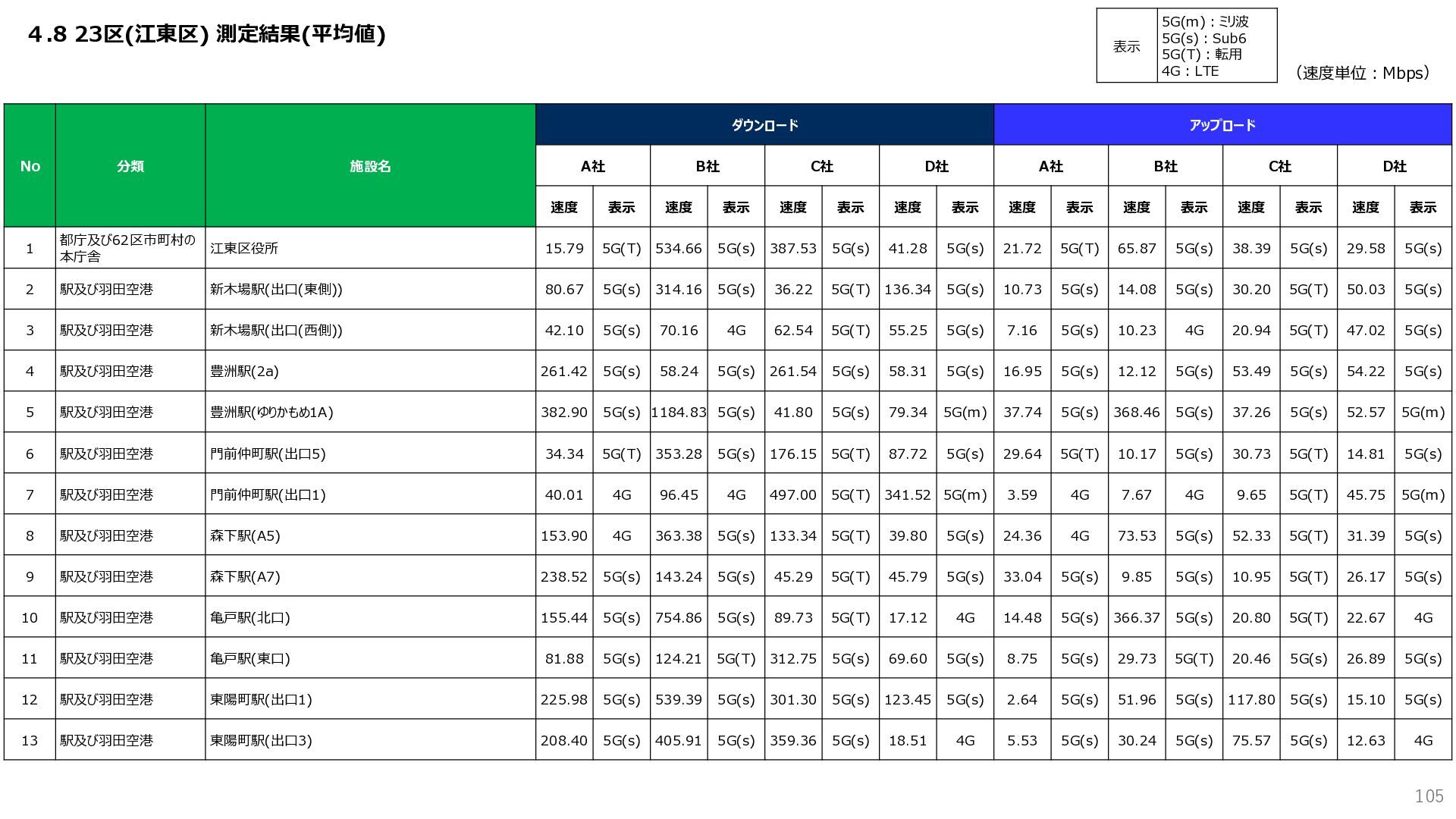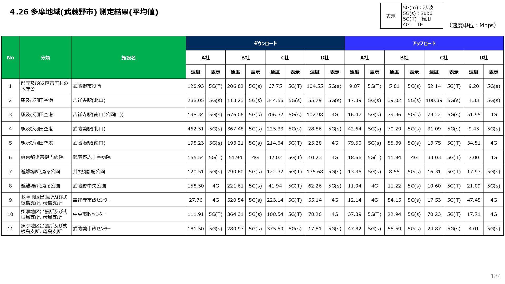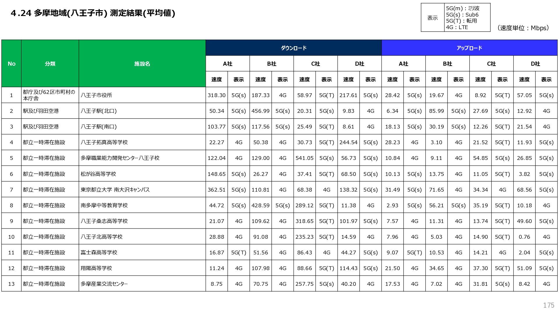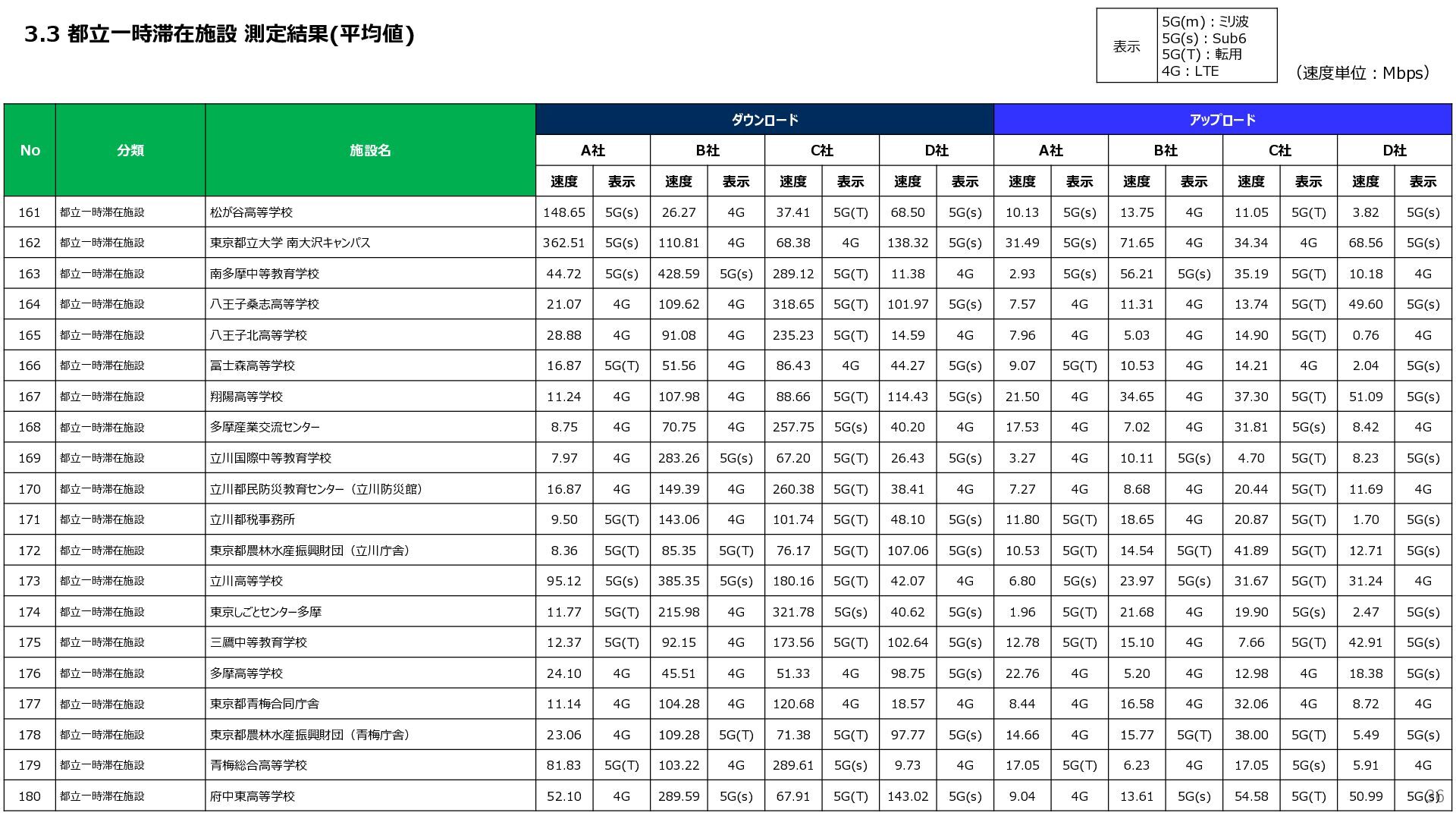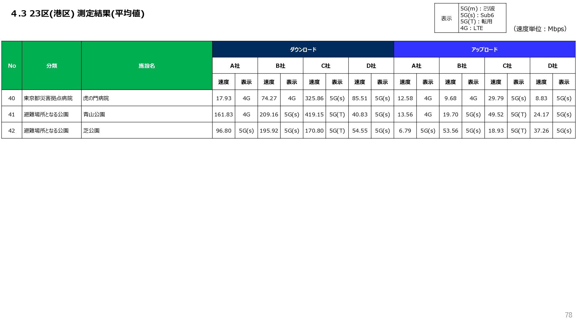 No 分類 施設名 ダウンロード アップロード A社 B社 C社 D社 A社 B社 C社 D社 速度 表示 速度 表示 速度 表示 速度 表示 速度 表示 速度 表示 速度 表示 速度 表示 181 駅及び羽田空港 赤坂見附駅(A赤坂3丁目) 244.11 5G(s) 312.06 5G(s) 553.68 5G(s) 280.58 5G(s) 33.51 5G(s) 27.42 5G(s) 141.19 5G(s) 34.18 5G(s) 182 駅及び羽田空港 赤坂見附駅(出口11) 274.09 5G(s) 142.07 5G(s) 449.05 5G(s) 51.54 5G(s) 8.60 5G(s) 56.96 5G(s) 133.23 5G(s) 6.18 5G(s) 183 駅及び羽田空港 中野坂上駅(出口1) 93.93 5G(T) 413.57 5G(T) 122.56 5G(T) 334.71 5G(m) 4.40 5G(T) 30.20 5G(T) 18.98 5G(T) 61.05 5G(m) 184 駅及び羽田空港 中野坂上駅(出口A2) 10.50 5G(s) 345.78 5G(s) 117.08 5G(T) 107.31 5G(s) 10.16 5G(s) 61.12 5G(s) 9.13 5G(T) 86.43 5G(s) 185 駅及び羽田空港 馬喰横山駅(出口1) 854.65 5G(s) 108.89 5G(s) 232.08 5G(m) 63.27 5G(s) 21.22 5G(s) 24.17 5G(s) 51.05 5G(m) 17.94 5G(s) 186 駅及び羽田空港 馬喰横山駅(出口A3) 206.87 5G(s) 968.72 5G(s) 10.64 5G(s) 35.08 5G(s) 15.76 5G(s) 143.06 5G(s) 68.96 5G(s) 34.89 5G(s) 187 駅及び羽田空港 大塚駅(北口) 43.53 5G(T) 847.90 5G(s) 186.89 5G(T) 60.82 5G(s) 26.25 5G(T) 150.29 5G(s) 35.04 5G(T) 70.17 5G(s) 188 駅及び羽田空港 大塚駅(南口) 15.47 5G(T) 1173.87 5G(s) 109.80 5G(T) 87.14 5G(s) 25.79 5G(T) 476.11 5G(s) 15.45 5G(T) 39.40 5G(s) 189 駅及び羽田空港 溜池山王駅(出口11) 92.40 5G(s) 403.44 5G(s) 472.42 5G(s) 55.40 5G(s) 13.09 5G(s) 53.36 5G(s) 90.48 5G(s) 4.36 5G(s) 190 駅及び羽田空港 溜池山王駅(出口5) 505.11 5G(s) 172.57 5G(s) 219.49 5G(s) 158.24 5G(s) 52.33 5G(s) 17.32 5G(s) 94.70 5G(s) 30.15 5G(s) 191 駅及び羽田空港 両国駅(東口) 302.46 5G(s) 125.33 5G(s) 69.06 5G(T) 57.41 5G(s) 8.65 5G(s) 29.32 5G(s) 34.20 5G(T) 17.95 5G(s) 192 駅及び羽田空港 両国駅(西口) 23.52 5G(s) 298.77 5G(s) 93.29 5G(T) 122.09 5G(s) 3.72 5G(s) 62.49 5G(s) 40.80 5G(T) 35.44 5G(s) 193 駅及び羽田空港 明治神宮前駅(4) 245.03 5G(s) 654.16 5G(m) 25.81 5G(T) 67.27 5G(s) 17.16 5G(s) 129.38 5G(m) 33.04 5G(T) 7.55 5G(s) 194 駅及び羽田空港 明治神宮前駅(1) 297.55 5G(s) 585.23 5G(m) 394.00 5G(s) 147.79 5G(s) 34.34 5G(s) 246.05 5G(m) 56.49 5G(s) 9.69 5G(s) 195 駅及び羽田空港 明大前駅(中央口) 244.72 5G(s) 41.49 4G 179.86 5G(T) 90.30 5G(s) 37.01 5G(s) 3.05 4G 37.59 5G(T) 41.14 5G(s) 196 駅及び羽田空港 明大前駅(フレンテ口) 77.75 5G(s) 359.64 5G(s) 140.30 5G(T) 83.94 5G(s) 42.60 5G(s) 60.21 5G(s) 30.28 5G(T) 45.83 5G(s) 197 駅及び羽田空港 東中野駅(西口) 39.24 5G(T) 233.33 5G(T) 193.21 5G(T) 70.45 5G(s) 29.19 5G(T) 60.83 5G(T) 13.88 5G(T) 55.17 5G(s) 198 駅及び羽田空港 東中野駅(東口) 46.14 5G(T) 119.89 4G 248.33 5G(s) 36.70 4G 34.95 5G(T) 14.32 4G 30.22 5G(s) 51.07 4G 199 駅及び羽田空港 虎ノ門駅(B2) 212.89 5G(s) 95.53 5G(s) 456.84 5G(s) 84.28 5G(s) 18.76 5G(s) 19.05 5G(s) 55.94 5G(s) 6.59 5G(s) 200 駅及び羽田空港 虎ノ門駅(5) 153.89 5G(s) 467.33 5G(s) 274.51 5G(T) 169.44 5G(s) 24.37 5G(s) 61.55 5G(s) 41.85 5G(T) 70.61 5G(s)