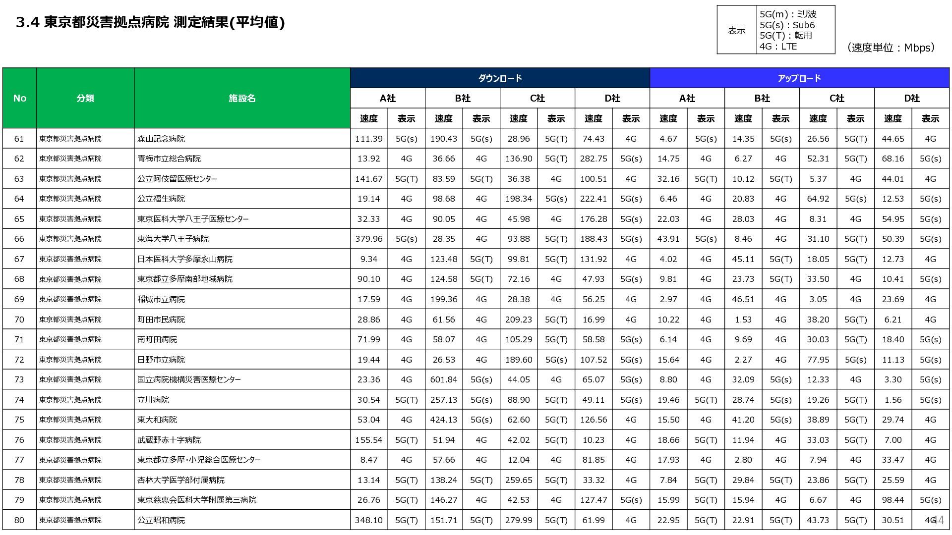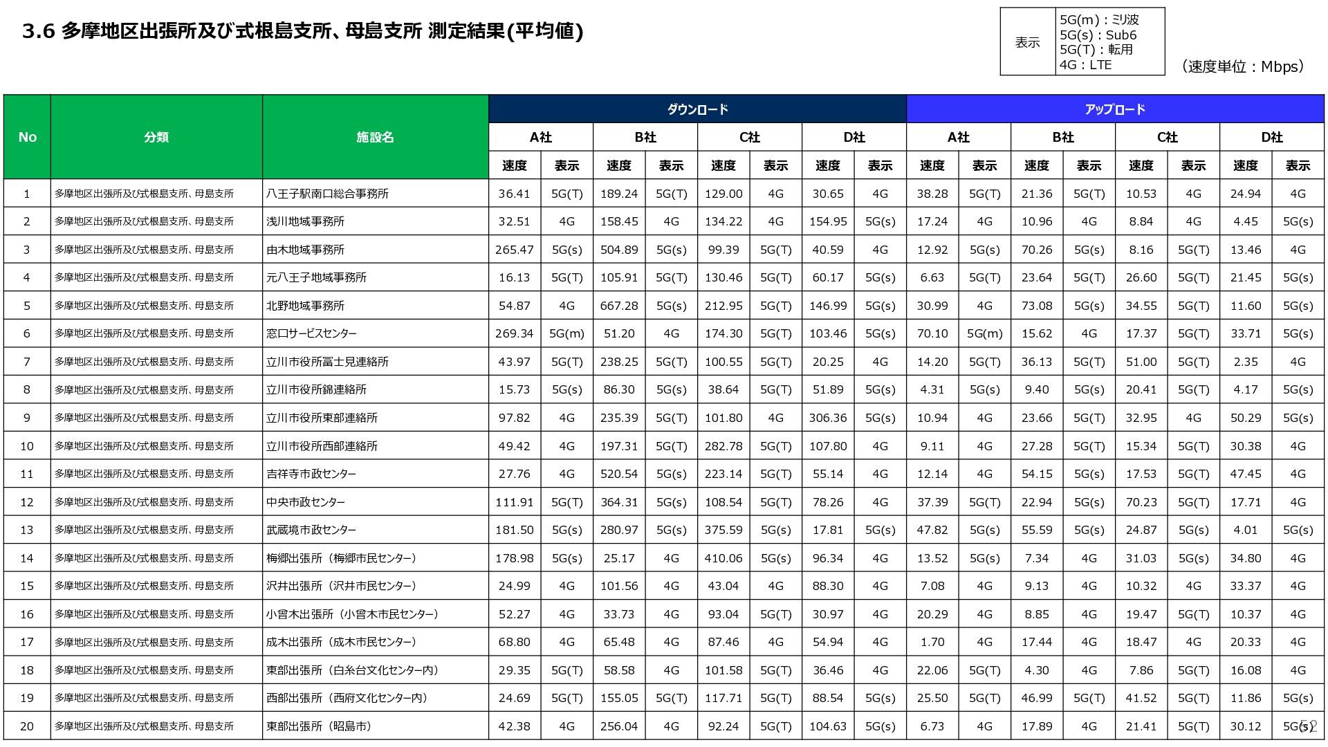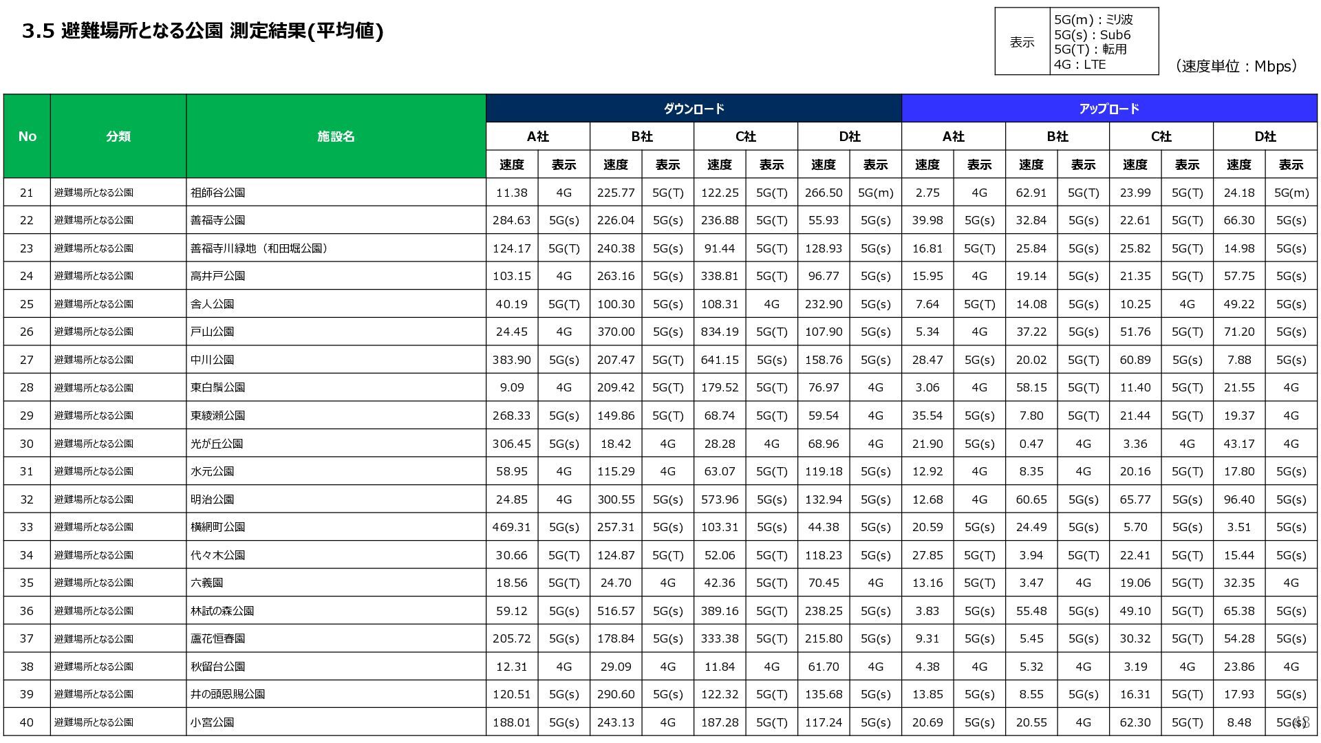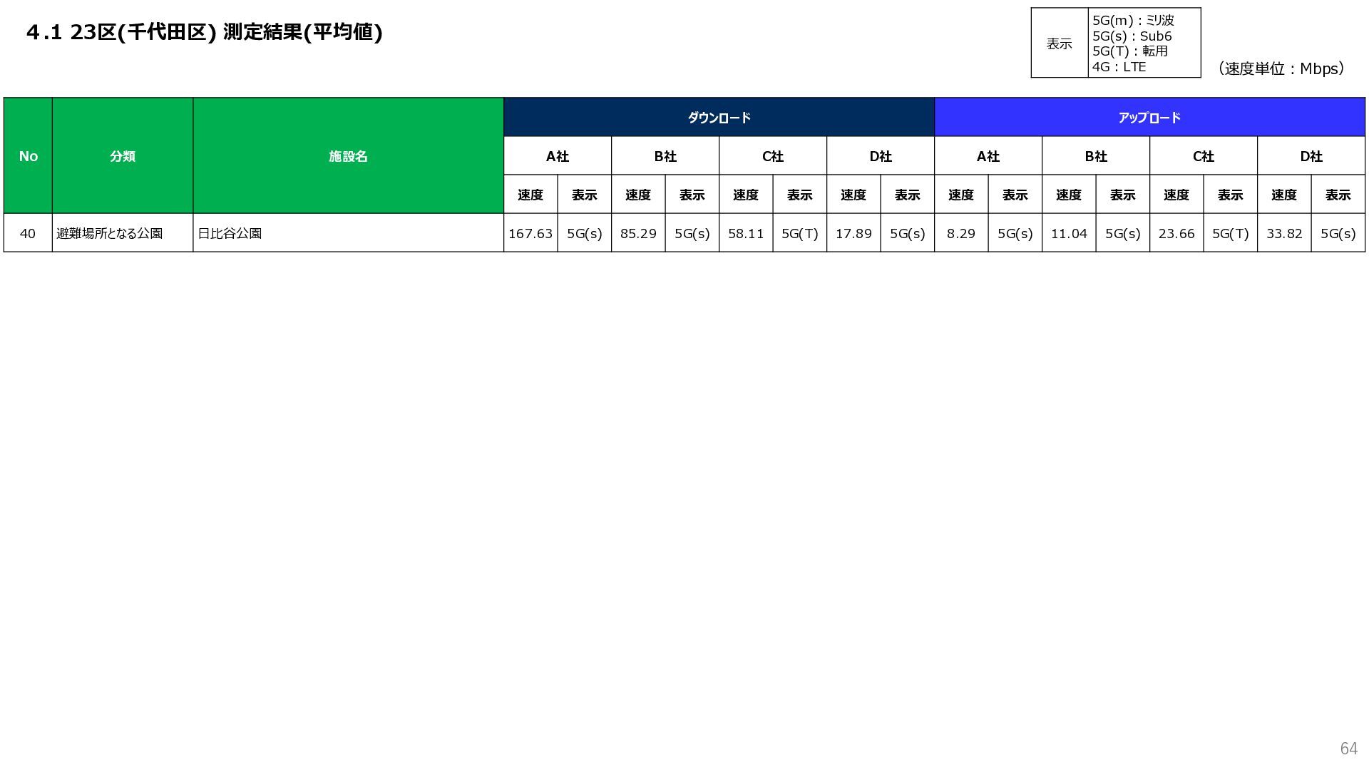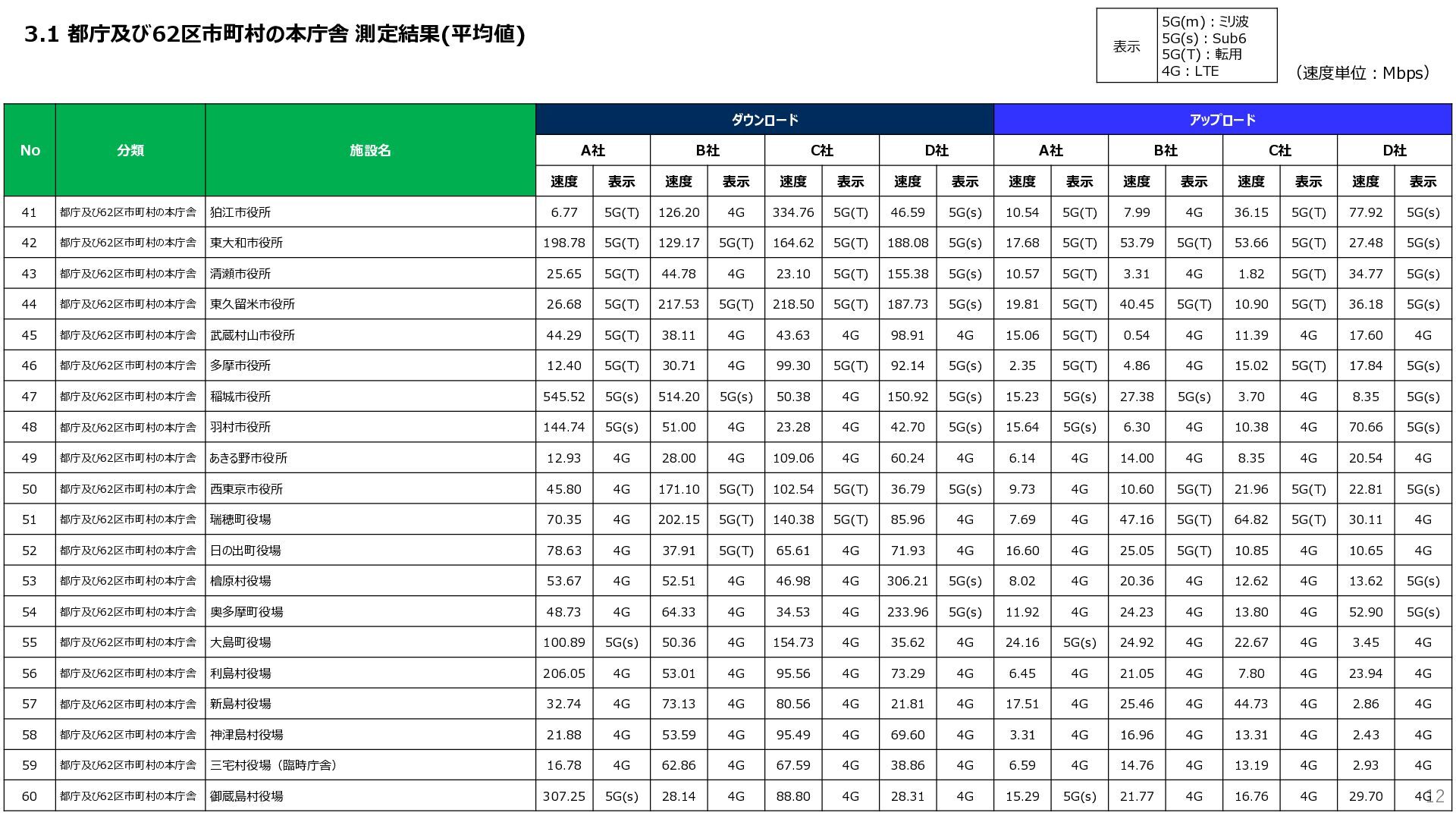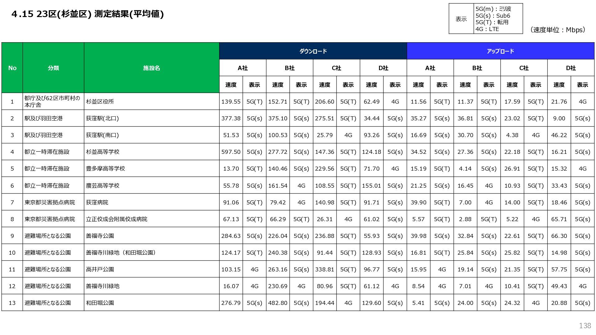 No 分類 施設名 ダウンロード アップロード A社 B社 C社 D社 A社 B社 C社 D社 速度 表示 速度 表示 速度 表示 速度 表示 速度 表示 速度 表示 速度 表示 速度 表示 181 駅及び羽田空港 赤坂見附駅(A赤坂3丁目) 244.11 5G(s) 312.06 5G(s) 553.68 5G(s) 280.58 5G(s) 33.51 5G(s) 27.42 5G(s) 141.19 5G(s) 34.18 5G(s) 182 駅及び羽田空港 赤坂見附駅(出口11) 274.09 5G(s) 142.07 5G(s) 449.05 5G(s) 51.54 5G(s) 8.60 5G(s) 56.96 5G(s) 133.23 5G(s) 6.18 5G(s) 183 駅及び羽田空港 中野坂上駅(出口1) 93.93 5G(T) 413.57 5G(T) 122.56 5G(T) 334.71 5G(m) 4.40 5G(T) 30.20 5G(T) 18.98 5G(T) 61.05 5G(m) 184 駅及び羽田空港 中野坂上駅(出口A2) 10.50 5G(s) 345.78 5G(s) 117.08 5G(T) 107.31 5G(s) 10.16 5G(s) 61.12 5G(s) 9.13 5G(T) 86.43 5G(s) 185 駅及び羽田空港 馬喰横山駅(出口1) 854.65 5G(s) 108.89 5G(s) 232.08 5G(m) 63.27 5G(s) 21.22 5G(s) 24.17 5G(s) 51.05 5G(m) 17.94 5G(s) 186 駅及び羽田空港 馬喰横山駅(出口A3) 206.87 5G(s) 968.72 5G(s) 10.64 5G(s) 35.08 5G(s) 15.76 5G(s) 143.06 5G(s) 68.96 5G(s) 34.89 5G(s) 187 駅及び羽田空港 大塚駅(北口) 43.53 5G(T) 847.90 5G(s) 186.89 5G(T) 60.82 5G(s) 26.25 5G(T) 150.29 5G(s) 35.04 5G(T) 70.17 5G(s) 188 駅及び羽田空港 大塚駅(南口) 15.47 5G(T) 1173.87 5G(s) 109.80 5G(T) 87.14 5G(s) 25.79 5G(T) 476.11 5G(s) 15.45 5G(T) 39.40 5G(s) 189 駅及び羽田空港 溜池山王駅(出口11) 92.40 5G(s) 403.44 5G(s) 472.42 5G(s) 55.40 5G(s) 13.09 5G(s) 53.36 5G(s) 90.48 5G(s) 4.36 5G(s) 190 駅及び羽田空港 溜池山王駅(出口5) 505.11 5G(s) 172.57 5G(s) 219.49 5G(s) 158.24 5G(s) 52.33 5G(s) 17.32 5G(s) 94.70 5G(s) 30.15 5G(s) 191 駅及び羽田空港 両国駅(東口) 302.46 5G(s) 125.33 5G(s) 69.06 5G(T) 57.41 5G(s) 8.65 5G(s) 29.32 5G(s) 34.20 5G(T) 17.95 5G(s) 192 駅及び羽田空港 両国駅(西口) 23.52 5G(s) 298.77 5G(s) 93.29 5G(T) 122.09 5G(s) 3.72 5G(s) 62.49 5G(s) 40.80 5G(T) 35.44 5G(s) 193 駅及び羽田空港 明治神宮前駅(4) 245.03 5G(s) 654.16 5G(m) 25.81 5G(T) 67.27 5G(s) 17.16 5G(s) 129.38 5G(m) 33.04 5G(T) 7.55 5G(s) 194 駅及び羽田空港 明治神宮前駅(1) 297.55 5G(s) 585.23 5G(m) 394.00 5G(s) 147.79 5G(s) 34.34 5G(s) 246.05 5G(m) 56.49 5G(s) 9.69 5G(s) 195 駅及び羽田空港 明大前駅(中央口) 244.72 5G(s) 41.49 4G 179.86 5G(T) 90.30 5G(s) 37.01 5G(s) 3.05 4G 37.59 5G(T) 41.14 5G(s) 196 駅及び羽田空港 明大前駅(フレンテ口) 77.75 5G(s) 359.64 5G(s) 140.30 5G(T) 83.94 5G(s) 42.60 5G(s) 60.21 5G(s) 30.28 5G(T) 45.83 5G(s) 197 駅及び羽田空港 東中野駅(西口) 39.24 5G(T) 233.33 5G(T) 193.21 5G(T) 70.45 5G(s) 29.19 5G(T) 60.83 5G(T) 13.88 5G(T) 55.17 5G(s) 198 駅及び羽田空港 東中野駅(東口) 46.14 5G(T) 119.89 4G 248.33 5G(s) 36.70 4G 34.95 5G(T) 14.32 4G 30.22 5G(s) 51.07 4G 199 駅及び羽田空港 虎ノ門駅(B2) 212.89 5G(s) 95.53 5G(s) 456.84 5G(s) 84.28 5G(s) 18.76 5G(s) 19.05 5G(s) 55.94 5G(s) 6.59 5G(s) 200 駅及び羽田空港 虎ノ門駅(5) 153.89 5G(s) 467.33 5G(s) 274.51 5G(T) 169.44 5G(s) 24.37 5G(s) 61.55 5G(s) 41.85 5G(T) 70.61 5G(s)