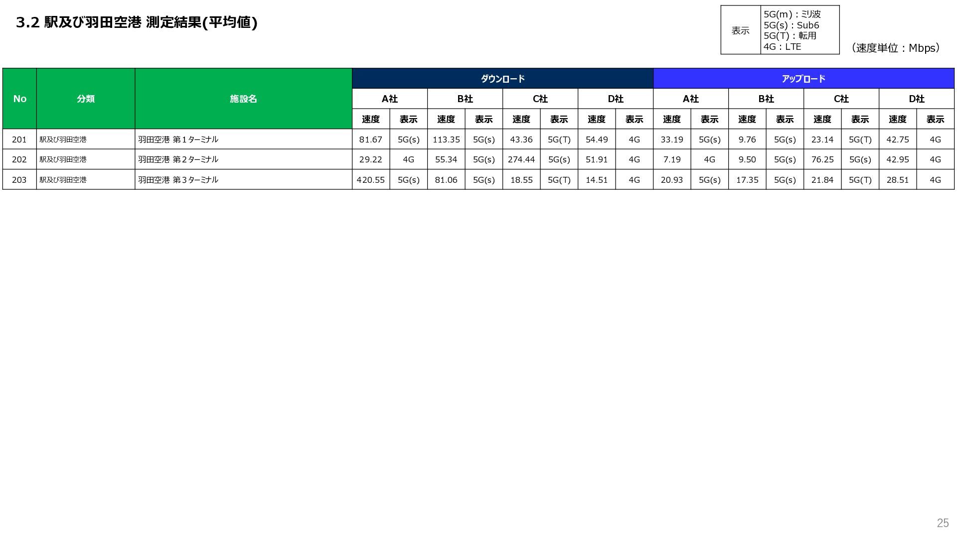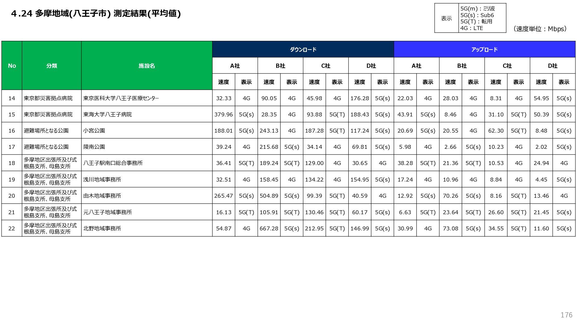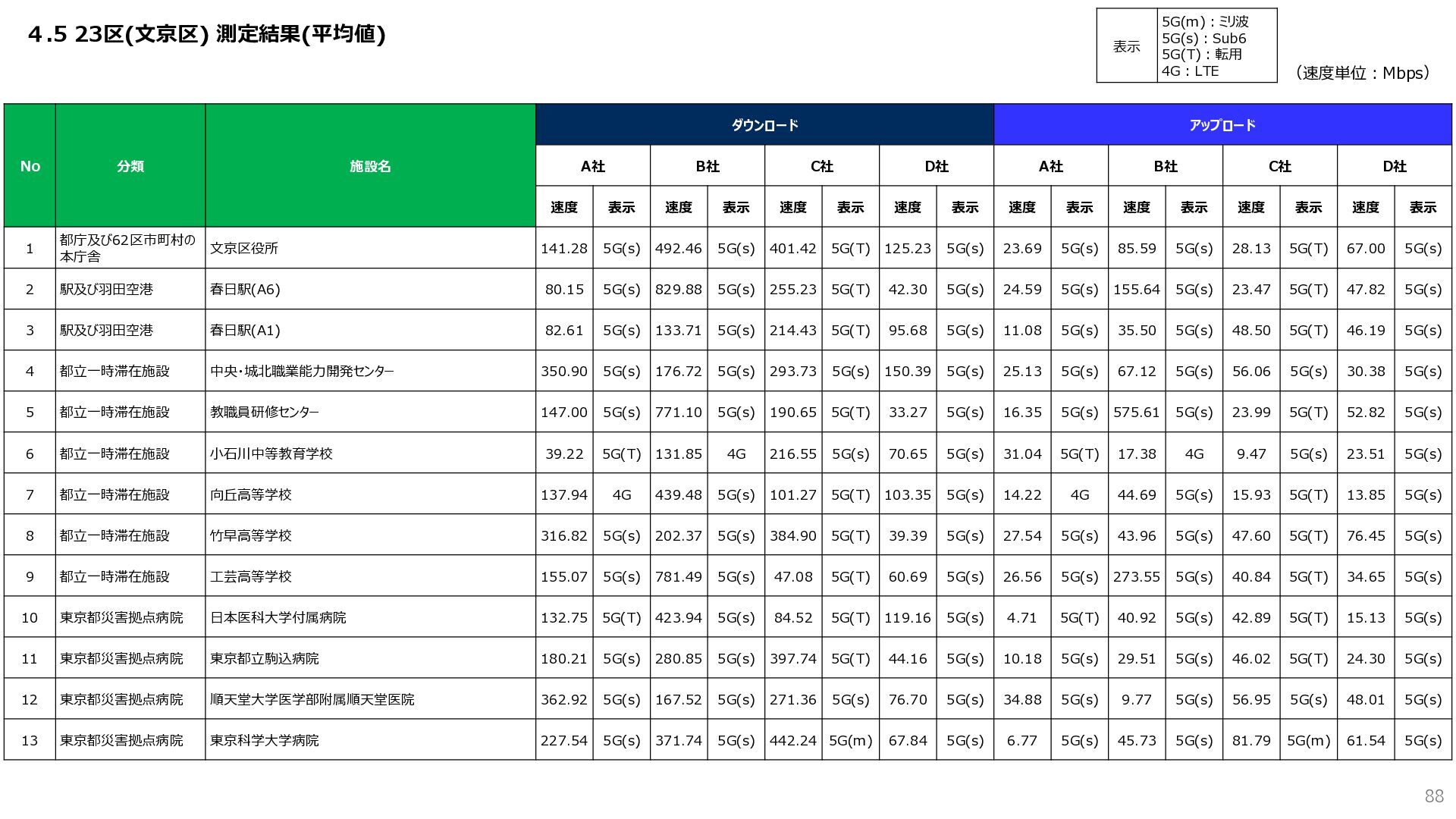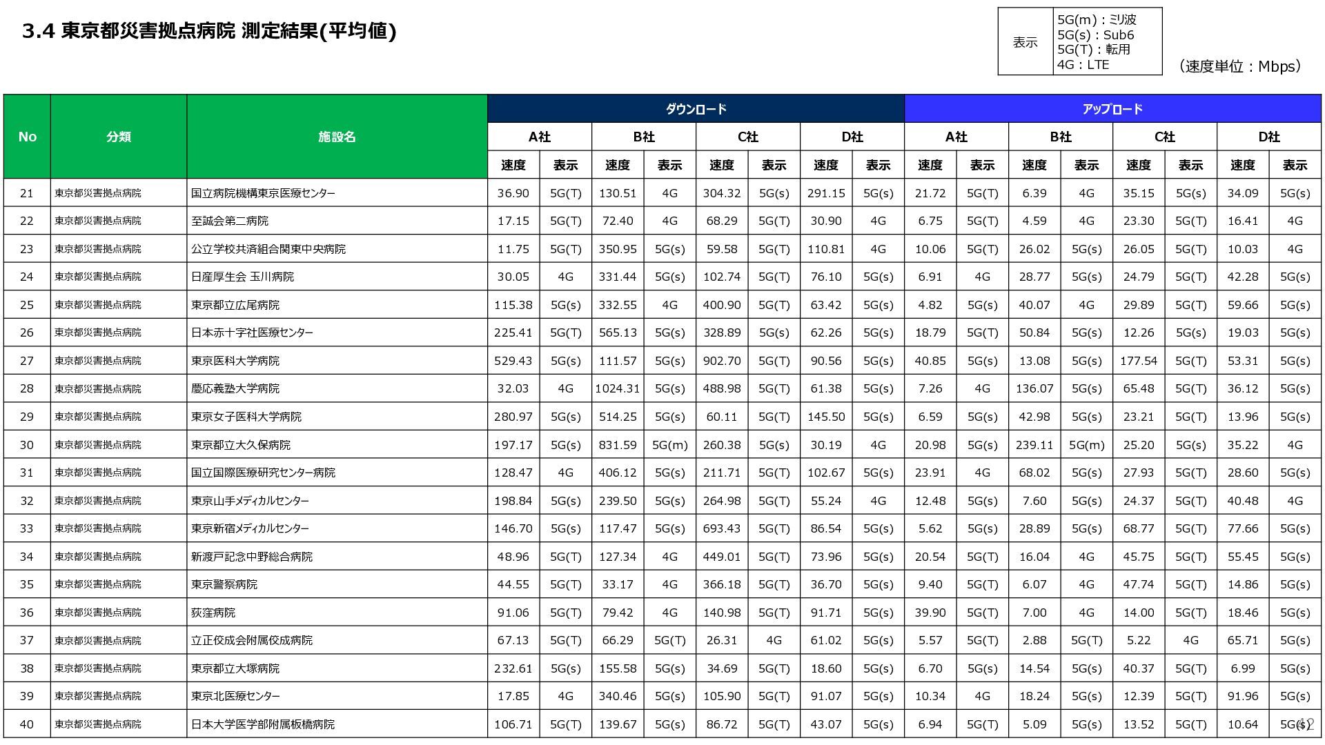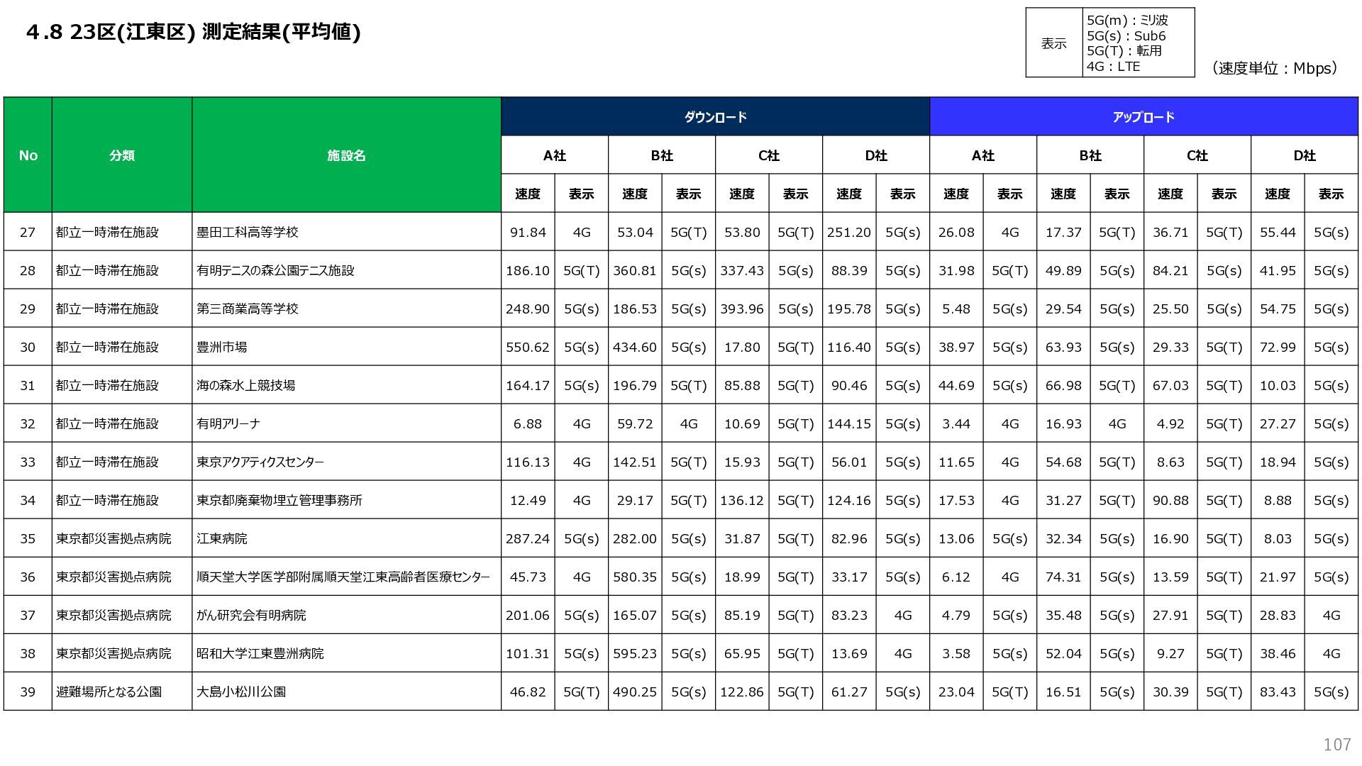 No 分類 施設名 ダウンロード アップロード A社 B社 C社 D社 A社 B社 C社 D社 速度 表示 速度 表示 速度 表示 速度 表示 速度 表示 速度 表示 速度 表示 速度 表示 181 駅及び羽田空港 赤坂見附駅(A赤坂3丁目) 244.11 5G(s) 312.06 5G(s) 553.68 5G(s) 280.58 5G(s) 33.51 5G(s) 27.42 5G(s) 141.19 5G(s) 34.18 5G(s) 182 駅及び羽田空港 赤坂見附駅(出口11) 274.09 5G(s) 142.07 5G(s) 449.05 5G(s) 51.54 5G(s) 8.60 5G(s) 56.96 5G(s) 133.23 5G(s) 6.18 5G(s) 183 駅及び羽田空港 中野坂上駅(出口1) 93.93 5G(T) 413.57 5G(T) 122.56 5G(T) 334.71 5G(m) 4.40 5G(T) 30.20 5G(T) 18.98 5G(T) 61.05 5G(m) 184 駅及び羽田空港 中野坂上駅(出口A2) 10.50 5G(s) 345.78 5G(s) 117.08 5G(T) 107.31 5G(s) 10.16 5G(s) 61.12 5G(s) 9.13 5G(T) 86.43 5G(s) 185 駅及び羽田空港 馬喰横山駅(出口1) 854.65 5G(s) 108.89 5G(s) 232.08 5G(m) 63.27 5G(s) 21.22 5G(s) 24.17 5G(s) 51.05 5G(m) 17.94 5G(s) 186 駅及び羽田空港 馬喰横山駅(出口A3) 206.87 5G(s) 968.72 5G(s) 10.64 5G(s) 35.08 5G(s) 15.76 5G(s) 143.06 5G(s) 68.96 5G(s) 34.89 5G(s) 187 駅及び羽田空港 大塚駅(北口) 43.53 5G(T) 847.90 5G(s) 186.89 5G(T) 60.82 5G(s) 26.25 5G(T) 150.29 5G(s) 35.04 5G(T) 70.17 5G(s) 188 駅及び羽田空港 大塚駅(南口) 15.47 5G(T) 1173.87 5G(s) 109.80 5G(T) 87.14 5G(s) 25.79 5G(T) 476.11 5G(s) 15.45 5G(T) 39.40 5G(s) 189 駅及び羽田空港 溜池山王駅(出口11) 92.40 5G(s) 403.44 5G(s) 472.42 5G(s) 55.40 5G(s) 13.09 5G(s) 53.36 5G(s) 90.48 5G(s) 4.36 5G(s) 190 駅及び羽田空港 溜池山王駅(出口5) 505.11 5G(s) 172.57 5G(s) 219.49 5G(s) 158.24 5G(s) 52.33 5G(s) 17.32 5G(s) 94.70 5G(s) 30.15 5G(s) 191 駅及び羽田空港 両国駅(東口) 302.46 5G(s) 125.33 5G(s) 69.06 5G(T) 57.41 5G(s) 8.65 5G(s) 29.32 5G(s) 34.20 5G(T) 17.95 5G(s) 192 駅及び羽田空港 両国駅(西口) 23.52 5G(s) 298.77 5G(s) 93.29 5G(T) 122.09 5G(s) 3.72 5G(s) 62.49 5G(s) 40.80 5G(T) 35.44 5G(s) 193 駅及び羽田空港 明治神宮前駅(4) 245.03 5G(s) 654.16 5G(m) 25.81 5G(T) 67.27 5G(s) 17.16 5G(s) 129.38 5G(m) 33.04 5G(T) 7.55 5G(s) 194 駅及び羽田空港 明治神宮前駅(1) 297.55 5G(s) 585.23 5G(m) 394.00 5G(s) 147.79 5G(s) 34.34 5G(s) 246.05 5G(m) 56.49 5G(s) 9.69 5G(s) 195 駅及び羽田空港 明大前駅(中央口) 244.72 5G(s) 41.49 4G 179.86 5G(T) 90.30 5G(s) 37.01 5G(s) 3.05 4G 37.59 5G(T) 41.14 5G(s) 196 駅及び羽田空港 明大前駅(フレンテ口) 77.75 5G(s) 359.64 5G(s) 140.30 5G(T) 83.94 5G(s) 42.60 5G(s) 60.21 5G(s) 30.28 5G(T) 45.83 5G(s) 197 駅及び羽田空港 東中野駅(西口) 39.24 5G(T) 233.33 5G(T) 193.21 5G(T) 70.45 5G(s) 29.19 5G(T) 60.83 5G(T) 13.88 5G(T) 55.17 5G(s) 198 駅及び羽田空港 東中野駅(東口) 46.14 5G(T) 119.89 4G 248.33 5G(s) 36.70 4G 34.95 5G(T) 14.32 4G 30.22 5G(s) 51.07 4G 199 駅及び羽田空港 虎ノ門駅(B2) 212.89 5G(s) 95.53 5G(s) 456.84 5G(s) 84.28 5G(s) 18.76 5G(s) 19.05 5G(s) 55.94 5G(s) 6.59 5G(s) 200 駅及び羽田空港 虎ノ門駅(5) 153.89 5G(s) 467.33 5G(s) 274.51 5G(T) 169.44 5G(s) 24.37 5G(s) 61.55 5G(s) 41.85 5G(T) 70.61 5G(s)