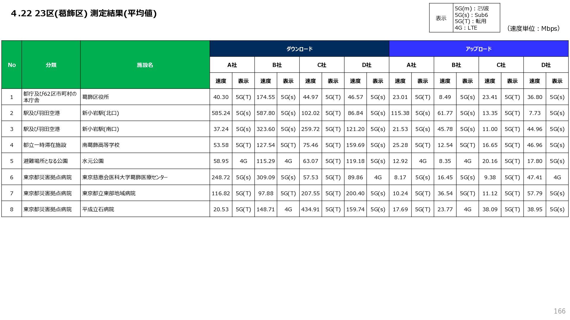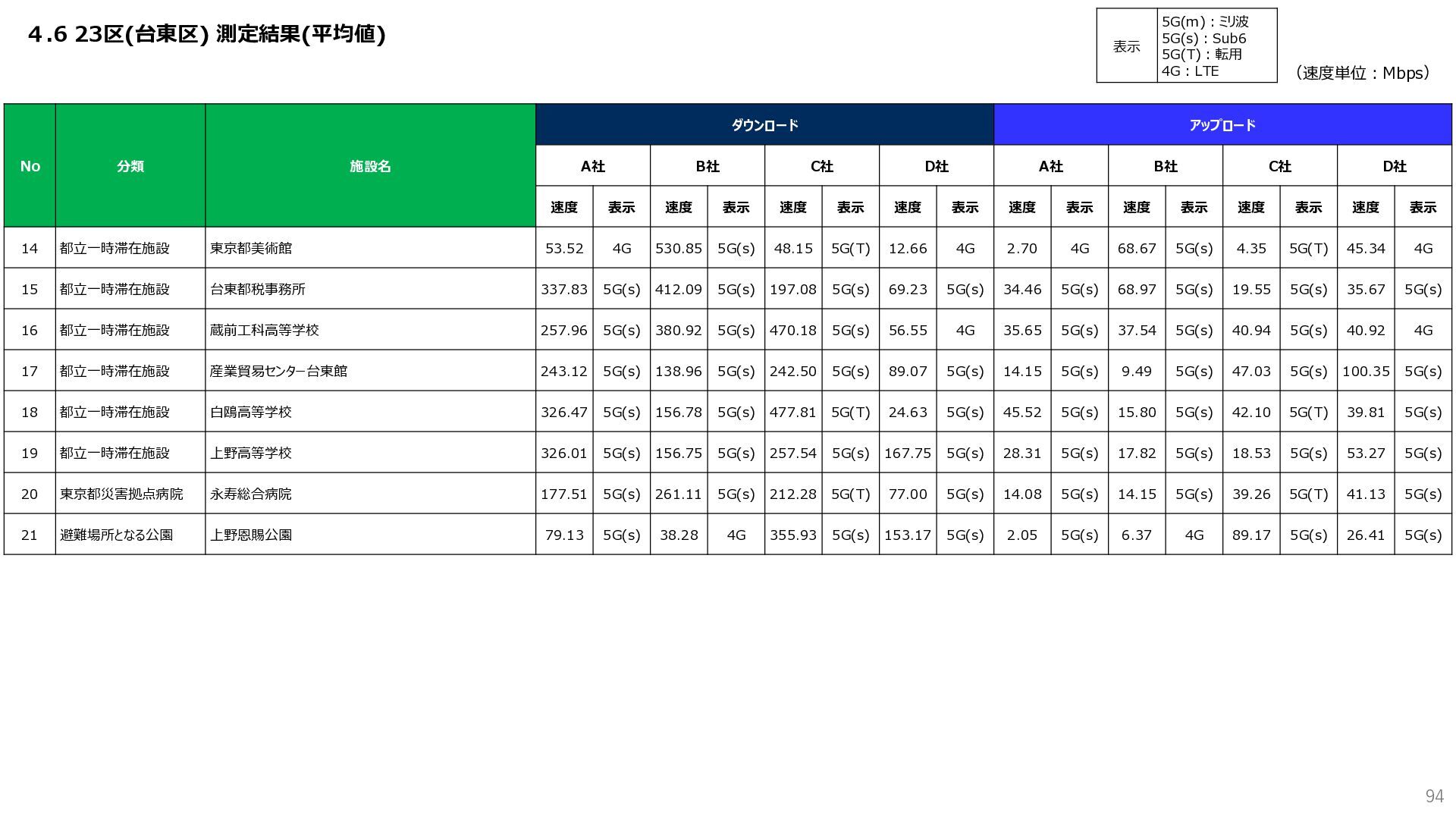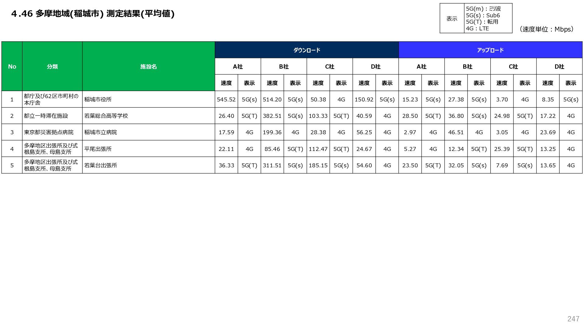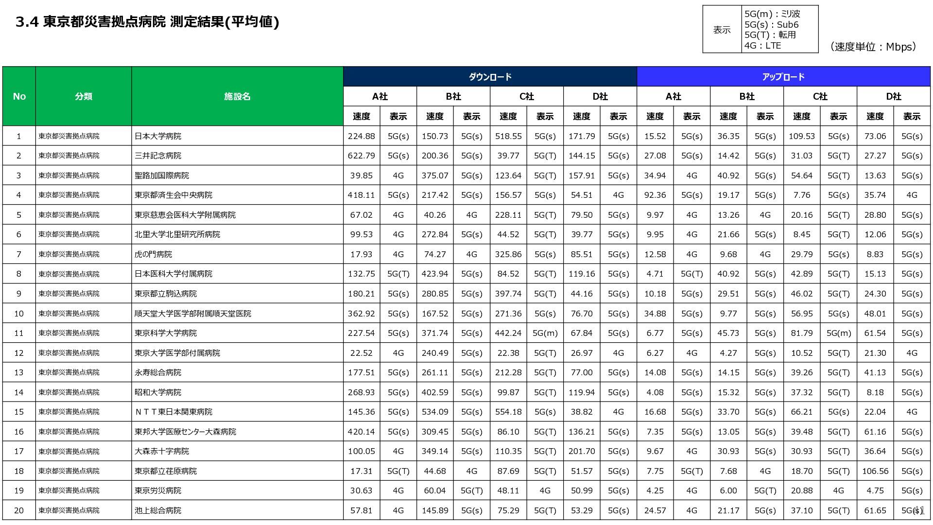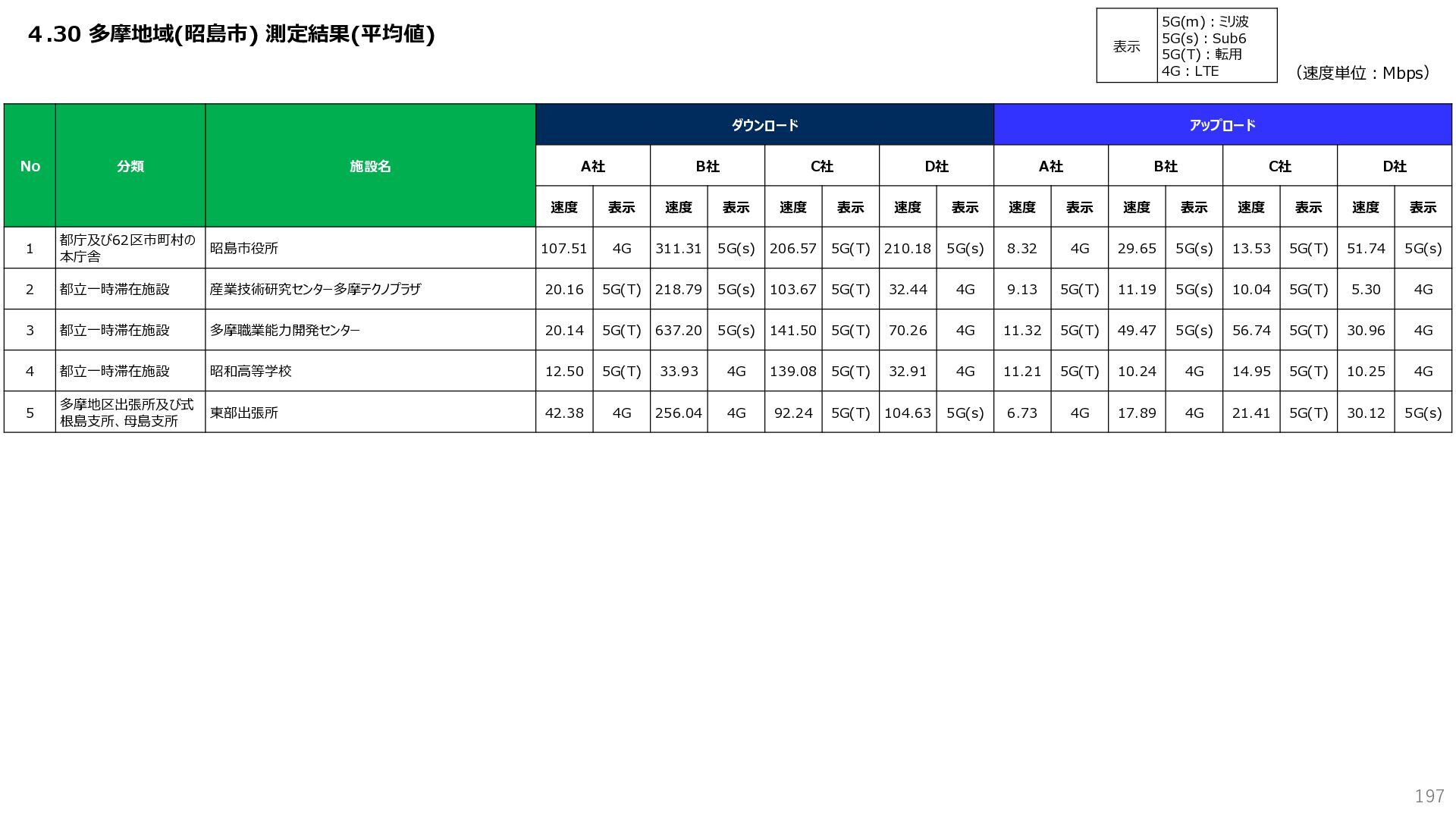 No 分類 施設名 ダウンロード アップロード A社 B社 C社 D社 A社 B社 C社 D社 速度 表示 速度 表示 速度 表示 速度 表示 速度 表示 速度 表示 速度 表示 速度 表示 181 駅及び羽田空港 赤坂見附駅(A赤坂3丁目) 244.11 5G(s) 312.06 5G(s) 553.68 5G(s) 280.58 5G(s) 33.51 5G(s) 27.42 5G(s) 141.19 5G(s) 34.18 5G(s) 182 駅及び羽田空港 赤坂見附駅(出口11) 274.09 5G(s) 142.07 5G(s) 449.05 5G(s) 51.54 5G(s) 8.60 5G(s) 56.96 5G(s) 133.23 5G(s) 6.18 5G(s) 183 駅及び羽田空港 中野坂上駅(出口1) 93.93 5G(T) 413.57 5G(T) 122.56 5G(T) 334.71 5G(m) 4.40 5G(T) 30.20 5G(T) 18.98 5G(T) 61.05 5G(m) 184 駅及び羽田空港 中野坂上駅(出口A2) 10.50 5G(s) 345.78 5G(s) 117.08 5G(T) 107.31 5G(s) 10.16 5G(s) 61.12 5G(s) 9.13 5G(T) 86.43 5G(s) 185 駅及び羽田空港 馬喰横山駅(出口1) 854.65 5G(s) 108.89 5G(s) 232.08 5G(m) 63.27 5G(s) 21.22 5G(s) 24.17 5G(s) 51.05 5G(m) 17.94 5G(s) 186 駅及び羽田空港 馬喰横山駅(出口A3) 206.87 5G(s) 968.72 5G(s) 10.64 5G(s) 35.08 5G(s) 15.76 5G(s) 143.06 5G(s) 68.96 5G(s) 34.89 5G(s) 187 駅及び羽田空港 大塚駅(北口) 43.53 5G(T) 847.90 5G(s) 186.89 5G(T) 60.82 5G(s) 26.25 5G(T) 150.29 5G(s) 35.04 5G(T) 70.17 5G(s) 188 駅及び羽田空港 大塚駅(南口) 15.47 5G(T) 1173.87 5G(s) 109.80 5G(T) 87.14 5G(s) 25.79 5G(T) 476.11 5G(s) 15.45 5G(T) 39.40 5G(s) 189 駅及び羽田空港 溜池山王駅(出口11) 92.40 5G(s) 403.44 5G(s) 472.42 5G(s) 55.40 5G(s) 13.09 5G(s) 53.36 5G(s) 90.48 5G(s) 4.36 5G(s) 190 駅及び羽田空港 溜池山王駅(出口5) 505.11 5G(s) 172.57 5G(s) 219.49 5G(s) 158.24 5G(s) 52.33 5G(s) 17.32 5G(s) 94.70 5G(s) 30.15 5G(s) 191 駅及び羽田空港 両国駅(東口) 302.46 5G(s) 125.33 5G(s) 69.06 5G(T) 57.41 5G(s) 8.65 5G(s) 29.32 5G(s) 34.20 5G(T) 17.95 5G(s) 192 駅及び羽田空港 両国駅(西口) 23.52 5G(s) 298.77 5G(s) 93.29 5G(T) 122.09 5G(s) 3.72 5G(s) 62.49 5G(s) 40.80 5G(T) 35.44 5G(s) 193 駅及び羽田空港 明治神宮前駅(4) 245.03 5G(s) 654.16 5G(m) 25.81 5G(T) 67.27 5G(s) 17.16 5G(s) 129.38 5G(m) 33.04 5G(T) 7.55 5G(s) 194 駅及び羽田空港 明治神宮前駅(1) 297.55 5G(s) 585.23 5G(m) 394.00 5G(s) 147.79 5G(s) 34.34 5G(s) 246.05 5G(m) 56.49 5G(s) 9.69 5G(s) 195 駅及び羽田空港 明大前駅(中央口) 244.72 5G(s) 41.49 4G 179.86 5G(T) 90.30 5G(s) 37.01 5G(s) 3.05 4G 37.59 5G(T) 41.14 5G(s) 196 駅及び羽田空港 明大前駅(フレンテ口) 77.75 5G(s) 359.64 5G(s) 140.30 5G(T) 83.94 5G(s) 42.60 5G(s) 60.21 5G(s) 30.28 5G(T) 45.83 5G(s) 197 駅及び羽田空港 東中野駅(西口) 39.24 5G(T) 233.33 5G(T) 193.21 5G(T) 70.45 5G(s) 29.19 5G(T) 60.83 5G(T) 13.88 5G(T) 55.17 5G(s) 198 駅及び羽田空港 東中野駅(東口) 46.14 5G(T) 119.89 4G 248.33 5G(s) 36.70 4G 34.95 5G(T) 14.32 4G 30.22 5G(s) 51.07 4G 199 駅及び羽田空港 虎ノ門駅(B2) 212.89 5G(s) 95.53 5G(s) 456.84 5G(s) 84.28 5G(s) 18.76 5G(s) 19.05 5G(s) 55.94 5G(s) 6.59 5G(s) 200 駅及び羽田空港 虎ノ門駅(5) 153.89 5G(s) 467.33 5G(s) 274.51 5G(T) 169.44 5G(s) 24.37 5G(s) 61.55 5G(s) 41.85 5G(T) 70.61 5G(s)