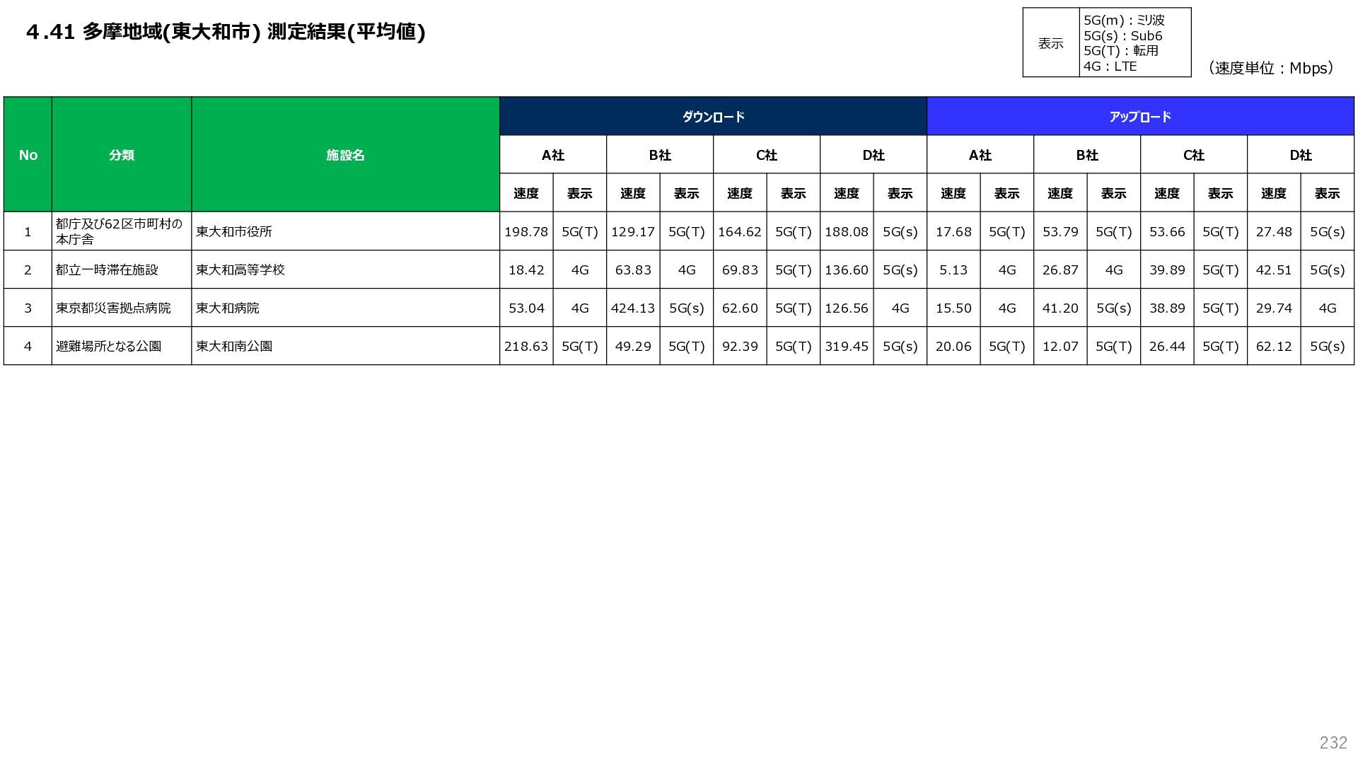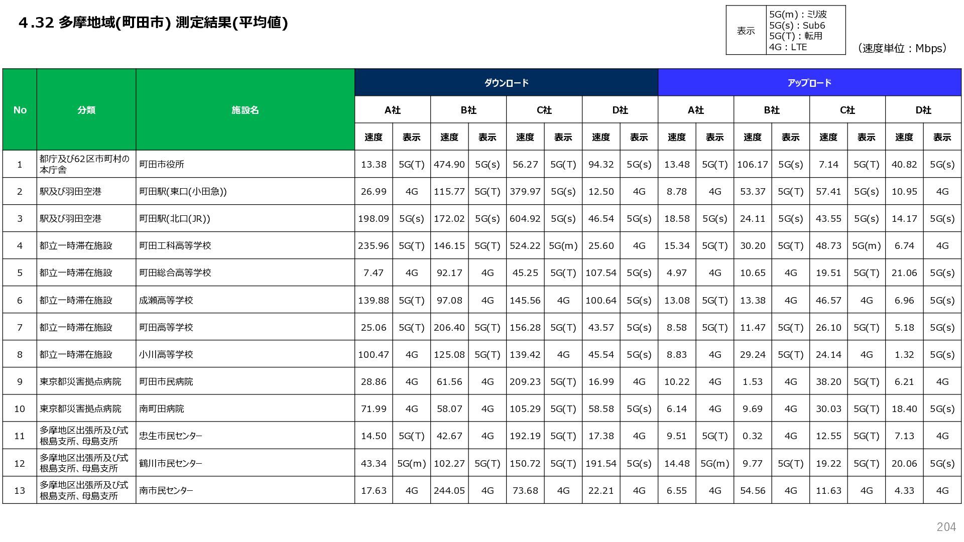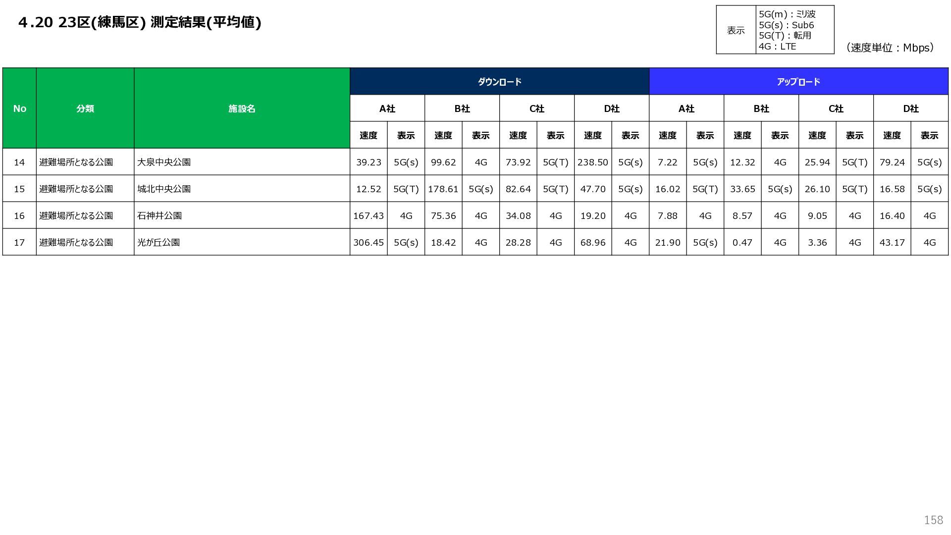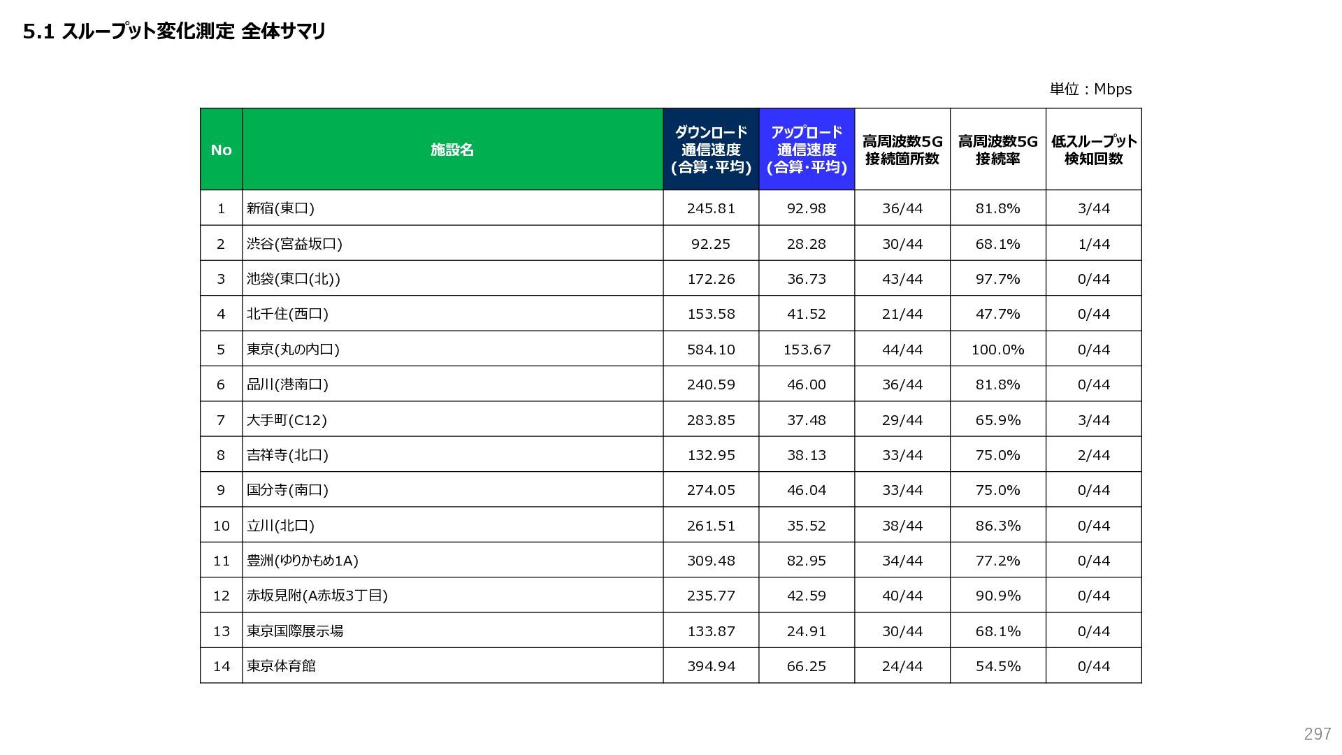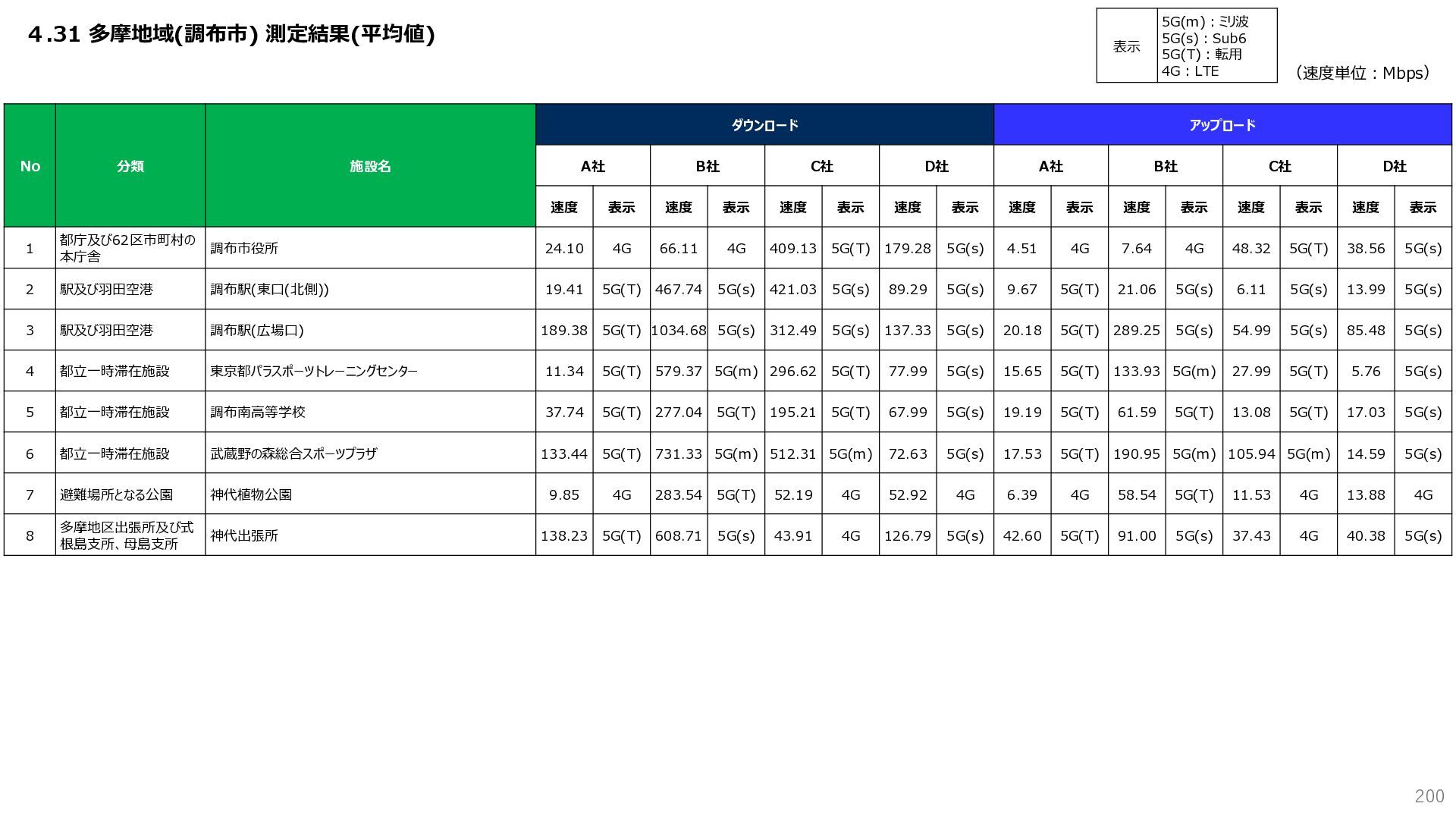 No 分類 施設名 ダウンロード アップロード A社 B社 C社 D社 A社 B社 C社 D社 速度 表示 速度 表示 速度 表示 速度 表示 速度 表示 速度 表示 速度 表示 速度 表示 181 駅及び羽田空港 赤坂見附駅(A赤坂3丁目) 244.11 5G(s) 312.06 5G(s) 553.68 5G(s) 280.58 5G(s) 33.51 5G(s) 27.42 5G(s) 141.19 5G(s) 34.18 5G(s) 182 駅及び羽田空港 赤坂見附駅(出口11) 274.09 5G(s) 142.07 5G(s) 449.05 5G(s) 51.54 5G(s) 8.60 5G(s) 56.96 5G(s) 133.23 5G(s) 6.18 5G(s) 183 駅及び羽田空港 中野坂上駅(出口1) 93.93 5G(T) 413.57 5G(T) 122.56 5G(T) 334.71 5G(m) 4.40 5G(T) 30.20 5G(T) 18.98 5G(T) 61.05 5G(m) 184 駅及び羽田空港 中野坂上駅(出口A2) 10.50 5G(s) 345.78 5G(s) 117.08 5G(T) 107.31 5G(s) 10.16 5G(s) 61.12 5G(s) 9.13 5G(T) 86.43 5G(s) 185 駅及び羽田空港 馬喰横山駅(出口1) 854.65 5G(s) 108.89 5G(s) 232.08 5G(m) 63.27 5G(s) 21.22 5G(s) 24.17 5G(s) 51.05 5G(m) 17.94 5G(s) 186 駅及び羽田空港 馬喰横山駅(出口A3) 206.87 5G(s) 968.72 5G(s) 10.64 5G(s) 35.08 5G(s) 15.76 5G(s) 143.06 5G(s) 68.96 5G(s) 34.89 5G(s) 187 駅及び羽田空港 大塚駅(北口) 43.53 5G(T) 847.90 5G(s) 186.89 5G(T) 60.82 5G(s) 26.25 5G(T) 150.29 5G(s) 35.04 5G(T) 70.17 5G(s) 188 駅及び羽田空港 大塚駅(南口) 15.47 5G(T) 1173.87 5G(s) 109.80 5G(T) 87.14 5G(s) 25.79 5G(T) 476.11 5G(s) 15.45 5G(T) 39.40 5G(s) 189 駅及び羽田空港 溜池山王駅(出口11) 92.40 5G(s) 403.44 5G(s) 472.42 5G(s) 55.40 5G(s) 13.09 5G(s) 53.36 5G(s) 90.48 5G(s) 4.36 5G(s) 190 駅及び羽田空港 溜池山王駅(出口5) 505.11 5G(s) 172.57 5G(s) 219.49 5G(s) 158.24 5G(s) 52.33 5G(s) 17.32 5G(s) 94.70 5G(s) 30.15 5G(s) 191 駅及び羽田空港 両国駅(東口) 302.46 5G(s) 125.33 5G(s) 69.06 5G(T) 57.41 5G(s) 8.65 5G(s) 29.32 5G(s) 34.20 5G(T) 17.95 5G(s) 192 駅及び羽田空港 両国駅(西口) 23.52 5G(s) 298.77 5G(s) 93.29 5G(T) 122.09 5G(s) 3.72 5G(s) 62.49 5G(s) 40.80 5G(T) 35.44 5G(s) 193 駅及び羽田空港 明治神宮前駅(4) 245.03 5G(s) 654.16 5G(m) 25.81 5G(T) 67.27 5G(s) 17.16 5G(s) 129.38 5G(m) 33.04 5G(T) 7.55 5G(s) 194 駅及び羽田空港 明治神宮前駅(1) 297.55 5G(s) 585.23 5G(m) 394.00 5G(s) 147.79 5G(s) 34.34 5G(s) 246.05 5G(m) 56.49 5G(s) 9.69 5G(s) 195 駅及び羽田空港 明大前駅(中央口) 244.72 5G(s) 41.49 4G 179.86 5G(T) 90.30 5G(s) 37.01 5G(s) 3.05 4G 37.59 5G(T) 41.14 5G(s) 196 駅及び羽田空港 明大前駅(フレンテ口) 77.75 5G(s) 359.64 5G(s) 140.30 5G(T) 83.94 5G(s) 42.60 5G(s) 60.21 5G(s) 30.28 5G(T) 45.83 5G(s) 197 駅及び羽田空港 東中野駅(西口) 39.24 5G(T) 233.33 5G(T) 193.21 5G(T) 70.45 5G(s) 29.19 5G(T) 60.83 5G(T) 13.88 5G(T) 55.17 5G(s) 198 駅及び羽田空港 東中野駅(東口) 46.14 5G(T) 119.89 4G 248.33 5G(s) 36.70 4G 34.95 5G(T) 14.32 4G 30.22 5G(s) 51.07 4G 199 駅及び羽田空港 虎ノ門駅(B2) 212.89 5G(s) 95.53 5G(s) 456.84 5G(s) 84.28 5G(s) 18.76 5G(s) 19.05 5G(s) 55.94 5G(s) 6.59 5G(s) 200 駅及び羽田空港 虎ノ門駅(5) 153.89 5G(s) 467.33 5G(s) 274.51 5G(T) 169.44 5G(s) 24.37 5G(s) 61.55 5G(s) 41.85 5G(T) 70.61 5G(s)