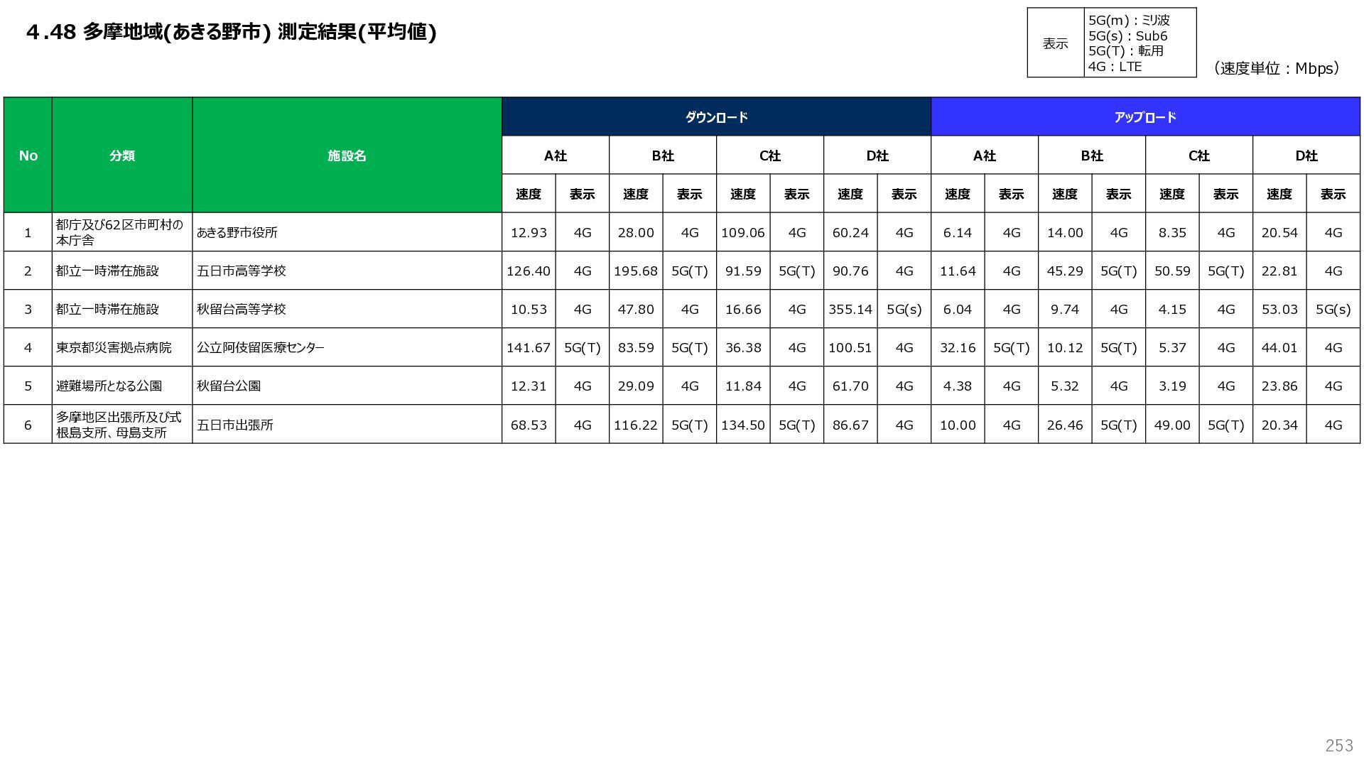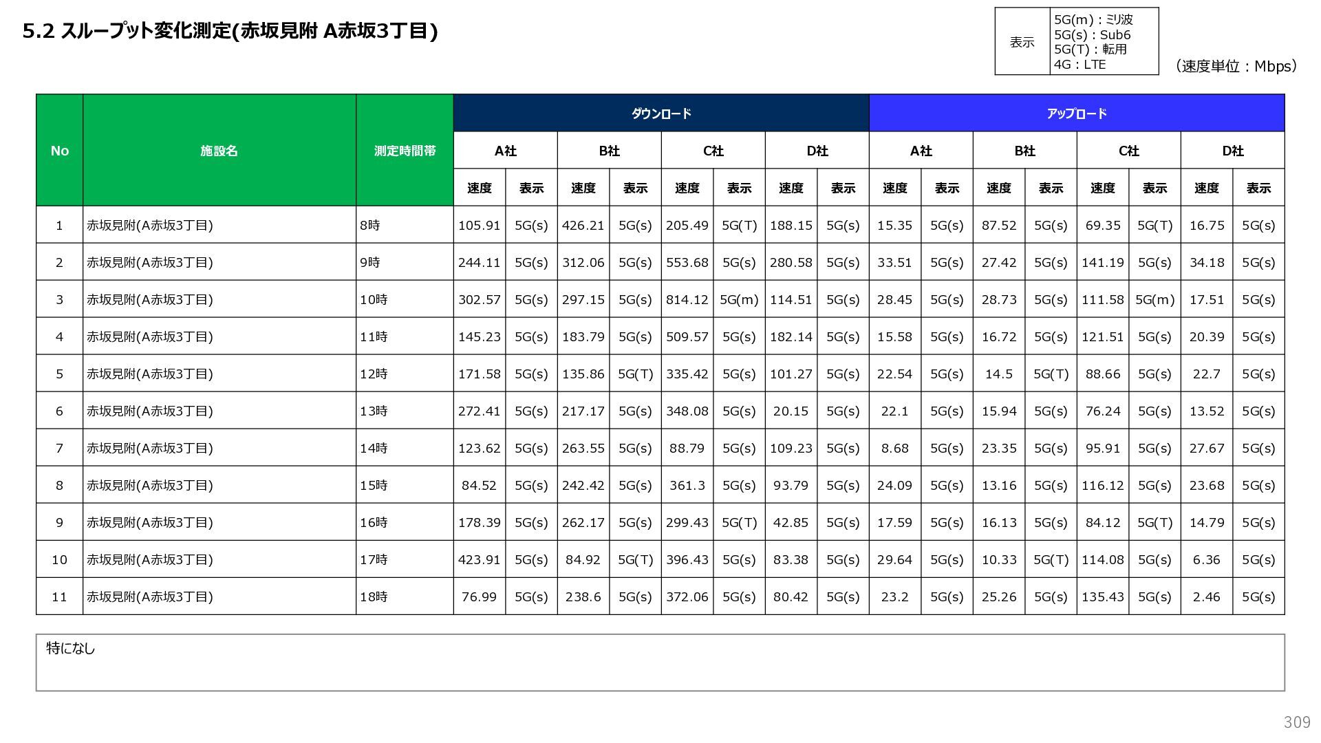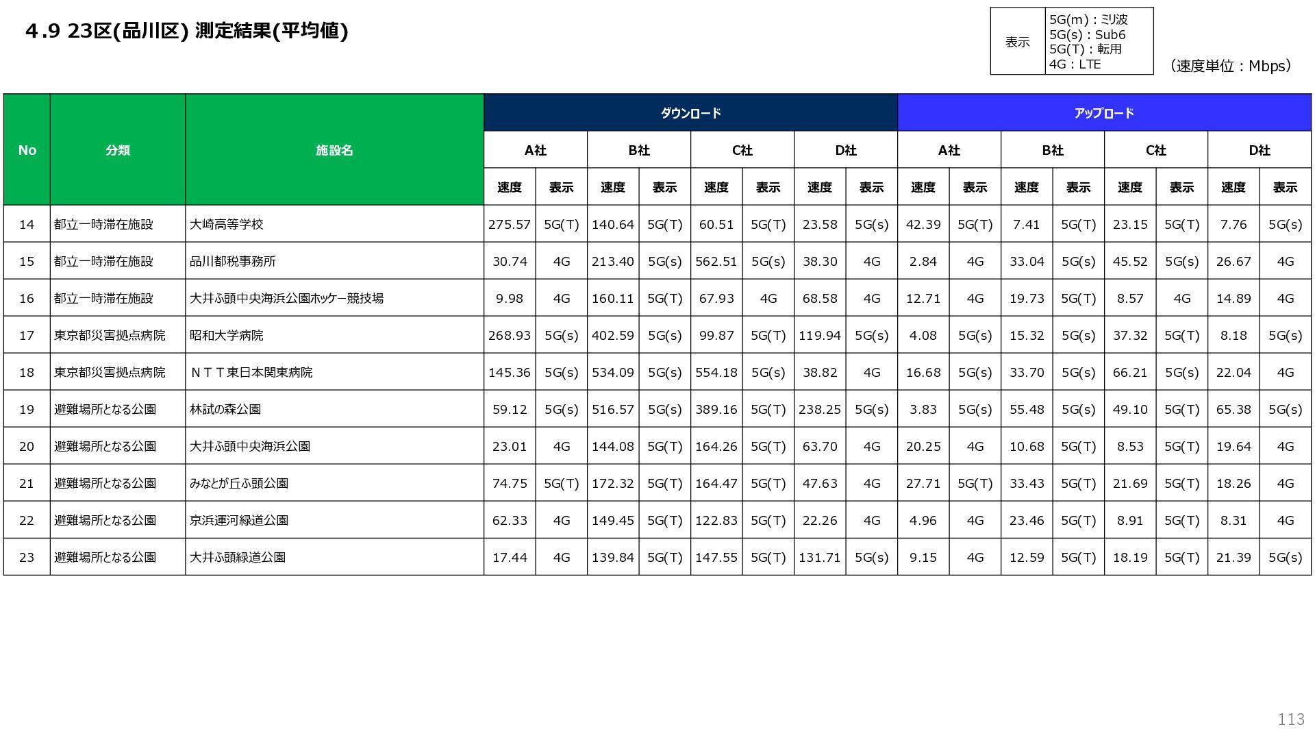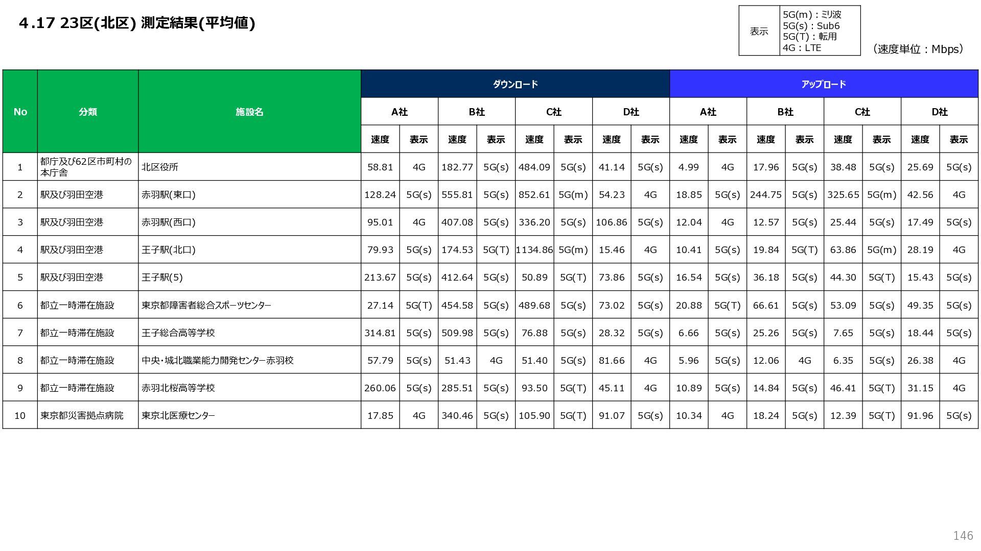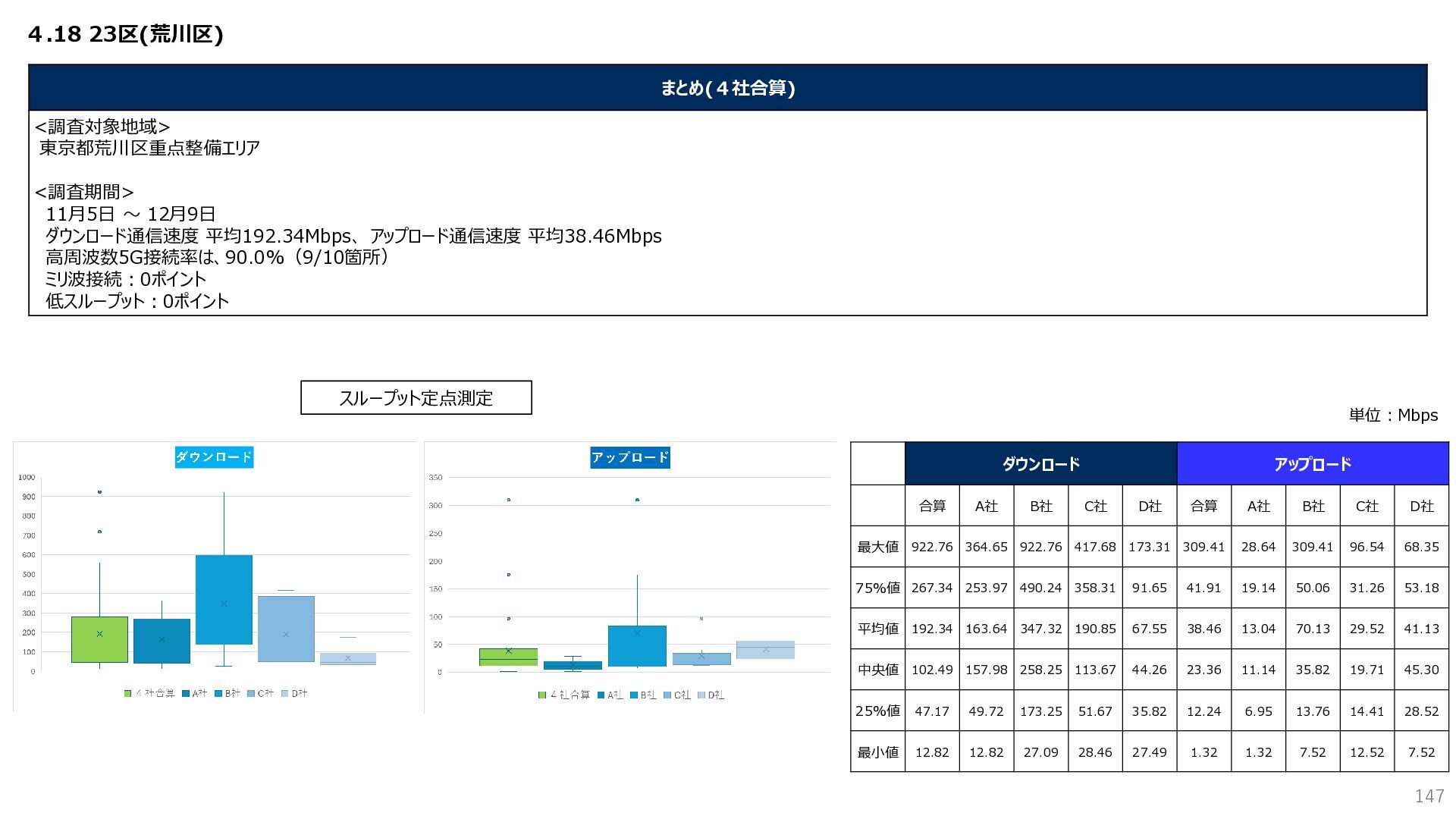 No 分類 施設名 ダウンロード アップロード A社 B社 C社 D社 A社 B社 C社 D社 速度 表示 速度 表示 速度 表示 速度 表示 速度 表示 速度 表示 速度 表示 速度 表示 181 駅及び羽田空港 赤坂見附駅(A赤坂3丁目) 244.11 5G(s) 312.06 5G(s) 553.68 5G(s) 280.58 5G(s) 33.51 5G(s) 27.42 5G(s) 141.19 5G(s) 34.18 5G(s) 182 駅及び羽田空港 赤坂見附駅(出口11) 274.09 5G(s) 142.07 5G(s) 449.05 5G(s) 51.54 5G(s) 8.60 5G(s) 56.96 5G(s) 133.23 5G(s) 6.18 5G(s) 183 駅及び羽田空港 中野坂上駅(出口1) 93.93 5G(T) 413.57 5G(T) 122.56 5G(T) 334.71 5G(m) 4.40 5G(T) 30.20 5G(T) 18.98 5G(T) 61.05 5G(m) 184 駅及び羽田空港 中野坂上駅(出口A2) 10.50 5G(s) 345.78 5G(s) 117.08 5G(T) 107.31 5G(s) 10.16 5G(s) 61.12 5G(s) 9.13 5G(T) 86.43 5G(s) 185 駅及び羽田空港 馬喰横山駅(出口1) 854.65 5G(s) 108.89 5G(s) 232.08 5G(m) 63.27 5G(s) 21.22 5G(s) 24.17 5G(s) 51.05 5G(m) 17.94 5G(s) 186 駅及び羽田空港 馬喰横山駅(出口A3) 206.87 5G(s) 968.72 5G(s) 10.64 5G(s) 35.08 5G(s) 15.76 5G(s) 143.06 5G(s) 68.96 5G(s) 34.89 5G(s) 187 駅及び羽田空港 大塚駅(北口) 43.53 5G(T) 847.90 5G(s) 186.89 5G(T) 60.82 5G(s) 26.25 5G(T) 150.29 5G(s) 35.04 5G(T) 70.17 5G(s) 188 駅及び羽田空港 大塚駅(南口) 15.47 5G(T) 1173.87 5G(s) 109.80 5G(T) 87.14 5G(s) 25.79 5G(T) 476.11 5G(s) 15.45 5G(T) 39.40 5G(s) 189 駅及び羽田空港 溜池山王駅(出口11) 92.40 5G(s) 403.44 5G(s) 472.42 5G(s) 55.40 5G(s) 13.09 5G(s) 53.36 5G(s) 90.48 5G(s) 4.36 5G(s) 190 駅及び羽田空港 溜池山王駅(出口5) 505.11 5G(s) 172.57 5G(s) 219.49 5G(s) 158.24 5G(s) 52.33 5G(s) 17.32 5G(s) 94.70 5G(s) 30.15 5G(s) 191 駅及び羽田空港 両国駅(東口) 302.46 5G(s) 125.33 5G(s) 69.06 5G(T) 57.41 5G(s) 8.65 5G(s) 29.32 5G(s) 34.20 5G(T) 17.95 5G(s) 192 駅及び羽田空港 両国駅(西口) 23.52 5G(s) 298.77 5G(s) 93.29 5G(T) 122.09 5G(s) 3.72 5G(s) 62.49 5G(s) 40.80 5G(T) 35.44 5G(s) 193 駅及び羽田空港 明治神宮前駅(4) 245.03 5G(s) 654.16 5G(m) 25.81 5G(T) 67.27 5G(s) 17.16 5G(s) 129.38 5G(m) 33.04 5G(T) 7.55 5G(s) 194 駅及び羽田空港 明治神宮前駅(1) 297.55 5G(s) 585.23 5G(m) 394.00 5G(s) 147.79 5G(s) 34.34 5G(s) 246.05 5G(m) 56.49 5G(s) 9.69 5G(s) 195 駅及び羽田空港 明大前駅(中央口) 244.72 5G(s) 41.49 4G 179.86 5G(T) 90.30 5G(s) 37.01 5G(s) 3.05 4G 37.59 5G(T) 41.14 5G(s) 196 駅及び羽田空港 明大前駅(フレンテ口) 77.75 5G(s) 359.64 5G(s) 140.30 5G(T) 83.94 5G(s) 42.60 5G(s) 60.21 5G(s) 30.28 5G(T) 45.83 5G(s) 197 駅及び羽田空港 東中野駅(西口) 39.24 5G(T) 233.33 5G(T) 193.21 5G(T) 70.45 5G(s) 29.19 5G(T) 60.83 5G(T) 13.88 5G(T) 55.17 5G(s) 198 駅及び羽田空港 東中野駅(東口) 46.14 5G(T) 119.89 4G 248.33 5G(s) 36.70 4G 34.95 5G(T) 14.32 4G 30.22 5G(s) 51.07 4G 199 駅及び羽田空港 虎ノ門駅(B2) 212.89 5G(s) 95.53 5G(s) 456.84 5G(s) 84.28 5G(s) 18.76 5G(s) 19.05 5G(s) 55.94 5G(s) 6.59 5G(s) 200 駅及び羽田空港 虎ノ門駅(5) 153.89 5G(s) 467.33 5G(s) 274.51 5G(T) 169.44 5G(s) 24.37 5G(s) 61.55 5G(s) 41.85 5G(T) 70.61 5G(s)