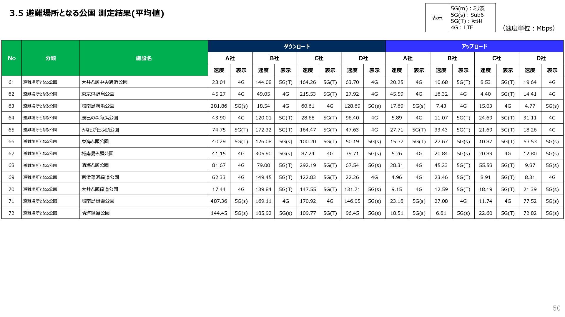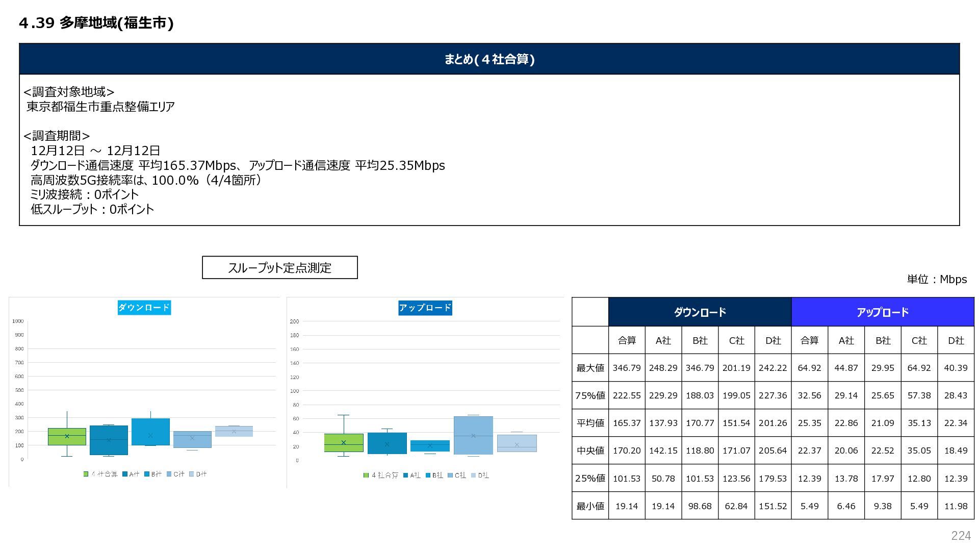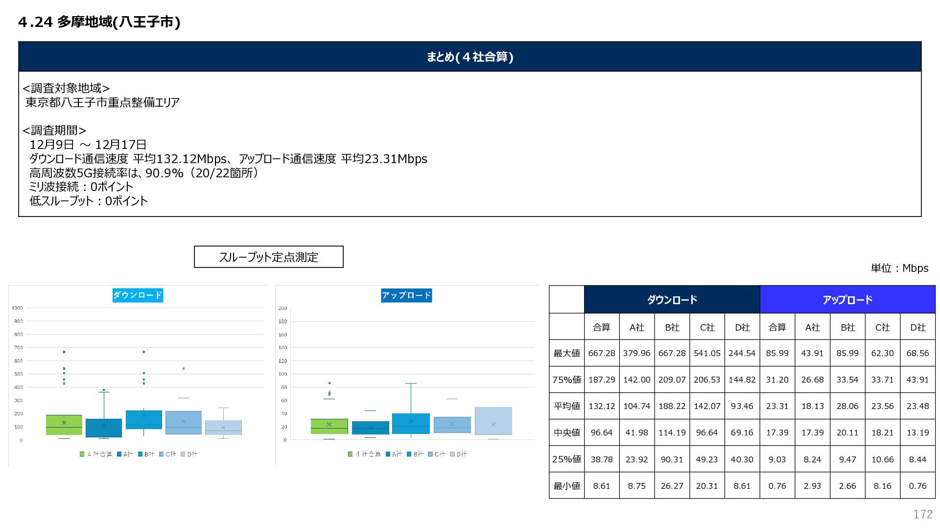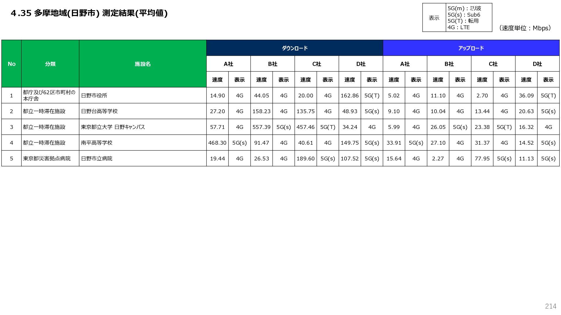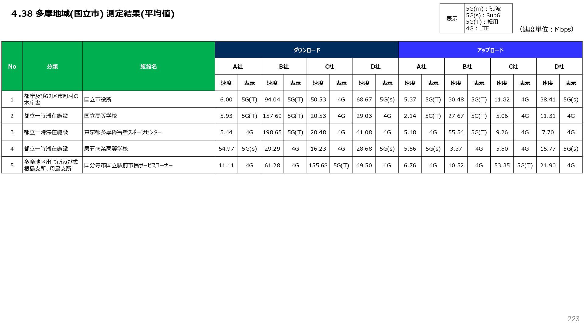 No 分類 施設名 ダウンロード アップロード A社 B社 C社 D社 A社 B社 C社 D社 速度 表示 速度 表示 速度 表示 速度 表示 速度 表示 速度 表示 速度 表示 速度 表示 181 駅及び羽田空港 赤坂見附駅(A赤坂3丁目) 244.11 5G(s) 312.06 5G(s) 553.68 5G(s) 280.58 5G(s) 33.51 5G(s) 27.42 5G(s) 141.19 5G(s) 34.18 5G(s) 182 駅及び羽田空港 赤坂見附駅(出口11) 274.09 5G(s) 142.07 5G(s) 449.05 5G(s) 51.54 5G(s) 8.60 5G(s) 56.96 5G(s) 133.23 5G(s) 6.18 5G(s) 183 駅及び羽田空港 中野坂上駅(出口1) 93.93 5G(T) 413.57 5G(T) 122.56 5G(T) 334.71 5G(m) 4.40 5G(T) 30.20 5G(T) 18.98 5G(T) 61.05 5G(m) 184 駅及び羽田空港 中野坂上駅(出口A2) 10.50 5G(s) 345.78 5G(s) 117.08 5G(T) 107.31 5G(s) 10.16 5G(s) 61.12 5G(s) 9.13 5G(T) 86.43 5G(s) 185 駅及び羽田空港 馬喰横山駅(出口1) 854.65 5G(s) 108.89 5G(s) 232.08 5G(m) 63.27 5G(s) 21.22 5G(s) 24.17 5G(s) 51.05 5G(m) 17.94 5G(s) 186 駅及び羽田空港 馬喰横山駅(出口A3) 206.87 5G(s) 968.72 5G(s) 10.64 5G(s) 35.08 5G(s) 15.76 5G(s) 143.06 5G(s) 68.96 5G(s) 34.89 5G(s) 187 駅及び羽田空港 大塚駅(北口) 43.53 5G(T) 847.90 5G(s) 186.89 5G(T) 60.82 5G(s) 26.25 5G(T) 150.29 5G(s) 35.04 5G(T) 70.17 5G(s) 188 駅及び羽田空港 大塚駅(南口) 15.47 5G(T) 1173.87 5G(s) 109.80 5G(T) 87.14 5G(s) 25.79 5G(T) 476.11 5G(s) 15.45 5G(T) 39.40 5G(s) 189 駅及び羽田空港 溜池山王駅(出口11) 92.40 5G(s) 403.44 5G(s) 472.42 5G(s) 55.40 5G(s) 13.09 5G(s) 53.36 5G(s) 90.48 5G(s) 4.36 5G(s) 190 駅及び羽田空港 溜池山王駅(出口5) 505.11 5G(s) 172.57 5G(s) 219.49 5G(s) 158.24 5G(s) 52.33 5G(s) 17.32 5G(s) 94.70 5G(s) 30.15 5G(s) 191 駅及び羽田空港 両国駅(東口) 302.46 5G(s) 125.33 5G(s) 69.06 5G(T) 57.41 5G(s) 8.65 5G(s) 29.32 5G(s) 34.20 5G(T) 17.95 5G(s) 192 駅及び羽田空港 両国駅(西口) 23.52 5G(s) 298.77 5G(s) 93.29 5G(T) 122.09 5G(s) 3.72 5G(s) 62.49 5G(s) 40.80 5G(T) 35.44 5G(s) 193 駅及び羽田空港 明治神宮前駅(4) 245.03 5G(s) 654.16 5G(m) 25.81 5G(T) 67.27 5G(s) 17.16 5G(s) 129.38 5G(m) 33.04 5G(T) 7.55 5G(s) 194 駅及び羽田空港 明治神宮前駅(1) 297.55 5G(s) 585.23 5G(m) 394.00 5G(s) 147.79 5G(s) 34.34 5G(s) 246.05 5G(m) 56.49 5G(s) 9.69 5G(s) 195 駅及び羽田空港 明大前駅(中央口) 244.72 5G(s) 41.49 4G 179.86 5G(T) 90.30 5G(s) 37.01 5G(s) 3.05 4G 37.59 5G(T) 41.14 5G(s) 196 駅及び羽田空港 明大前駅(フレンテ口) 77.75 5G(s) 359.64 5G(s) 140.30 5G(T) 83.94 5G(s) 42.60 5G(s) 60.21 5G(s) 30.28 5G(T) 45.83 5G(s) 197 駅及び羽田空港 東中野駅(西口) 39.24 5G(T) 233.33 5G(T) 193.21 5G(T) 70.45 5G(s) 29.19 5G(T) 60.83 5G(T) 13.88 5G(T) 55.17 5G(s) 198 駅及び羽田空港 東中野駅(東口) 46.14 5G(T) 119.89 4G 248.33 5G(s) 36.70 4G 34.95 5G(T) 14.32 4G 30.22 5G(s) 51.07 4G 199 駅及び羽田空港 虎ノ門駅(B2) 212.89 5G(s) 95.53 5G(s) 456.84 5G(s) 84.28 5G(s) 18.76 5G(s) 19.05 5G(s) 55.94 5G(s) 6.59 5G(s) 200 駅及び羽田空港 虎ノ門駅(5) 153.89 5G(s) 467.33 5G(s) 274.51 5G(T) 169.44 5G(s) 24.37 5G(s) 61.55 5G(s) 41.85 5G(T) 70.61 5G(s)