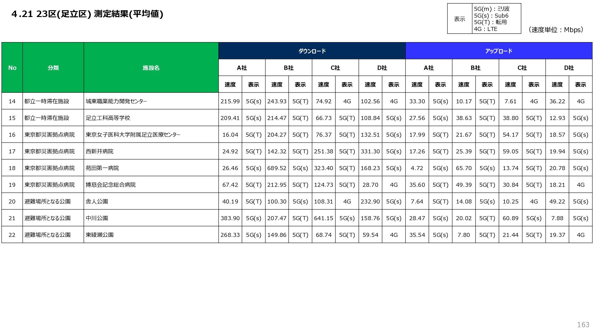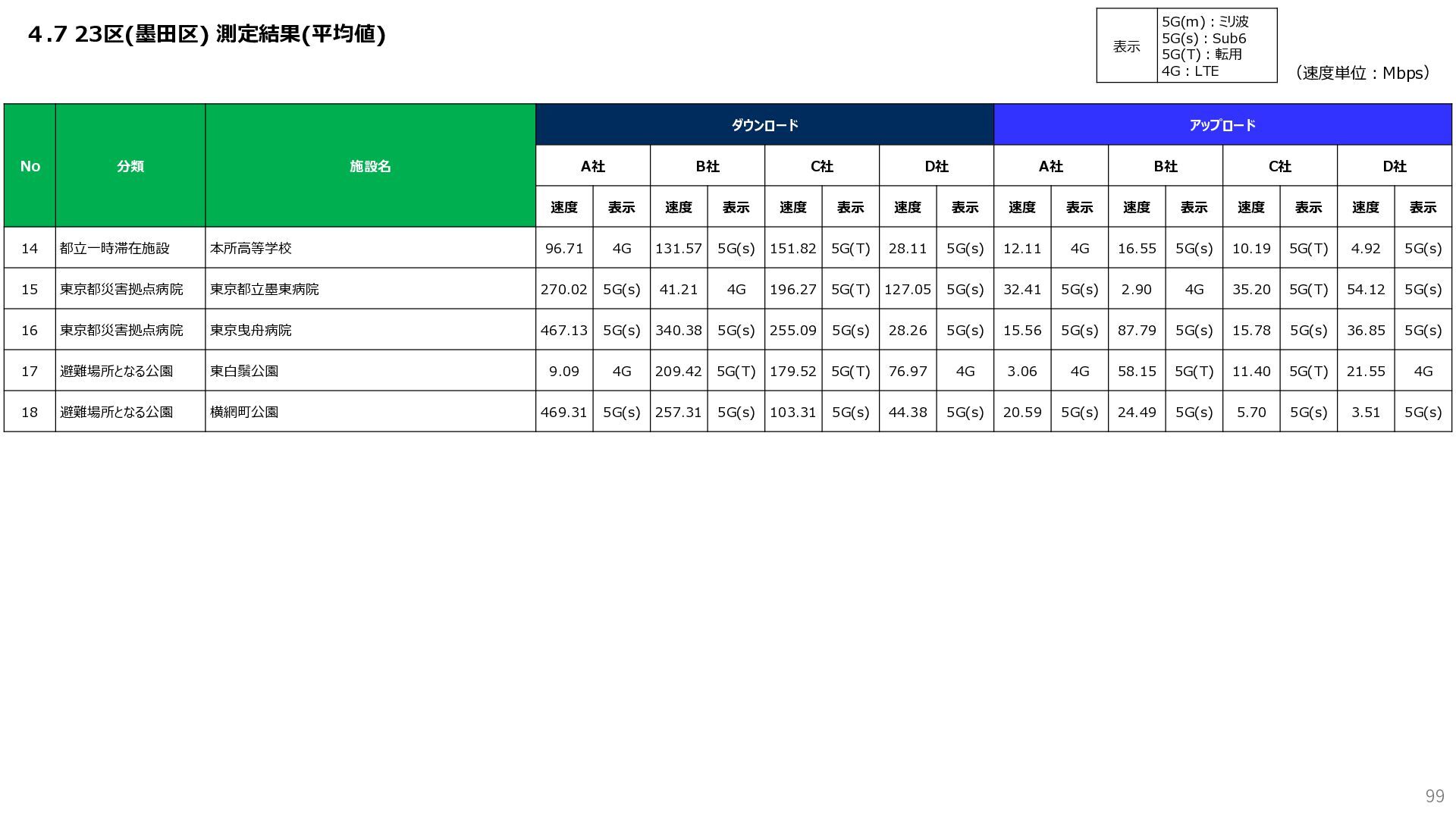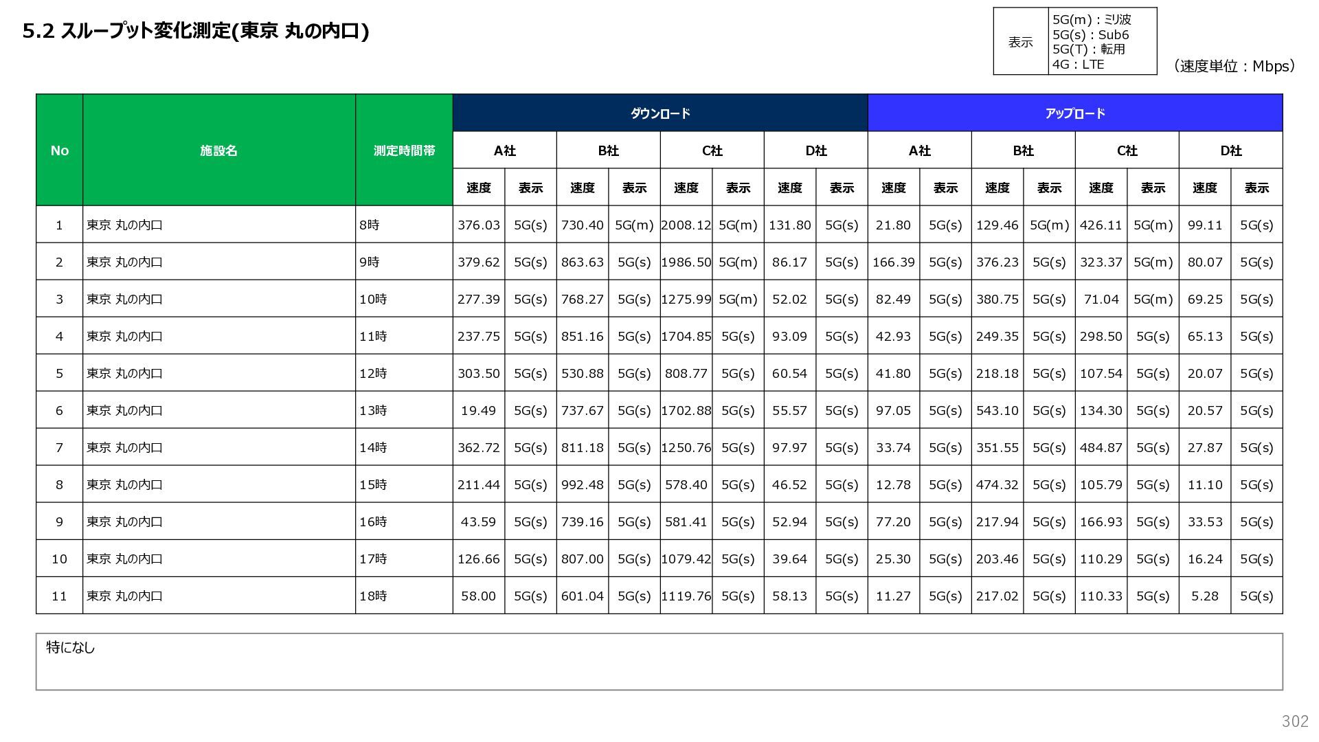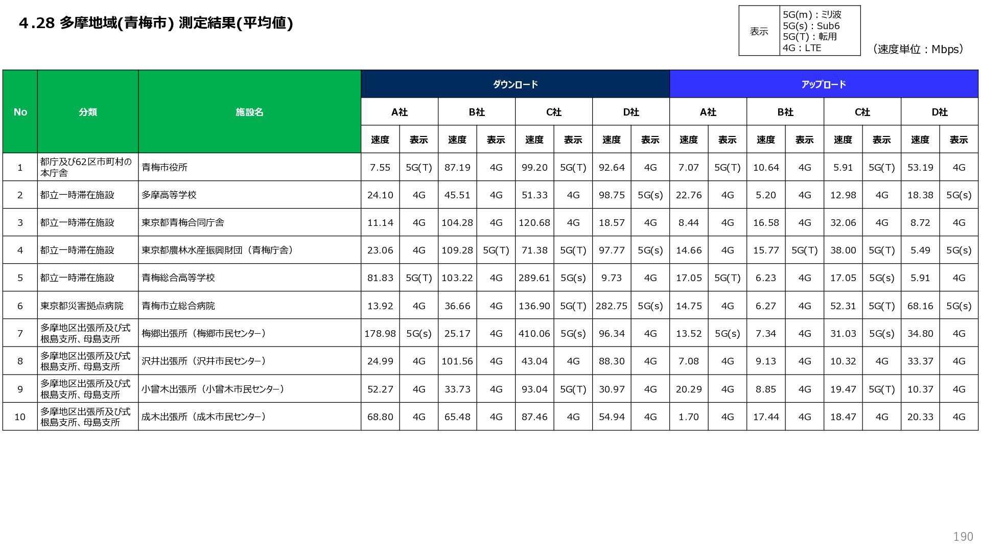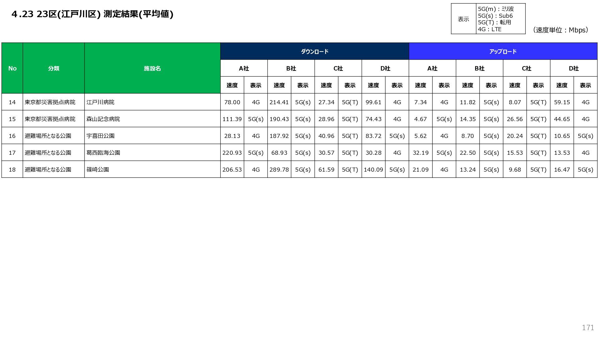 No 分類 施設名 ダウンロード アップロード A社 B社 C社 D社 A社 B社 C社 D社 速度 表示 速度 表示 速度 表示 速度 表示 速度 表示 速度 表示 速度 表示 速度 表示 181 駅及び羽田空港 赤坂見附駅(A赤坂3丁目) 244.11 5G(s) 312.06 5G(s) 553.68 5G(s) 280.58 5G(s) 33.51 5G(s) 27.42 5G(s) 141.19 5G(s) 34.18 5G(s) 182 駅及び羽田空港 赤坂見附駅(出口11) 274.09 5G(s) 142.07 5G(s) 449.05 5G(s) 51.54 5G(s) 8.60 5G(s) 56.96 5G(s) 133.23 5G(s) 6.18 5G(s) 183 駅及び羽田空港 中野坂上駅(出口1) 93.93 5G(T) 413.57 5G(T) 122.56 5G(T) 334.71 5G(m) 4.40 5G(T) 30.20 5G(T) 18.98 5G(T) 61.05 5G(m) 184 駅及び羽田空港 中野坂上駅(出口A2) 10.50 5G(s) 345.78 5G(s) 117.08 5G(T) 107.31 5G(s) 10.16 5G(s) 61.12 5G(s) 9.13 5G(T) 86.43 5G(s) 185 駅及び羽田空港 馬喰横山駅(出口1) 854.65 5G(s) 108.89 5G(s) 232.08 5G(m) 63.27 5G(s) 21.22 5G(s) 24.17 5G(s) 51.05 5G(m) 17.94 5G(s) 186 駅及び羽田空港 馬喰横山駅(出口A3) 206.87 5G(s) 968.72 5G(s) 10.64 5G(s) 35.08 5G(s) 15.76 5G(s) 143.06 5G(s) 68.96 5G(s) 34.89 5G(s) 187 駅及び羽田空港 大塚駅(北口) 43.53 5G(T) 847.90 5G(s) 186.89 5G(T) 60.82 5G(s) 26.25 5G(T) 150.29 5G(s) 35.04 5G(T) 70.17 5G(s) 188 駅及び羽田空港 大塚駅(南口) 15.47 5G(T) 1173.87 5G(s) 109.80 5G(T) 87.14 5G(s) 25.79 5G(T) 476.11 5G(s) 15.45 5G(T) 39.40 5G(s) 189 駅及び羽田空港 溜池山王駅(出口11) 92.40 5G(s) 403.44 5G(s) 472.42 5G(s) 55.40 5G(s) 13.09 5G(s) 53.36 5G(s) 90.48 5G(s) 4.36 5G(s) 190 駅及び羽田空港 溜池山王駅(出口5) 505.11 5G(s) 172.57 5G(s) 219.49 5G(s) 158.24 5G(s) 52.33 5G(s) 17.32 5G(s) 94.70 5G(s) 30.15 5G(s) 191 駅及び羽田空港 両国駅(東口) 302.46 5G(s) 125.33 5G(s) 69.06 5G(T) 57.41 5G(s) 8.65 5G(s) 29.32 5G(s) 34.20 5G(T) 17.95 5G(s) 192 駅及び羽田空港 両国駅(西口) 23.52 5G(s) 298.77 5G(s) 93.29 5G(T) 122.09 5G(s) 3.72 5G(s) 62.49 5G(s) 40.80 5G(T) 35.44 5G(s) 193 駅及び羽田空港 明治神宮前駅(4) 245.03 5G(s) 654.16 5G(m) 25.81 5G(T) 67.27 5G(s) 17.16 5G(s) 129.38 5G(m) 33.04 5G(T) 7.55 5G(s) 194 駅及び羽田空港 明治神宮前駅(1) 297.55 5G(s) 585.23 5G(m) 394.00 5G(s) 147.79 5G(s) 34.34 5G(s) 246.05 5G(m) 56.49 5G(s) 9.69 5G(s) 195 駅及び羽田空港 明大前駅(中央口) 244.72 5G(s) 41.49 4G 179.86 5G(T) 90.30 5G(s) 37.01 5G(s) 3.05 4G 37.59 5G(T) 41.14 5G(s) 196 駅及び羽田空港 明大前駅(フレンテ口) 77.75 5G(s) 359.64 5G(s) 140.30 5G(T) 83.94 5G(s) 42.60 5G(s) 60.21 5G(s) 30.28 5G(T) 45.83 5G(s) 197 駅及び羽田空港 東中野駅(西口) 39.24 5G(T) 233.33 5G(T) 193.21 5G(T) 70.45 5G(s) 29.19 5G(T) 60.83 5G(T) 13.88 5G(T) 55.17 5G(s) 198 駅及び羽田空港 東中野駅(東口) 46.14 5G(T) 119.89 4G 248.33 5G(s) 36.70 4G 34.95 5G(T) 14.32 4G 30.22 5G(s) 51.07 4G 199 駅及び羽田空港 虎ノ門駅(B2) 212.89 5G(s) 95.53 5G(s) 456.84 5G(s) 84.28 5G(s) 18.76 5G(s) 19.05 5G(s) 55.94 5G(s) 6.59 5G(s) 200 駅及び羽田空港 虎ノ門駅(5) 153.89 5G(s) 467.33 5G(s) 274.51 5G(T) 169.44 5G(s) 24.37 5G(s) 61.55 5G(s) 41.85 5G(T) 70.61 5G(s)