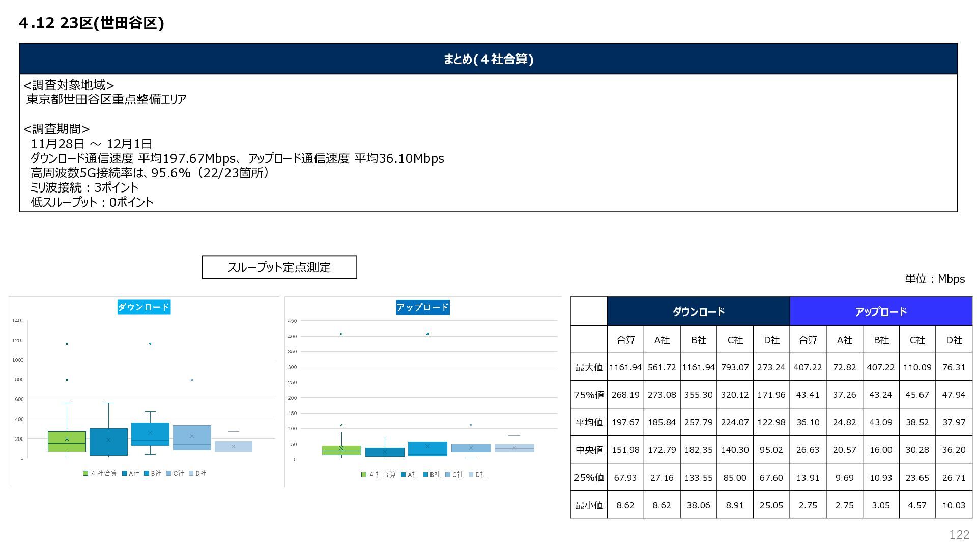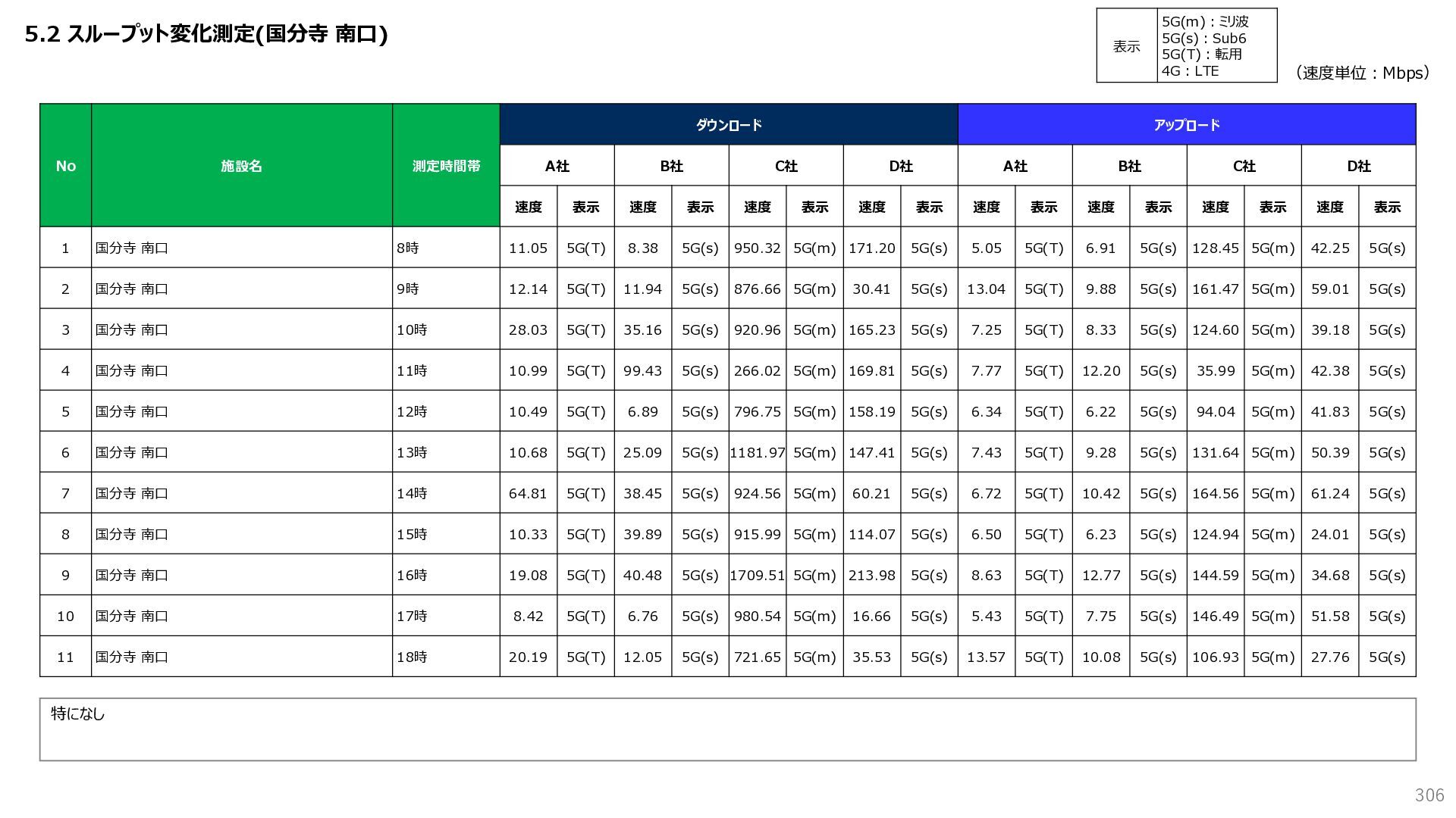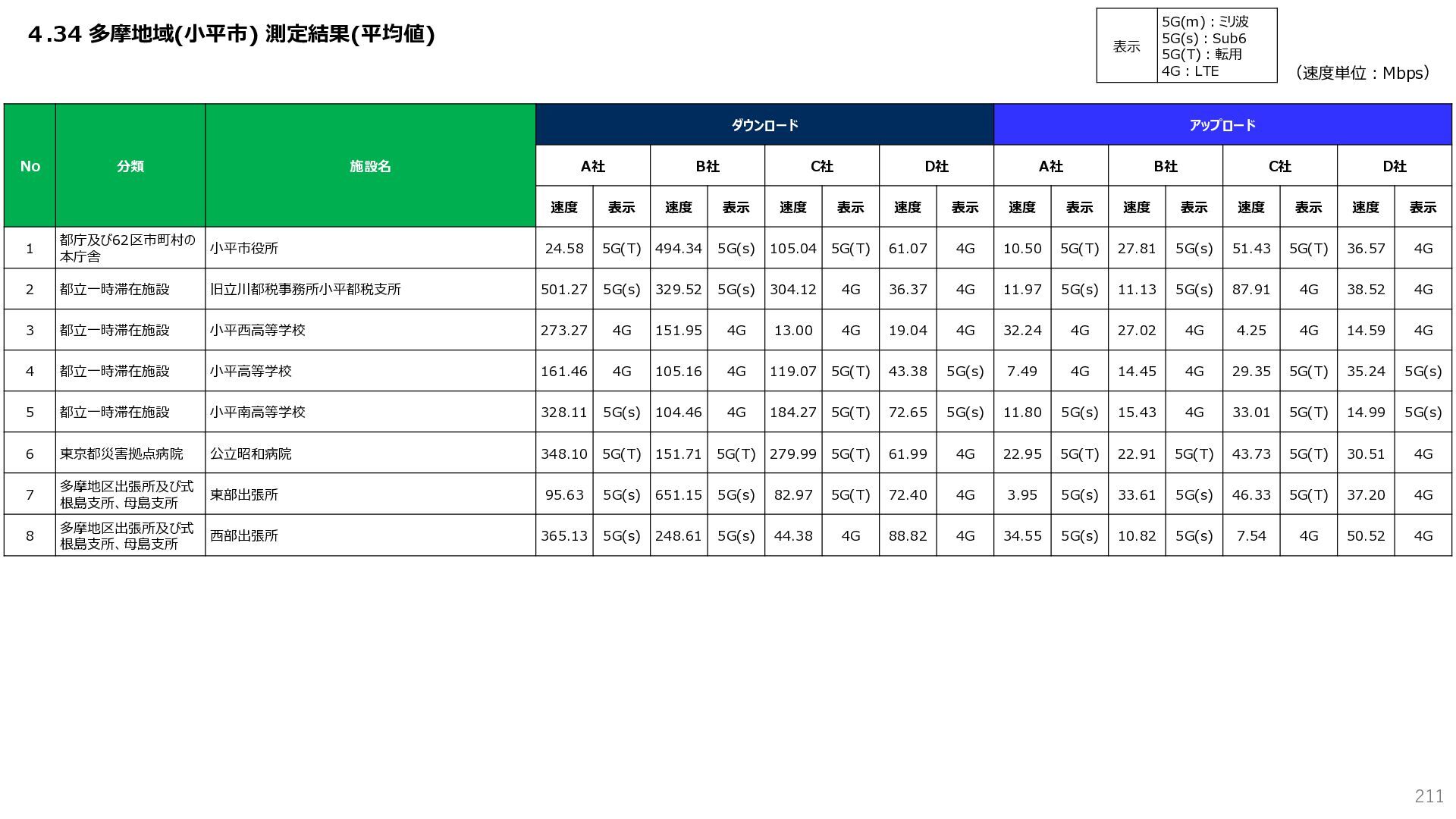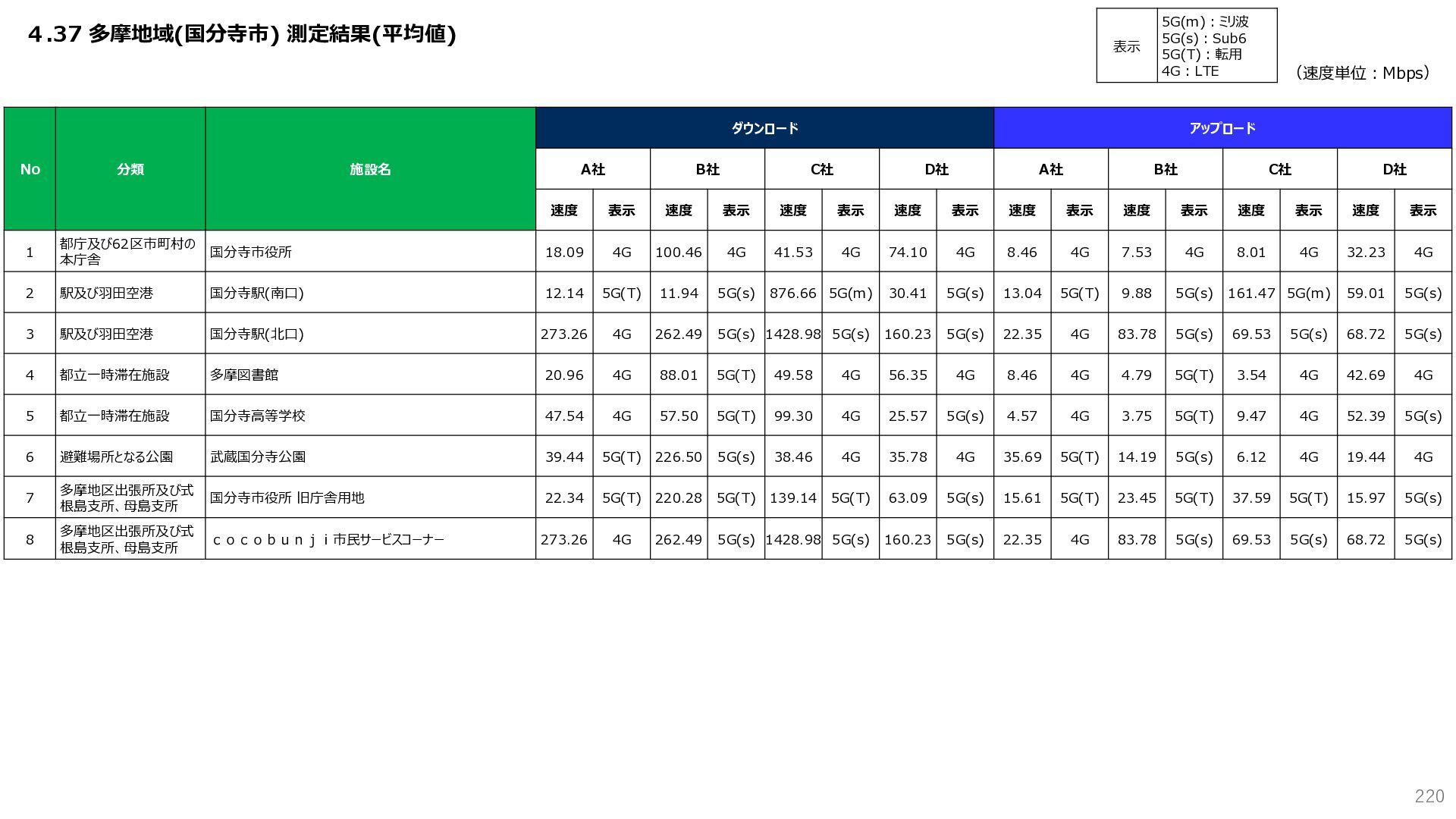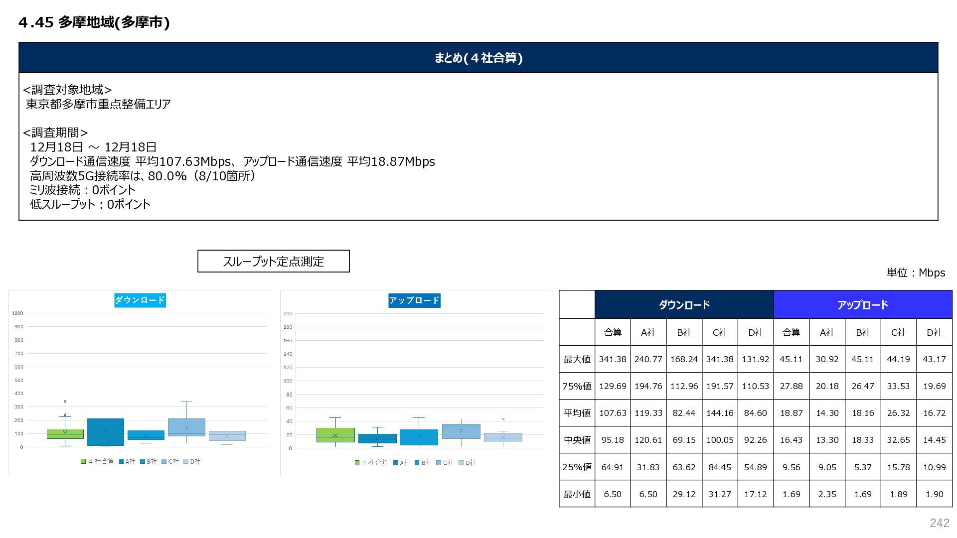 No 分類 施設名 ダウンロード アップロード A社 B社 C社 D社 A社 B社 C社 D社 速度 表示 速度 表示 速度 表示 速度 表示 速度 表示 速度 表示 速度 表示 速度 表示 181 駅及び羽田空港 赤坂見附駅(A赤坂3丁目) 244.11 5G(s) 312.06 5G(s) 553.68 5G(s) 280.58 5G(s) 33.51 5G(s) 27.42 5G(s) 141.19 5G(s) 34.18 5G(s) 182 駅及び羽田空港 赤坂見附駅(出口11) 274.09 5G(s) 142.07 5G(s) 449.05 5G(s) 51.54 5G(s) 8.60 5G(s) 56.96 5G(s) 133.23 5G(s) 6.18 5G(s) 183 駅及び羽田空港 中野坂上駅(出口1) 93.93 5G(T) 413.57 5G(T) 122.56 5G(T) 334.71 5G(m) 4.40 5G(T) 30.20 5G(T) 18.98 5G(T) 61.05 5G(m) 184 駅及び羽田空港 中野坂上駅(出口A2) 10.50 5G(s) 345.78 5G(s) 117.08 5G(T) 107.31 5G(s) 10.16 5G(s) 61.12 5G(s) 9.13 5G(T) 86.43 5G(s) 185 駅及び羽田空港 馬喰横山駅(出口1) 854.65 5G(s) 108.89 5G(s) 232.08 5G(m) 63.27 5G(s) 21.22 5G(s) 24.17 5G(s) 51.05 5G(m) 17.94 5G(s) 186 駅及び羽田空港 馬喰横山駅(出口A3) 206.87 5G(s) 968.72 5G(s) 10.64 5G(s) 35.08 5G(s) 15.76 5G(s) 143.06 5G(s) 68.96 5G(s) 34.89 5G(s) 187 駅及び羽田空港 大塚駅(北口) 43.53 5G(T) 847.90 5G(s) 186.89 5G(T) 60.82 5G(s) 26.25 5G(T) 150.29 5G(s) 35.04 5G(T) 70.17 5G(s) 188 駅及び羽田空港 大塚駅(南口) 15.47 5G(T) 1173.87 5G(s) 109.80 5G(T) 87.14 5G(s) 25.79 5G(T) 476.11 5G(s) 15.45 5G(T) 39.40 5G(s) 189 駅及び羽田空港 溜池山王駅(出口11) 92.40 5G(s) 403.44 5G(s) 472.42 5G(s) 55.40 5G(s) 13.09 5G(s) 53.36 5G(s) 90.48 5G(s) 4.36 5G(s) 190 駅及び羽田空港 溜池山王駅(出口5) 505.11 5G(s) 172.57 5G(s) 219.49 5G(s) 158.24 5G(s) 52.33 5G(s) 17.32 5G(s) 94.70 5G(s) 30.15 5G(s) 191 駅及び羽田空港 両国駅(東口) 302.46 5G(s) 125.33 5G(s) 69.06 5G(T) 57.41 5G(s) 8.65 5G(s) 29.32 5G(s) 34.20 5G(T) 17.95 5G(s) 192 駅及び羽田空港 両国駅(西口) 23.52 5G(s) 298.77 5G(s) 93.29 5G(T) 122.09 5G(s) 3.72 5G(s) 62.49 5G(s) 40.80 5G(T) 35.44 5G(s) 193 駅及び羽田空港 明治神宮前駅(4) 245.03 5G(s) 654.16 5G(m) 25.81 5G(T) 67.27 5G(s) 17.16 5G(s) 129.38 5G(m) 33.04 5G(T) 7.55 5G(s) 194 駅及び羽田空港 明治神宮前駅(1) 297.55 5G(s) 585.23 5G(m) 394.00 5G(s) 147.79 5G(s) 34.34 5G(s) 246.05 5G(m) 56.49 5G(s) 9.69 5G(s) 195 駅及び羽田空港 明大前駅(中央口) 244.72 5G(s) 41.49 4G 179.86 5G(T) 90.30 5G(s) 37.01 5G(s) 3.05 4G 37.59 5G(T) 41.14 5G(s) 196 駅及び羽田空港 明大前駅(フレンテ口) 77.75 5G(s) 359.64 5G(s) 140.30 5G(T) 83.94 5G(s) 42.60 5G(s) 60.21 5G(s) 30.28 5G(T) 45.83 5G(s) 197 駅及び羽田空港 東中野駅(西口) 39.24 5G(T) 233.33 5G(T) 193.21 5G(T) 70.45 5G(s) 29.19 5G(T) 60.83 5G(T) 13.88 5G(T) 55.17 5G(s) 198 駅及び羽田空港 東中野駅(東口) 46.14 5G(T) 119.89 4G 248.33 5G(s) 36.70 4G 34.95 5G(T) 14.32 4G 30.22 5G(s) 51.07 4G 199 駅及び羽田空港 虎ノ門駅(B2) 212.89 5G(s) 95.53 5G(s) 456.84 5G(s) 84.28 5G(s) 18.76 5G(s) 19.05 5G(s) 55.94 5G(s) 6.59 5G(s) 200 駅及び羽田空港 虎ノ門駅(5) 153.89 5G(s) 467.33 5G(s) 274.51 5G(T) 169.44 5G(s) 24.37 5G(s) 61.55 5G(s) 41.85 5G(T) 70.61 5G(s)