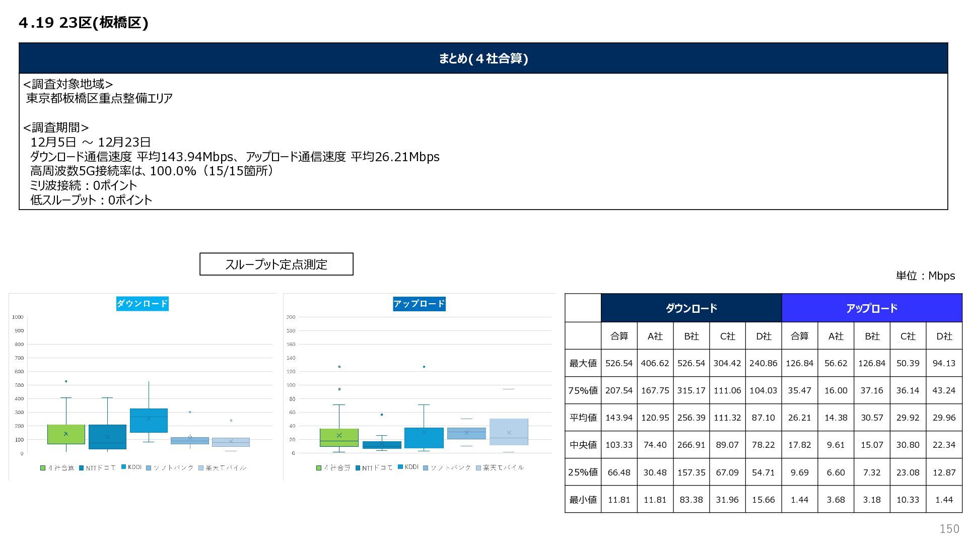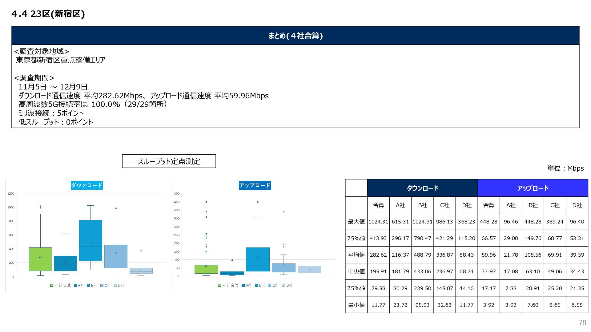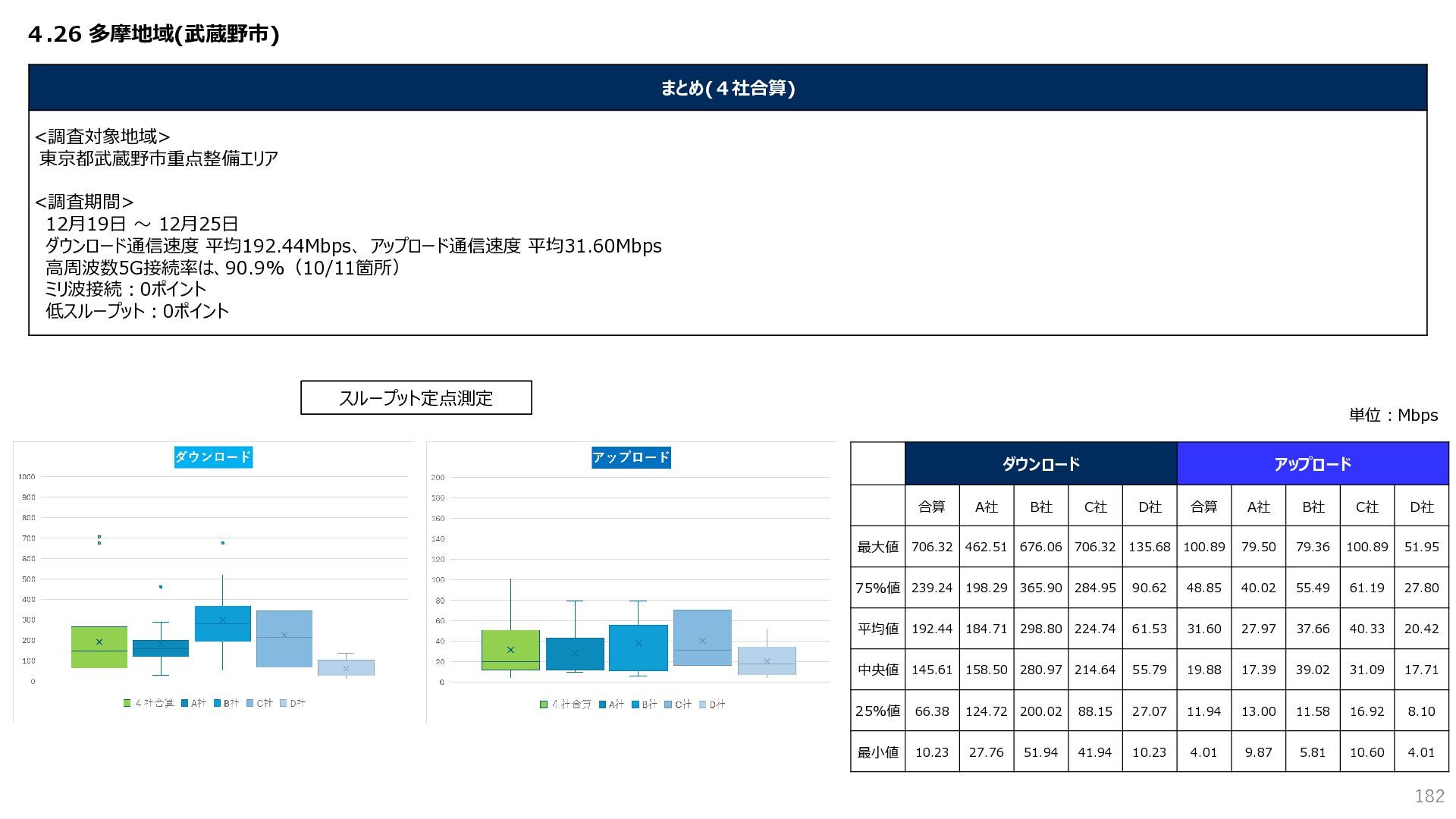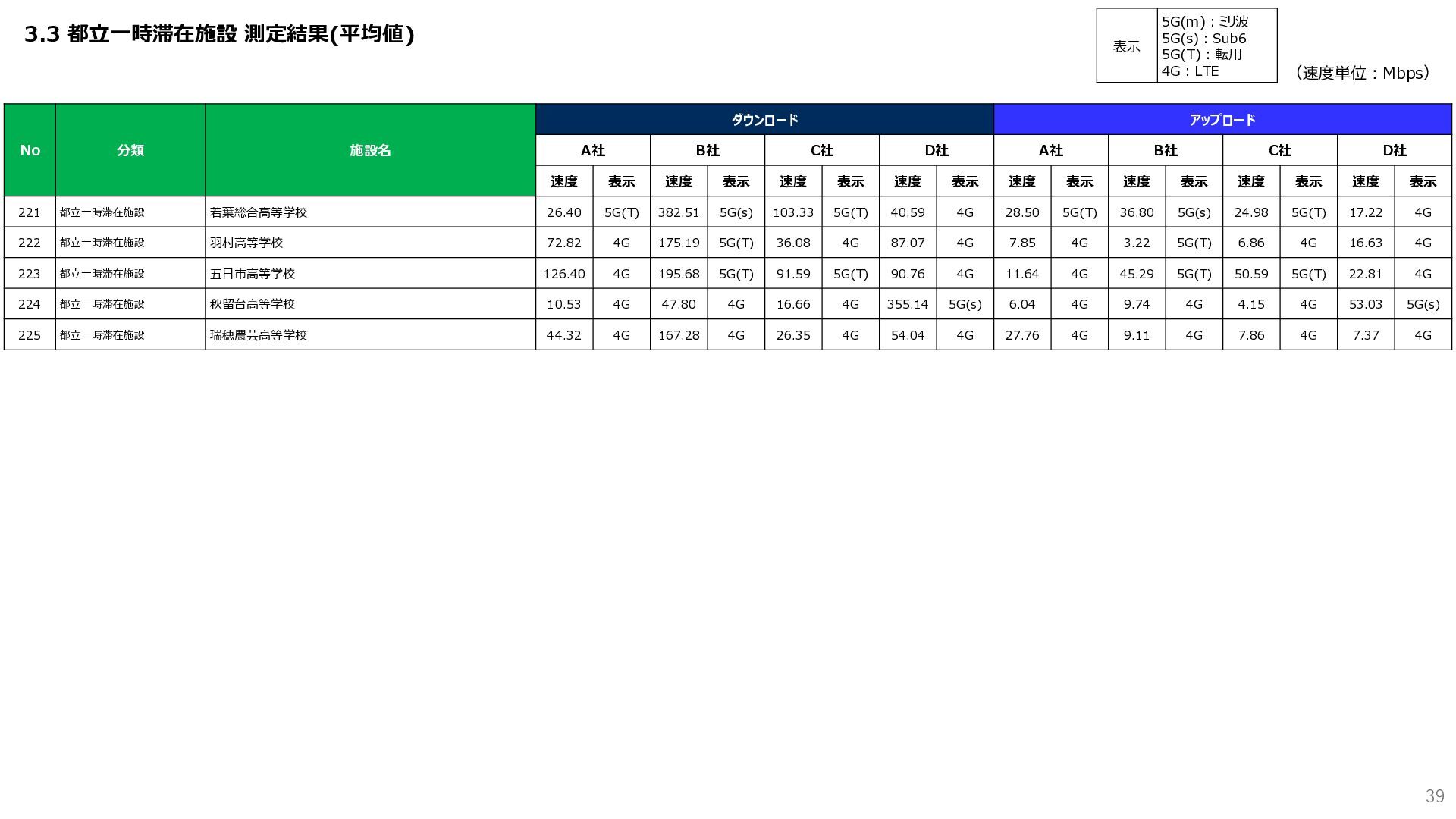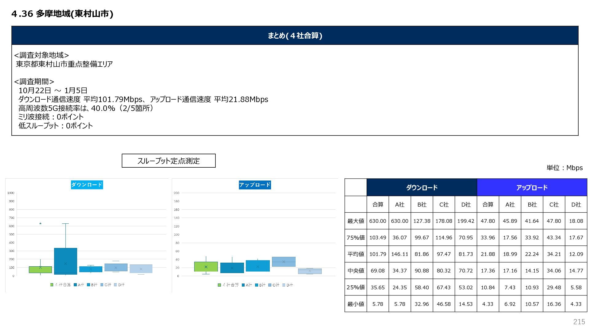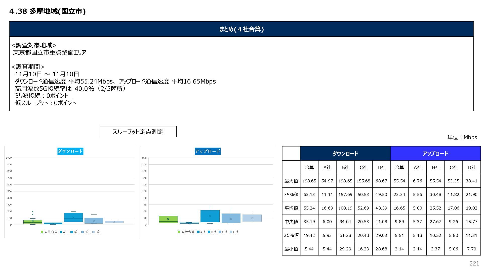 No 分類 施設名 ダウンロード アップロード A社 B社 C社 D社 A社 B社 C社 D社 速度 表示 速度 表示 速度 表示 速度 表示 速度 表示 速度 表示 速度 表示 速度 表示 181 駅及び羽田空港 赤坂見附駅(A赤坂3丁目) 244.11 5G(s) 312.06 5G(s) 553.68 5G(s) 280.58 5G(s) 33.51 5G(s) 27.42 5G(s) 141.19 5G(s) 34.18 5G(s) 182 駅及び羽田空港 赤坂見附駅(出口11) 274.09 5G(s) 142.07 5G(s) 449.05 5G(s) 51.54 5G(s) 8.60 5G(s) 56.96 5G(s) 133.23 5G(s) 6.18 5G(s) 183 駅及び羽田空港 中野坂上駅(出口1) 93.93 5G(T) 413.57 5G(T) 122.56 5G(T) 334.71 5G(m) 4.40 5G(T) 30.20 5G(T) 18.98 5G(T) 61.05 5G(m) 184 駅及び羽田空港 中野坂上駅(出口A2) 10.50 5G(s) 345.78 5G(s) 117.08 5G(T) 107.31 5G(s) 10.16 5G(s) 61.12 5G(s) 9.13 5G(T) 86.43 5G(s) 185 駅及び羽田空港 馬喰横山駅(出口1) 854.65 5G(s) 108.89 5G(s) 232.08 5G(m) 63.27 5G(s) 21.22 5G(s) 24.17 5G(s) 51.05 5G(m) 17.94 5G(s) 186 駅及び羽田空港 馬喰横山駅(出口A3) 206.87 5G(s) 968.72 5G(s) 10.64 5G(s) 35.08 5G(s) 15.76 5G(s) 143.06 5G(s) 68.96 5G(s) 34.89 5G(s) 187 駅及び羽田空港 大塚駅(北口) 43.53 5G(T) 847.90 5G(s) 186.89 5G(T) 60.82 5G(s) 26.25 5G(T) 150.29 5G(s) 35.04 5G(T) 70.17 5G(s) 188 駅及び羽田空港 大塚駅(南口) 15.47 5G(T) 1173.87 5G(s) 109.80 5G(T) 87.14 5G(s) 25.79 5G(T) 476.11 5G(s) 15.45 5G(T) 39.40 5G(s) 189 駅及び羽田空港 溜池山王駅(出口11) 92.40 5G(s) 403.44 5G(s) 472.42 5G(s) 55.40 5G(s) 13.09 5G(s) 53.36 5G(s) 90.48 5G(s) 4.36 5G(s) 190 駅及び羽田空港 溜池山王駅(出口5) 505.11 5G(s) 172.57 5G(s) 219.49 5G(s) 158.24 5G(s) 52.33 5G(s) 17.32 5G(s) 94.70 5G(s) 30.15 5G(s) 191 駅及び羽田空港 両国駅(東口) 302.46 5G(s) 125.33 5G(s) 69.06 5G(T) 57.41 5G(s) 8.65 5G(s) 29.32 5G(s) 34.20 5G(T) 17.95 5G(s) 192 駅及び羽田空港 両国駅(西口) 23.52 5G(s) 298.77 5G(s) 93.29 5G(T) 122.09 5G(s) 3.72 5G(s) 62.49 5G(s) 40.80 5G(T) 35.44 5G(s) 193 駅及び羽田空港 明治神宮前駅(4) 245.03 5G(s) 654.16 5G(m) 25.81 5G(T) 67.27 5G(s) 17.16 5G(s) 129.38 5G(m) 33.04 5G(T) 7.55 5G(s) 194 駅及び羽田空港 明治神宮前駅(1) 297.55 5G(s) 585.23 5G(m) 394.00 5G(s) 147.79 5G(s) 34.34 5G(s) 246.05 5G(m) 56.49 5G(s) 9.69 5G(s) 195 駅及び羽田空港 明大前駅(中央口) 244.72 5G(s) 41.49 4G 179.86 5G(T) 90.30 5G(s) 37.01 5G(s) 3.05 4G 37.59 5G(T) 41.14 5G(s) 196 駅及び羽田空港 明大前駅(フレンテ口) 77.75 5G(s) 359.64 5G(s) 140.30 5G(T) 83.94 5G(s) 42.60 5G(s) 60.21 5G(s) 30.28 5G(T) 45.83 5G(s) 197 駅及び羽田空港 東中野駅(西口) 39.24 5G(T) 233.33 5G(T) 193.21 5G(T) 70.45 5G(s) 29.19 5G(T) 60.83 5G(T) 13.88 5G(T) 55.17 5G(s) 198 駅及び羽田空港 東中野駅(東口) 46.14 5G(T) 119.89 4G 248.33 5G(s) 36.70 4G 34.95 5G(T) 14.32 4G 30.22 5G(s) 51.07 4G 199 駅及び羽田空港 虎ノ門駅(B2) 212.89 5G(s) 95.53 5G(s) 456.84 5G(s) 84.28 5G(s) 18.76 5G(s) 19.05 5G(s) 55.94 5G(s) 6.59 5G(s) 200 駅及び羽田空港 虎ノ門駅(5) 153.89 5G(s) 467.33 5G(s) 274.51 5G(T) 169.44 5G(s) 24.37 5G(s) 61.55 5G(s) 41.85 5G(T) 70.61 5G(s)