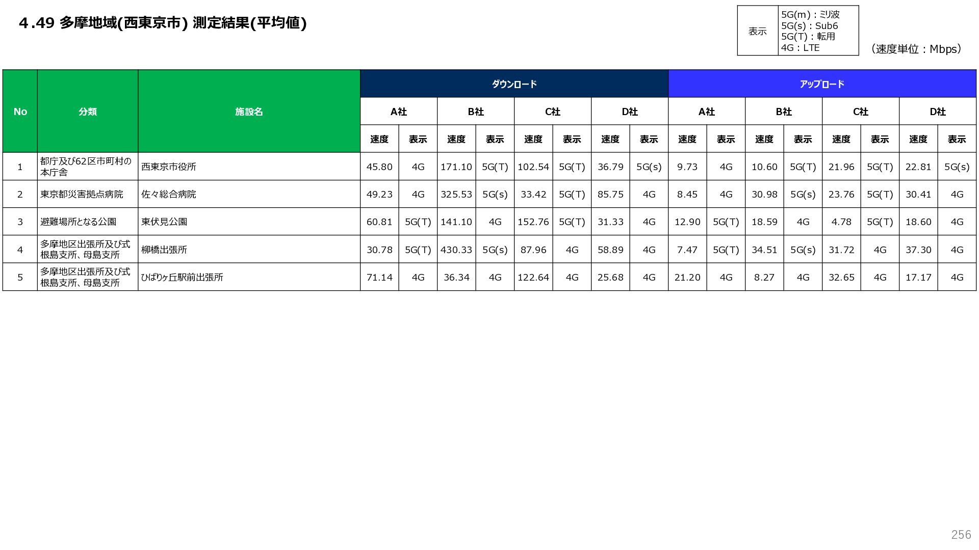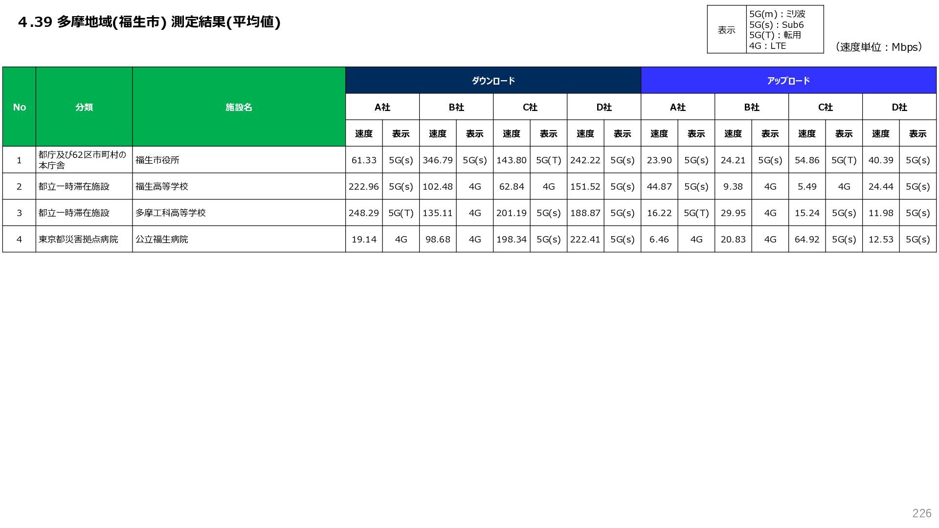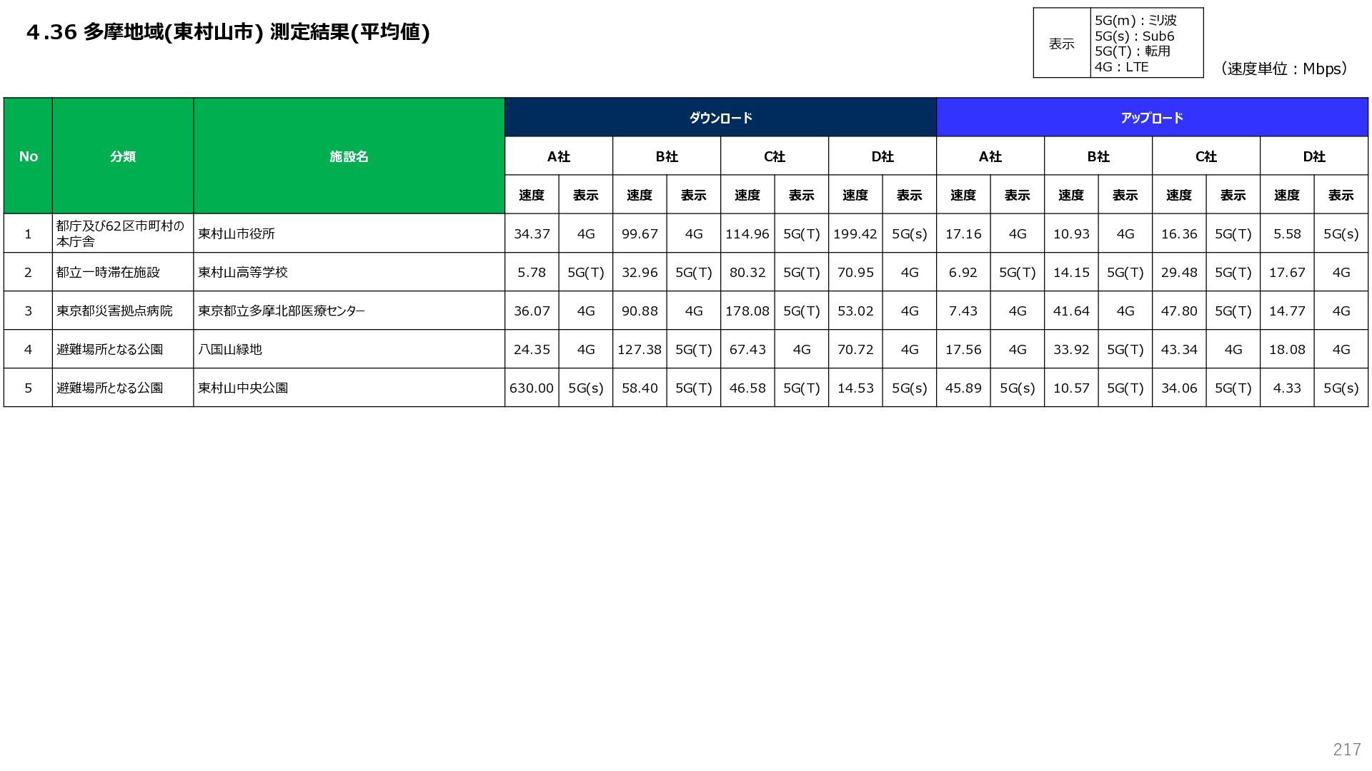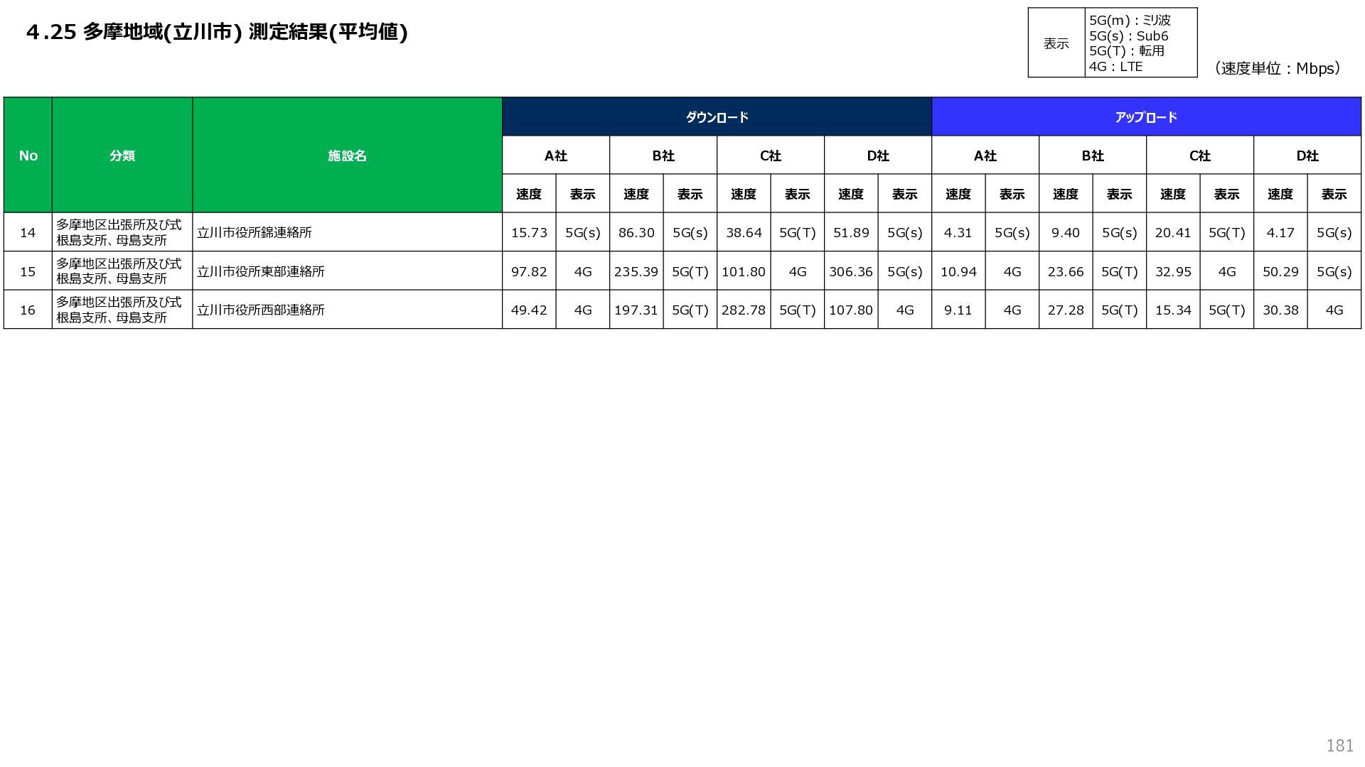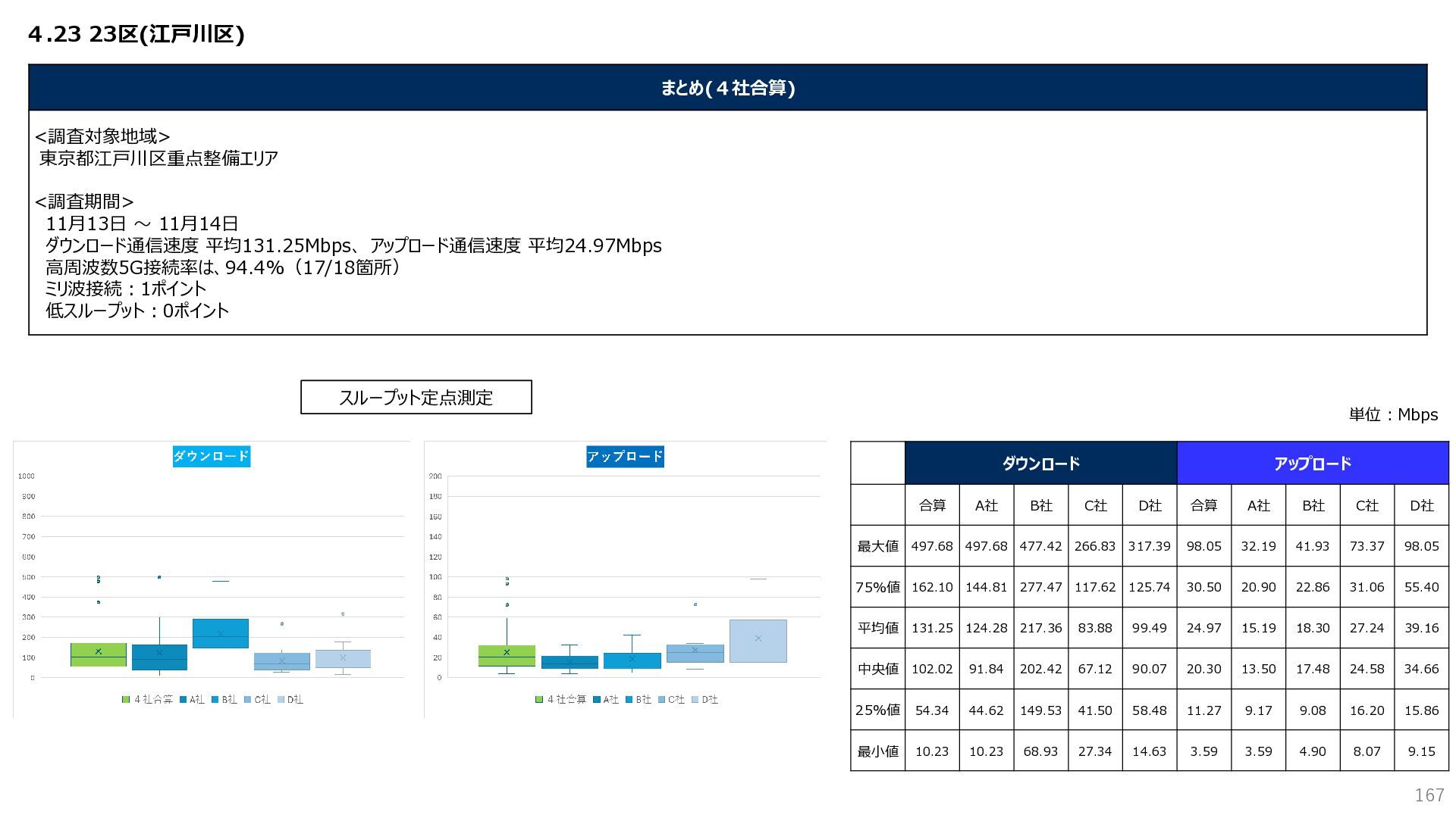 No 分類 施設名 ダウンロード アップロード A社 B社 C社 D社 A社 B社 C社 D社 速度 表示 速度 表示 速度 表示 速度 表示 速度 表示 速度 表示 速度 表示 速度 表示 181 駅及び羽田空港 赤坂見附駅(A赤坂3丁目) 244.11 5G(s) 312.06 5G(s) 553.68 5G(s) 280.58 5G(s) 33.51 5G(s) 27.42 5G(s) 141.19 5G(s) 34.18 5G(s) 182 駅及び羽田空港 赤坂見附駅(出口11) 274.09 5G(s) 142.07 5G(s) 449.05 5G(s) 51.54 5G(s) 8.60 5G(s) 56.96 5G(s) 133.23 5G(s) 6.18 5G(s) 183 駅及び羽田空港 中野坂上駅(出口1) 93.93 5G(T) 413.57 5G(T) 122.56 5G(T) 334.71 5G(m) 4.40 5G(T) 30.20 5G(T) 18.98 5G(T) 61.05 5G(m) 184 駅及び羽田空港 中野坂上駅(出口A2) 10.50 5G(s) 345.78 5G(s) 117.08 5G(T) 107.31 5G(s) 10.16 5G(s) 61.12 5G(s) 9.13 5G(T) 86.43 5G(s) 185 駅及び羽田空港 馬喰横山駅(出口1) 854.65 5G(s) 108.89 5G(s) 232.08 5G(m) 63.27 5G(s) 21.22 5G(s) 24.17 5G(s) 51.05 5G(m) 17.94 5G(s) 186 駅及び羽田空港 馬喰横山駅(出口A3) 206.87 5G(s) 968.72 5G(s) 10.64 5G(s) 35.08 5G(s) 15.76 5G(s) 143.06 5G(s) 68.96 5G(s) 34.89 5G(s) 187 駅及び羽田空港 大塚駅(北口) 43.53 5G(T) 847.90 5G(s) 186.89 5G(T) 60.82 5G(s) 26.25 5G(T) 150.29 5G(s) 35.04 5G(T) 70.17 5G(s) 188 駅及び羽田空港 大塚駅(南口) 15.47 5G(T) 1173.87 5G(s) 109.80 5G(T) 87.14 5G(s) 25.79 5G(T) 476.11 5G(s) 15.45 5G(T) 39.40 5G(s) 189 駅及び羽田空港 溜池山王駅(出口11) 92.40 5G(s) 403.44 5G(s) 472.42 5G(s) 55.40 5G(s) 13.09 5G(s) 53.36 5G(s) 90.48 5G(s) 4.36 5G(s) 190 駅及び羽田空港 溜池山王駅(出口5) 505.11 5G(s) 172.57 5G(s) 219.49 5G(s) 158.24 5G(s) 52.33 5G(s) 17.32 5G(s) 94.70 5G(s) 30.15 5G(s) 191 駅及び羽田空港 両国駅(東口) 302.46 5G(s) 125.33 5G(s) 69.06 5G(T) 57.41 5G(s) 8.65 5G(s) 29.32 5G(s) 34.20 5G(T) 17.95 5G(s) 192 駅及び羽田空港 両国駅(西口) 23.52 5G(s) 298.77 5G(s) 93.29 5G(T) 122.09 5G(s) 3.72 5G(s) 62.49 5G(s) 40.80 5G(T) 35.44 5G(s) 193 駅及び羽田空港 明治神宮前駅(4) 245.03 5G(s) 654.16 5G(m) 25.81 5G(T) 67.27 5G(s) 17.16 5G(s) 129.38 5G(m) 33.04 5G(T) 7.55 5G(s) 194 駅及び羽田空港 明治神宮前駅(1) 297.55 5G(s) 585.23 5G(m) 394.00 5G(s) 147.79 5G(s) 34.34 5G(s) 246.05 5G(m) 56.49 5G(s) 9.69 5G(s) 195 駅及び羽田空港 明大前駅(中央口) 244.72 5G(s) 41.49 4G 179.86 5G(T) 90.30 5G(s) 37.01 5G(s) 3.05 4G 37.59 5G(T) 41.14 5G(s) 196 駅及び羽田空港 明大前駅(フレンテ口) 77.75 5G(s) 359.64 5G(s) 140.30 5G(T) 83.94 5G(s) 42.60 5G(s) 60.21 5G(s) 30.28 5G(T) 45.83 5G(s) 197 駅及び羽田空港 東中野駅(西口) 39.24 5G(T) 233.33 5G(T) 193.21 5G(T) 70.45 5G(s) 29.19 5G(T) 60.83 5G(T) 13.88 5G(T) 55.17 5G(s) 198 駅及び羽田空港 東中野駅(東口) 46.14 5G(T) 119.89 4G 248.33 5G(s) 36.70 4G 34.95 5G(T) 14.32 4G 30.22 5G(s) 51.07 4G 199 駅及び羽田空港 虎ノ門駅(B2) 212.89 5G(s) 95.53 5G(s) 456.84 5G(s) 84.28 5G(s) 18.76 5G(s) 19.05 5G(s) 55.94 5G(s) 6.59 5G(s) 200 駅及び羽田空港 虎ノ門駅(5) 153.89 5G(s) 467.33 5G(s) 274.51 5G(T) 169.44 5G(s) 24.37 5G(s) 61.55 5G(s) 41.85 5G(T) 70.61 5G(s)