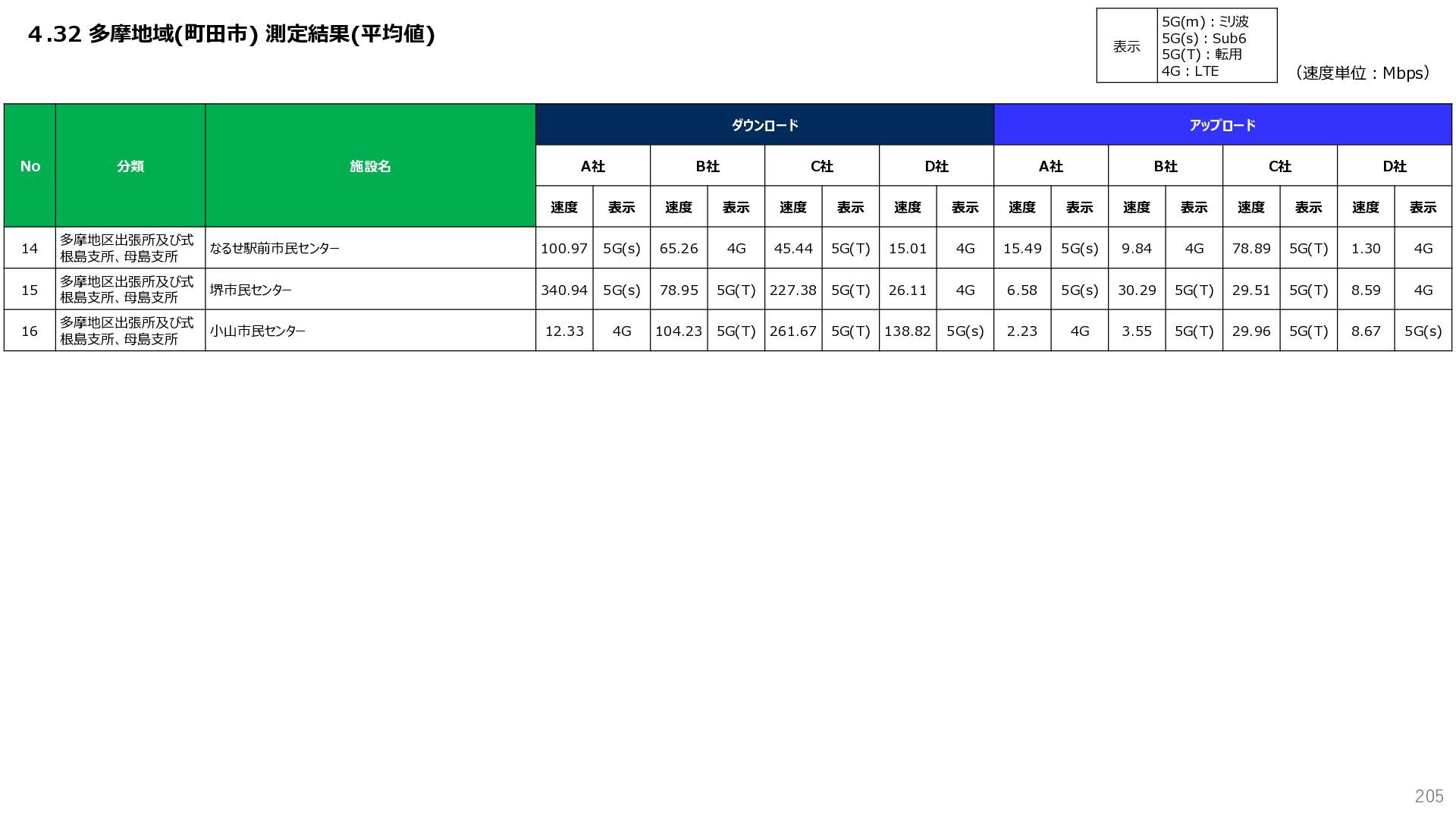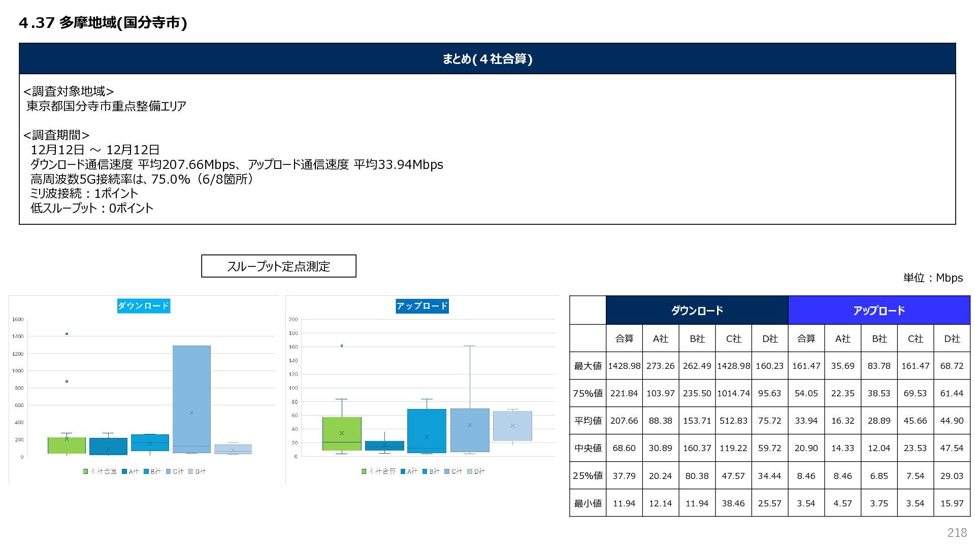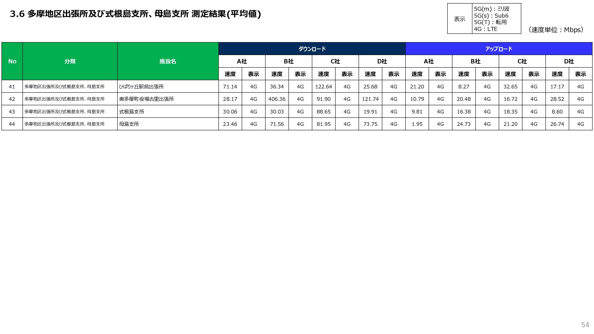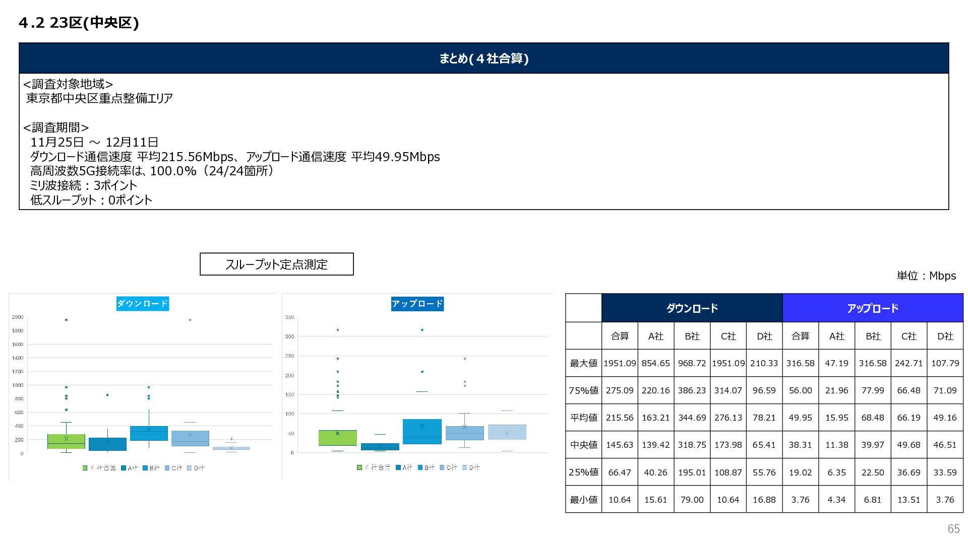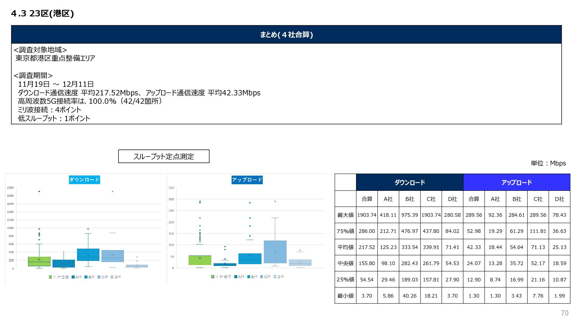 No 分類 施設名 ダウンロード アップロード A社 B社 C社 D社 A社 B社 C社 D社 速度 表示 速度 表示 速度 表示 速度 表示 速度 表示 速度 表示 速度 表示 速度 表示 181 駅及び羽田空港 赤坂見附駅(A赤坂3丁目) 244.11 5G(s) 312.06 5G(s) 553.68 5G(s) 280.58 5G(s) 33.51 5G(s) 27.42 5G(s) 141.19 5G(s) 34.18 5G(s) 182 駅及び羽田空港 赤坂見附駅(出口11) 274.09 5G(s) 142.07 5G(s) 449.05 5G(s) 51.54 5G(s) 8.60 5G(s) 56.96 5G(s) 133.23 5G(s) 6.18 5G(s) 183 駅及び羽田空港 中野坂上駅(出口1) 93.93 5G(T) 413.57 5G(T) 122.56 5G(T) 334.71 5G(m) 4.40 5G(T) 30.20 5G(T) 18.98 5G(T) 61.05 5G(m) 184 駅及び羽田空港 中野坂上駅(出口A2) 10.50 5G(s) 345.78 5G(s) 117.08 5G(T) 107.31 5G(s) 10.16 5G(s) 61.12 5G(s) 9.13 5G(T) 86.43 5G(s) 185 駅及び羽田空港 馬喰横山駅(出口1) 854.65 5G(s) 108.89 5G(s) 232.08 5G(m) 63.27 5G(s) 21.22 5G(s) 24.17 5G(s) 51.05 5G(m) 17.94 5G(s) 186 駅及び羽田空港 馬喰横山駅(出口A3) 206.87 5G(s) 968.72 5G(s) 10.64 5G(s) 35.08 5G(s) 15.76 5G(s) 143.06 5G(s) 68.96 5G(s) 34.89 5G(s) 187 駅及び羽田空港 大塚駅(北口) 43.53 5G(T) 847.90 5G(s) 186.89 5G(T) 60.82 5G(s) 26.25 5G(T) 150.29 5G(s) 35.04 5G(T) 70.17 5G(s) 188 駅及び羽田空港 大塚駅(南口) 15.47 5G(T) 1173.87 5G(s) 109.80 5G(T) 87.14 5G(s) 25.79 5G(T) 476.11 5G(s) 15.45 5G(T) 39.40 5G(s) 189 駅及び羽田空港 溜池山王駅(出口11) 92.40 5G(s) 403.44 5G(s) 472.42 5G(s) 55.40 5G(s) 13.09 5G(s) 53.36 5G(s) 90.48 5G(s) 4.36 5G(s) 190 駅及び羽田空港 溜池山王駅(出口5) 505.11 5G(s) 172.57 5G(s) 219.49 5G(s) 158.24 5G(s) 52.33 5G(s) 17.32 5G(s) 94.70 5G(s) 30.15 5G(s) 191 駅及び羽田空港 両国駅(東口) 302.46 5G(s) 125.33 5G(s) 69.06 5G(T) 57.41 5G(s) 8.65 5G(s) 29.32 5G(s) 34.20 5G(T) 17.95 5G(s) 192 駅及び羽田空港 両国駅(西口) 23.52 5G(s) 298.77 5G(s) 93.29 5G(T) 122.09 5G(s) 3.72 5G(s) 62.49 5G(s) 40.80 5G(T) 35.44 5G(s) 193 駅及び羽田空港 明治神宮前駅(4) 245.03 5G(s) 654.16 5G(m) 25.81 5G(T) 67.27 5G(s) 17.16 5G(s) 129.38 5G(m) 33.04 5G(T) 7.55 5G(s) 194 駅及び羽田空港 明治神宮前駅(1) 297.55 5G(s) 585.23 5G(m) 394.00 5G(s) 147.79 5G(s) 34.34 5G(s) 246.05 5G(m) 56.49 5G(s) 9.69 5G(s) 195 駅及び羽田空港 明大前駅(中央口) 244.72 5G(s) 41.49 4G 179.86 5G(T) 90.30 5G(s) 37.01 5G(s) 3.05 4G 37.59 5G(T) 41.14 5G(s) 196 駅及び羽田空港 明大前駅(フレンテ口) 77.75 5G(s) 359.64 5G(s) 140.30 5G(T) 83.94 5G(s) 42.60 5G(s) 60.21 5G(s) 30.28 5G(T) 45.83 5G(s) 197 駅及び羽田空港 東中野駅(西口) 39.24 5G(T) 233.33 5G(T) 193.21 5G(T) 70.45 5G(s) 29.19 5G(T) 60.83 5G(T) 13.88 5G(T) 55.17 5G(s) 198 駅及び羽田空港 東中野駅(東口) 46.14 5G(T) 119.89 4G 248.33 5G(s) 36.70 4G 34.95 5G(T) 14.32 4G 30.22 5G(s) 51.07 4G 199 駅及び羽田空港 虎ノ門駅(B2) 212.89 5G(s) 95.53 5G(s) 456.84 5G(s) 84.28 5G(s) 18.76 5G(s) 19.05 5G(s) 55.94 5G(s) 6.59 5G(s) 200 駅及び羽田空港 虎ノ門駅(5) 153.89 5G(s) 467.33 5G(s) 274.51 5G(T) 169.44 5G(s) 24.37 5G(s) 61.55 5G(s) 41.85 5G(T) 70.61 5G(s)