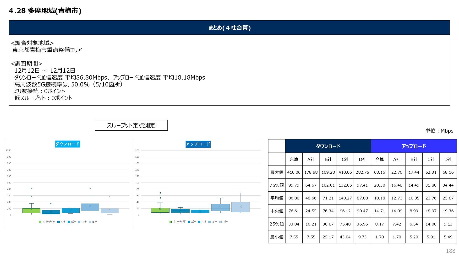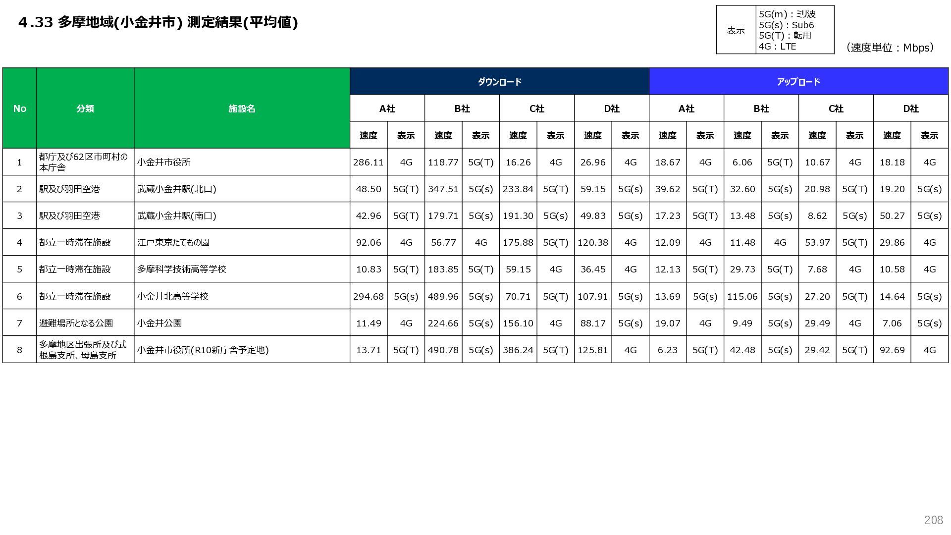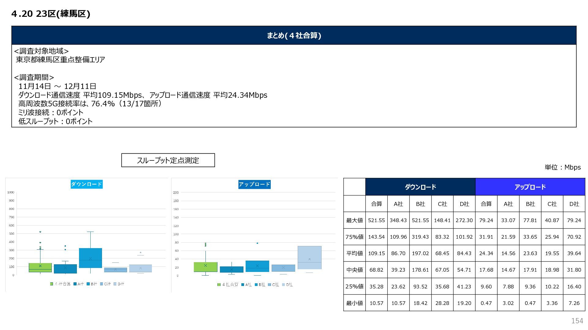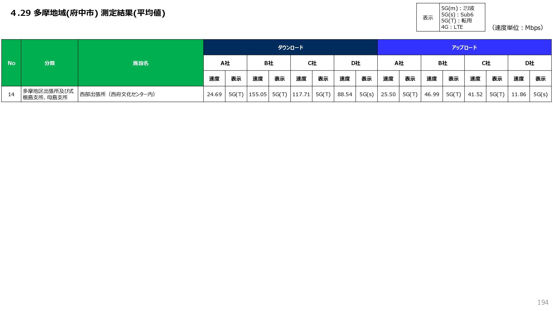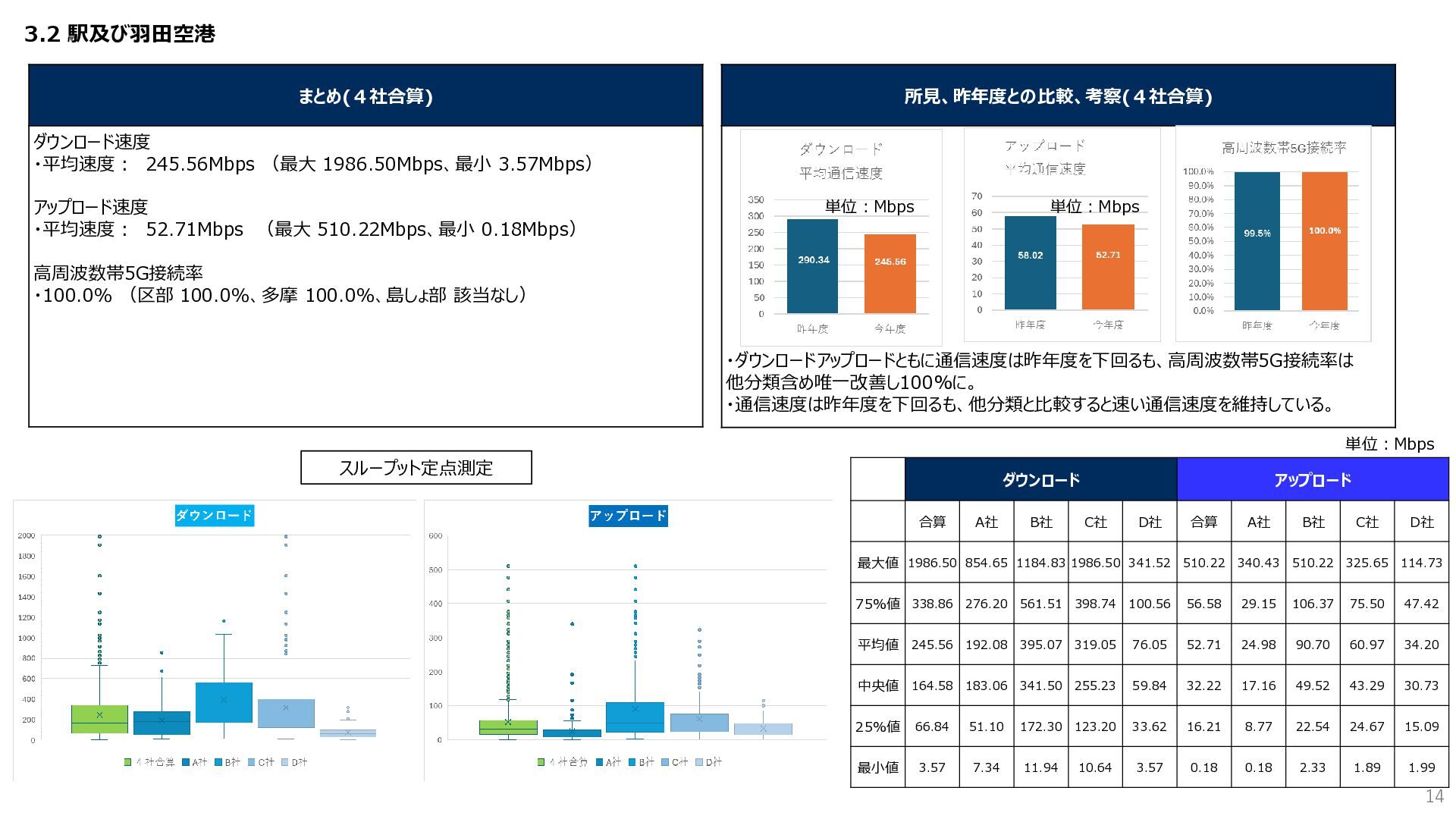 No 分類 施設名 ダウンロード アップロード A社 B社 C社 D社 A社 B社 C社 D社 速度 表示 速度 表示 速度 表示 速度 表示 速度 表示 速度 表示 速度 表示 速度 表示 181 駅及び羽田空港 赤坂見附駅(A赤坂3丁目) 244.11 5G(s) 312.06 5G(s) 553.68 5G(s) 280.58 5G(s) 33.51 5G(s) 27.42 5G(s) 141.19 5G(s) 34.18 5G(s) 182 駅及び羽田空港 赤坂見附駅(出口11) 274.09 5G(s) 142.07 5G(s) 449.05 5G(s) 51.54 5G(s) 8.60 5G(s) 56.96 5G(s) 133.23 5G(s) 6.18 5G(s) 183 駅及び羽田空港 中野坂上駅(出口1) 93.93 5G(T) 413.57 5G(T) 122.56 5G(T) 334.71 5G(m) 4.40 5G(T) 30.20 5G(T) 18.98 5G(T) 61.05 5G(m) 184 駅及び羽田空港 中野坂上駅(出口A2) 10.50 5G(s) 345.78 5G(s) 117.08 5G(T) 107.31 5G(s) 10.16 5G(s) 61.12 5G(s) 9.13 5G(T) 86.43 5G(s) 185 駅及び羽田空港 馬喰横山駅(出口1) 854.65 5G(s) 108.89 5G(s) 232.08 5G(m) 63.27 5G(s) 21.22 5G(s) 24.17 5G(s) 51.05 5G(m) 17.94 5G(s) 186 駅及び羽田空港 馬喰横山駅(出口A3) 206.87 5G(s) 968.72 5G(s) 10.64 5G(s) 35.08 5G(s) 15.76 5G(s) 143.06 5G(s) 68.96 5G(s) 34.89 5G(s) 187 駅及び羽田空港 大塚駅(北口) 43.53 5G(T) 847.90 5G(s) 186.89 5G(T) 60.82 5G(s) 26.25 5G(T) 150.29 5G(s) 35.04 5G(T) 70.17 5G(s) 188 駅及び羽田空港 大塚駅(南口) 15.47 5G(T) 1173.87 5G(s) 109.80 5G(T) 87.14 5G(s) 25.79 5G(T) 476.11 5G(s) 15.45 5G(T) 39.40 5G(s) 189 駅及び羽田空港 溜池山王駅(出口11) 92.40 5G(s) 403.44 5G(s) 472.42 5G(s) 55.40 5G(s) 13.09 5G(s) 53.36 5G(s) 90.48 5G(s) 4.36 5G(s) 190 駅及び羽田空港 溜池山王駅(出口5) 505.11 5G(s) 172.57 5G(s) 219.49 5G(s) 158.24 5G(s) 52.33 5G(s) 17.32 5G(s) 94.70 5G(s) 30.15 5G(s) 191 駅及び羽田空港 両国駅(東口) 302.46 5G(s) 125.33 5G(s) 69.06 5G(T) 57.41 5G(s) 8.65 5G(s) 29.32 5G(s) 34.20 5G(T) 17.95 5G(s) 192 駅及び羽田空港 両国駅(西口) 23.52 5G(s) 298.77 5G(s) 93.29 5G(T) 122.09 5G(s) 3.72 5G(s) 62.49 5G(s) 40.80 5G(T) 35.44 5G(s) 193 駅及び羽田空港 明治神宮前駅(4) 245.03 5G(s) 654.16 5G(m) 25.81 5G(T) 67.27 5G(s) 17.16 5G(s) 129.38 5G(m) 33.04 5G(T) 7.55 5G(s) 194 駅及び羽田空港 明治神宮前駅(1) 297.55 5G(s) 585.23 5G(m) 394.00 5G(s) 147.79 5G(s) 34.34 5G(s) 246.05 5G(m) 56.49 5G(s) 9.69 5G(s) 195 駅及び羽田空港 明大前駅(中央口) 244.72 5G(s) 41.49 4G 179.86 5G(T) 90.30 5G(s) 37.01 5G(s) 3.05 4G 37.59 5G(T) 41.14 5G(s) 196 駅及び羽田空港 明大前駅(フレンテ口) 77.75 5G(s) 359.64 5G(s) 140.30 5G(T) 83.94 5G(s) 42.60 5G(s) 60.21 5G(s) 30.28 5G(T) 45.83 5G(s) 197 駅及び羽田空港 東中野駅(西口) 39.24 5G(T) 233.33 5G(T) 193.21 5G(T) 70.45 5G(s) 29.19 5G(T) 60.83 5G(T) 13.88 5G(T) 55.17 5G(s) 198 駅及び羽田空港 東中野駅(東口) 46.14 5G(T) 119.89 4G 248.33 5G(s) 36.70 4G 34.95 5G(T) 14.32 4G 30.22 5G(s) 51.07 4G 199 駅及び羽田空港 虎ノ門駅(B2) 212.89 5G(s) 95.53 5G(s) 456.84 5G(s) 84.28 5G(s) 18.76 5G(s) 19.05 5G(s) 55.94 5G(s) 6.59 5G(s) 200 駅及び羽田空港 虎ノ門駅(5) 153.89 5G(s) 467.33 5G(s) 274.51 5G(T) 169.44 5G(s) 24.37 5G(s) 61.55 5G(s) 41.85 5G(T) 70.61 5G(s)