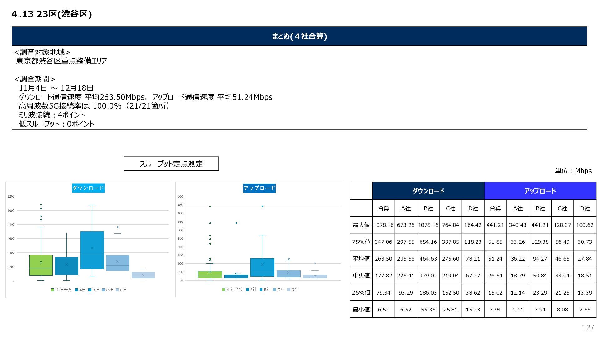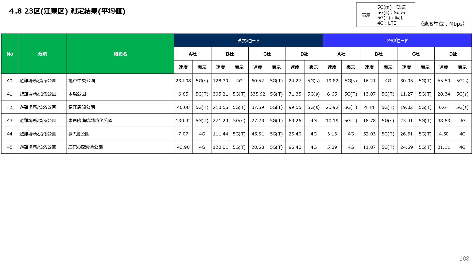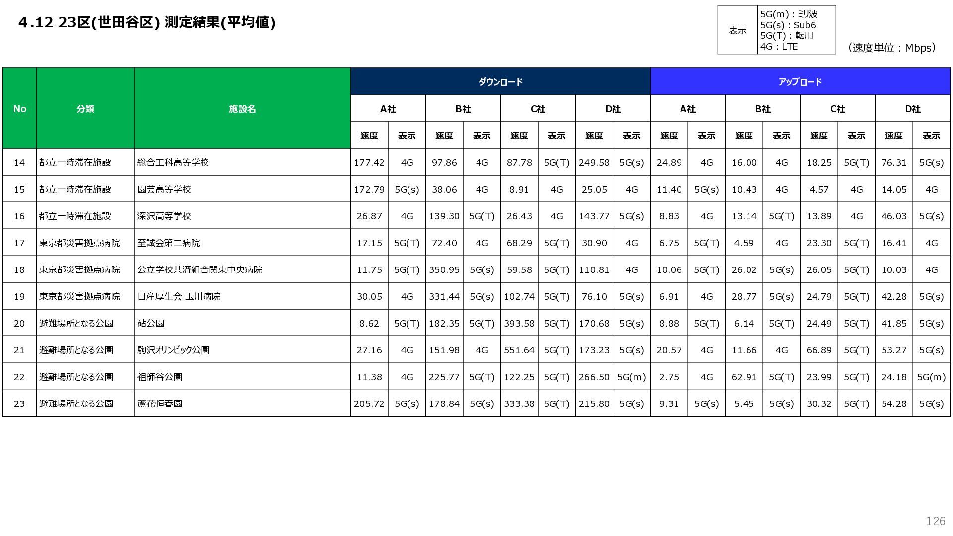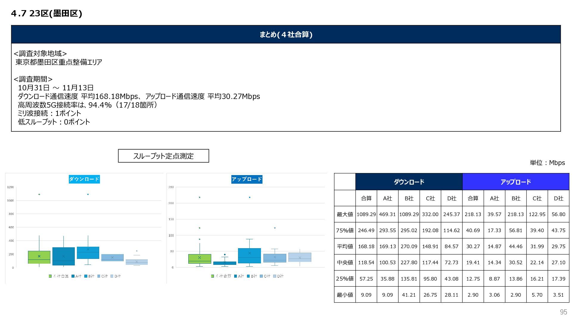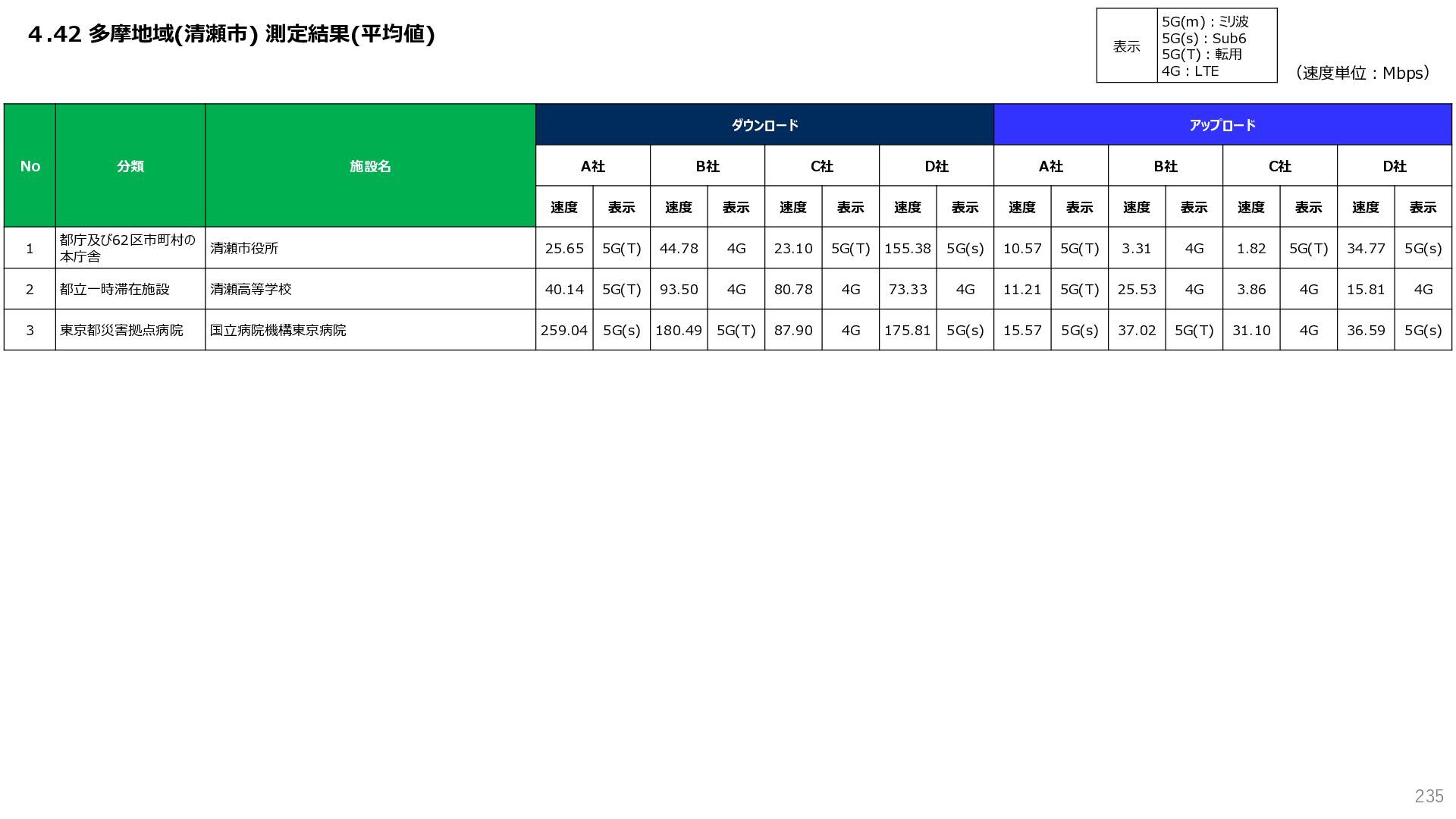 No 分類 施設名 ダウンロード アップロード A社 B社 C社 D社 A社 B社 C社 D社 速度 表示 速度 表示 速度 表示 速度 表示 速度 表示 速度 表示 速度 表示 速度 表示 181 駅及び羽田空港 赤坂見附駅(A赤坂3丁目) 244.11 5G(s) 312.06 5G(s) 553.68 5G(s) 280.58 5G(s) 33.51 5G(s) 27.42 5G(s) 141.19 5G(s) 34.18 5G(s) 182 駅及び羽田空港 赤坂見附駅(出口11) 274.09 5G(s) 142.07 5G(s) 449.05 5G(s) 51.54 5G(s) 8.60 5G(s) 56.96 5G(s) 133.23 5G(s) 6.18 5G(s) 183 駅及び羽田空港 中野坂上駅(出口1) 93.93 5G(T) 413.57 5G(T) 122.56 5G(T) 334.71 5G(m) 4.40 5G(T) 30.20 5G(T) 18.98 5G(T) 61.05 5G(m) 184 駅及び羽田空港 中野坂上駅(出口A2) 10.50 5G(s) 345.78 5G(s) 117.08 5G(T) 107.31 5G(s) 10.16 5G(s) 61.12 5G(s) 9.13 5G(T) 86.43 5G(s) 185 駅及び羽田空港 馬喰横山駅(出口1) 854.65 5G(s) 108.89 5G(s) 232.08 5G(m) 63.27 5G(s) 21.22 5G(s) 24.17 5G(s) 51.05 5G(m) 17.94 5G(s) 186 駅及び羽田空港 馬喰横山駅(出口A3) 206.87 5G(s) 968.72 5G(s) 10.64 5G(s) 35.08 5G(s) 15.76 5G(s) 143.06 5G(s) 68.96 5G(s) 34.89 5G(s) 187 駅及び羽田空港 大塚駅(北口) 43.53 5G(T) 847.90 5G(s) 186.89 5G(T) 60.82 5G(s) 26.25 5G(T) 150.29 5G(s) 35.04 5G(T) 70.17 5G(s) 188 駅及び羽田空港 大塚駅(南口) 15.47 5G(T) 1173.87 5G(s) 109.80 5G(T) 87.14 5G(s) 25.79 5G(T) 476.11 5G(s) 15.45 5G(T) 39.40 5G(s) 189 駅及び羽田空港 溜池山王駅(出口11) 92.40 5G(s) 403.44 5G(s) 472.42 5G(s) 55.40 5G(s) 13.09 5G(s) 53.36 5G(s) 90.48 5G(s) 4.36 5G(s) 190 駅及び羽田空港 溜池山王駅(出口5) 505.11 5G(s) 172.57 5G(s) 219.49 5G(s) 158.24 5G(s) 52.33 5G(s) 17.32 5G(s) 94.70 5G(s) 30.15 5G(s) 191 駅及び羽田空港 両国駅(東口) 302.46 5G(s) 125.33 5G(s) 69.06 5G(T) 57.41 5G(s) 8.65 5G(s) 29.32 5G(s) 34.20 5G(T) 17.95 5G(s) 192 駅及び羽田空港 両国駅(西口) 23.52 5G(s) 298.77 5G(s) 93.29 5G(T) 122.09 5G(s) 3.72 5G(s) 62.49 5G(s) 40.80 5G(T) 35.44 5G(s) 193 駅及び羽田空港 明治神宮前駅(4) 245.03 5G(s) 654.16 5G(m) 25.81 5G(T) 67.27 5G(s) 17.16 5G(s) 129.38 5G(m) 33.04 5G(T) 7.55 5G(s) 194 駅及び羽田空港 明治神宮前駅(1) 297.55 5G(s) 585.23 5G(m) 394.00 5G(s) 147.79 5G(s) 34.34 5G(s) 246.05 5G(m) 56.49 5G(s) 9.69 5G(s) 195 駅及び羽田空港 明大前駅(中央口) 244.72 5G(s) 41.49 4G 179.86 5G(T) 90.30 5G(s) 37.01 5G(s) 3.05 4G 37.59 5G(T) 41.14 5G(s) 196 駅及び羽田空港 明大前駅(フレンテ口) 77.75 5G(s) 359.64 5G(s) 140.30 5G(T) 83.94 5G(s) 42.60 5G(s) 60.21 5G(s) 30.28 5G(T) 45.83 5G(s) 197 駅及び羽田空港 東中野駅(西口) 39.24 5G(T) 233.33 5G(T) 193.21 5G(T) 70.45 5G(s) 29.19 5G(T) 60.83 5G(T) 13.88 5G(T) 55.17 5G(s) 198 駅及び羽田空港 東中野駅(東口) 46.14 5G(T) 119.89 4G 248.33 5G(s) 36.70 4G 34.95 5G(T) 14.32 4G 30.22 5G(s) 51.07 4G 199 駅及び羽田空港 虎ノ門駅(B2) 212.89 5G(s) 95.53 5G(s) 456.84 5G(s) 84.28 5G(s) 18.76 5G(s) 19.05 5G(s) 55.94 5G(s) 6.59 5G(s) 200 駅及び羽田空港 虎ノ門駅(5) 153.89 5G(s) 467.33 5G(s) 274.51 5G(T) 169.44 5G(s) 24.37 5G(s) 61.55 5G(s) 41.85 5G(T) 70.61 5G(s)