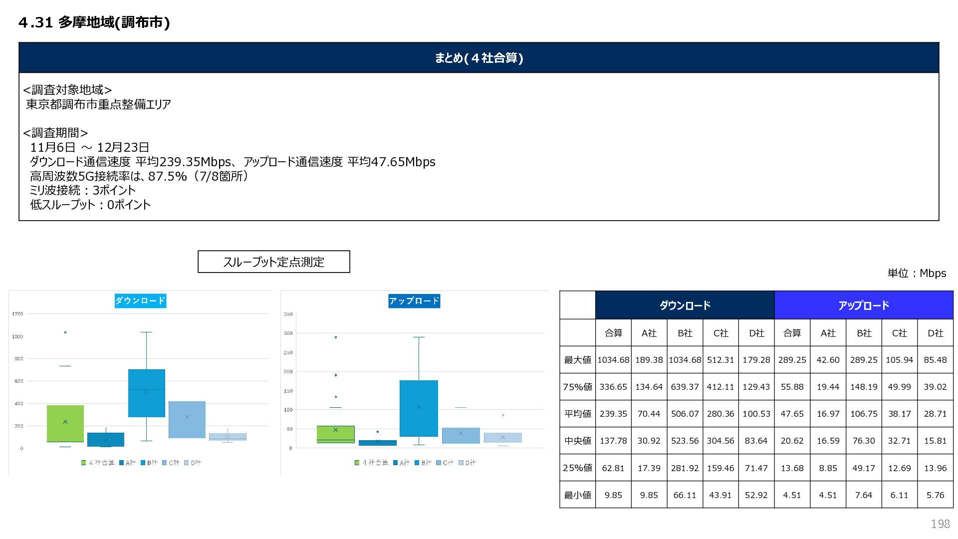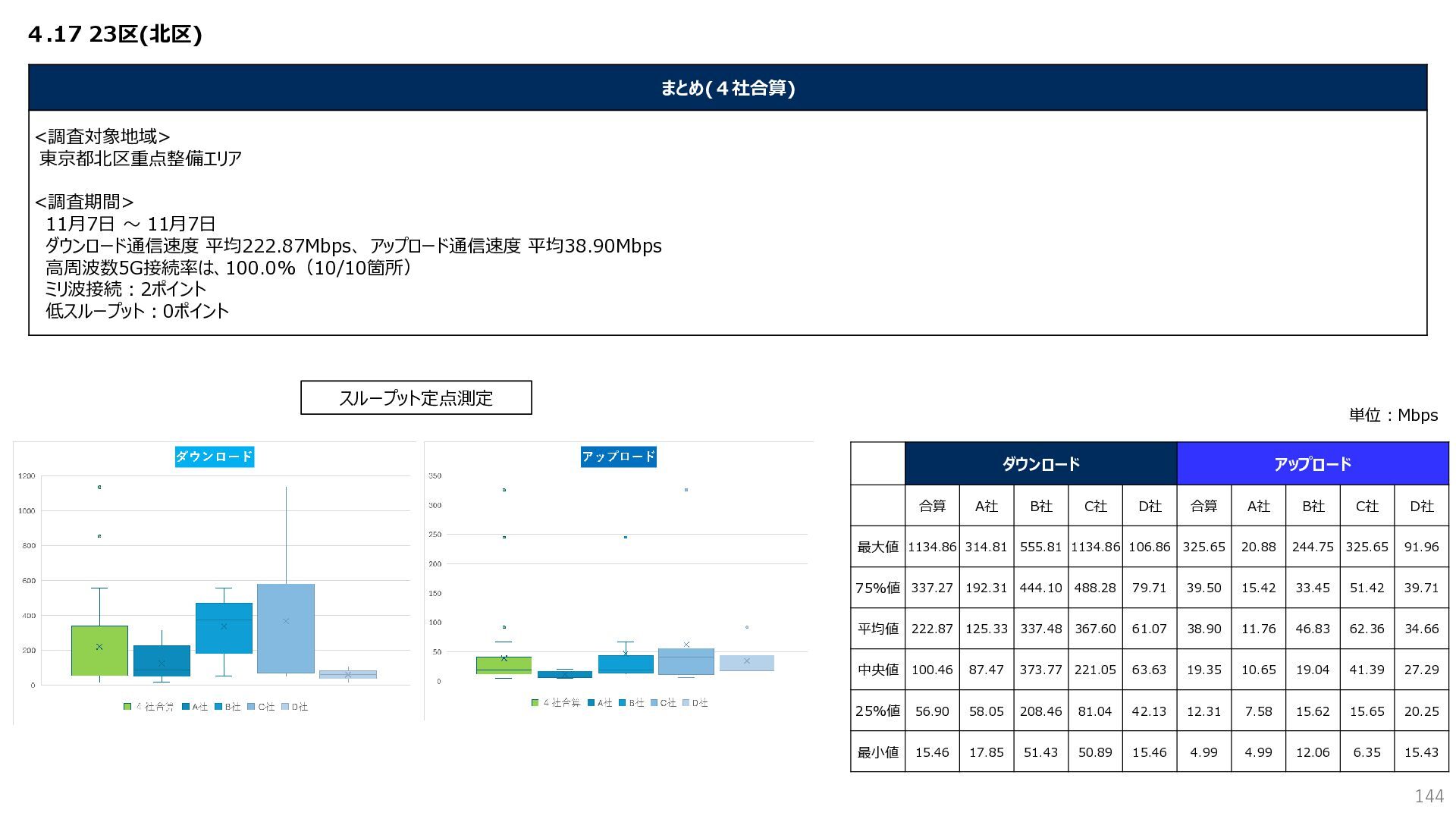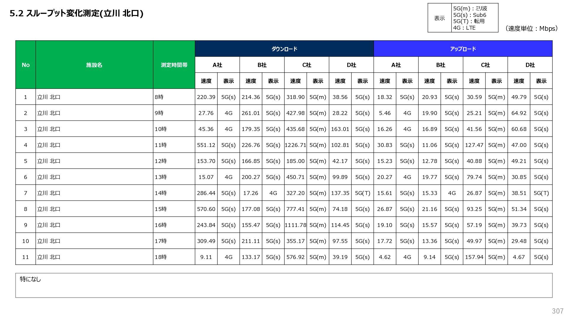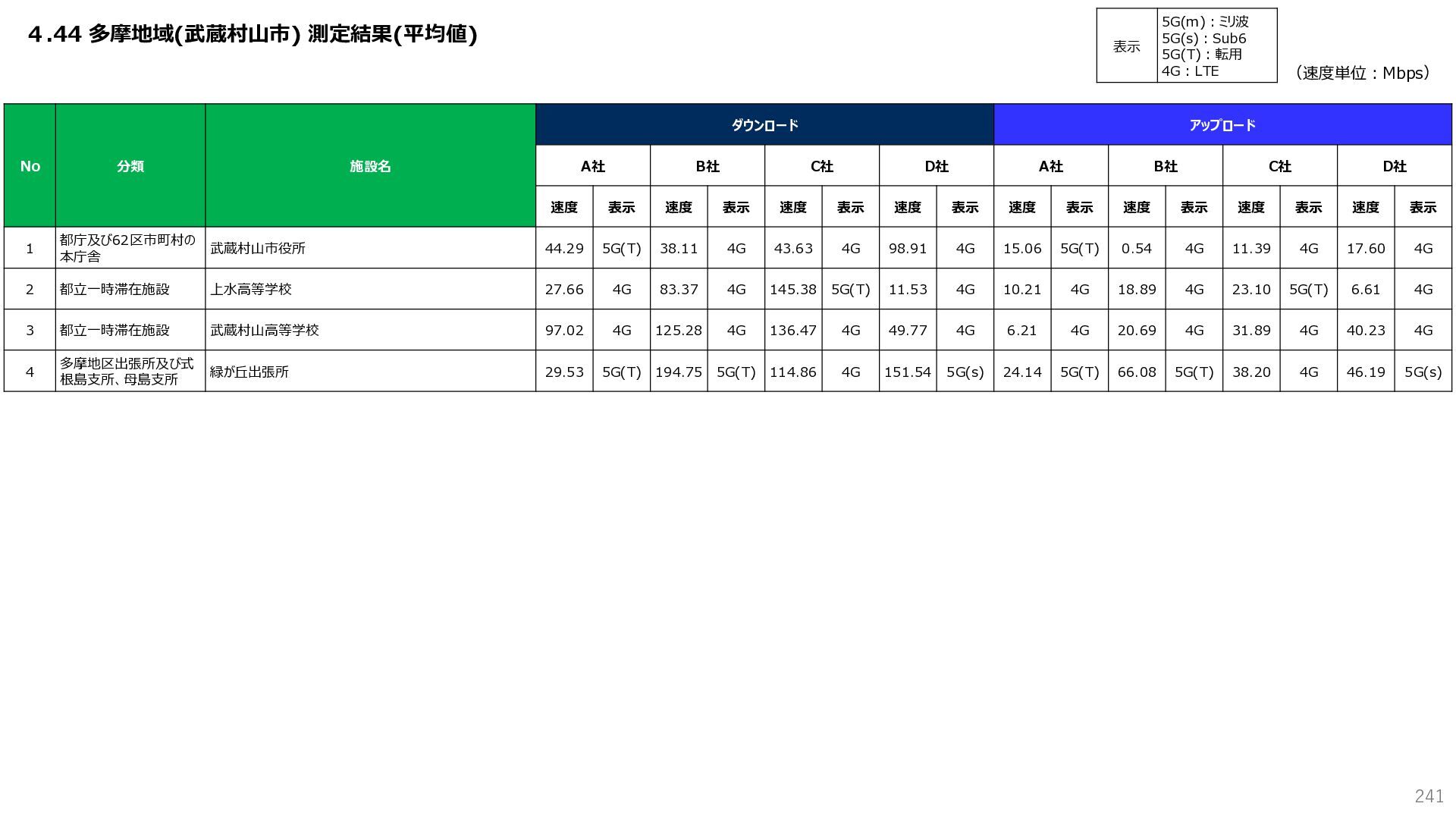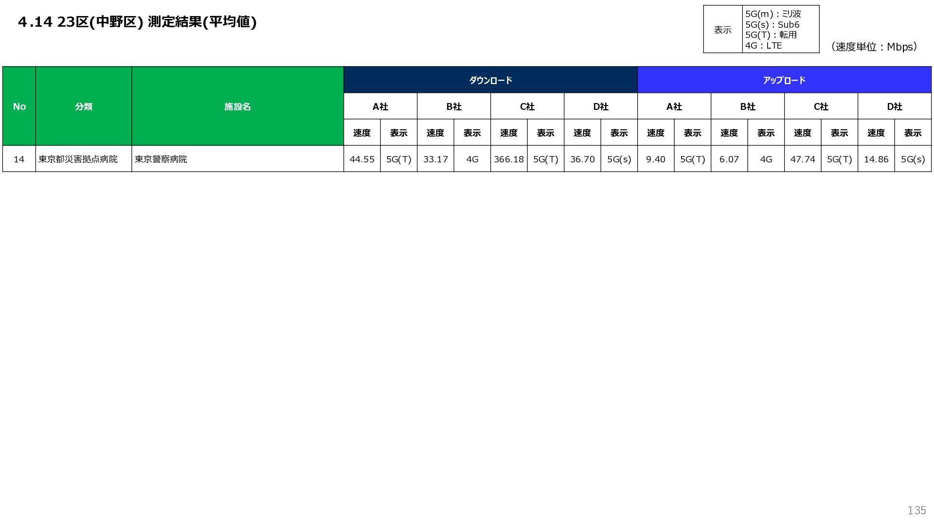No 分類 施設名 ダウンロード アップロード A社 B社 C社 D社 A社 B社 C社 D社 速度 表示 速度 表示 速度 表示 速度 表示 速度 表示 速度 表示 速度 表示 速度 表示 181 駅及び羽田空港 赤坂見附駅(A赤坂3丁目) 244.11 5G(s) 312.06 5G(s) 553.68 5G(s) 280.58 5G(s) 33.51 5G(s) 27.42 5G(s) 141.19 5G(s) 34.18 5G(s) 182 駅及び羽田空港 赤坂見附駅(出口11) 274.09 5G(s) 142.07 5G(s) 449.05 5G(s) 51.54 5G(s) 8.60 5G(s) 56.96 5G(s) 133.23 5G(s) 6.18 5G(s) 183 駅及び羽田空港 中野坂上駅(出口1) 93.93 5G(T) 413.57 5G(T) 122.56 5G(T) 334.71 5G(m) 4.40 5G(T) 30.20 5G(T) 18.98 5G(T) 61.05 5G(m) 184 駅及び羽田空港 中野坂上駅(出口A2) 10.50 5G(s) 345.78 5G(s) 117.08 5G(T) 107.31 5G(s) 10.16 5G(s) 61.12 5G(s) 9.13 5G(T) 86.43 5G(s) 185 駅及び羽田空港 馬喰横山駅(出口1) 854.65 5G(s) 108.89 5G(s) 232.08 5G(m) 63.27 5G(s) 21.22 5G(s) 24.17 5G(s) 51.05 5G(m) 17.94 5G(s) 186 駅及び羽田空港 馬喰横山駅(出口A3) 206.87 5G(s) 968.72 5G(s) 10.64 5G(s) 35.08 5G(s) 15.76 5G(s) 143.06 5G(s) 68.96 5G(s) 34.89 5G(s) 187 駅及び羽田空港 大塚駅(北口) 43.53 5G(T) 847.90 5G(s) 186.89 5G(T) 60.82 5G(s) 26.25 5G(T) 150.29 5G(s) 35.04 5G(T) 70.17 5G(s) 188 駅及び羽田空港 大塚駅(南口) 15.47 5G(T) 1173.87 5G(s) 109.80 5G(T) 87.14 5G(s) 25.79 5G(T) 476.11 5G(s) 15.45 5G(T) 39.40 5G(s) 189 駅及び羽田空港 溜池山王駅(出口11) 92.40 5G(s) 403.44 5G(s) 472.42 5G(s) 55.40 5G(s) 13.09 5G(s) 53.36 5G(s) 90.48 5G(s) 4.36 5G(s) 190 駅及び羽田空港 溜池山王駅(出口5) 505.11 5G(s) 172.57 5G(s) 219.49 5G(s) 158.24 5G(s) 52.33 5G(s) 17.32 5G(s) 94.70 5G(s) 30.15 5G(s) 191 駅及び羽田空港 両国駅(東口) 302.46 5G(s) 125.33 5G(s) 69.06 5G(T) 57.41 5G(s) 8.65 5G(s) 29.32 5G(s) 34.20 5G(T) 17.95 5G(s) 192 駅及び羽田空港 両国駅(西口) 23.52 5G(s) 298.77 5G(s) 93.29 5G(T) 122.09 5G(s) 3.72 5G(s) 62.49 5G(s) 40.80 5G(T) 35.44 5G(s) 193 駅及び羽田空港 明治神宮前駅(4) 245.03 5G(s) 654.16 5G(m) 25.81 5G(T) 67.27 5G(s) 17.16 5G(s) 129.38 5G(m) 33.04 5G(T) 7.55 5G(s) 194 駅及び羽田空港 明治神宮前駅(1) 297.55 5G(s) 585.23 5G(m) 394.00 5G(s) 147.79 5G(s) 34.34 5G(s) 246.05 5G(m) 56.49 5G(s) 9.69 5G(s) 195 駅及び羽田空港 明大前駅(中央口) 244.72 5G(s) 41.49 4G 179.86 5G(T) 90.30 5G(s) 37.01 5G(s) 3.05 4G 37.59 5G(T) 41.14 5G(s) 196 駅及び羽田空港 明大前駅(フレンテ口) 77.75 5G(s) 359.64 5G(s) 140.30 5G(T) 83.94 5G(s) 42.60 5G(s) 60.21 5G(s) 30.28 5G(T) 45.83 5G(s) 197 駅及び羽田空港 東中野駅(西口) 39.24 5G(T) 233.33 5G(T) 193.21 5G(T) 70.45 5G(s) 29.19 5G(T) 60.83 5G(T) 13.88 5G(T) 55.17 5G(s) 198 駅及び羽田空港 東中野駅(東口) 46.14 5G(T) 119.89 4G 248.33 5G(s) 36.70 4G 34.95 5G(T) 14.32 4G 30.22 5G(s) 51.07 4G 199 駅及び羽田空港 虎ノ門駅(B2) 212.89 5G(s) 95.53 5G(s) 456.84 5G(s) 84.28 5G(s) 18.76 5G(s) 19.05 5G(s) 55.94 5G(s) 6.59 5G(s) 200 駅及び羽田空港 虎ノ門駅(5) 153.89 5G(s) 467.33 5G(s) 274.51 5G(T) 169.44 5G(s) 24.37 5G(s) 61.55 5G(s) 41.85 5G(T) 70.61 5G(s)